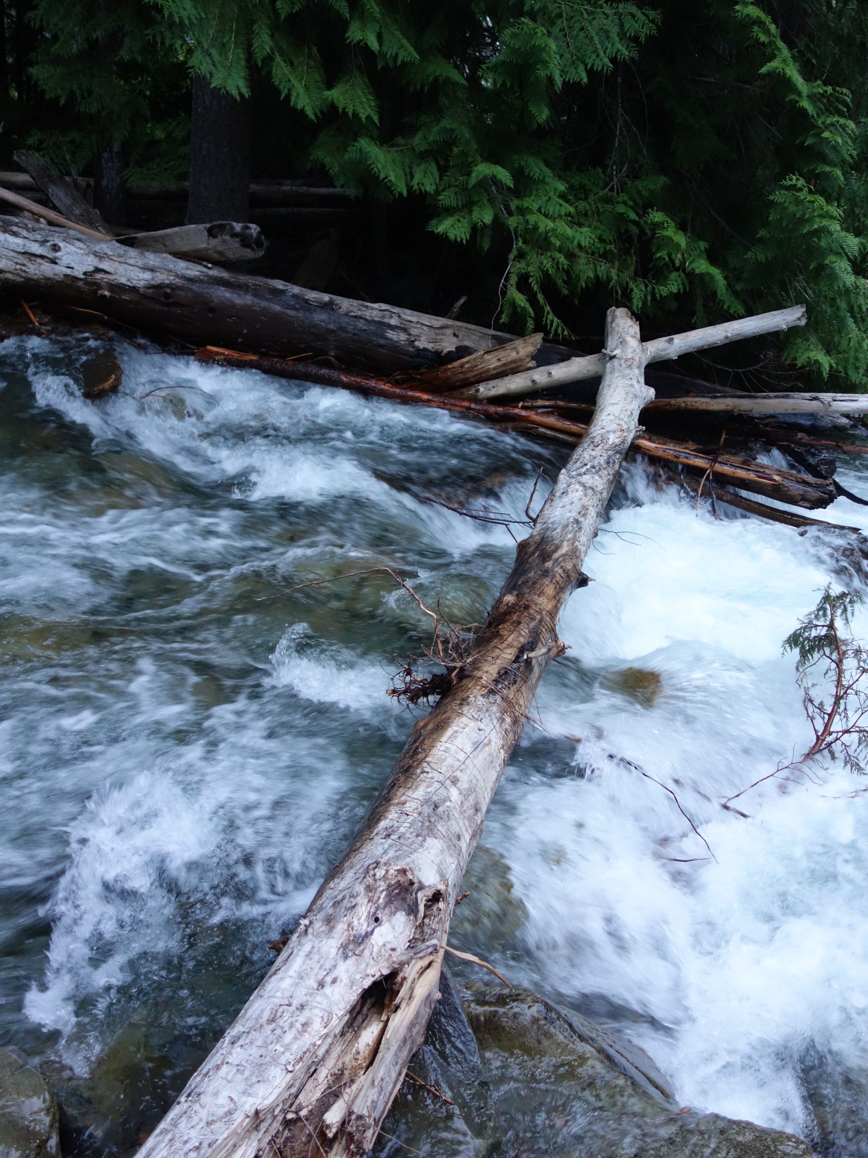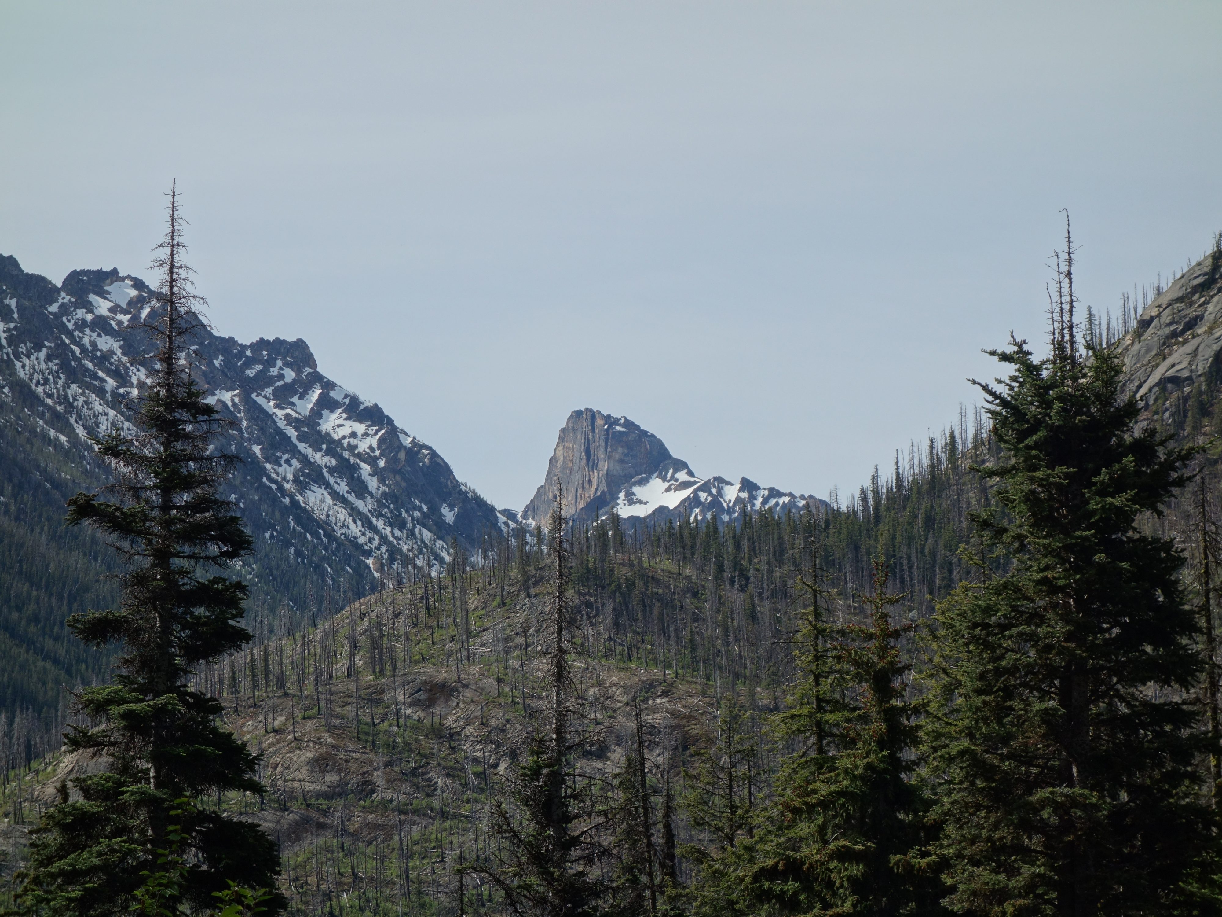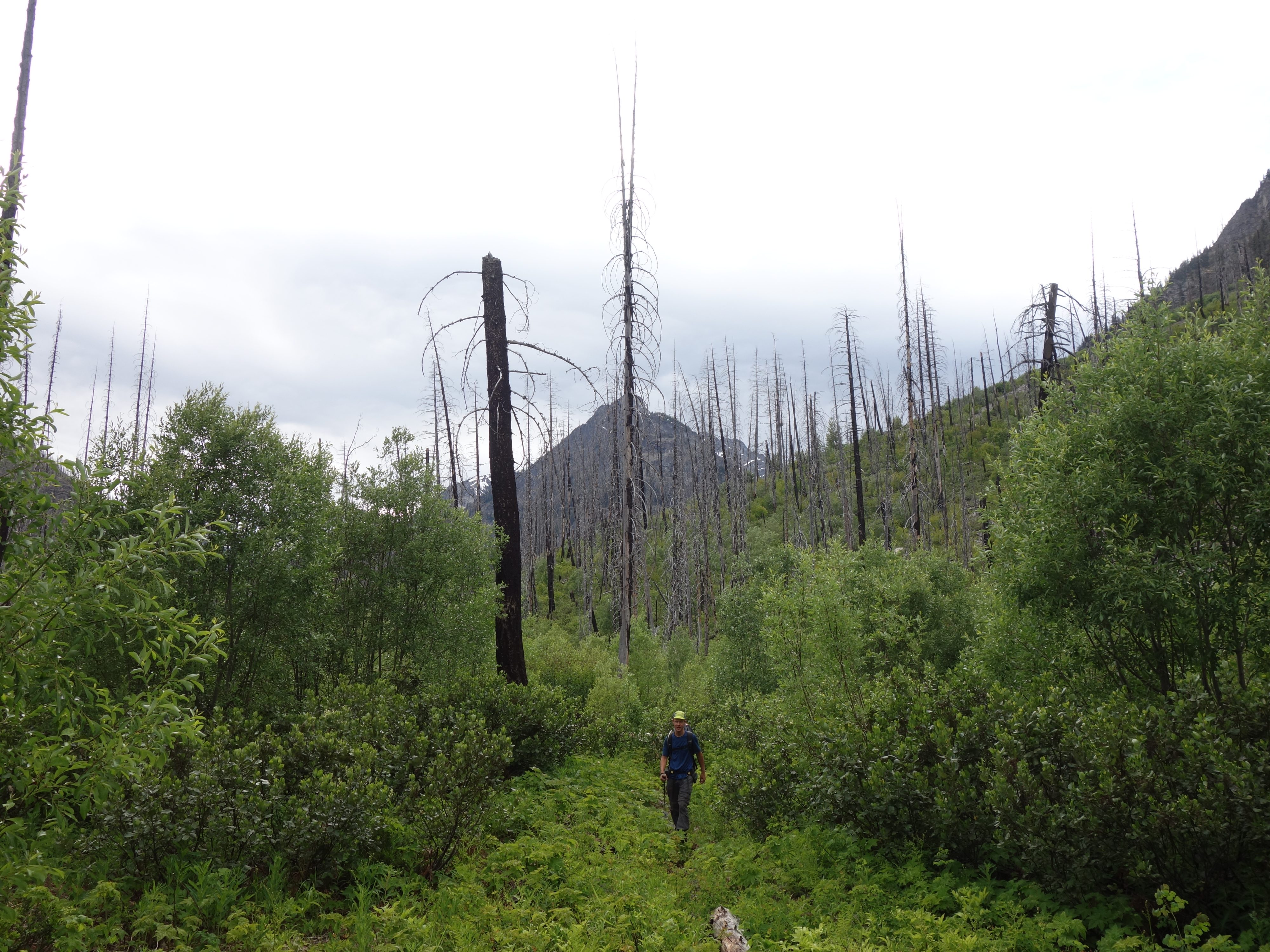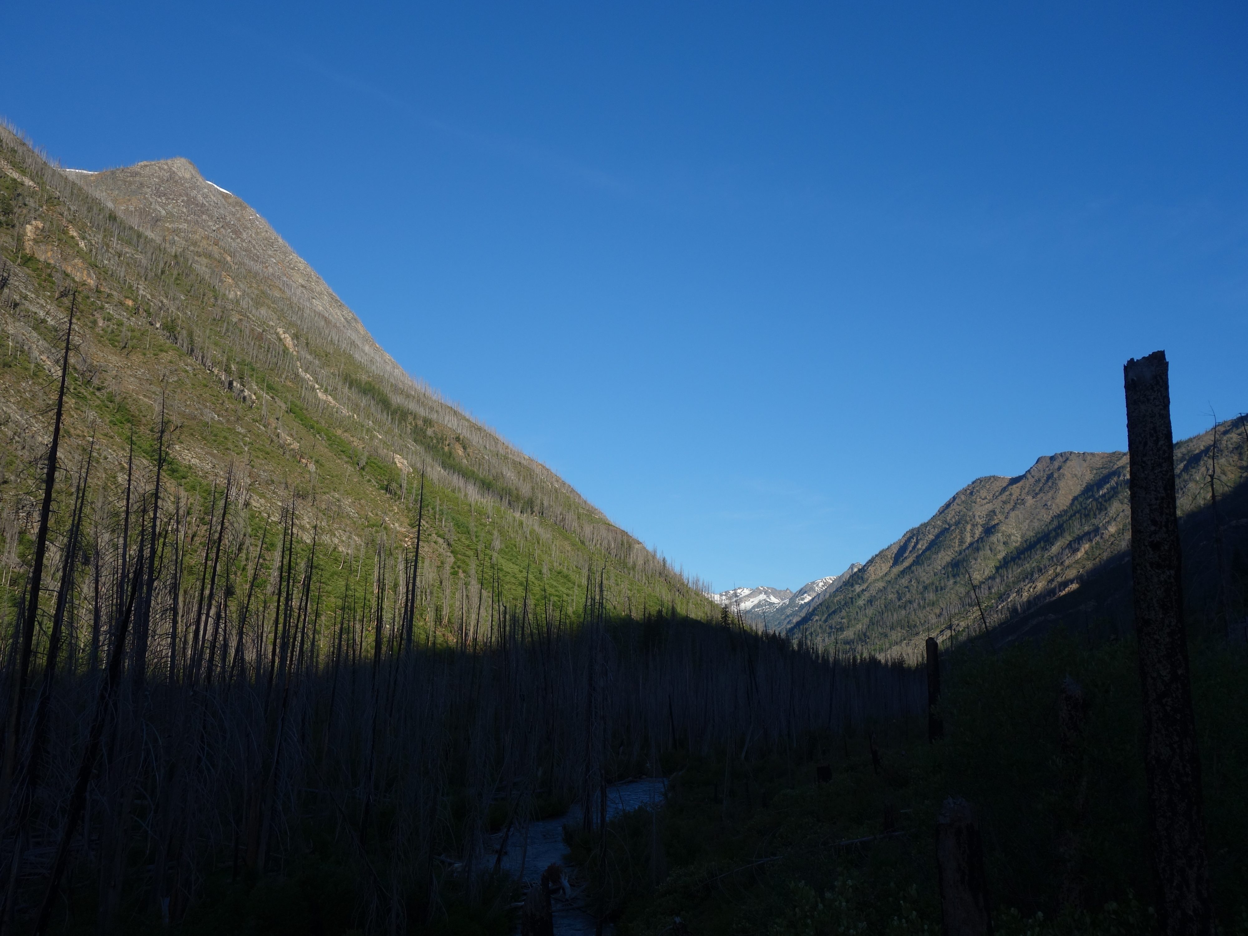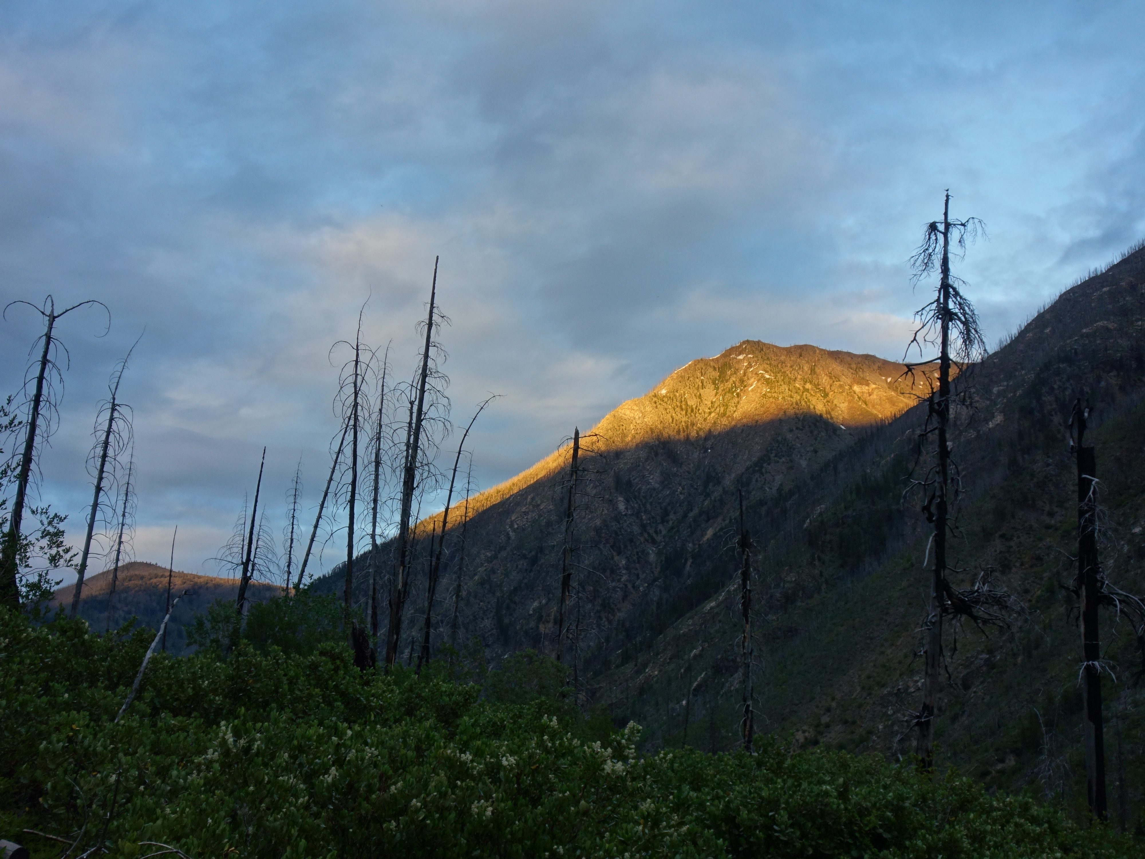 We left with bikes at 5:30am to perfectly clear skies, and started biking up the Methow River trail. However there is a bridge washout just 2.5 miles from the trailhead. The bridge over Trout Creek is gone. Despite the ranger sign at the trailhead stating the creek is impassible, we were able to either wade across (knee deep) or shimmy across on a log we spotted. We both made it across unscathed, however we had to leave the bikes as we couldn't take them across. Good thing though, as the next 5 miles of the trail is shitfucked.... impossible to bike, and horrible to walk on. The trail is totally overgrown with alders requiring constant schwacking, and many leg/arm scratches. Also it was difficult, sometimes very difficult to follow the trail; complete with dozens of large blowdowns. We went into this expecting to be able to bike all the way to the PCT, however this trail will probably never be biked again, and likely won't see many hikers either. Seems the Okanogan FS is unfortunately is letting it go, which is a real shame because it was such a major trail. Needless to say it took us 4.5 hours to go from the trailhead to intersect the PCT at Brush Creek.