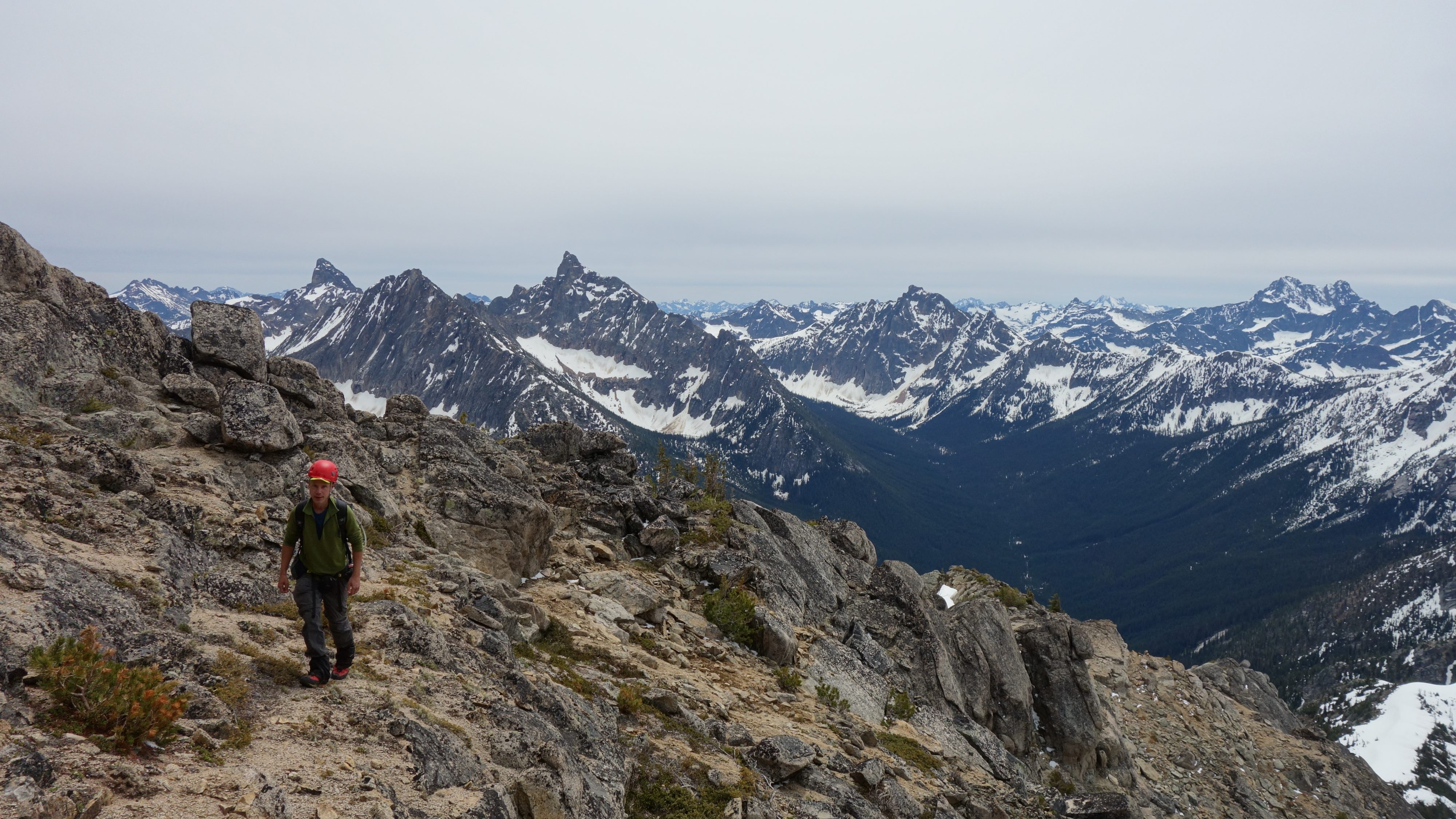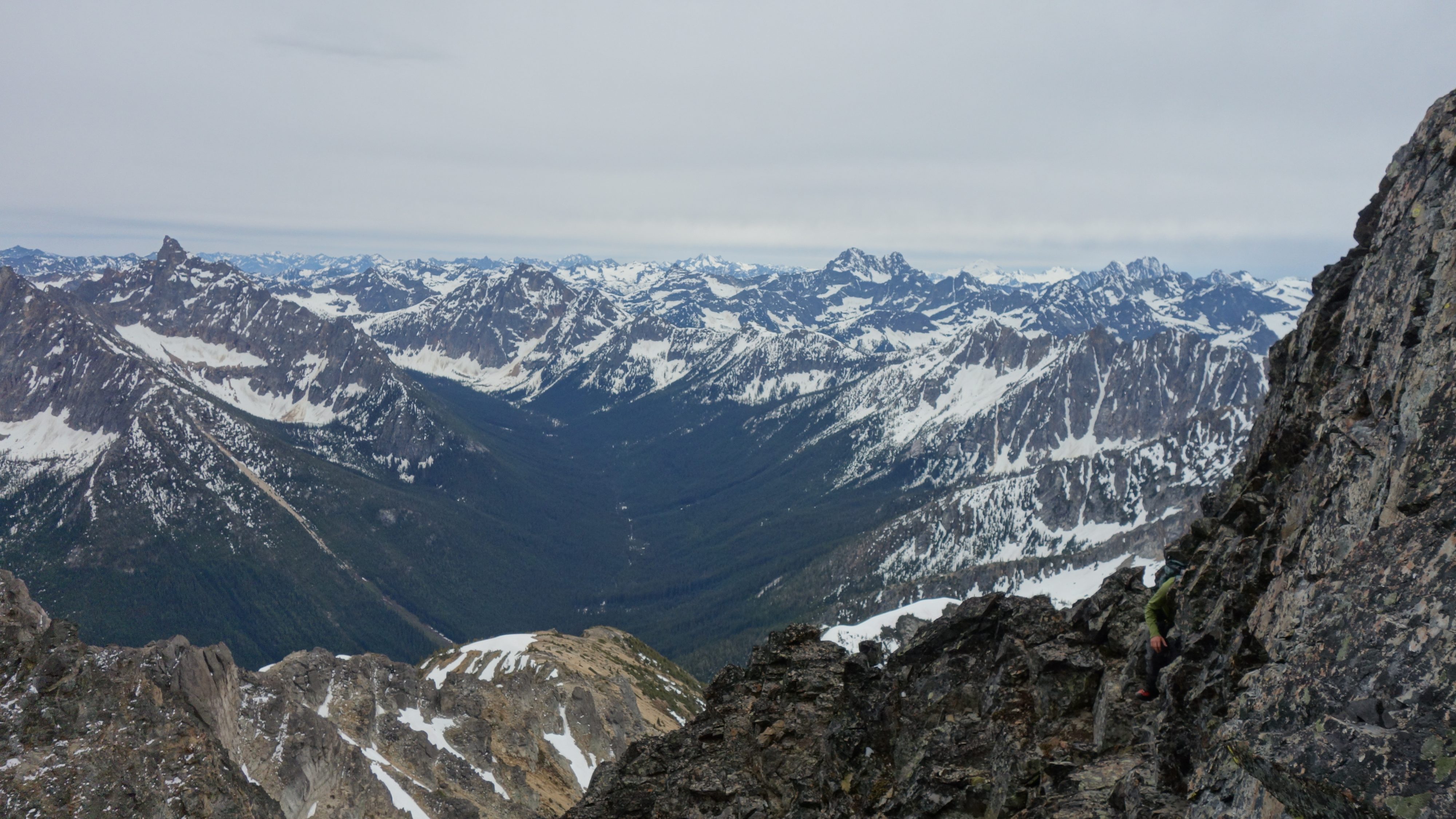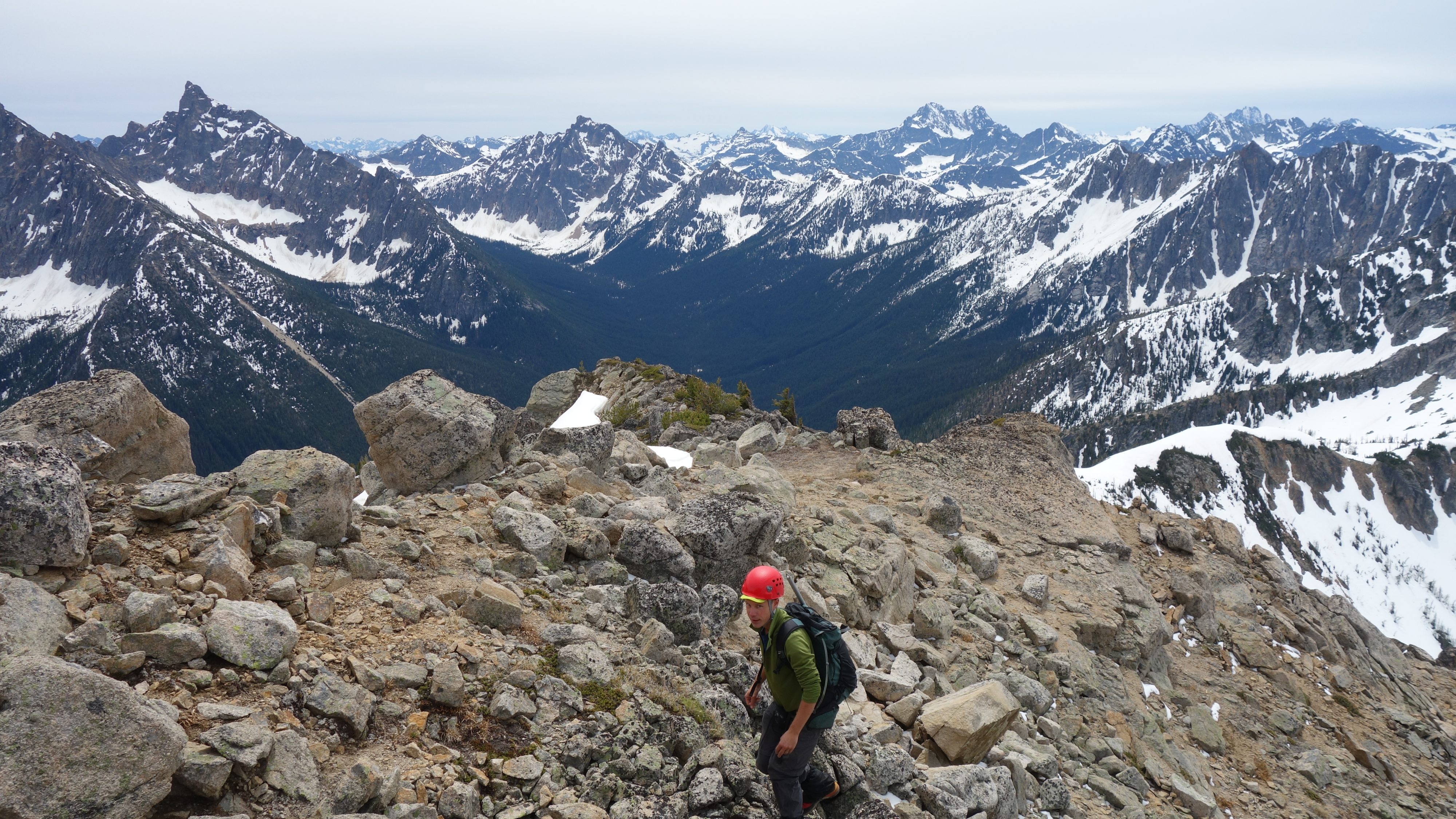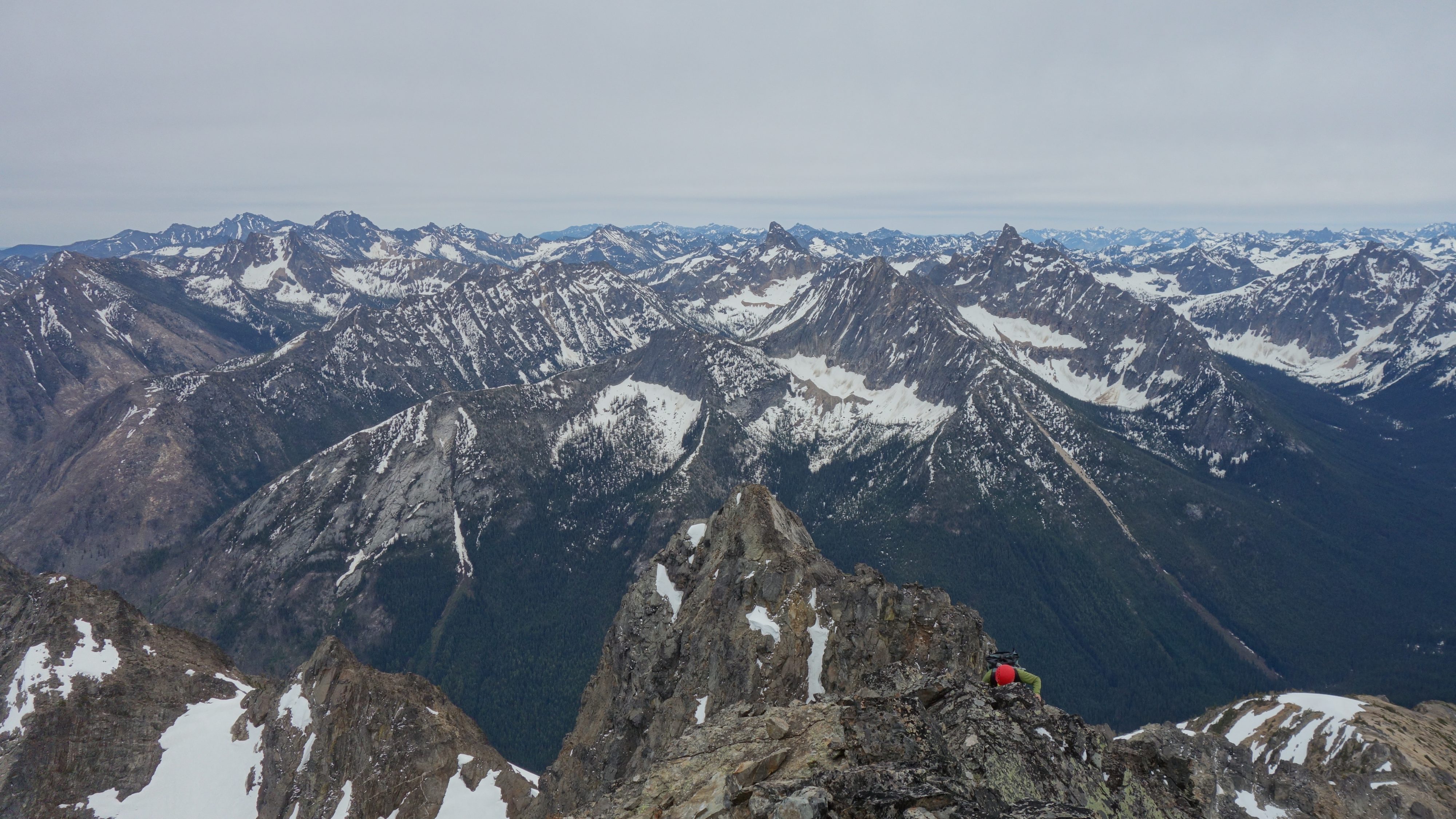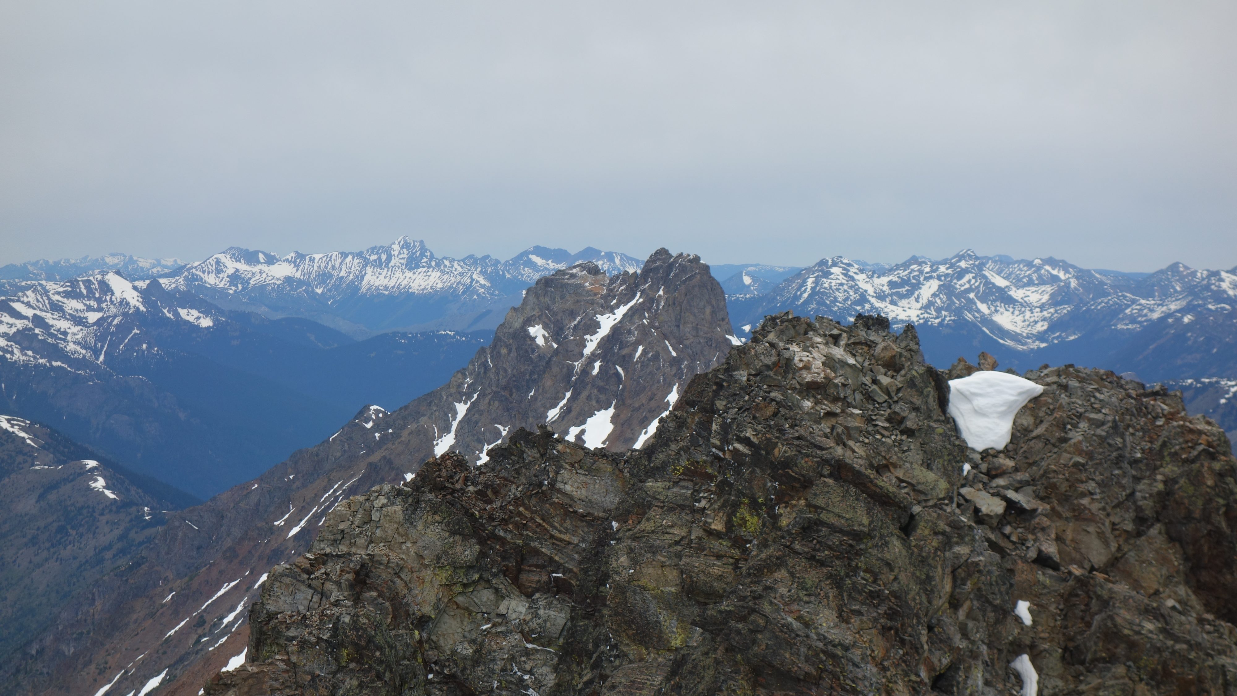 Lo and behold, we ended up on the west rib directly for a 200 foot vertical stretch where we did some sustained 4th class climbing. We got to a point where we could cross back to the south side of the rib, and back into the major gully, which we finished the final 200 feet up via class 3 rock. From the summit, which we reached at about 2pm, we had an amazing perspective of Jack, Ballard and the Pickets to the north, and Golden Horn, Tower and Black dominated the south view. Clouds began to obscure Baker, and I began wondering if our NWH friends made it up Lincoln Peak (hint: they did). Slate Pass and Harts Pass roads were easily visible, with still some snow covering them, however most of the peaks east of us were approaching bone dry. Crazy.