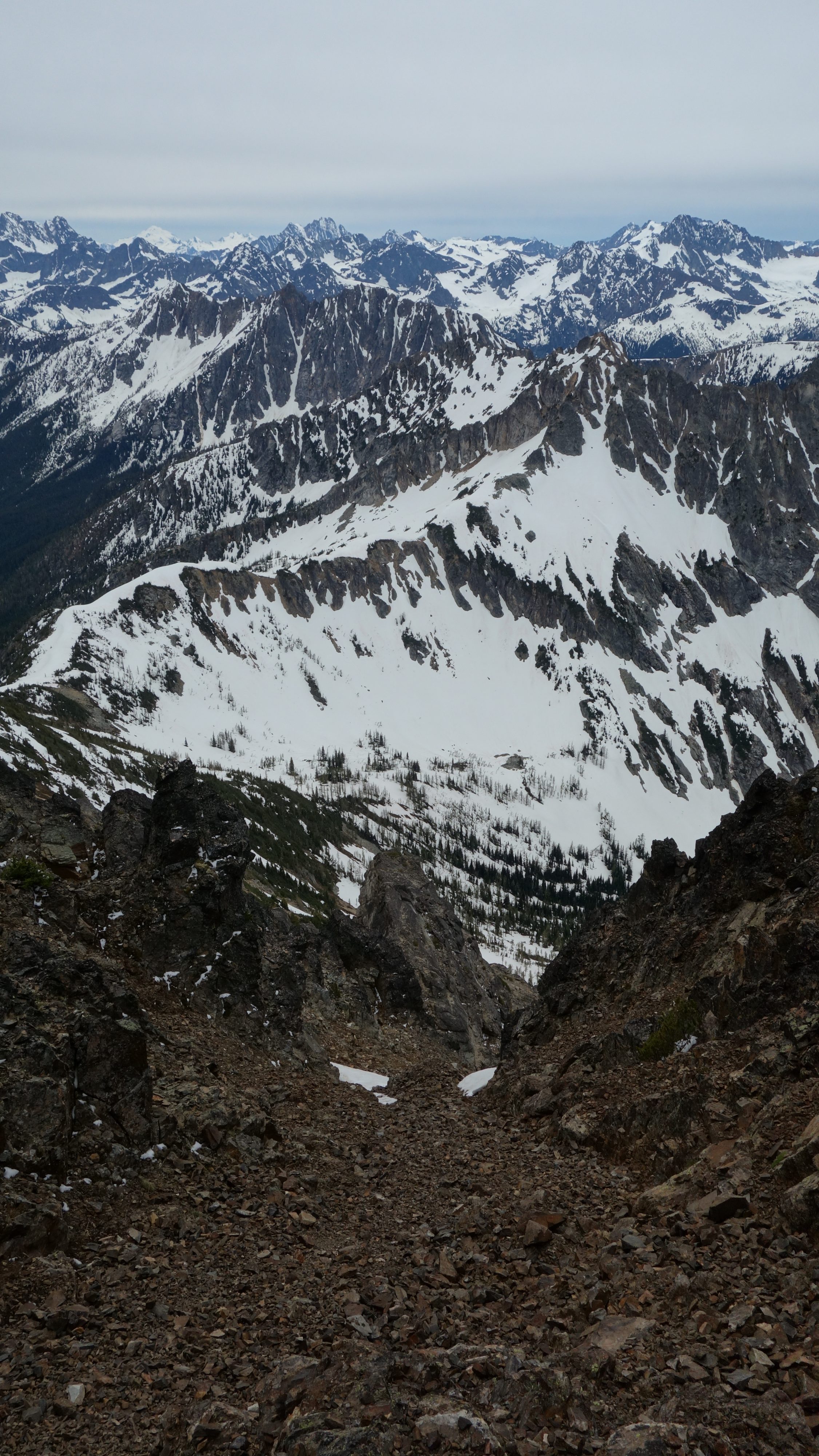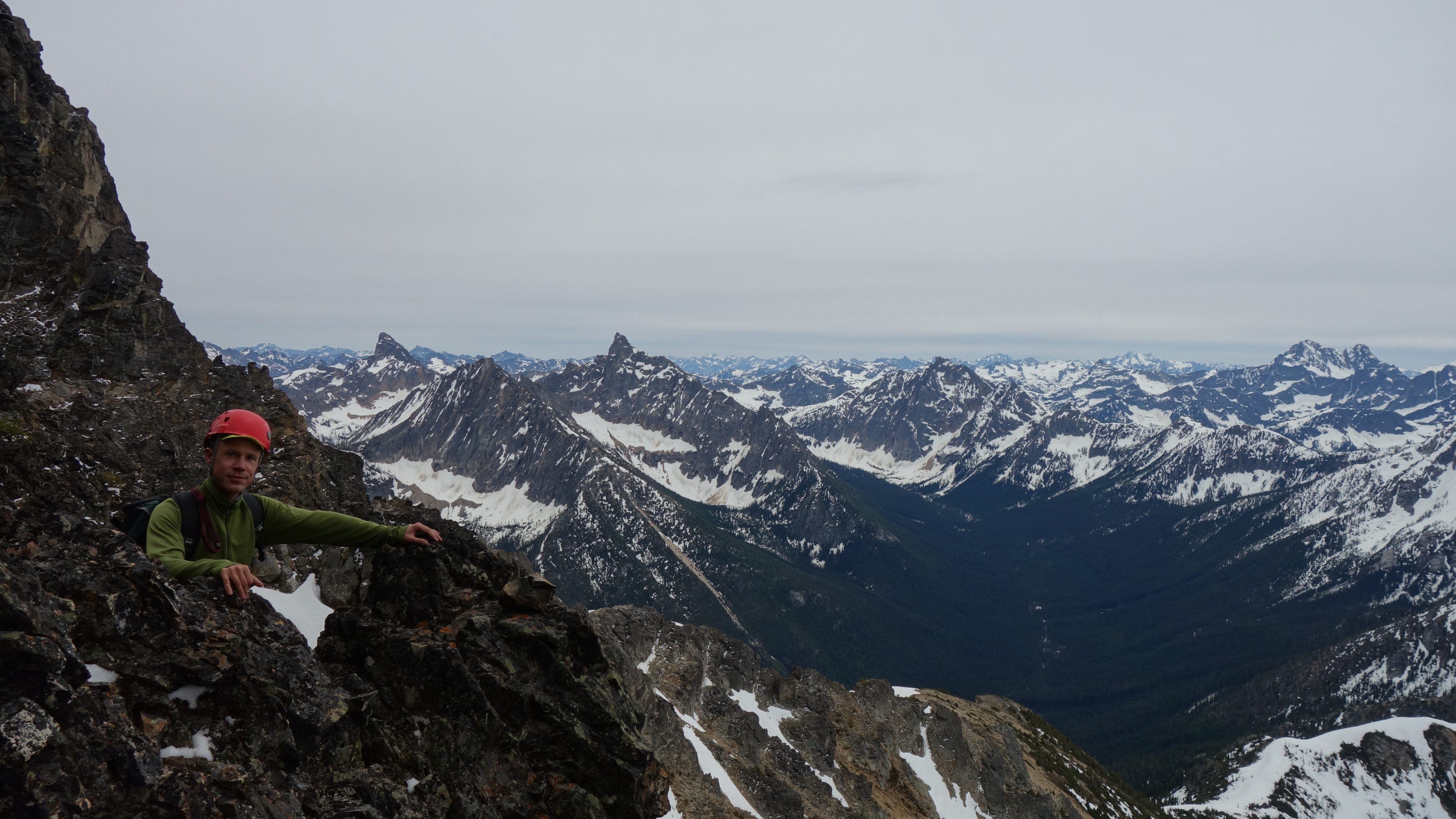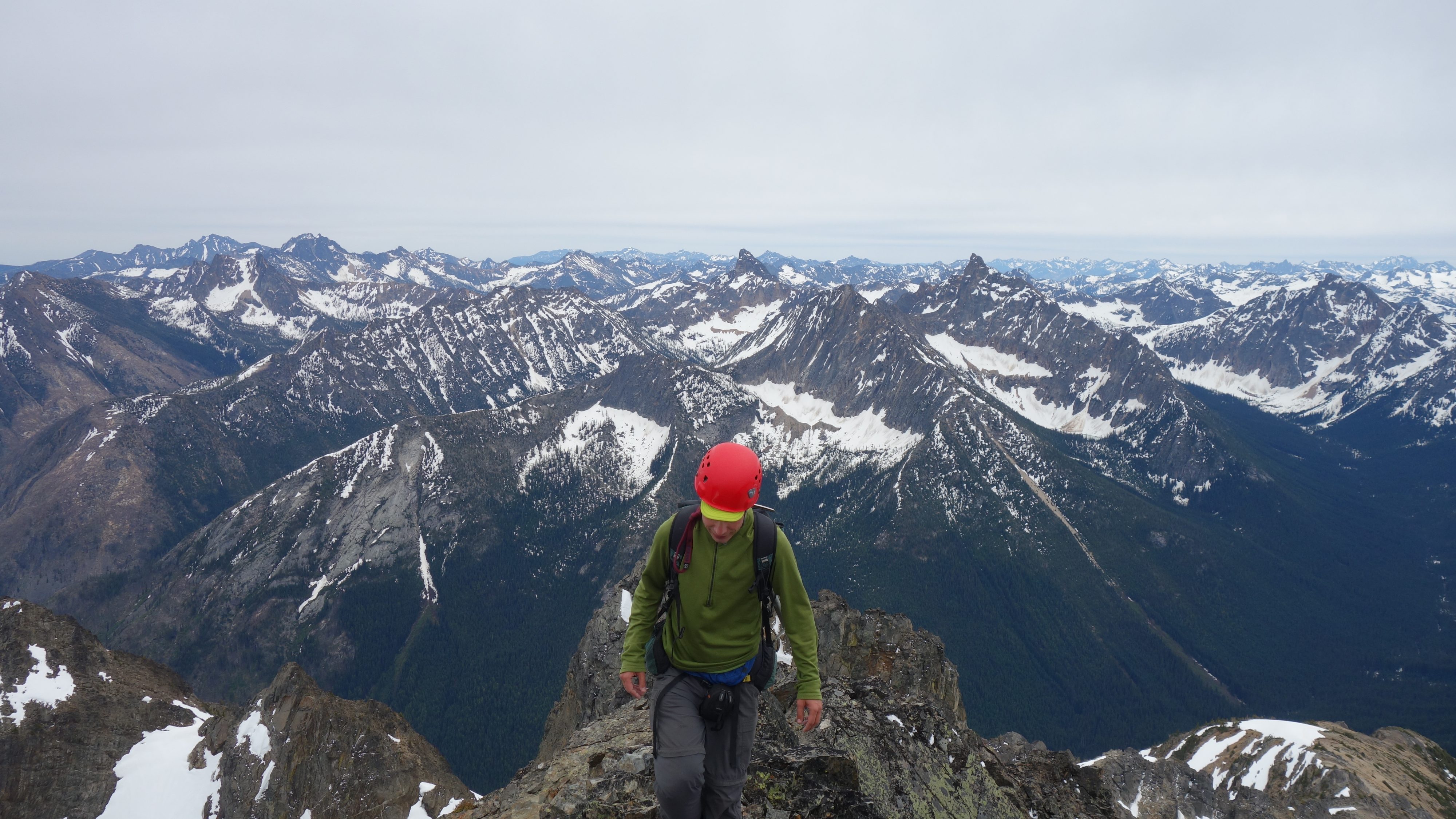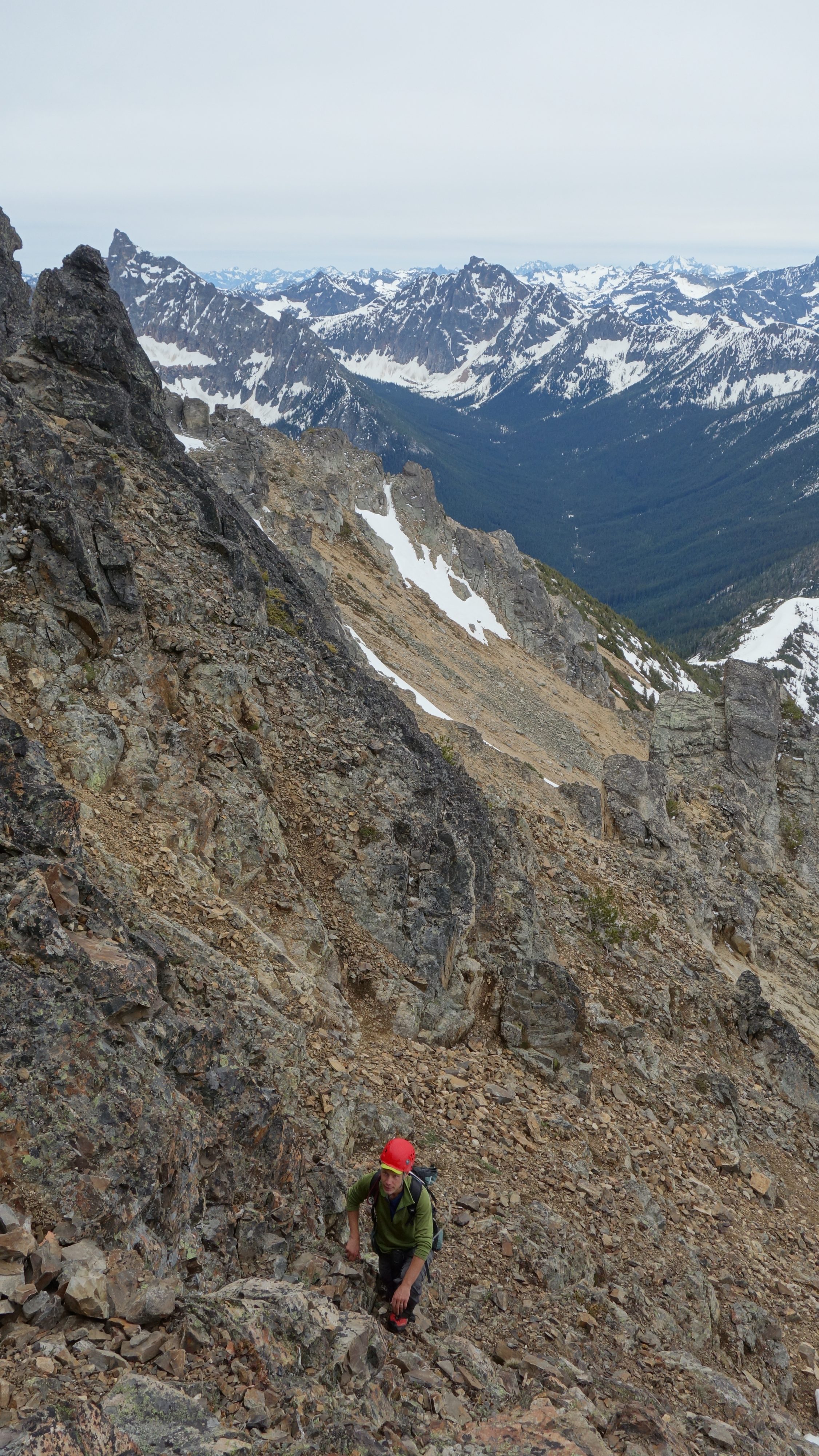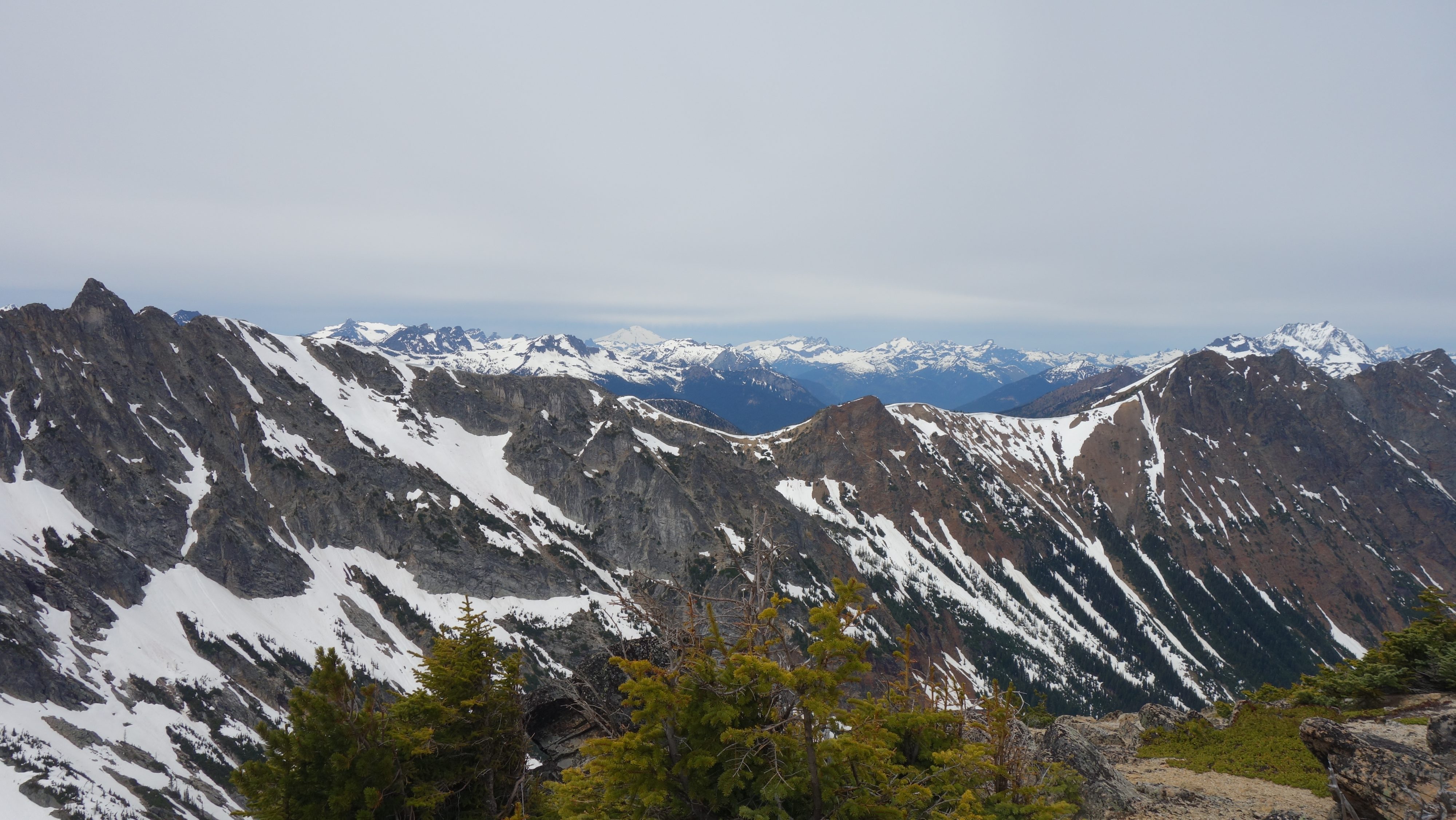 Lo and behold, we ended up on the west rib directly for a 200 foot vertical stretch where we did some sustained 4th class climbing. We got to a point where we could cross back to the south side of the rib, and back into the major gully, which we finished the final 200 feet up via class 3 rock. From the summit, which we reached at about 2pm, we had an amazing perspective of Jack, Ballard and the Pickets to the north, and Golden Horn, Tower and Black dominated the south view. Clouds began to obscure Baker, and I began wondering if our NWH friends made it up Lincoln Peak (hint: they did). Slate Pass and Harts Pass roads were easily visible, with still some snow covering them, however most of the peaks east of us were approaching bone dry. Crazy.