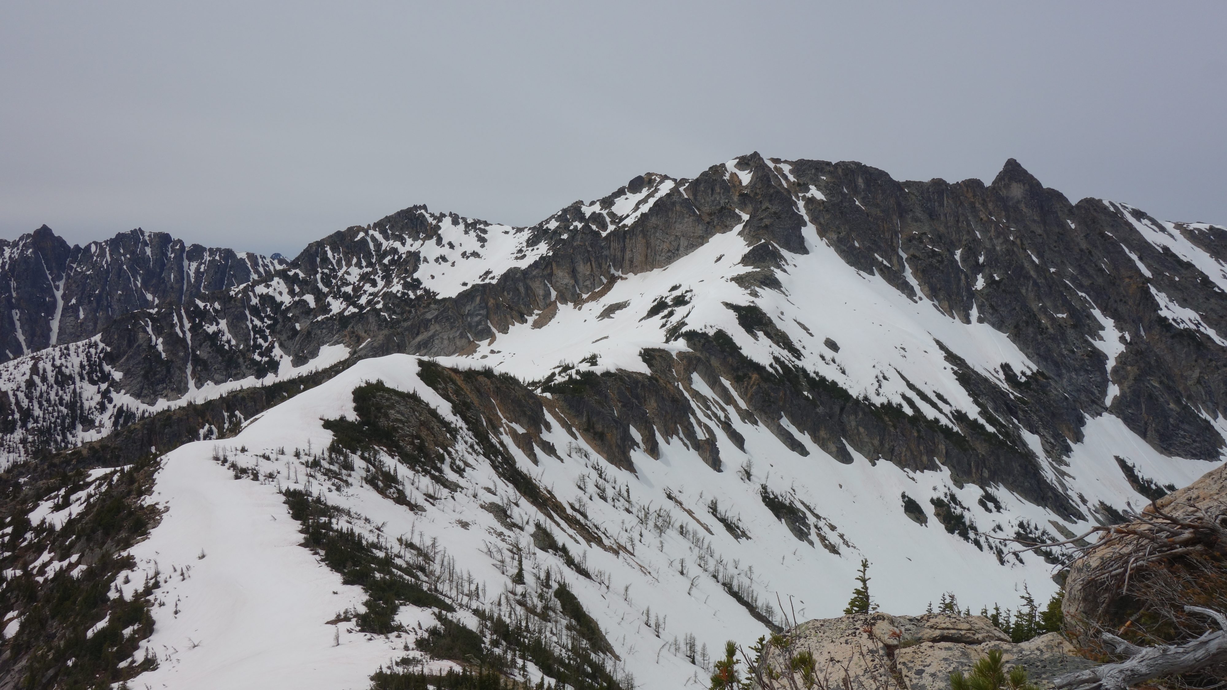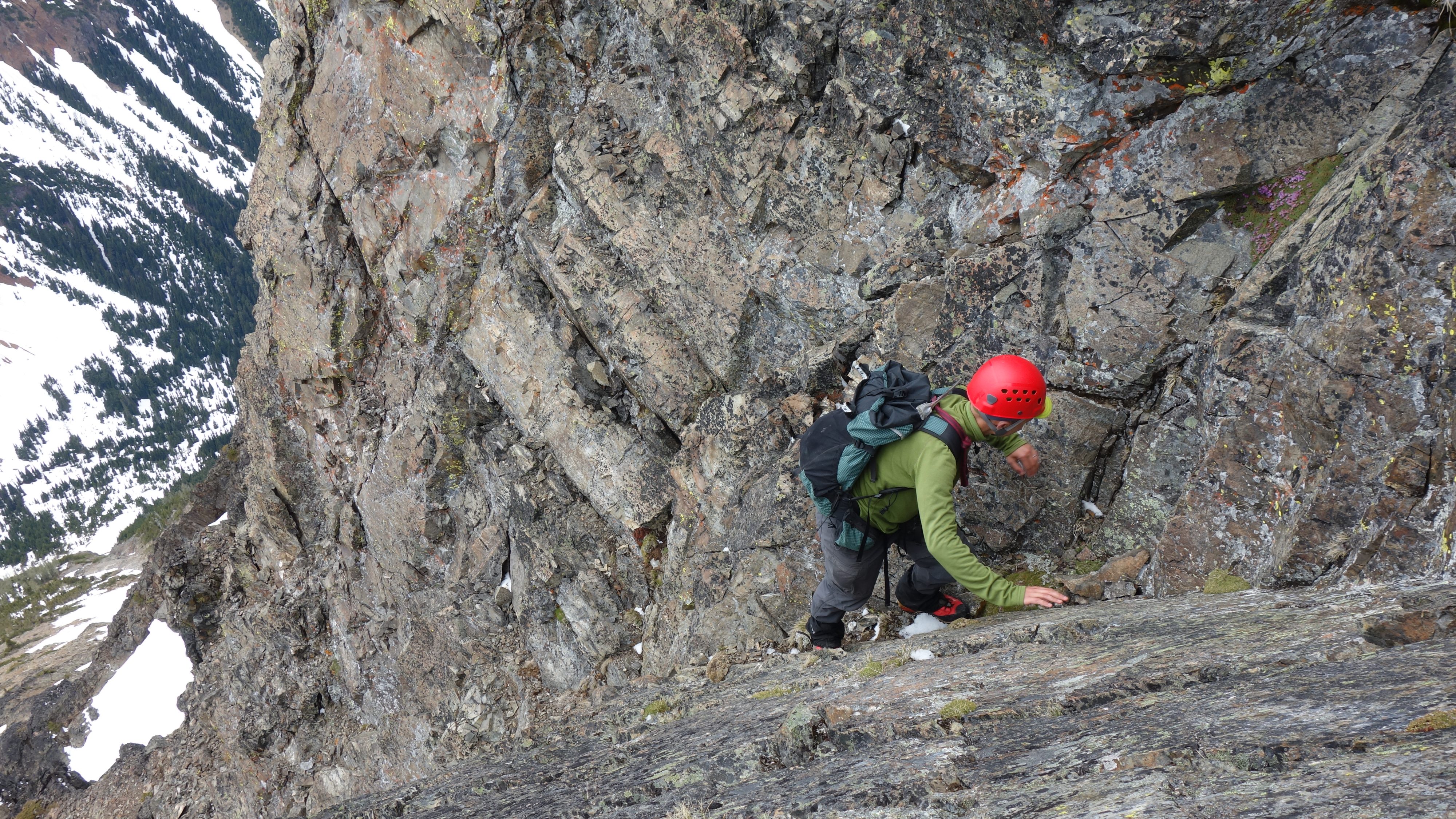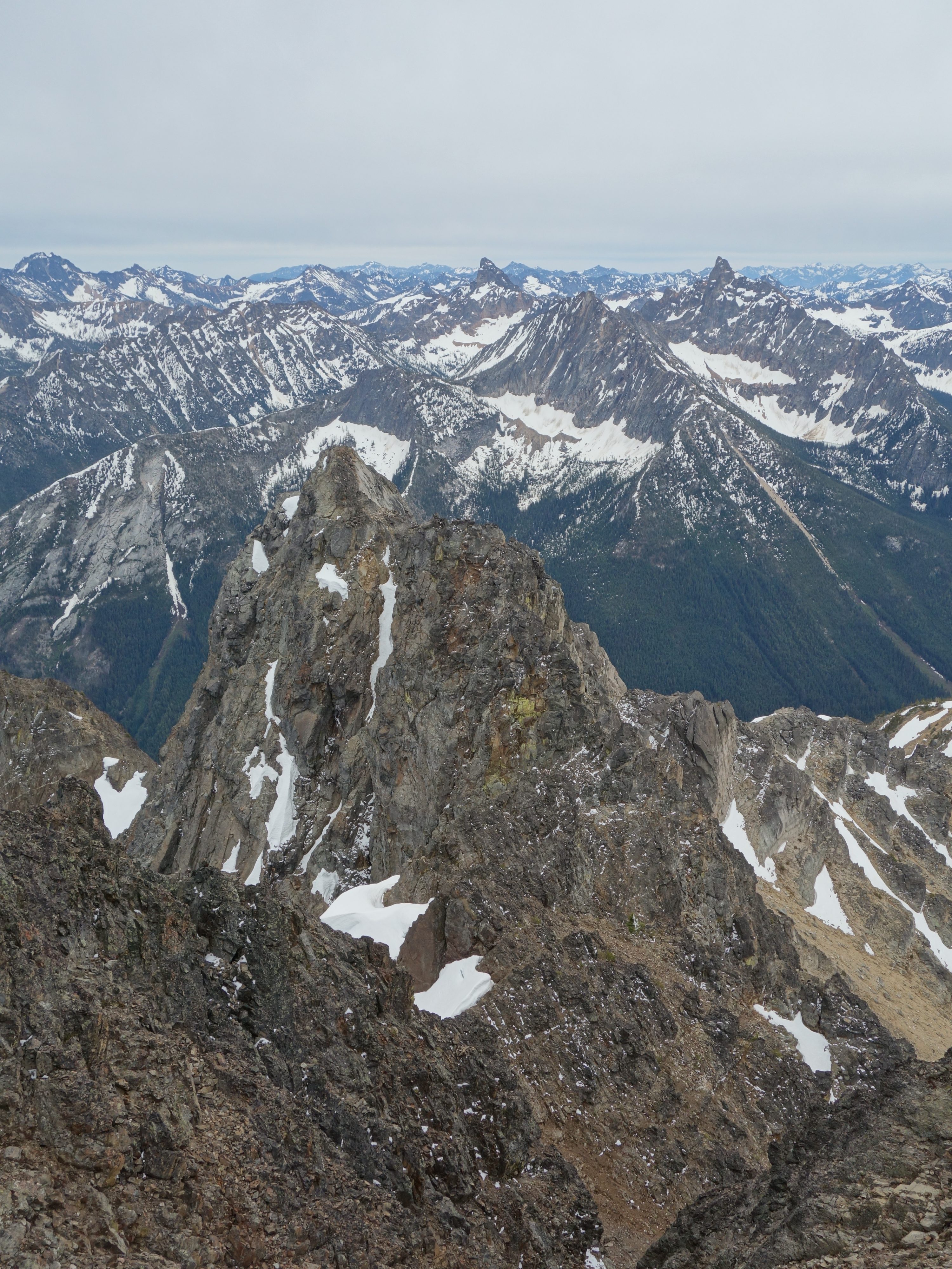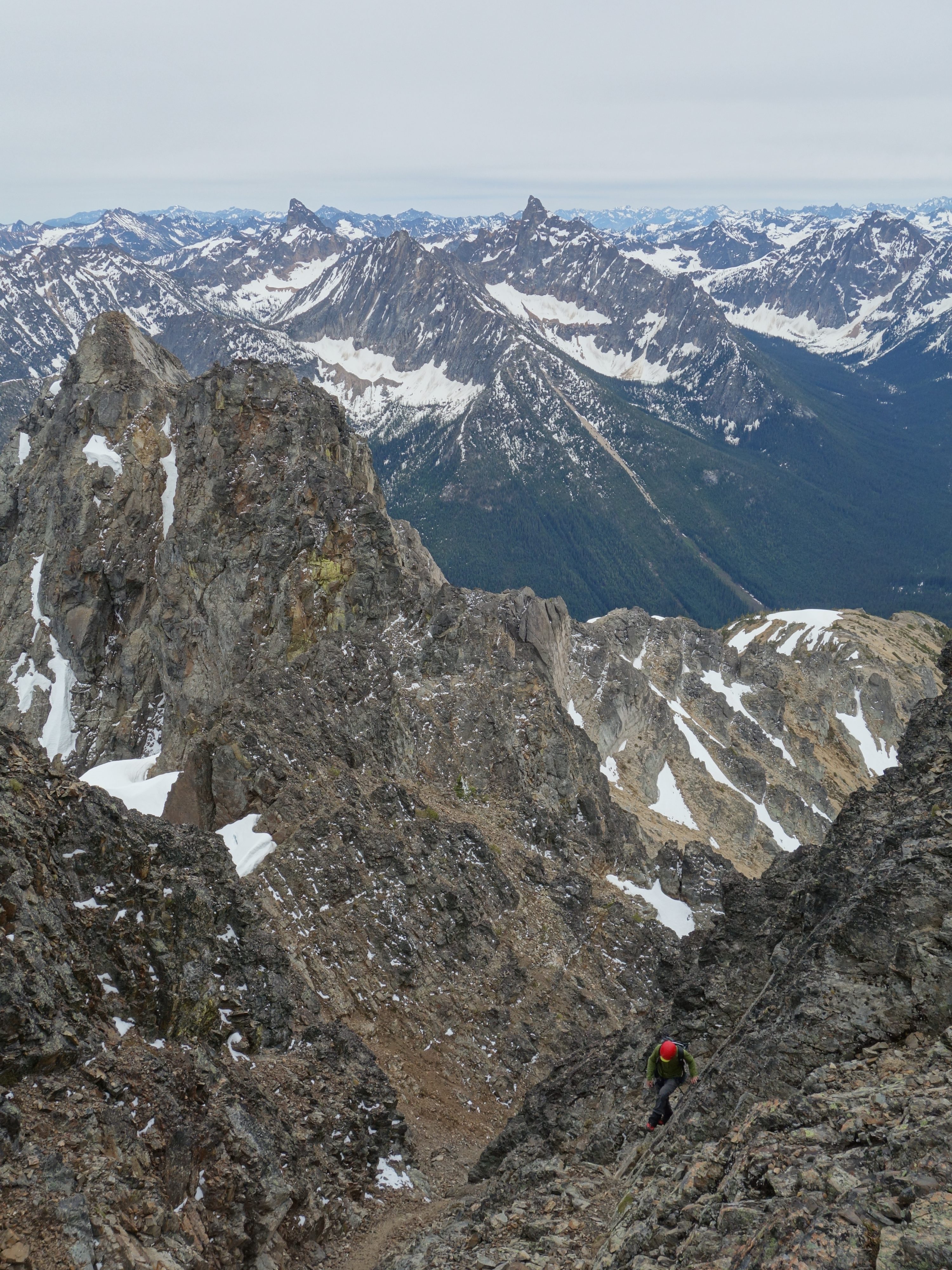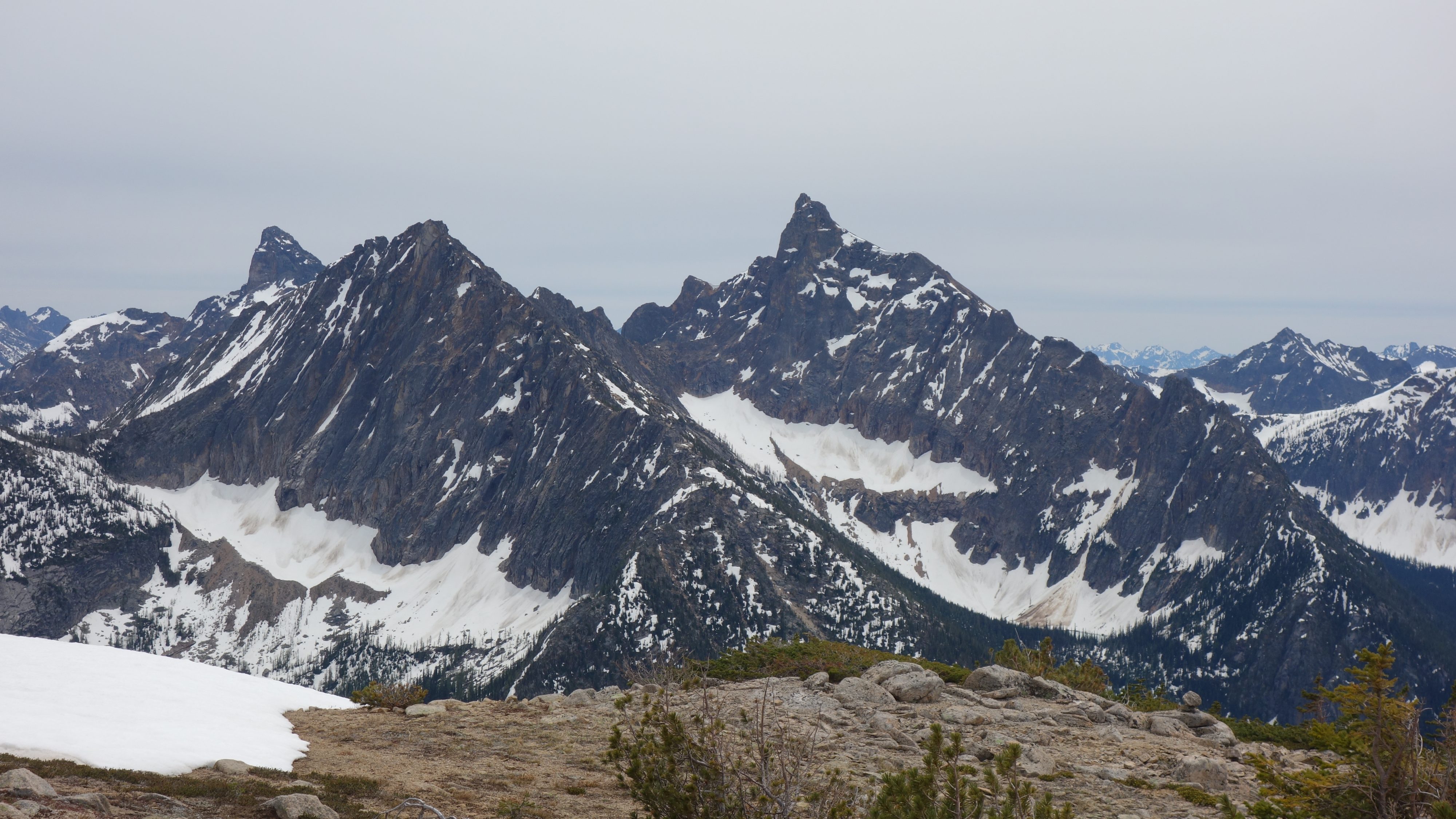 Lo and behold, we ended up on the west rib directly for a 200 foot vertical stretch where we did some sustained 4th class climbing. We got to a point where we could cross back to the south side of the rib, and back into the major gully, which we finished the final 200 feet up via class 3 rock. From the summit, which we reached at about 2pm, we had an amazing perspective of Jack, Ballard and the Pickets to the north, and Golden Horn, Tower and Black dominated the south view. Clouds began to obscure Baker, and I began wondering if our NWH friends made it up Lincoln Peak (hint: they did). Slate Pass and Harts Pass roads were easily visible, with still some snow covering them, however most of the peaks east of us were approaching bone dry. Crazy.