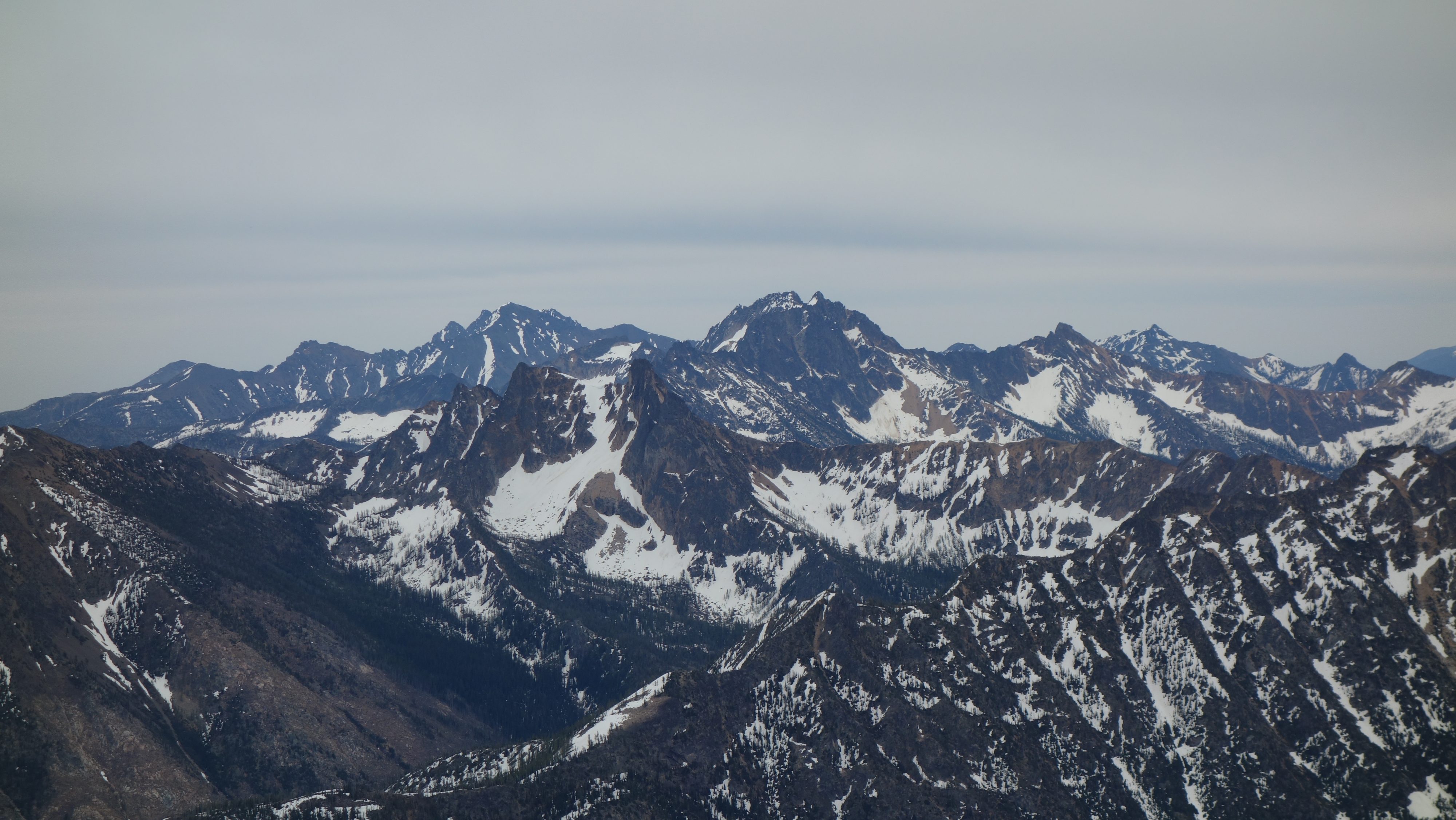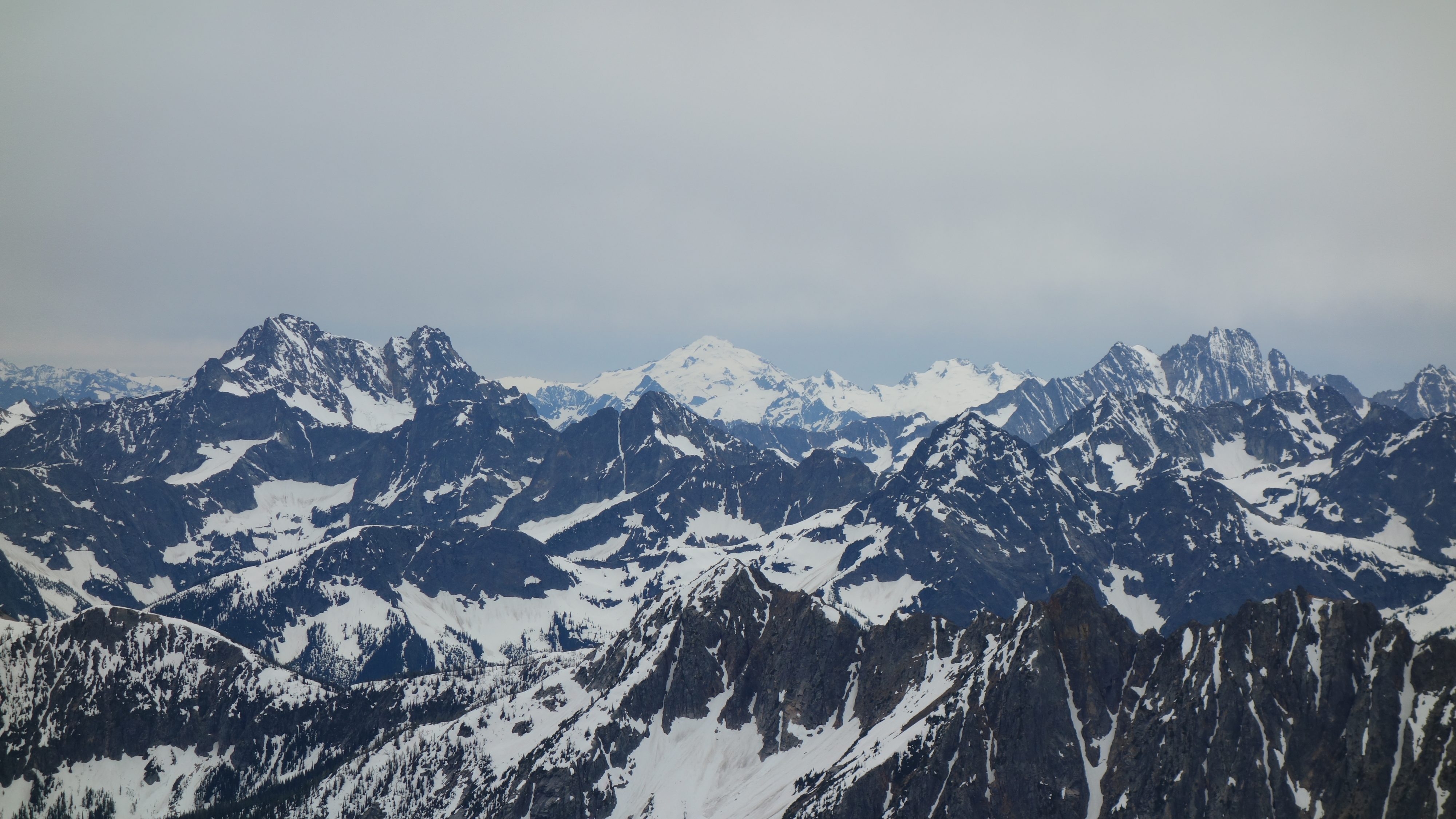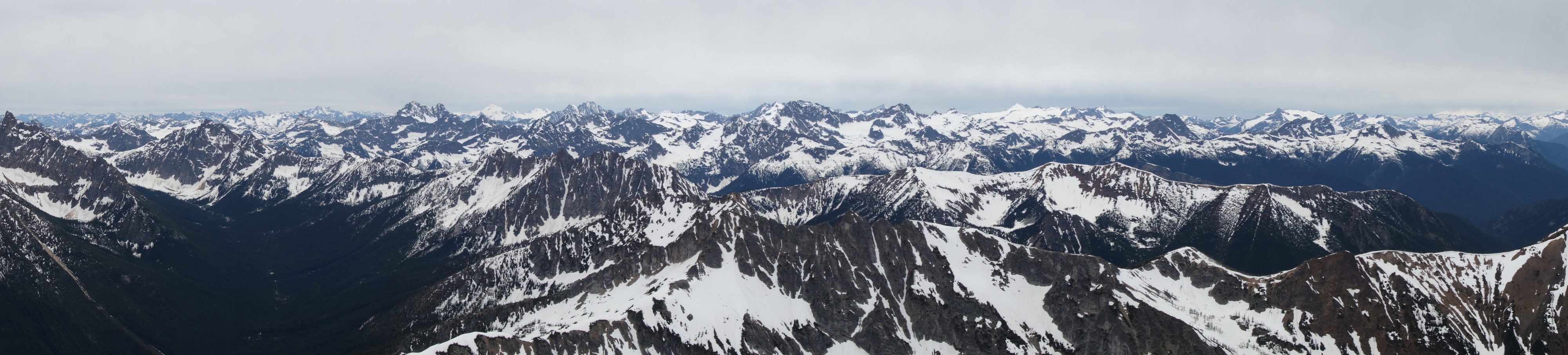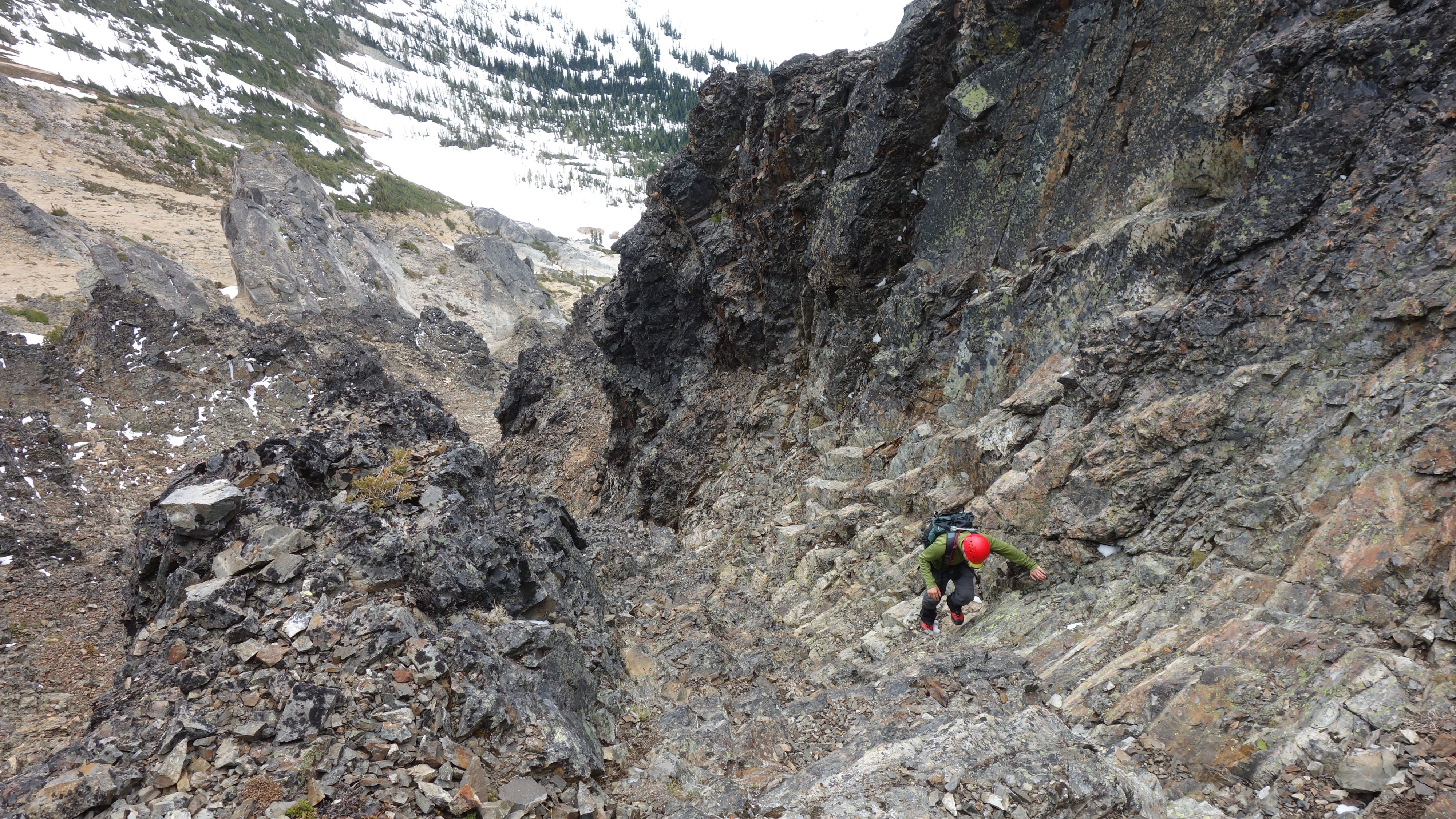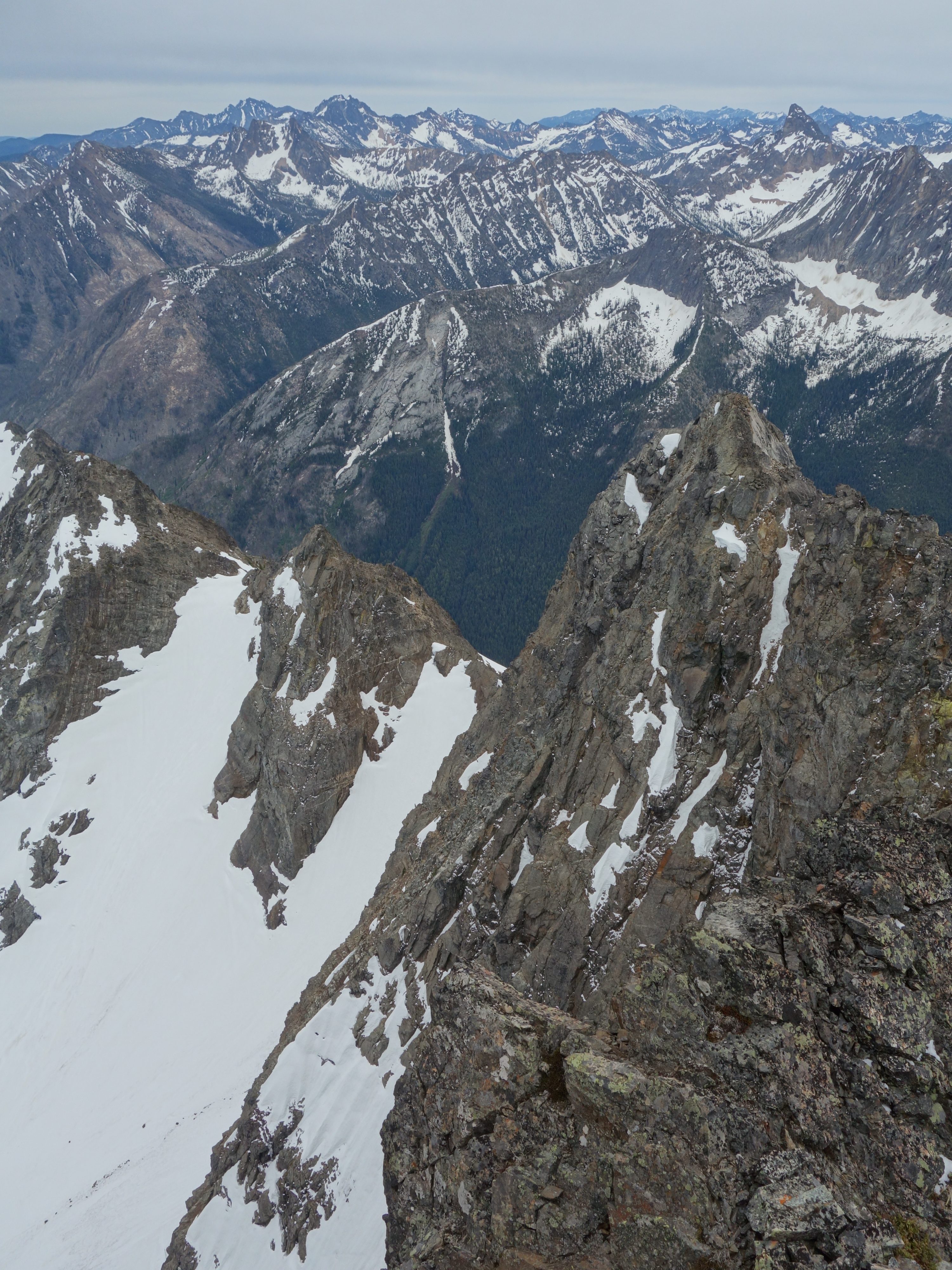 Lo and behold, we ended up on the west rib directly for a 200 foot vertical stretch where we did some sustained 4th class climbing. We got to a point where we could cross back to the south side of the rib, and back into the major gully, which we finished the final 200 feet up via class 3 rock. From the summit, which we reached at about 2pm, we had an amazing perspective of Jack, Ballard and the Pickets to the north, and Golden Horn, Tower and Black dominated the south view. Clouds began to obscure Baker, and I began wondering if our NWH friends made it up Lincoln Peak (hint: they did). Slate Pass and Harts Pass roads were easily visible, with still some snow covering them, however most of the peaks east of us were approaching bone dry. Crazy.