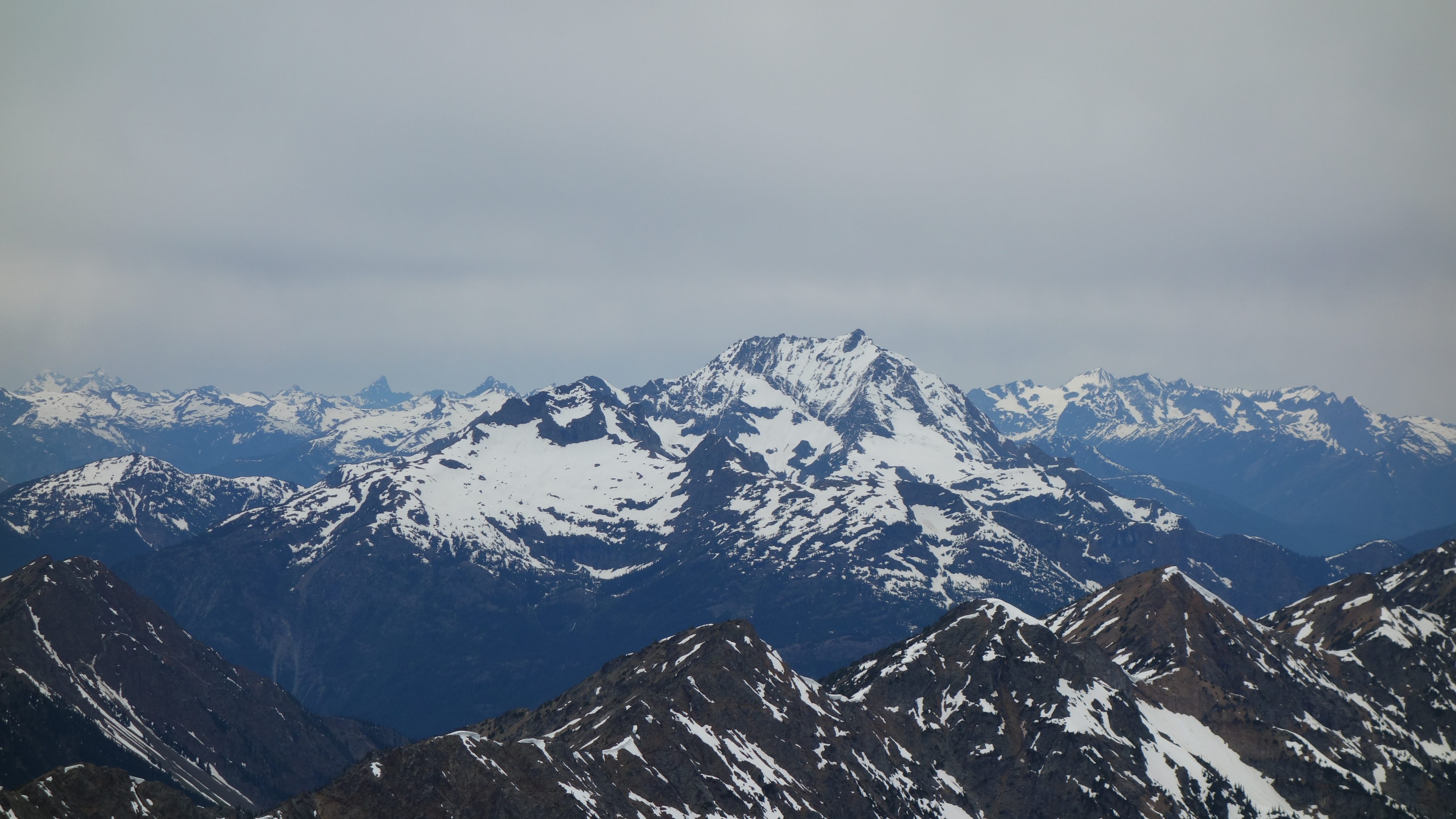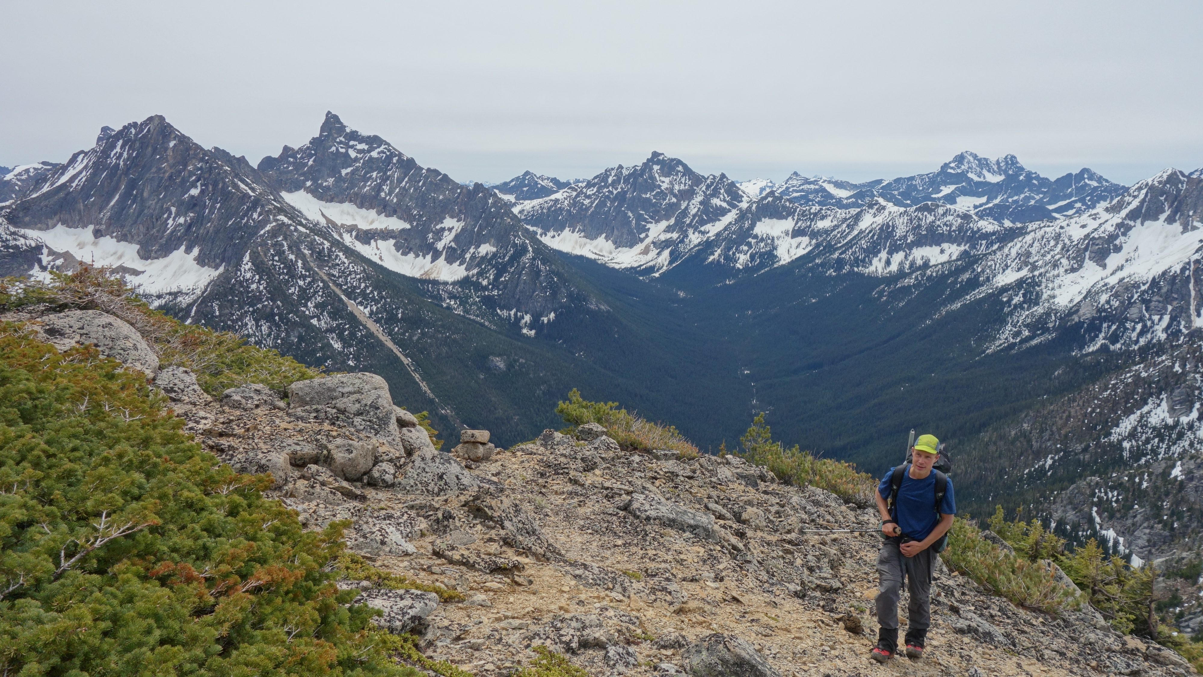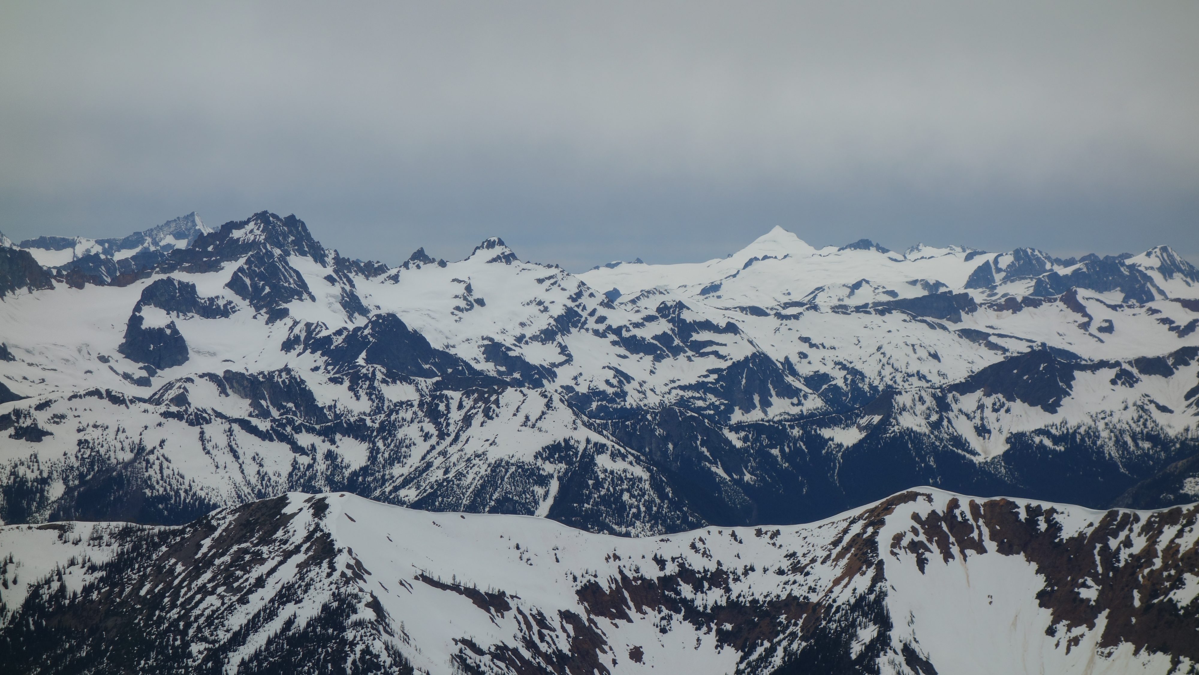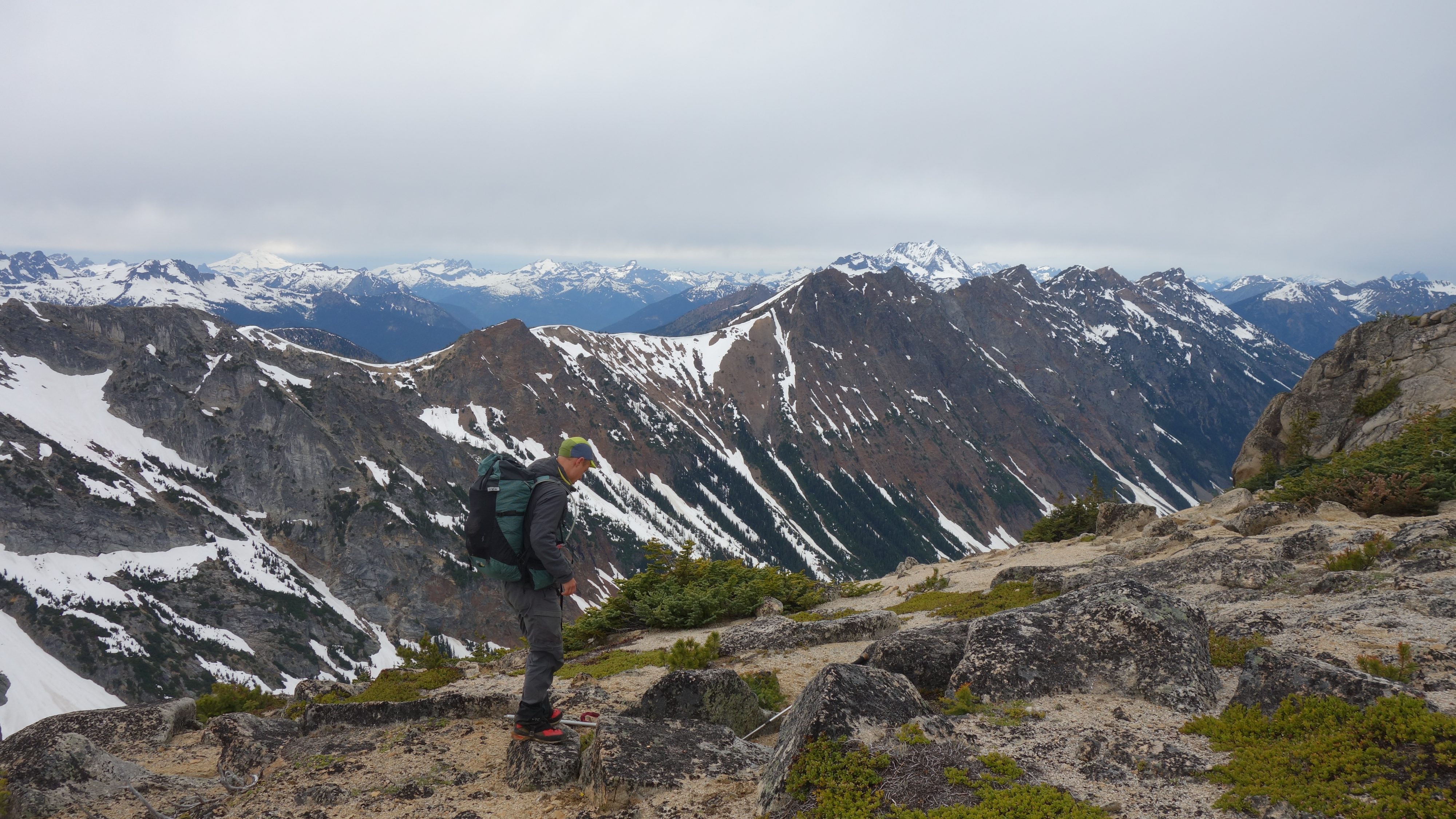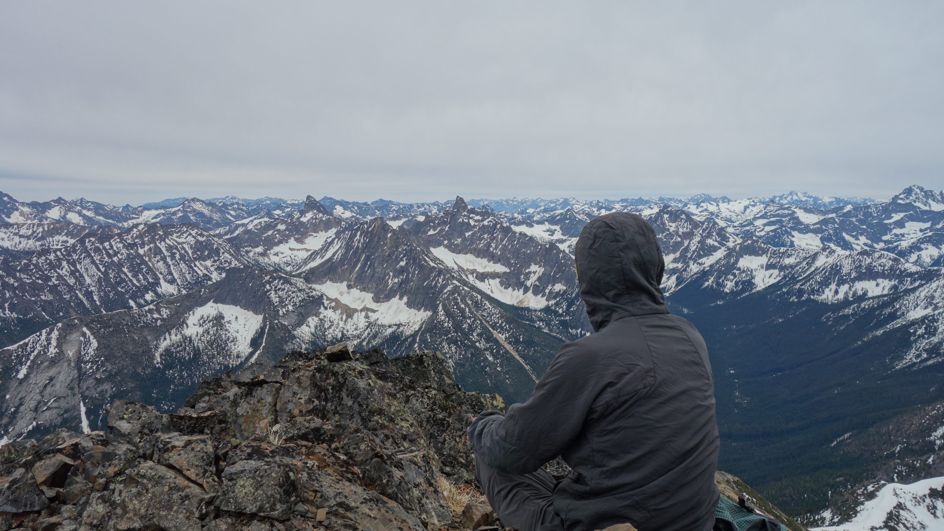 Lo and behold, we ended up on the west rib directly for a 200 foot vertical stretch where we did some sustained 4th class climbing. We got to a point where we could cross back to the south side of the rib, and back into the major gully, which we finished the final 200 feet up via class 3 rock. From the summit, which we reached at about 2pm, we had an amazing perspective of Jack, Ballard and the Pickets to the north, and Golden Horn, Tower and Black dominated the south view. Clouds began to obscure Baker, and I began wondering if our NWH friends made it up Lincoln Peak (hint: they did). Slate Pass and Harts Pass roads were easily visible, with still some snow covering them, however most of the peaks east of us were approaching bone dry. Crazy.