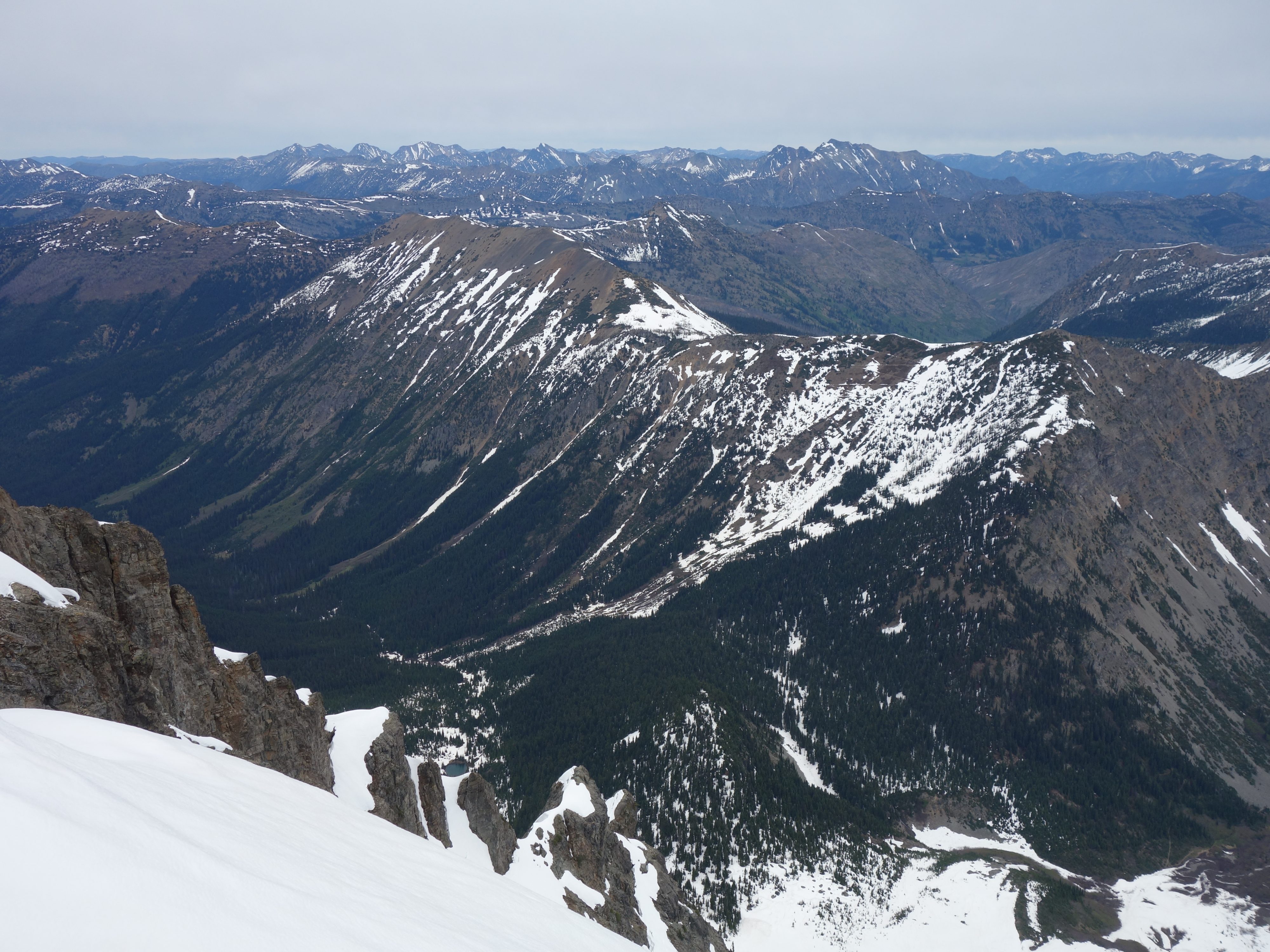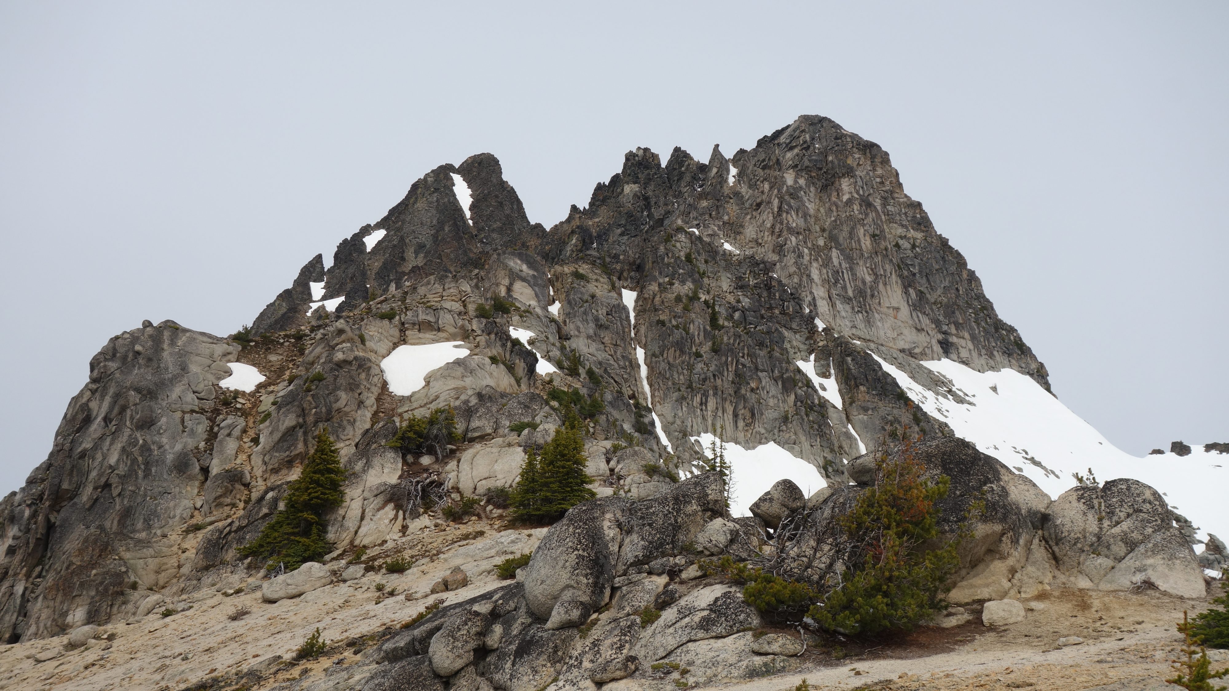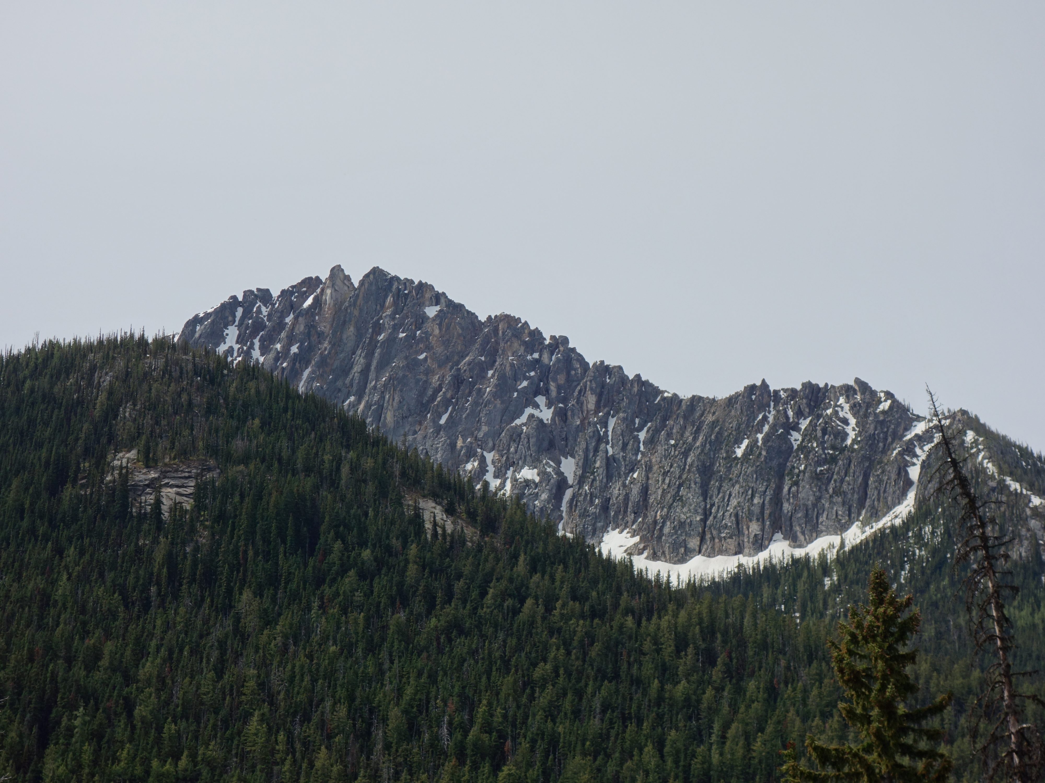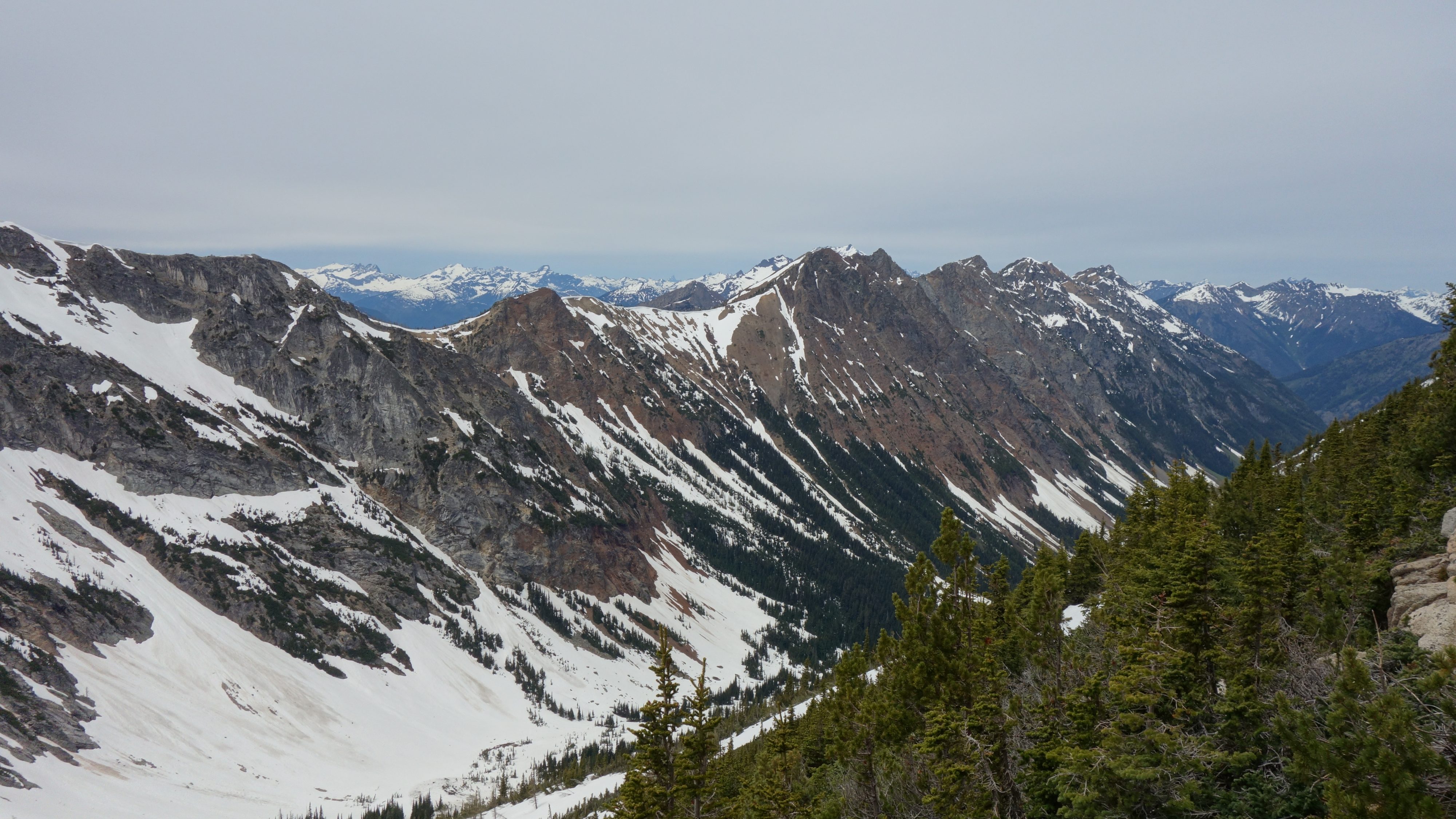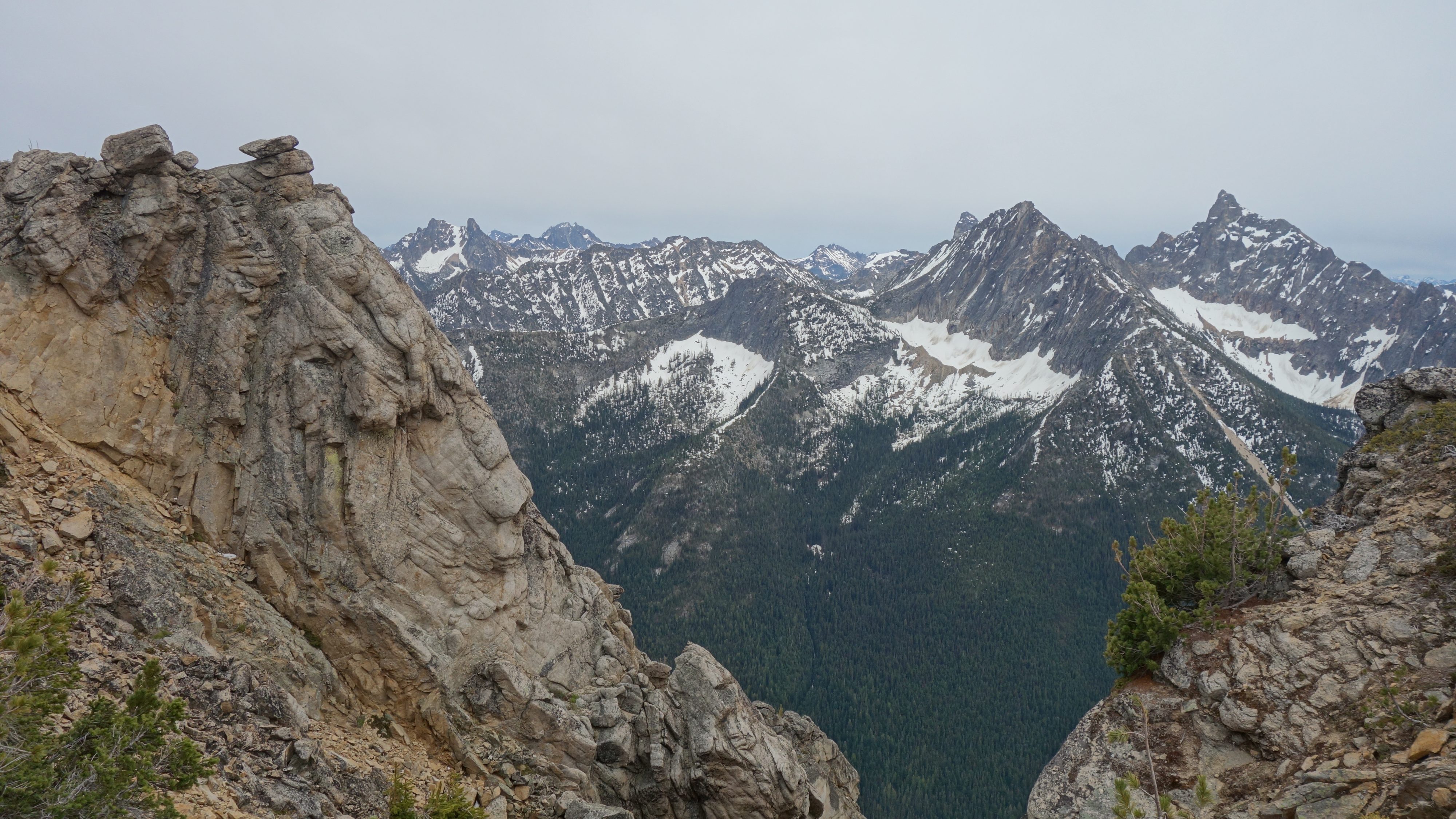 Lo and behold, we ended up on the west rib directly for a 200 foot vertical stretch where we did some sustained 4th class climbing. We got to a point where we could cross back to the south side of the rib, and back into the major gully, which we finished the final 200 feet up via class 3 rock. From the summit, which we reached at about 2pm, we had an amazing perspective of Jack, Ballard and the Pickets to the north, and Golden Horn, Tower and Black dominated the south view. Clouds began to obscure Baker, and I began wondering if our NWH friends made it up Lincoln Peak (hint: they did). Slate Pass and Harts Pass roads were easily visible, with still some snow covering them, however most of the peaks east of us were approaching bone dry. Crazy.