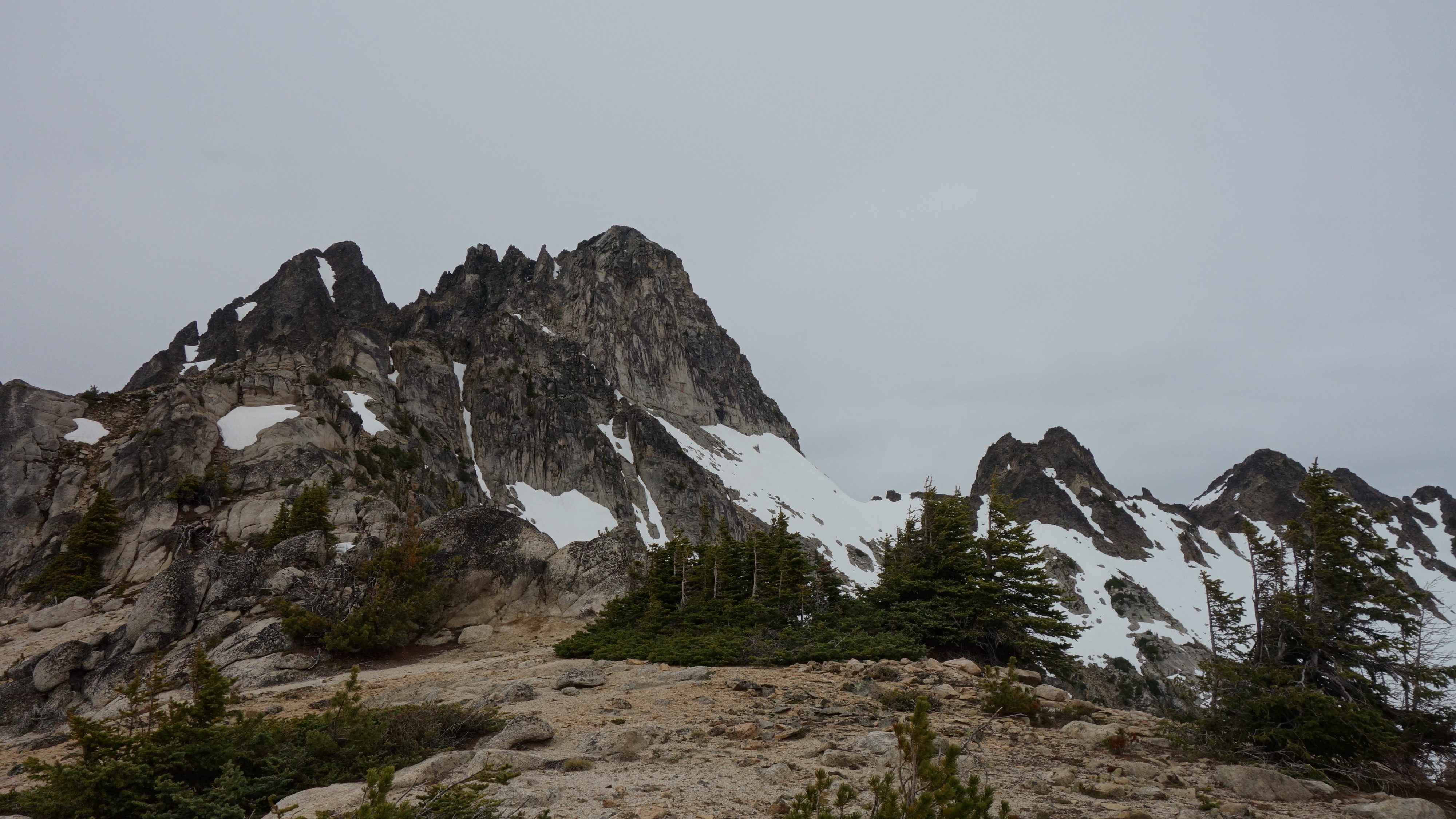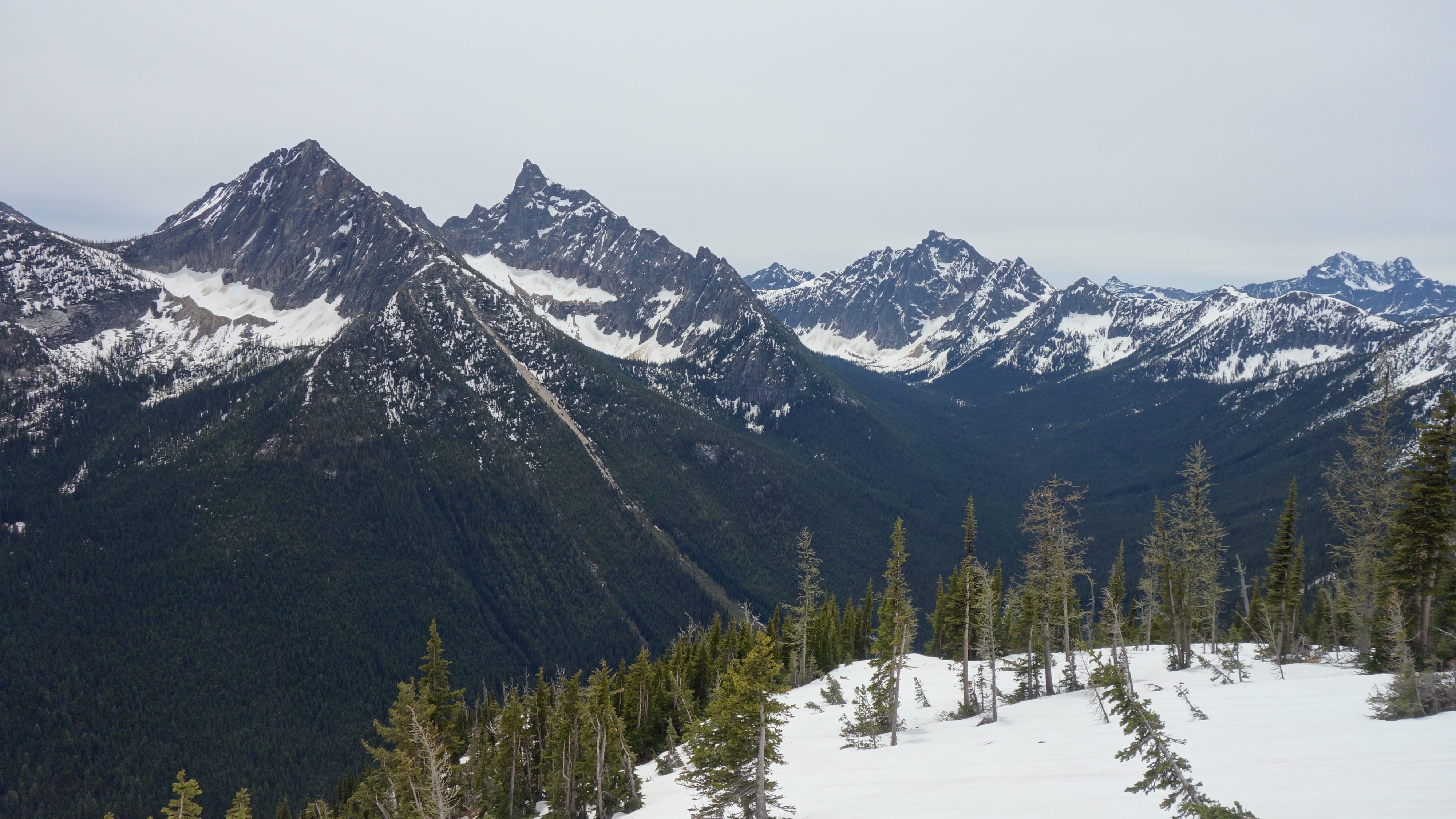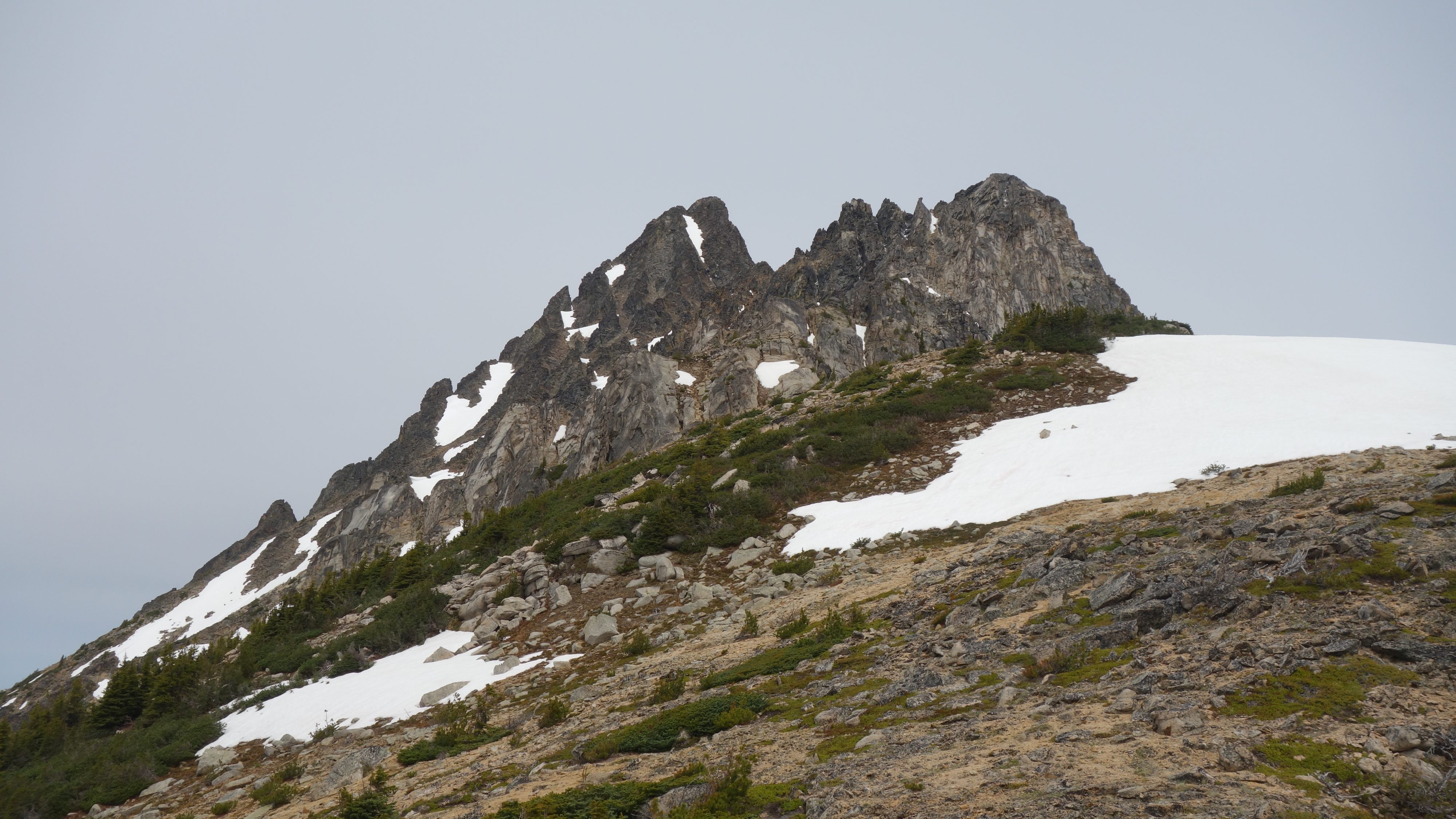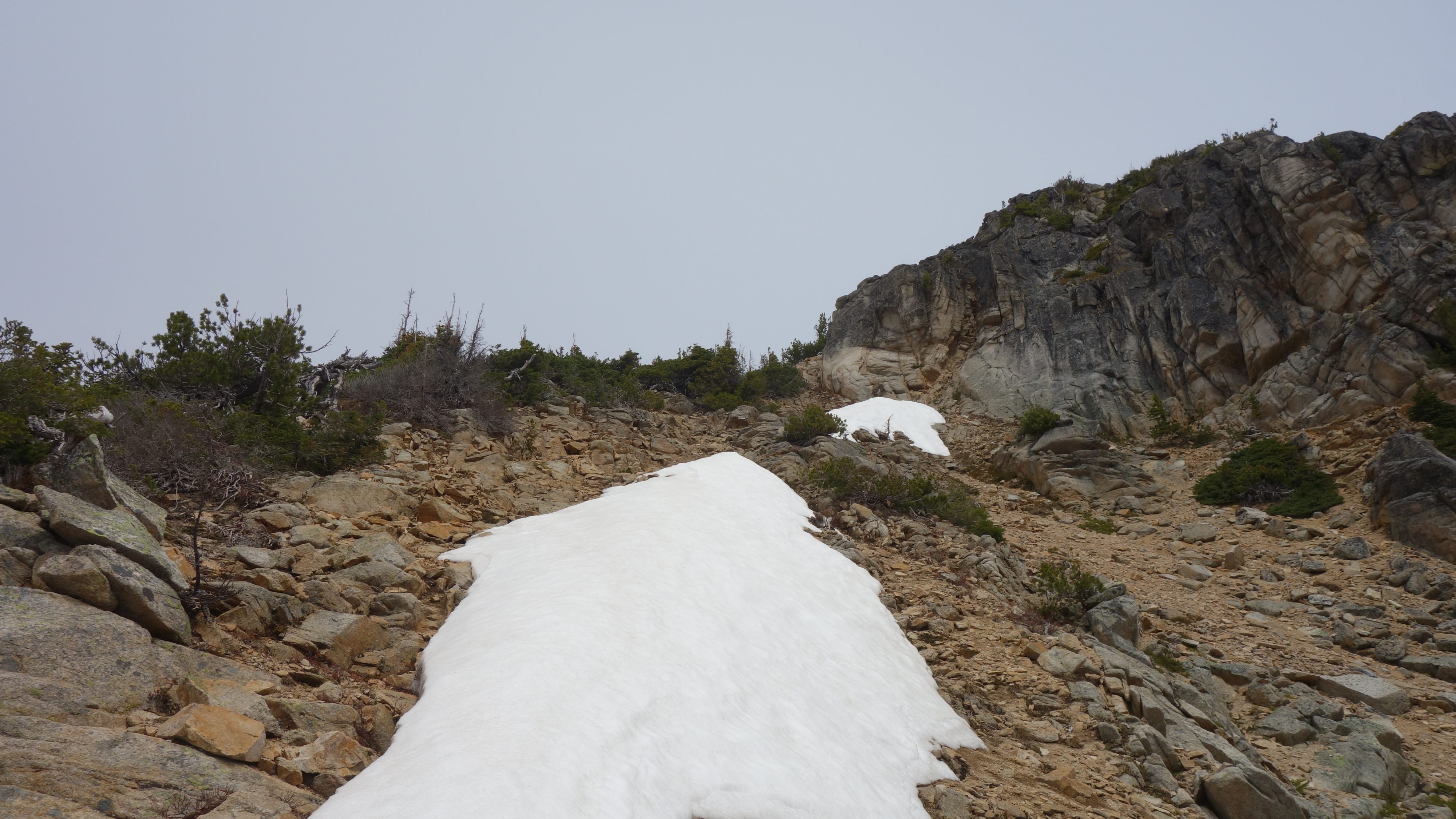 Once here, we continued an additional 2 miles west on the flat PCT. This trail was downright luxurious in comparison! Eventually we made it to the small Azurite Pass Trail, which veered off to the right (north) at the west end of a large alder field, thankfully avoiding said alders. Amazingly, this small trail was easy to follow, and switchbacked nicely all the way until we hit continuous snow at roughly 6400 feet elevation. Once we hit the snow, it was easy to boot up to the 6750 foot Azurite Pass, then continue up to 7400 feet on the south ridge of Azurite. It was at this time the snow ended, and we took a long break on the broad ridge. Clouds completely obscured the sun at this point, and we discussed what we would do.