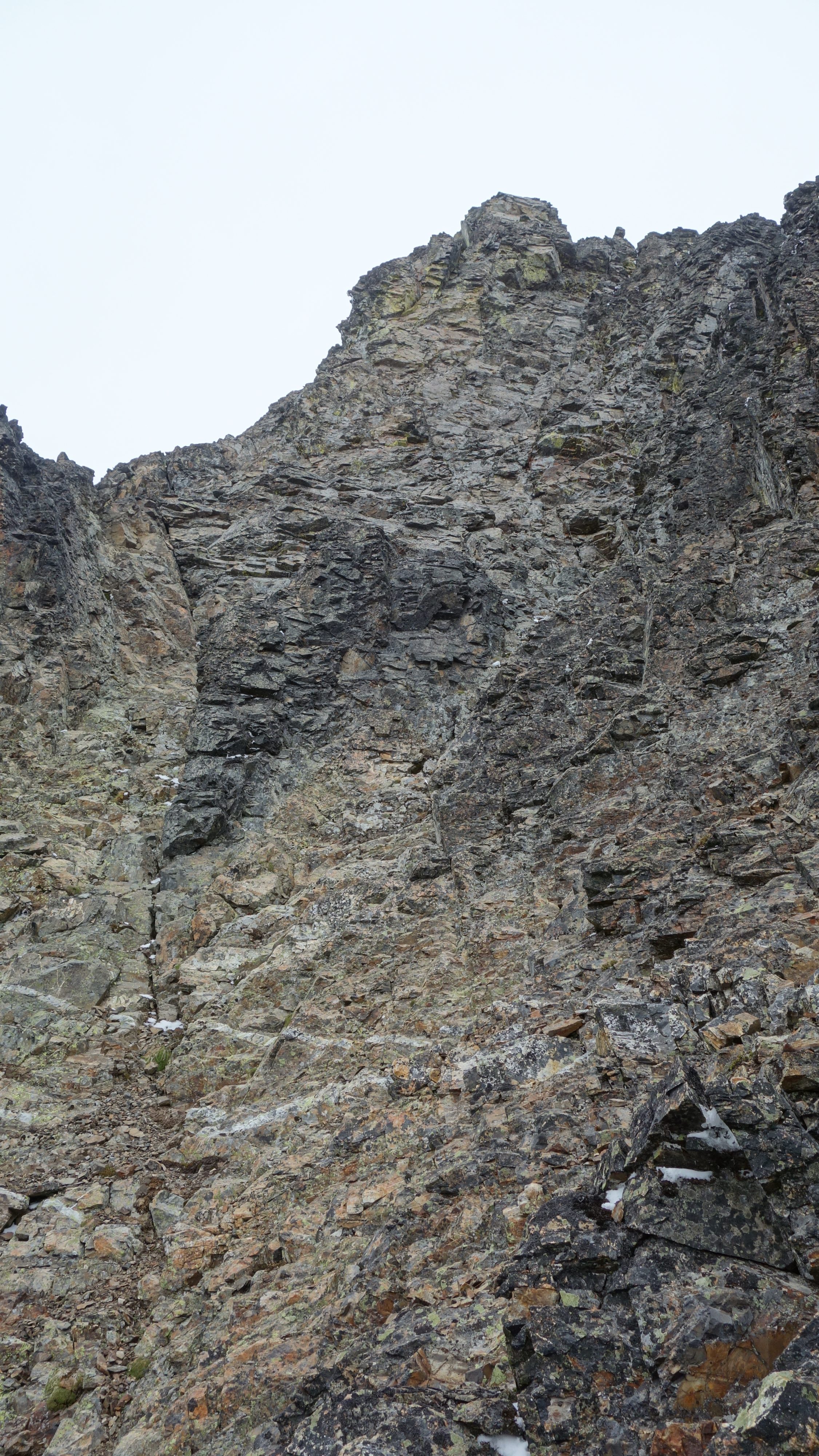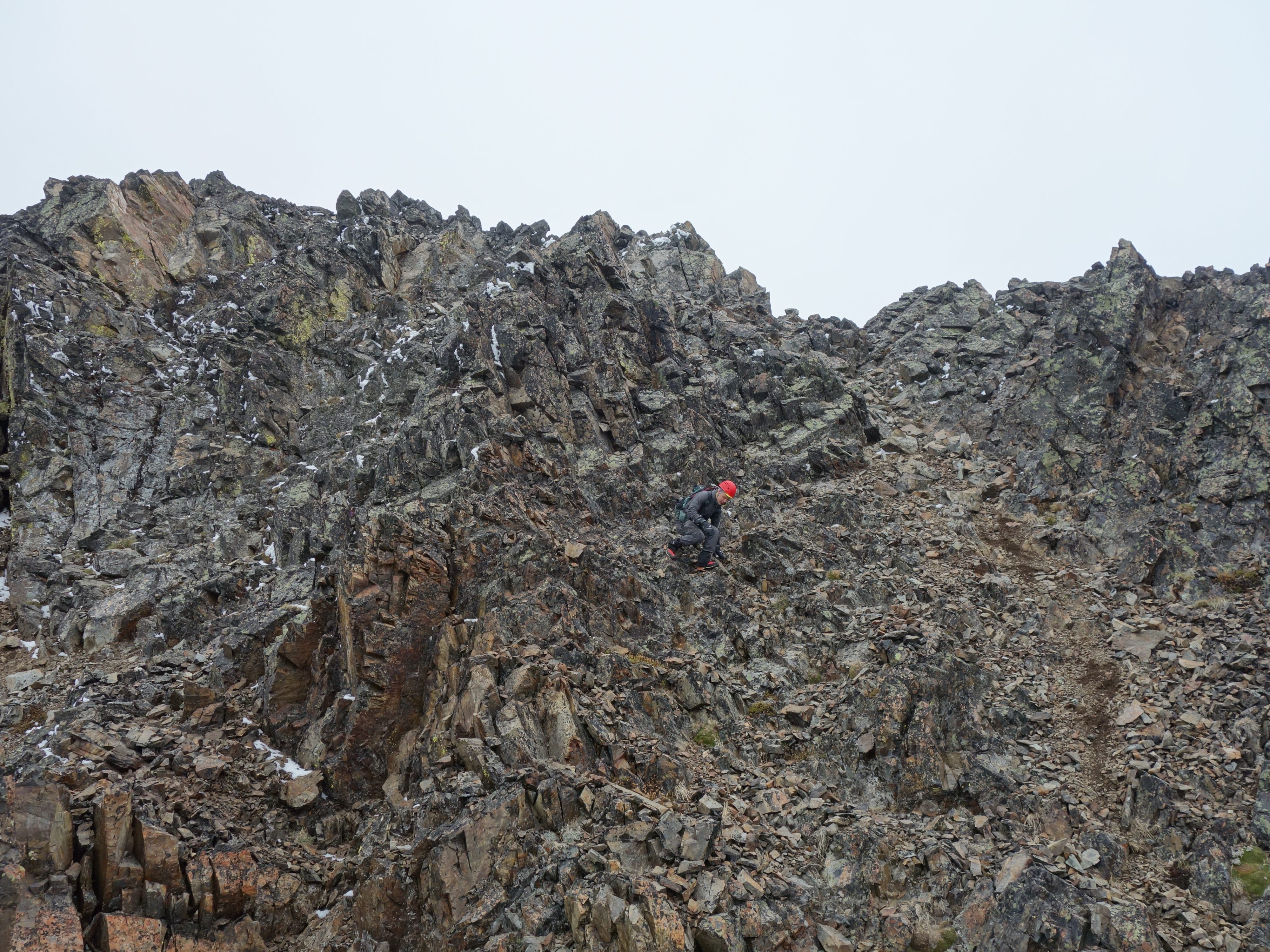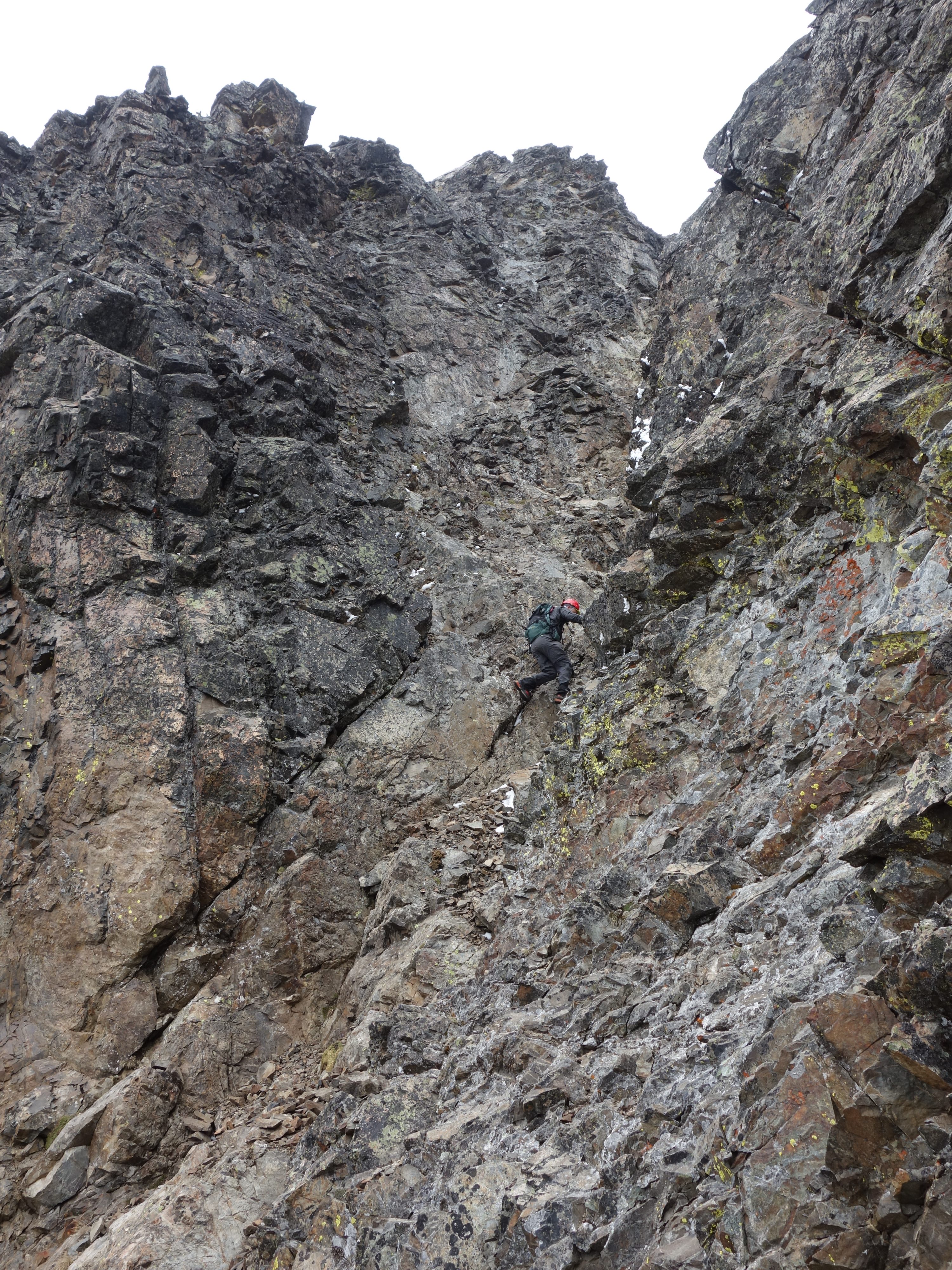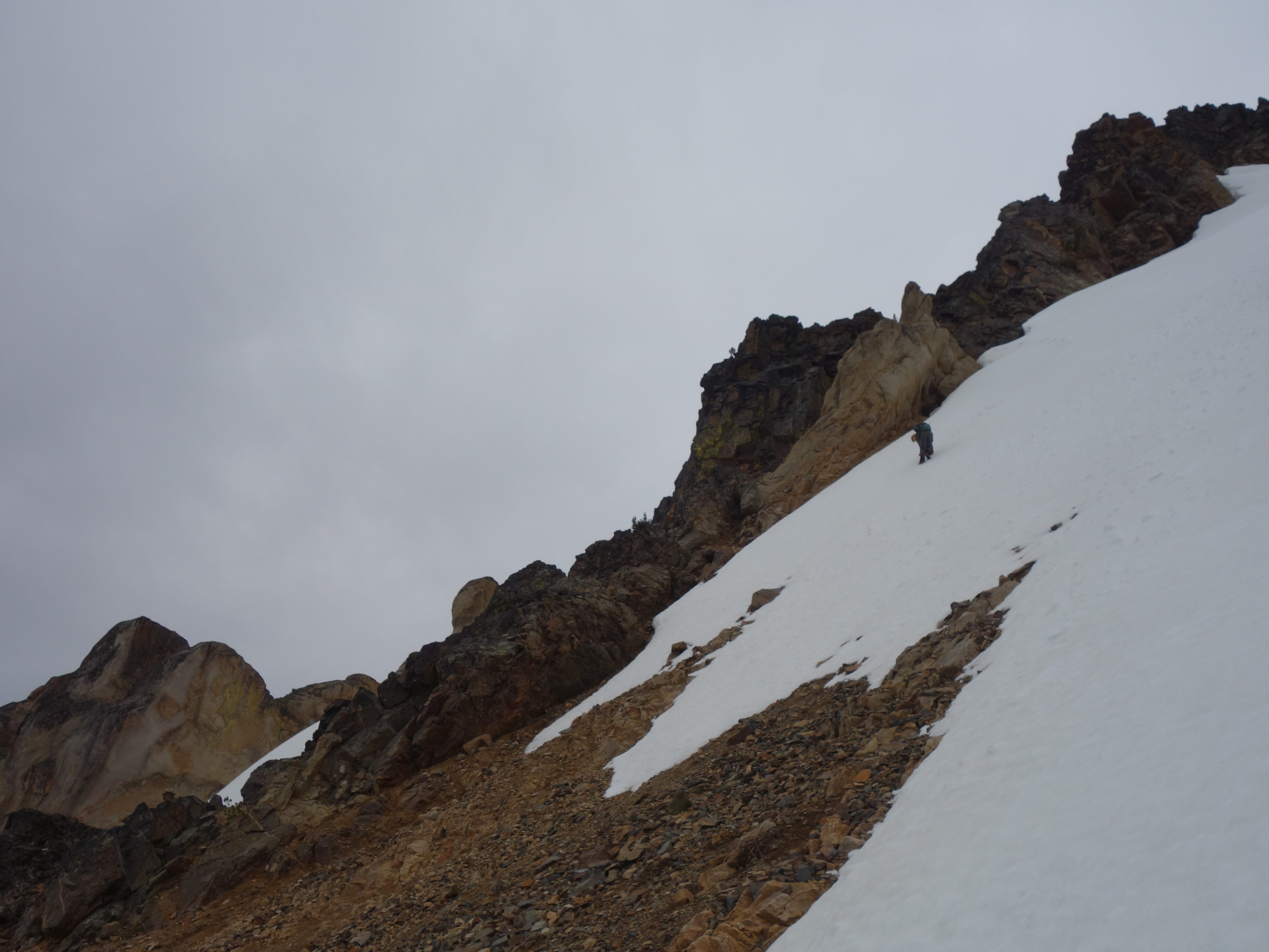 We decided to bail on the plans to traverse over to Ballard as it appeared the crummy weather was moving in faster than forecasted, so we ditched our overnight gear on the flat 7400 foot shoulder on the south ridge and continued with light day packs towards Azurite. The first part had us head up a loose gully, then leave the ridge and traverse left, across the west face of Azurite below cliffs and gullies almost until we hit the prominent west rib. Most of this traverse was dry, sans 2-3 short snow runnels that we easily traversed across with ice axe (but no pons). Once we were at the base of a large gully just before the west rib, we ascended loose talus/rock up the gully, then it narrowed to just 3 feet wide. We followed cairns off to the left, despite me thinking that wasn't the right way.