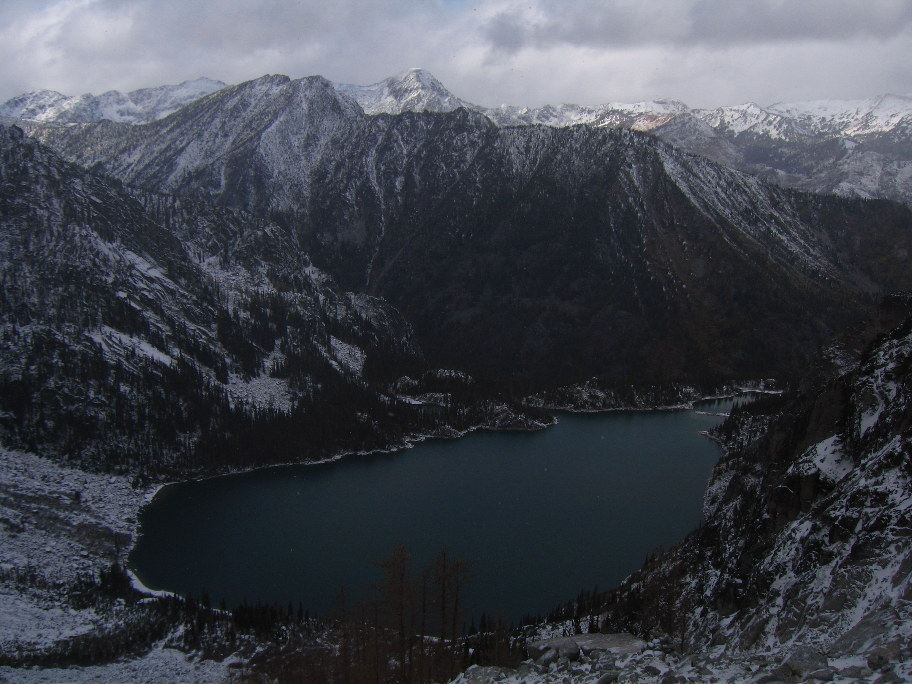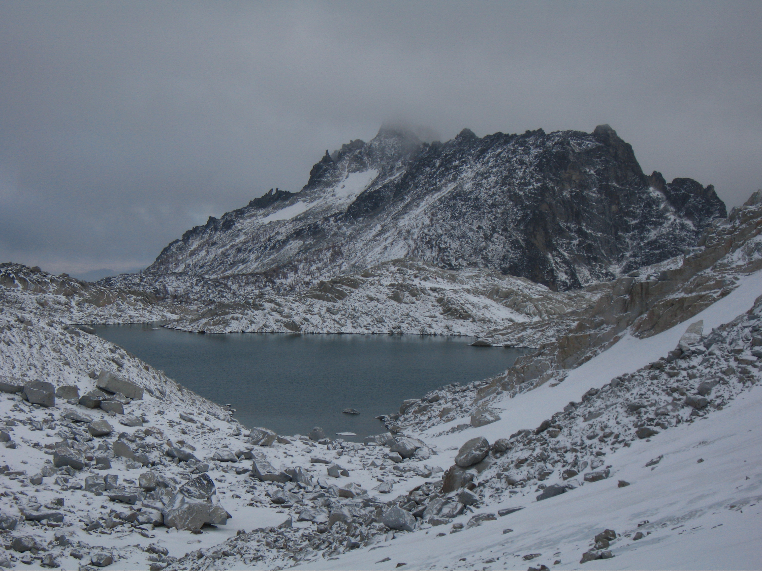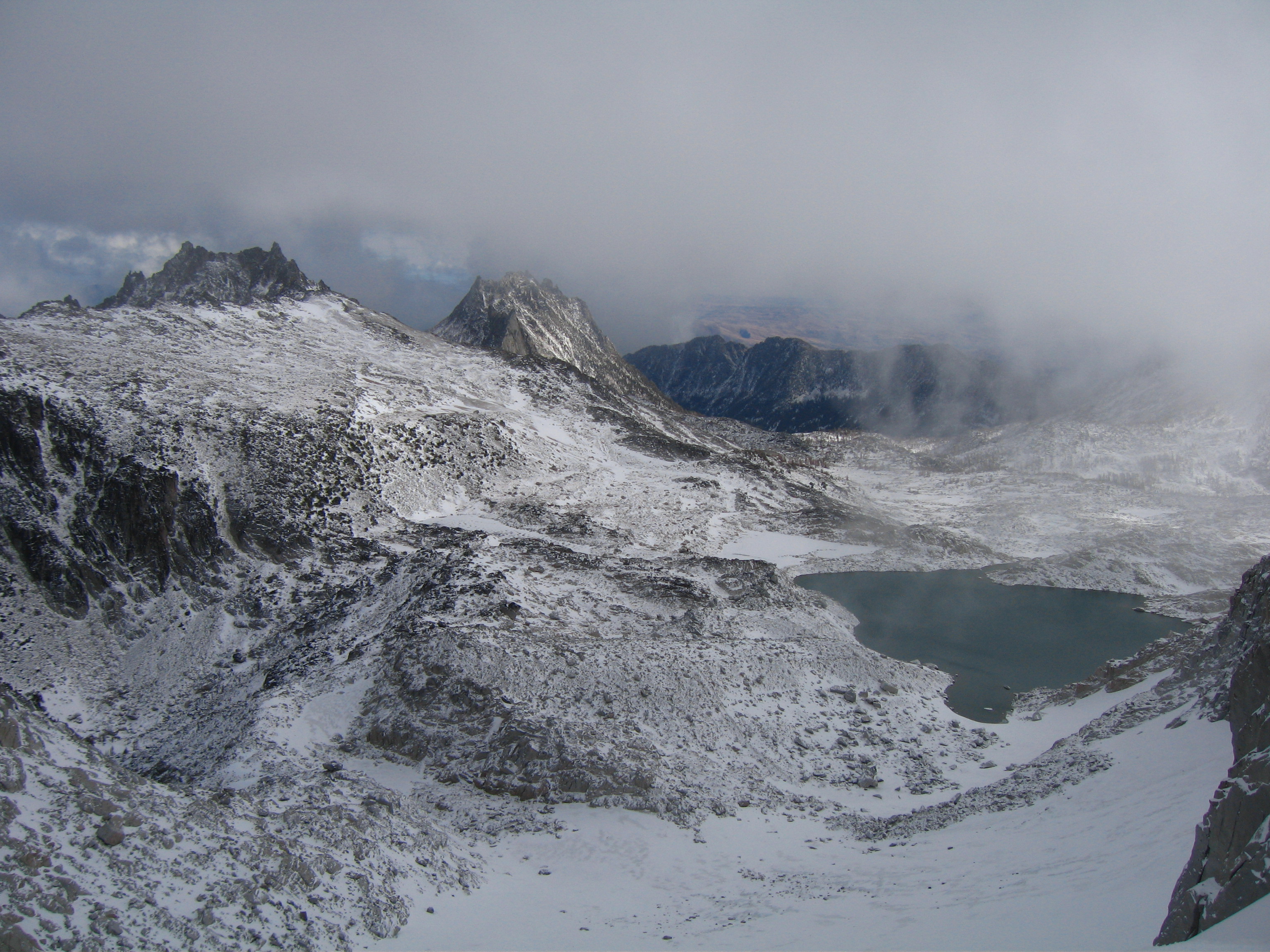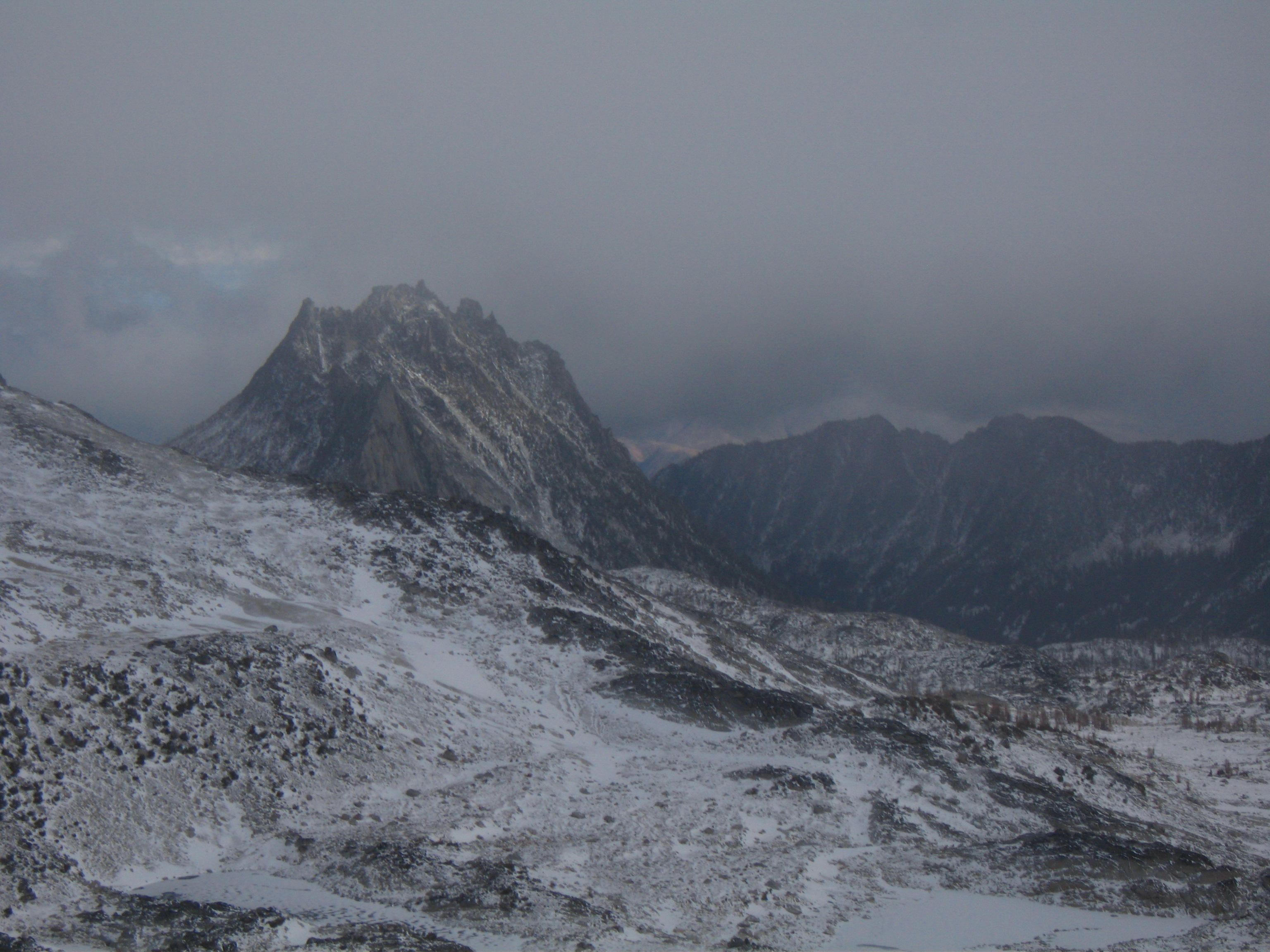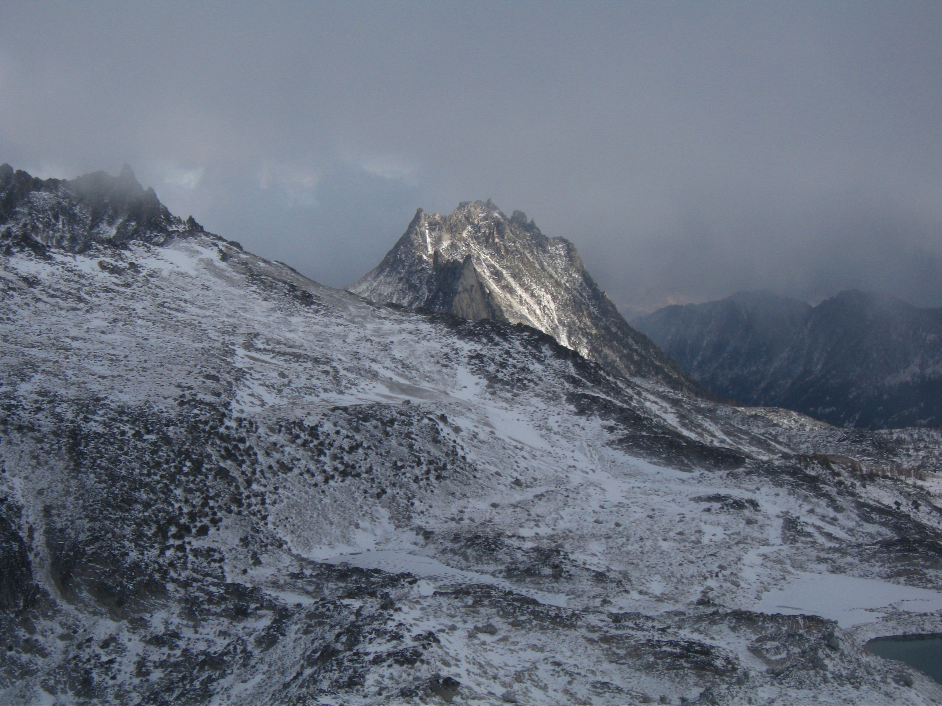 Yesterday I climbed Dragontail Peak with my friends Josh and Amy. We hiked up to Colchuck Lake Friday in the dark and camped. Woke up to a light falling snow but it soon became partly cloudy with some fantastic views that got better and better as we headed up Aasgard Pass. Upper Enchantment Basin got about 10 inches of snow Friday night and Colchuck Lake got about 2 inches. No snow fell on Sunday except for around a half inch just after dard when we hiked out.