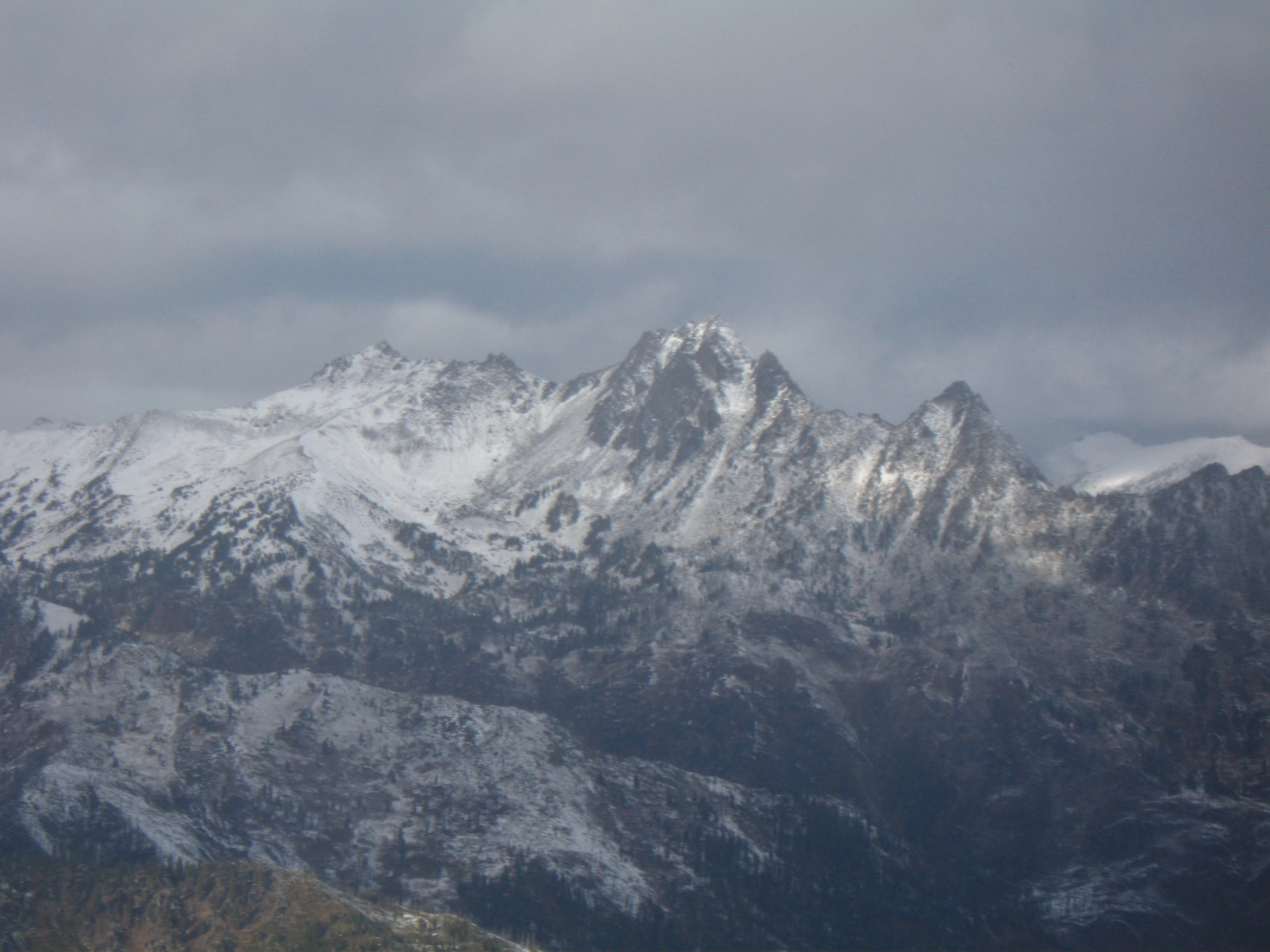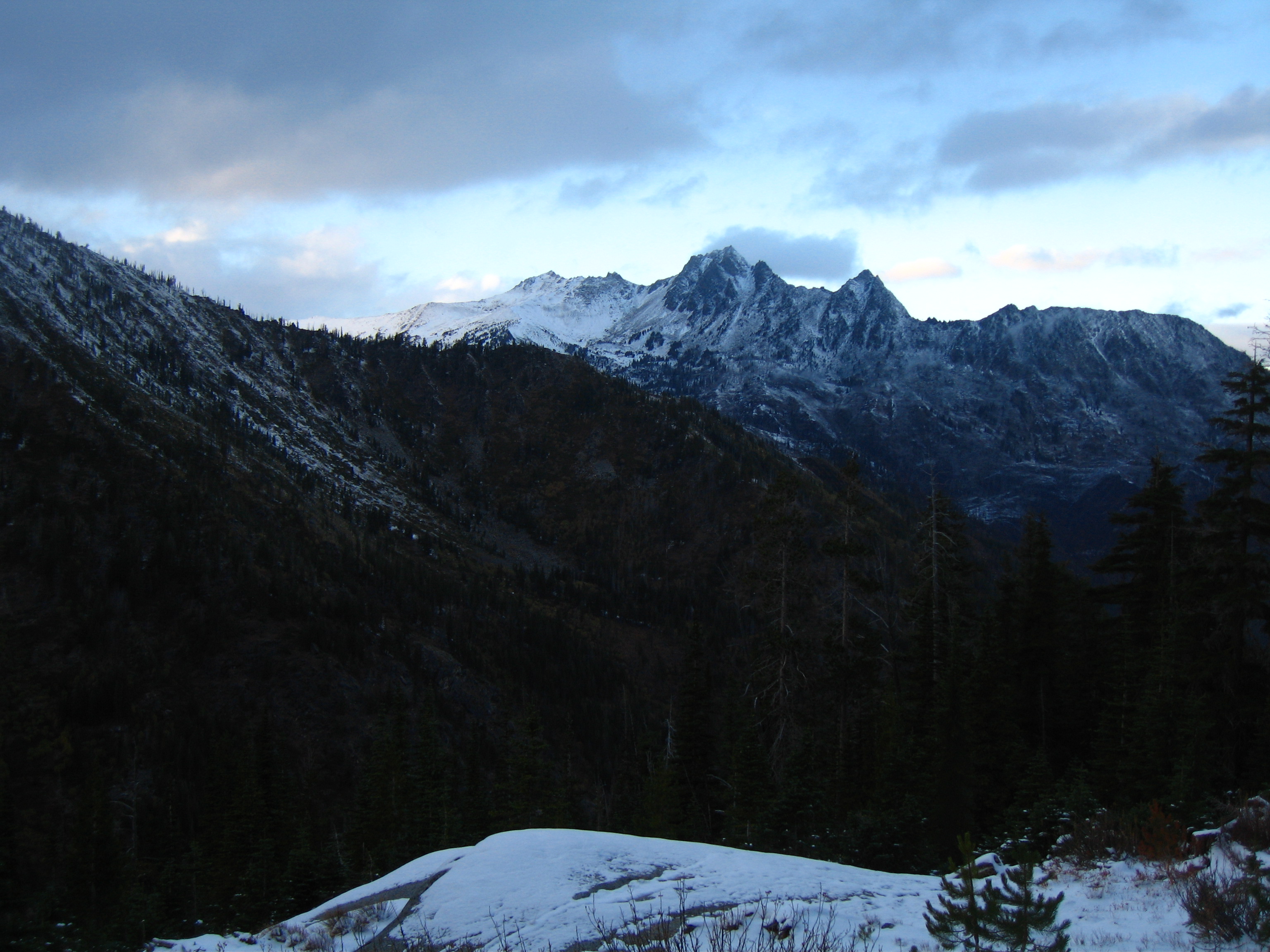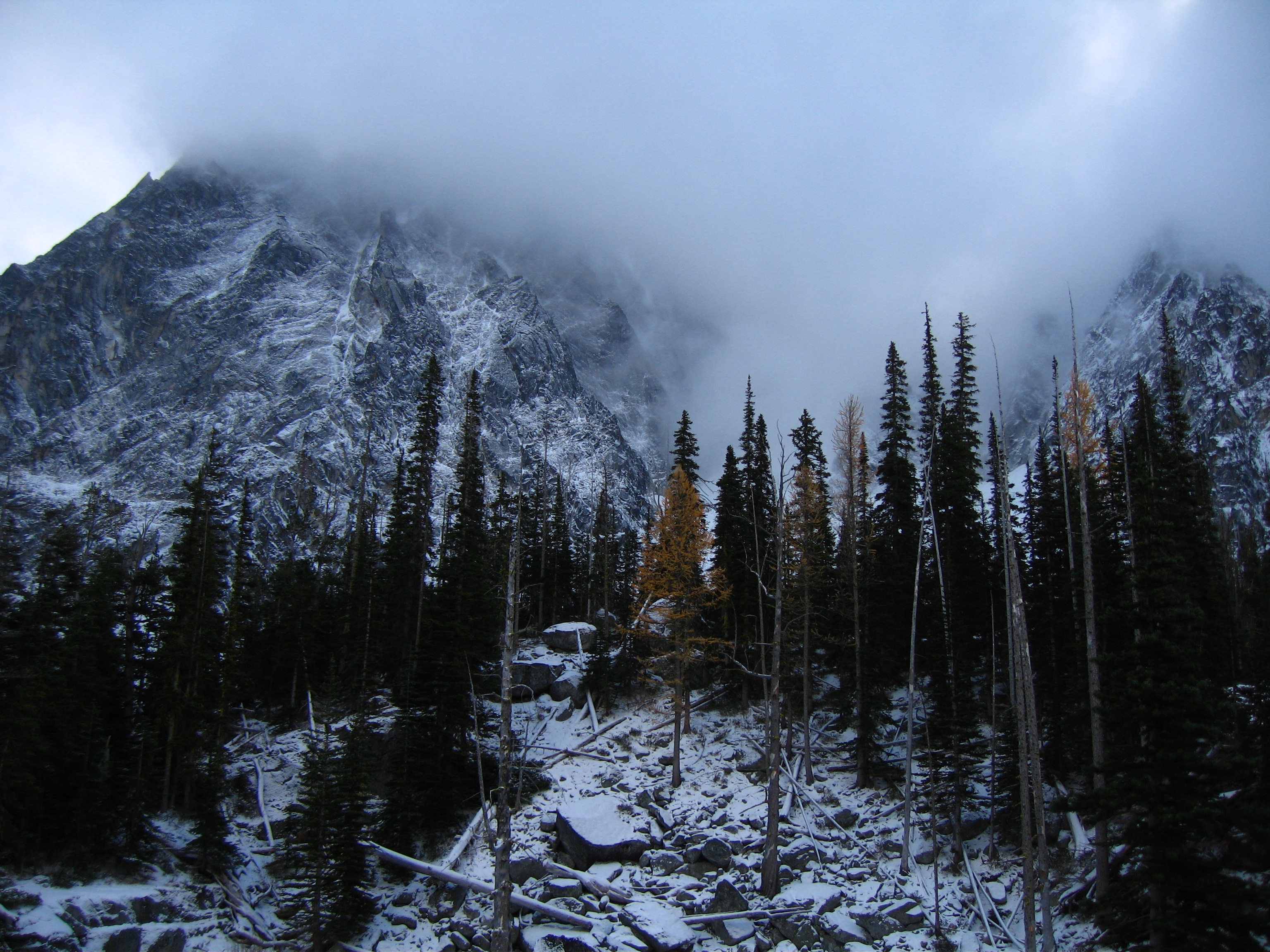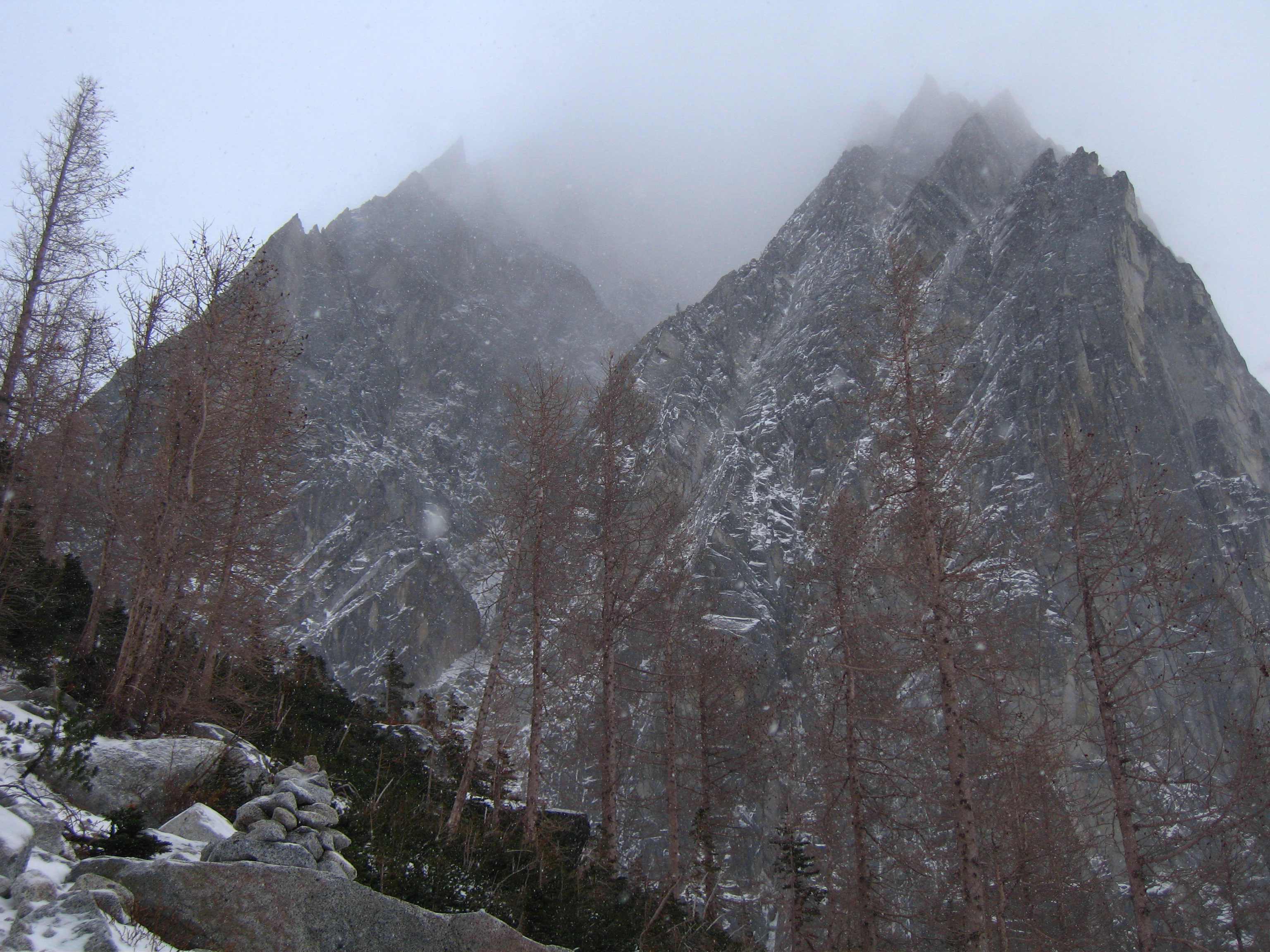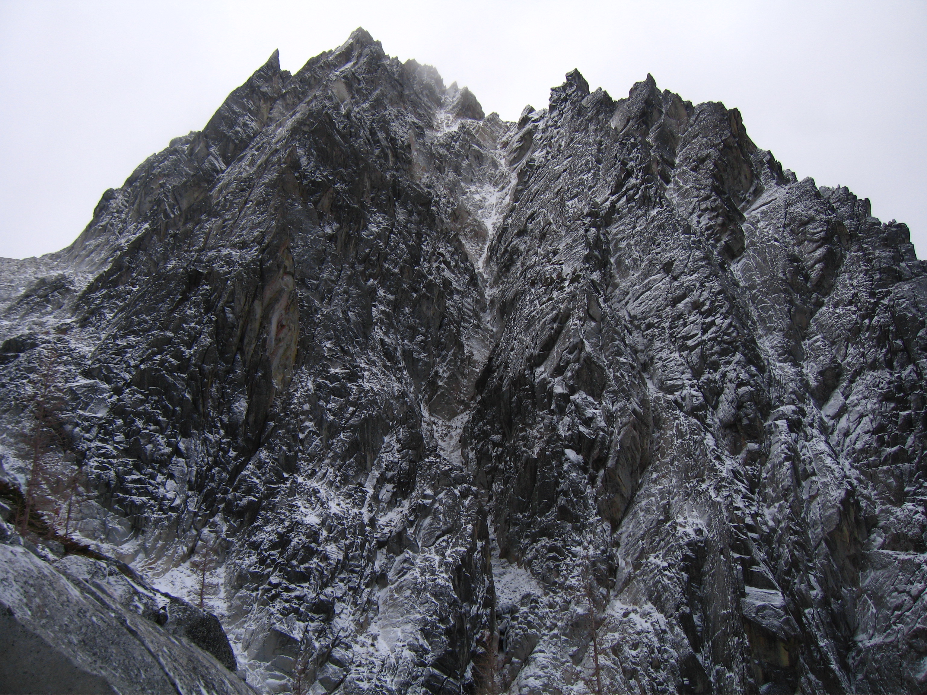 Yesterday I climbed Dragontail Peak with my friends Josh and Amy. We hiked up to Colchuck Lake Friday in the dark and camped. Woke up to a light falling snow but it soon became partly cloudy with some fantastic views that got better and better as we headed up Aasgard Pass. Upper Enchantment Basin got about 10 inches of snow Friday night and Colchuck Lake got about 2 inches. No snow fell on Sunday except for around a half inch just after dard when we hiked out.