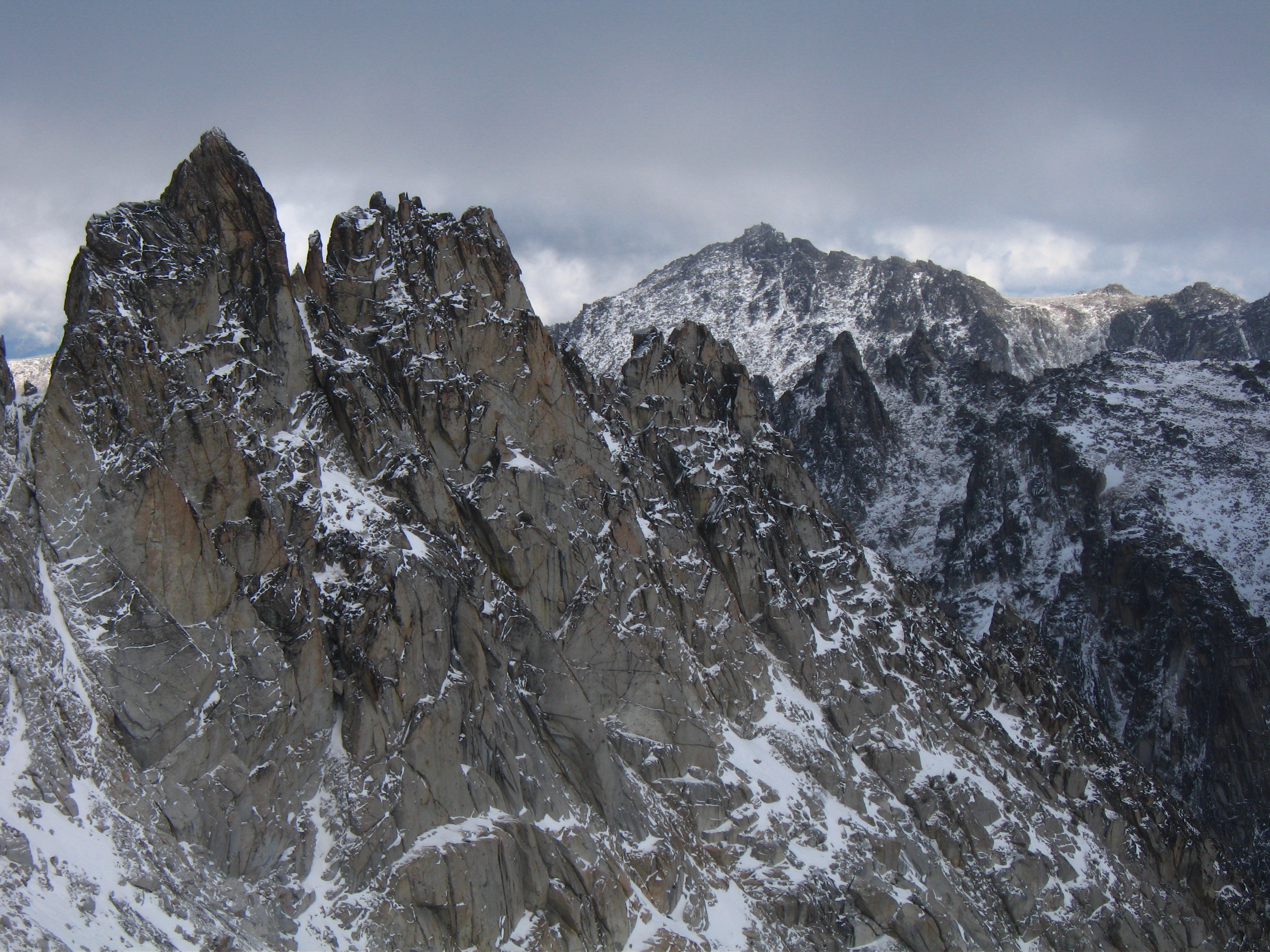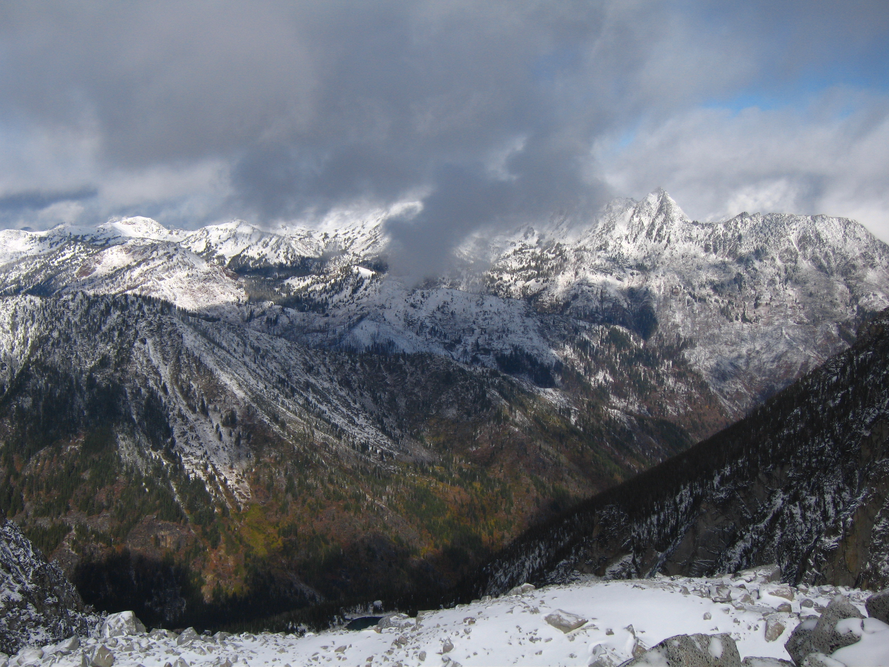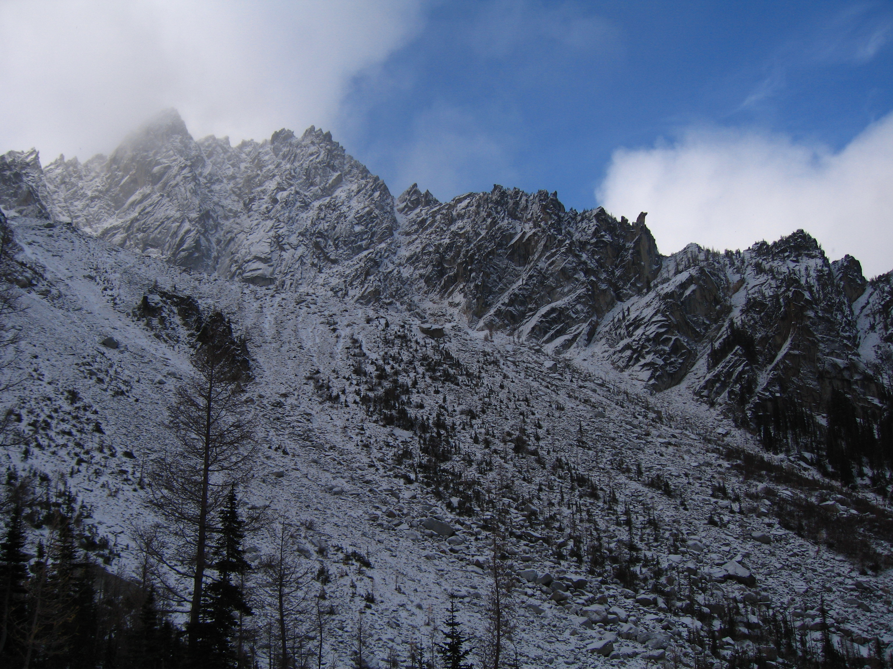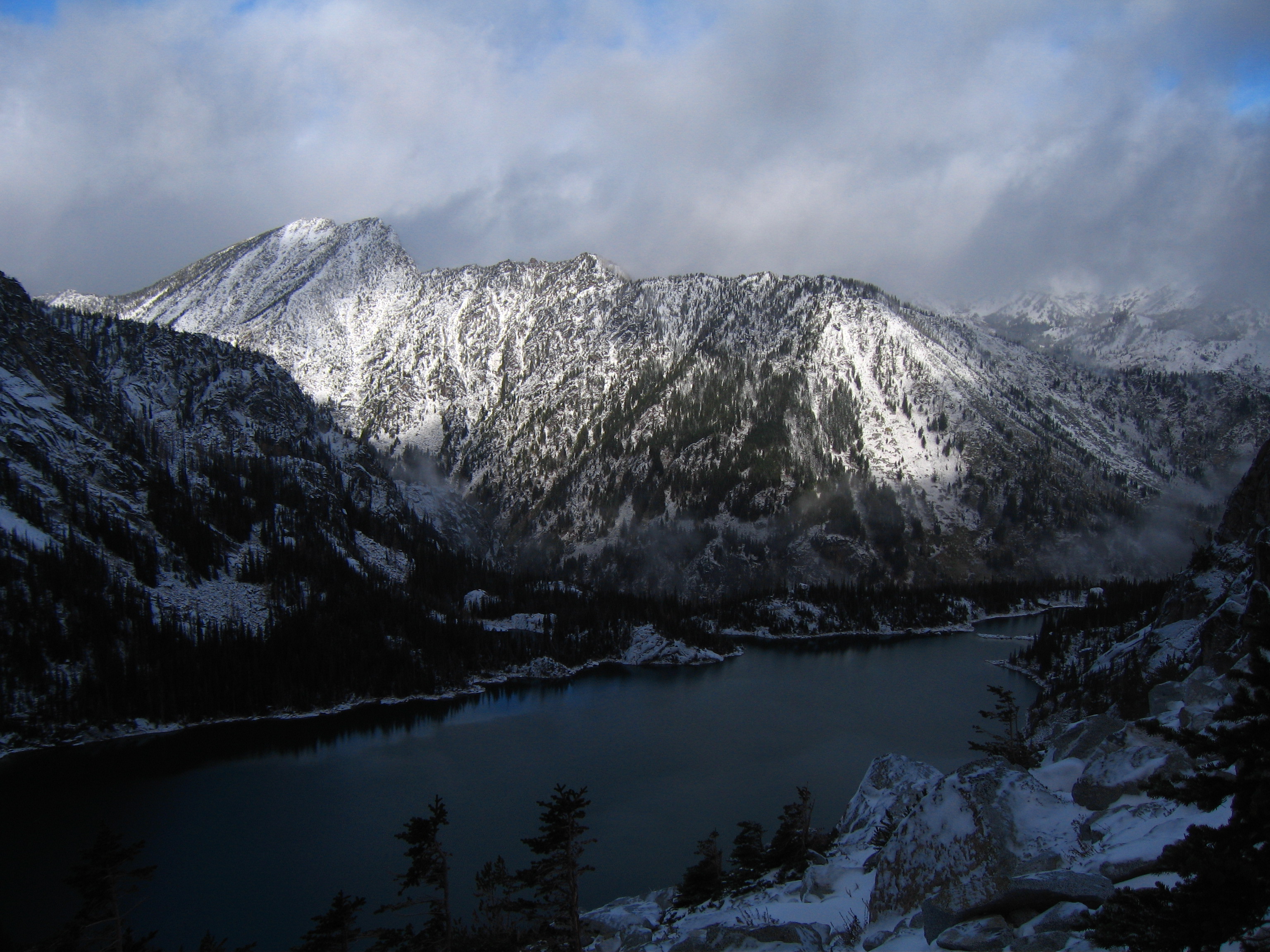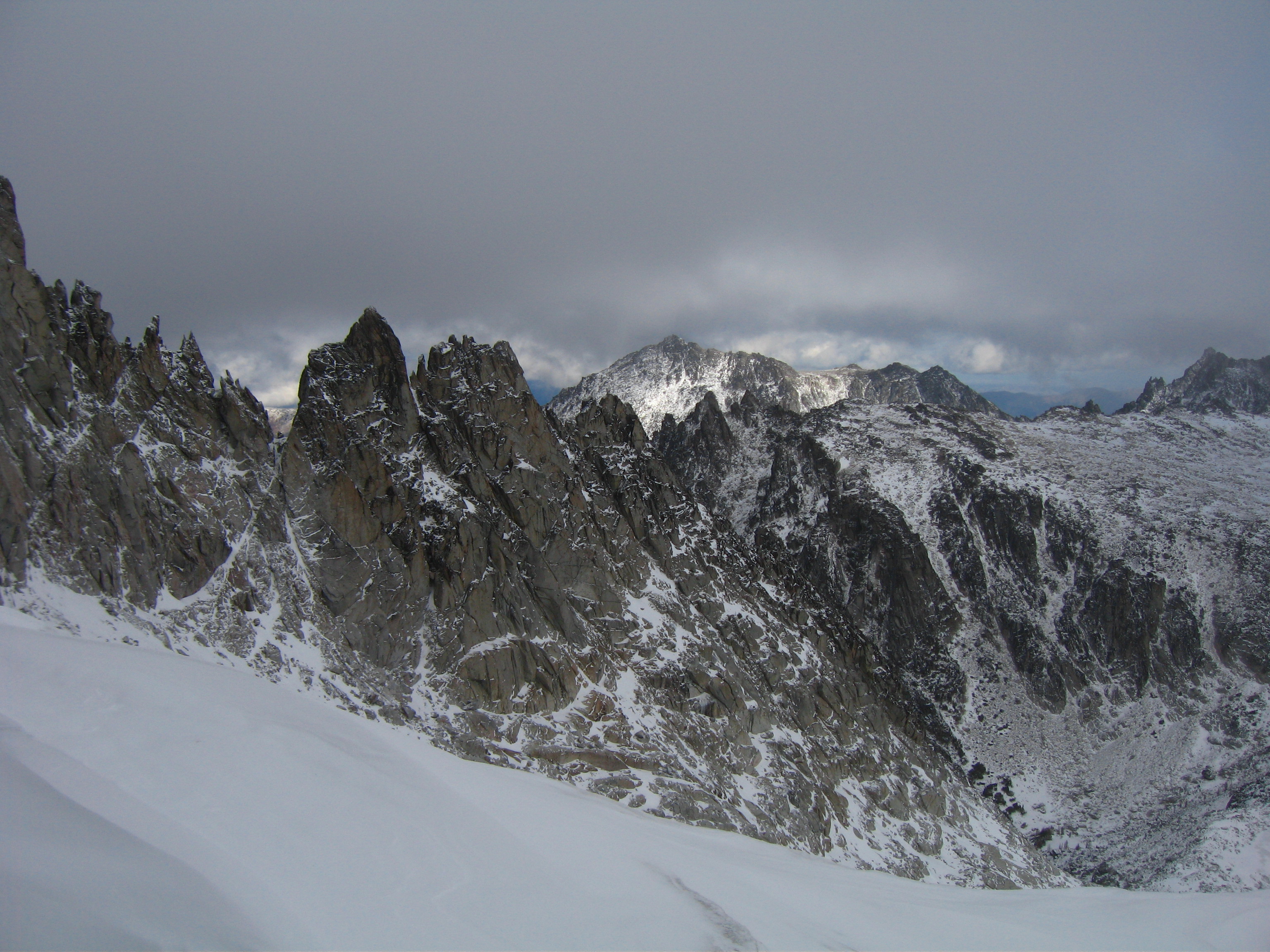 Yesterday I climbed Dragontail Peak with my friends Josh and Amy. We hiked up to Colchuck Lake Friday in the dark and camped. Woke up to a light falling snow but it soon became partly cloudy with some fantastic views that got better and better as we headed up Aasgard Pass. Upper Enchantment Basin got about 10 inches of snow Friday night and Colchuck Lake got about 2 inches. No snow fell on Sunday except for around a half inch just after dard when we hiked out.