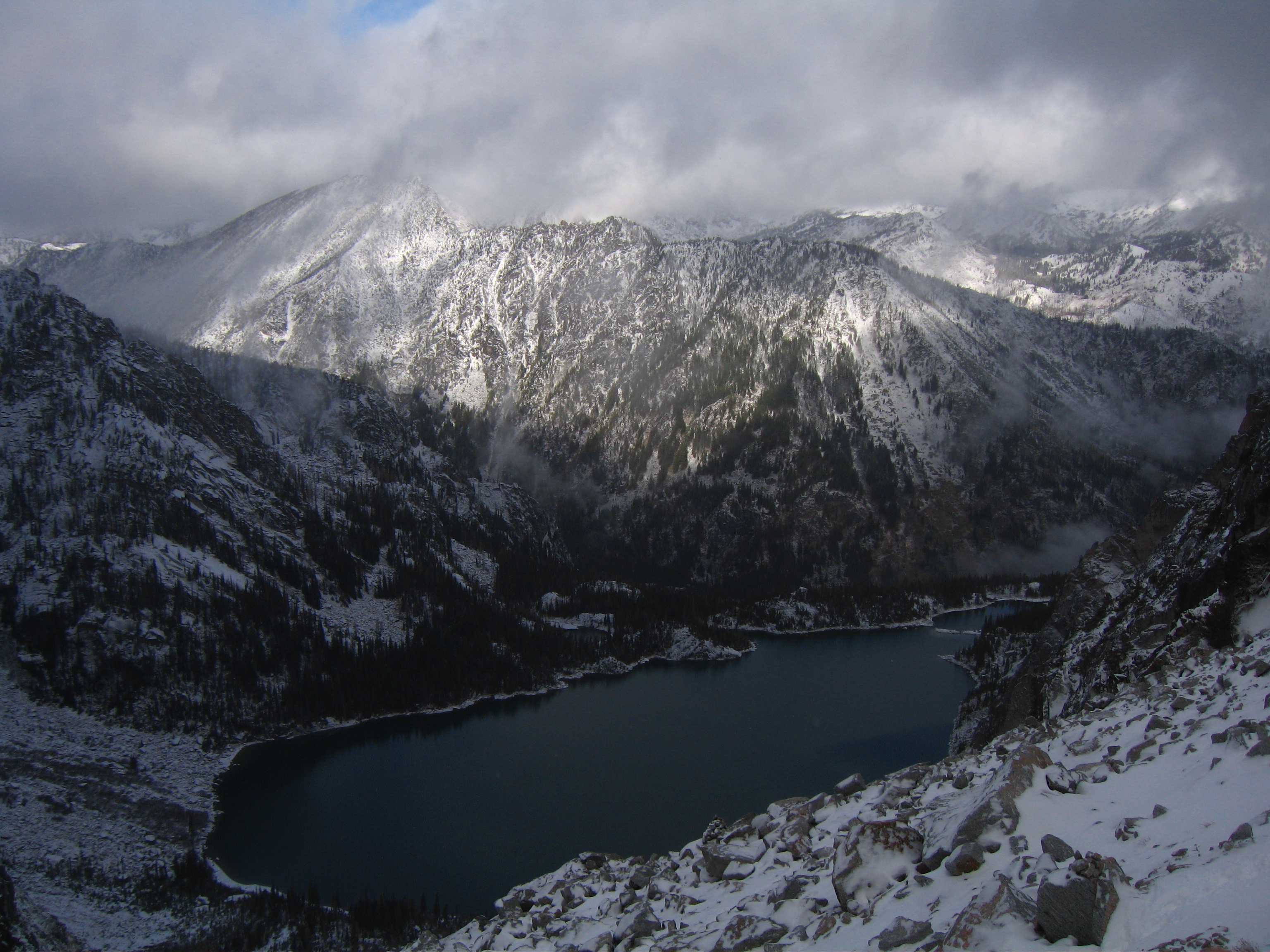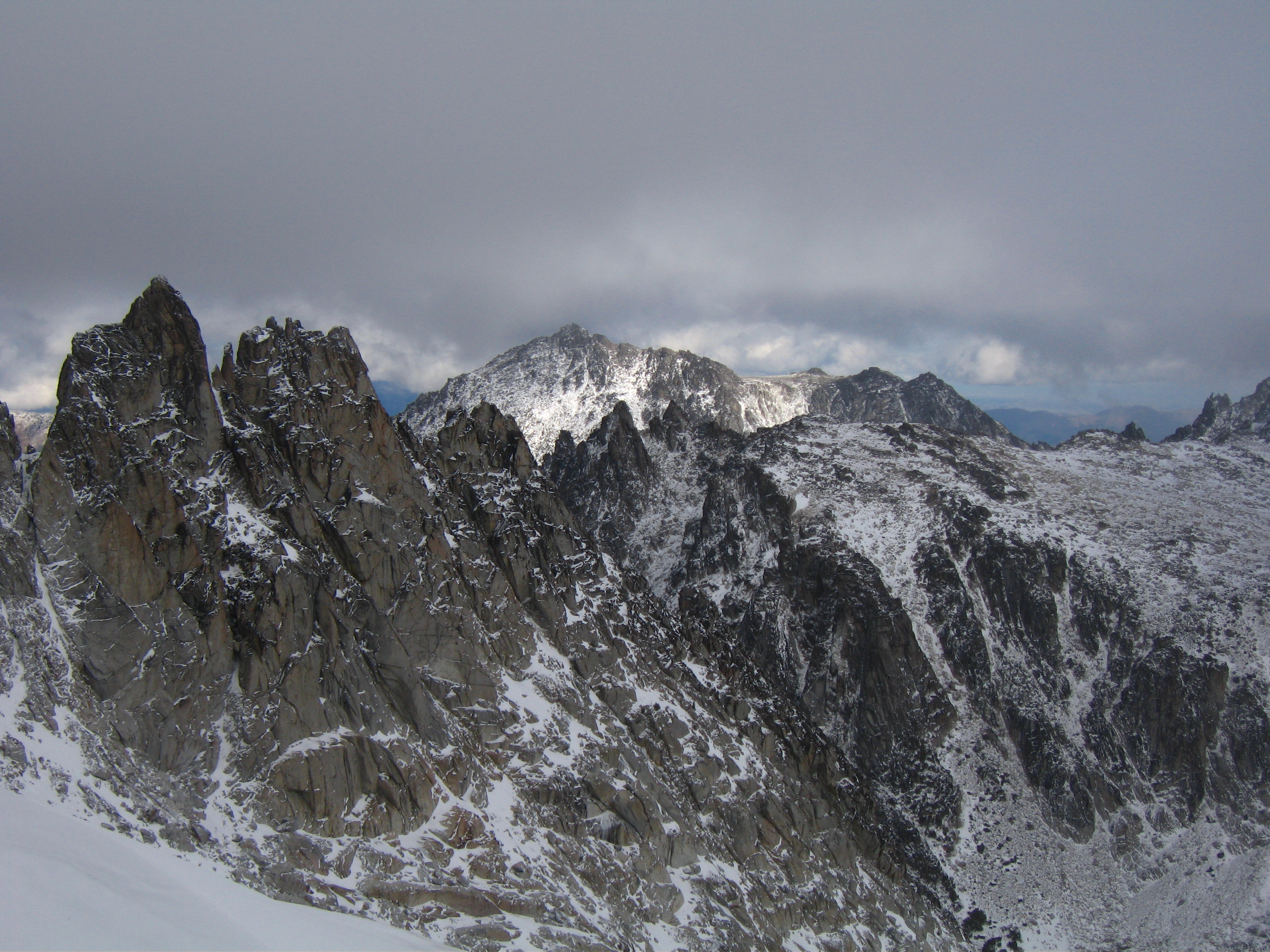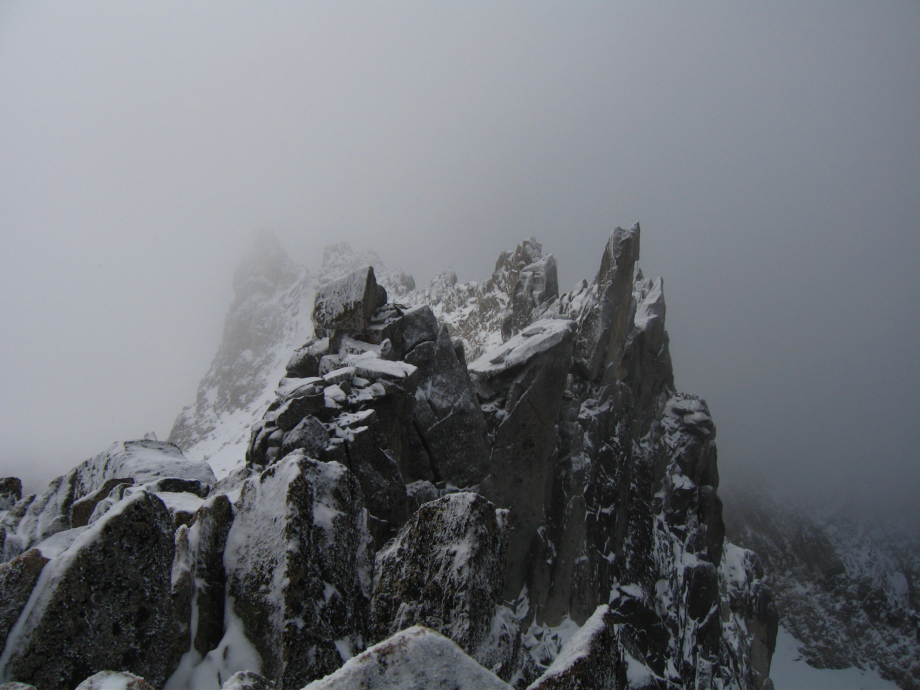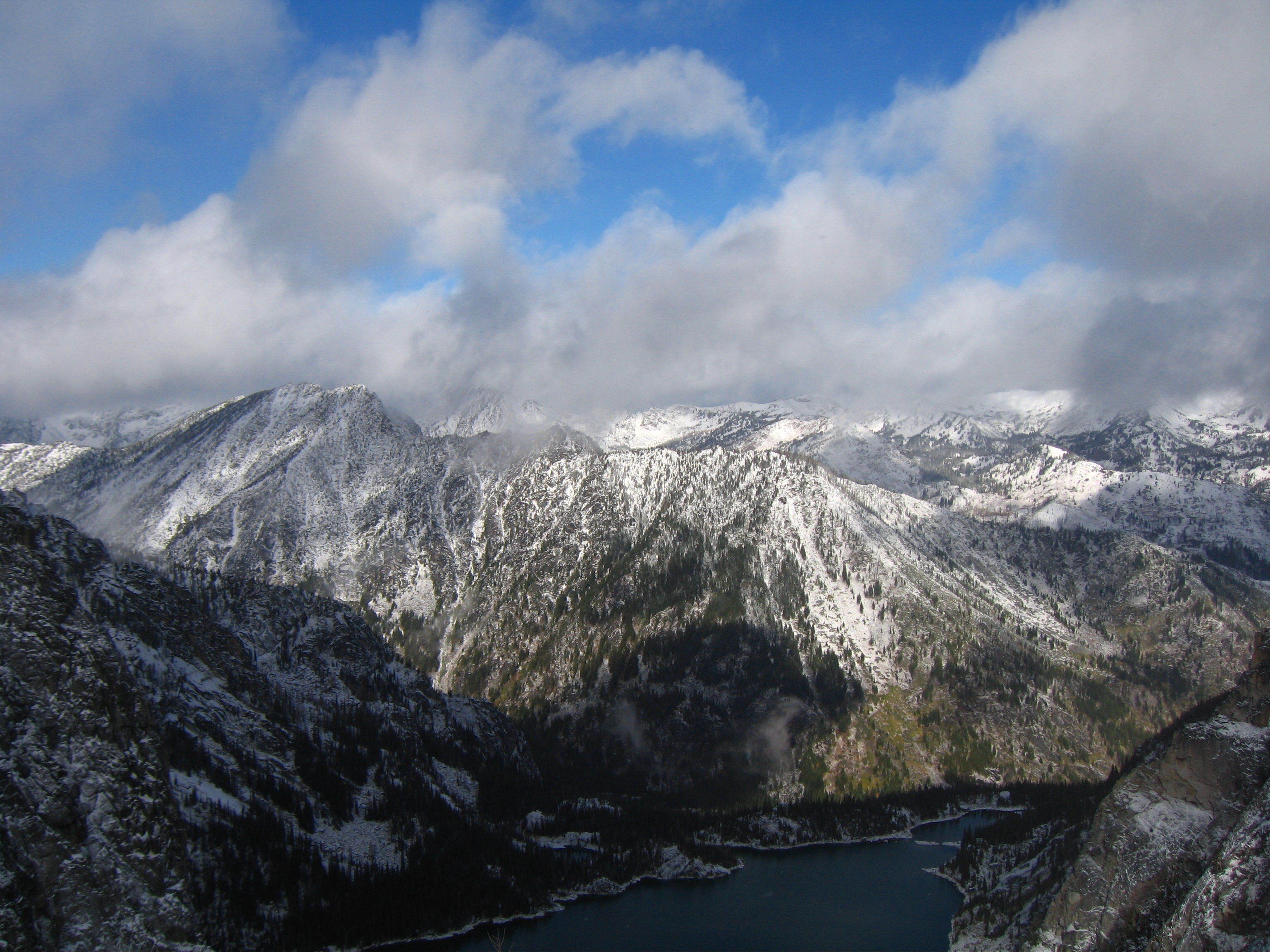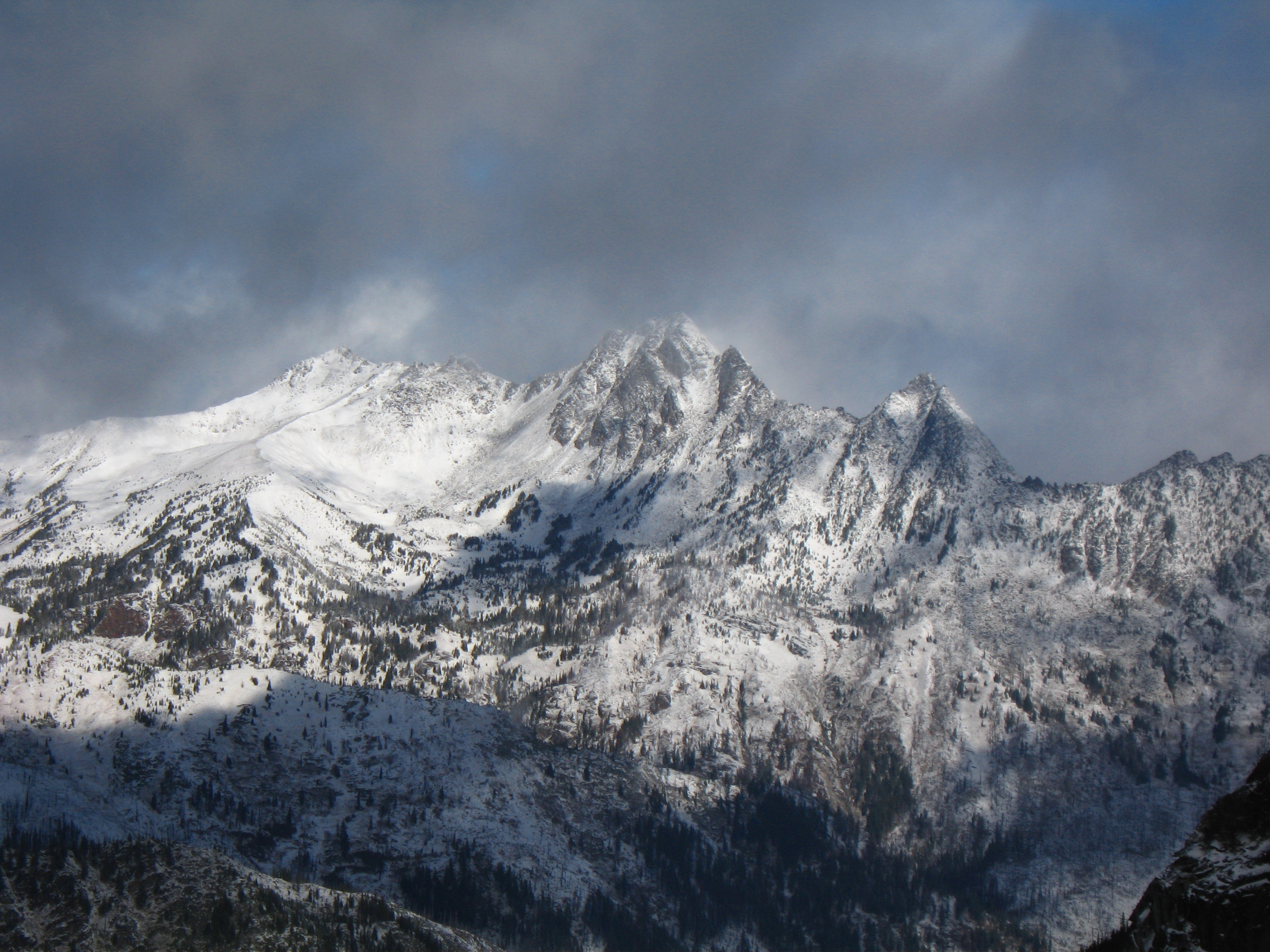 Yesterday I climbed Dragontail Peak with my friends Josh and Amy. We hiked up to Colchuck Lake Friday in the dark and camped. Woke up to a light falling snow but it soon became partly cloudy with some fantastic views that got better and better as we headed up Aasgard Pass. Upper Enchantment Basin got about 10 inches of snow Friday night and Colchuck Lake got about 2 inches. No snow fell on Sunday except for around a half inch just after dard when we hiked out.
