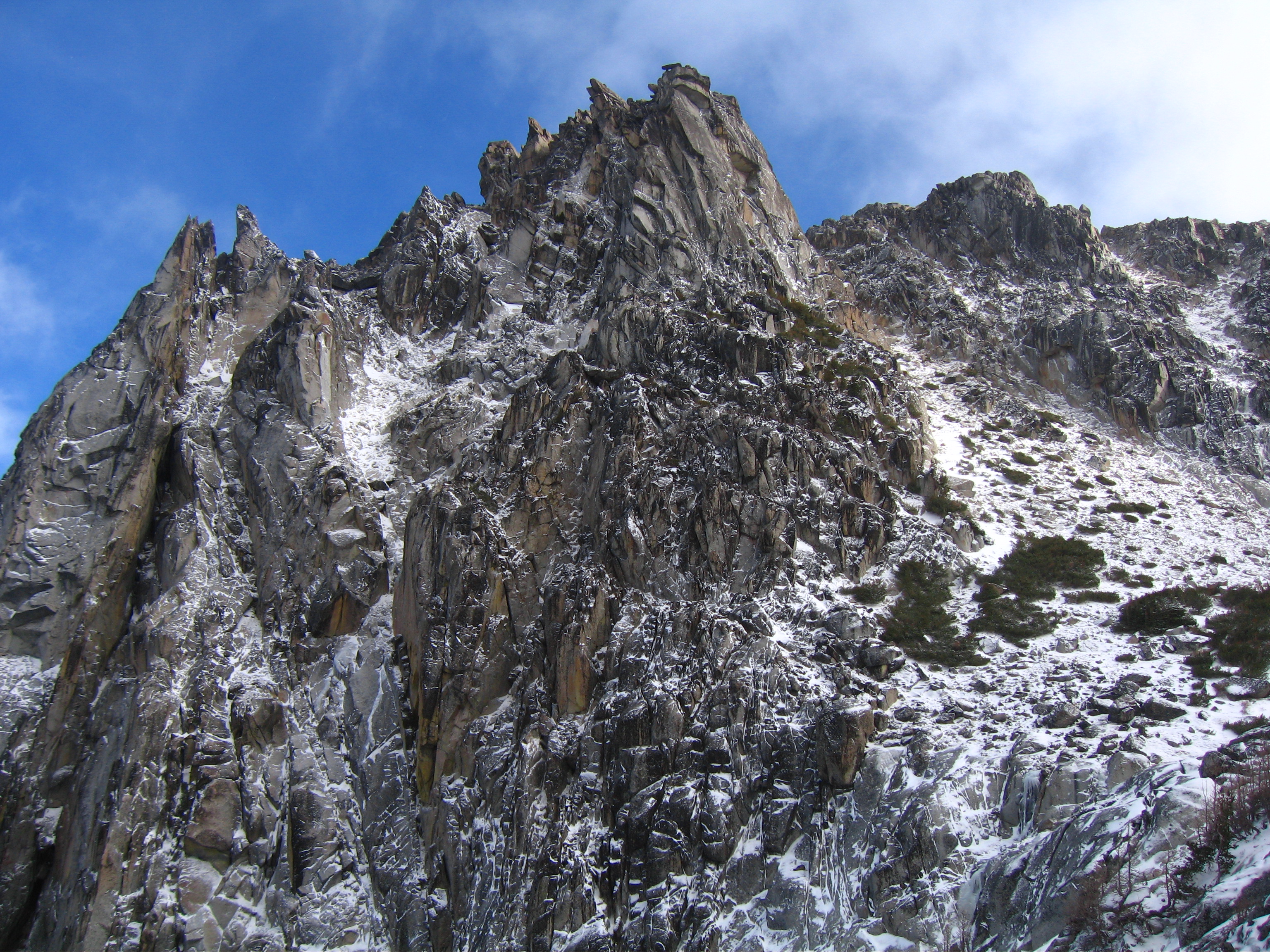 | Serpentine Arete | Class 5.8 | "This route follows a prominent ridge for about 2000 feet on the NW face of Dragontail Peak to just below the summit block. The exact pitch count is not essential as the upper 2/3rds of the route are low 5th class (with some mid-5th steps) and belays can be had at any time. The rating of "grade IV" is from Nelson and Potterfield guidebook and is probably on the conservative side; class 5.8 rating comes from a single pitch!" - rpc | |