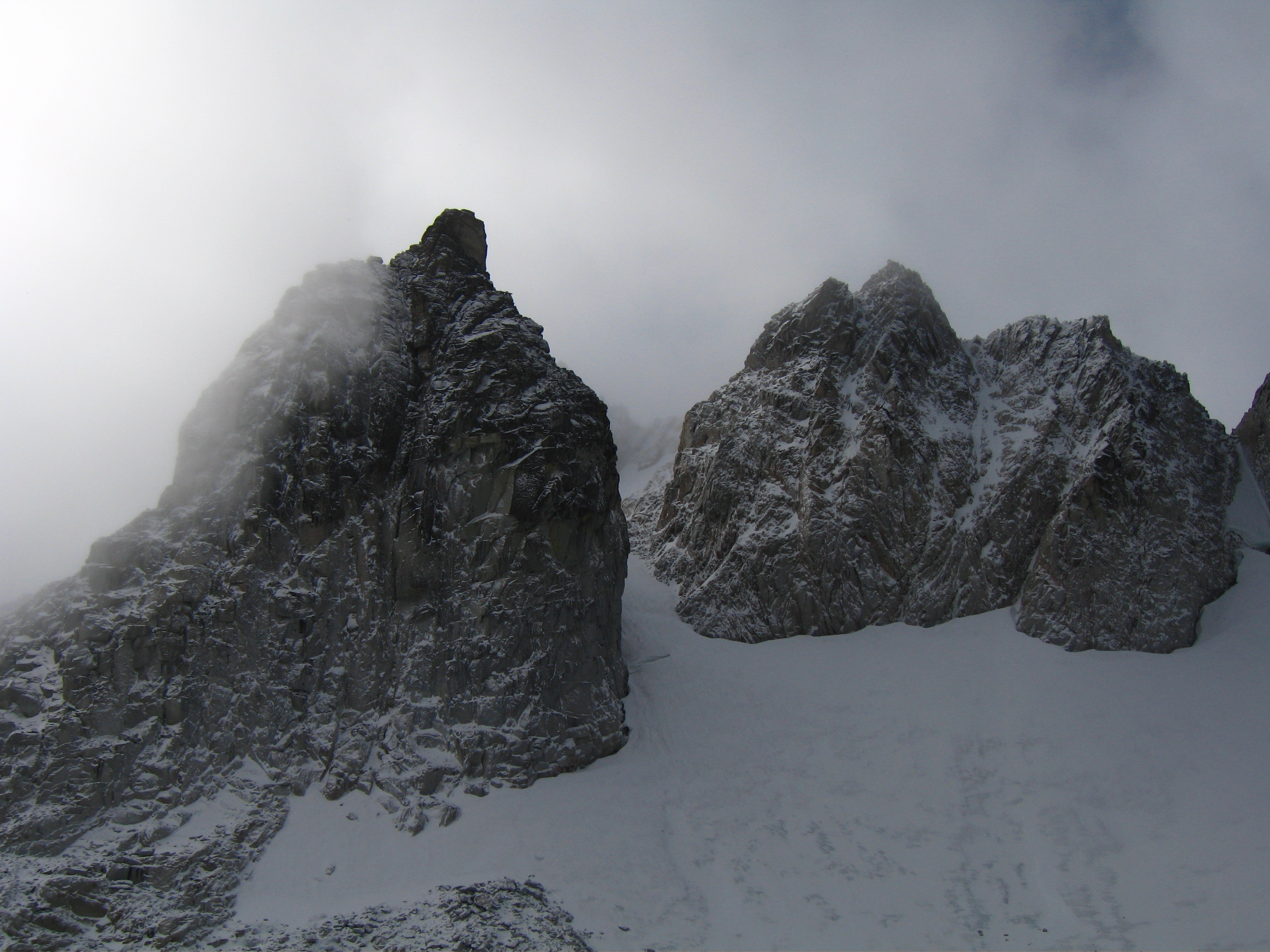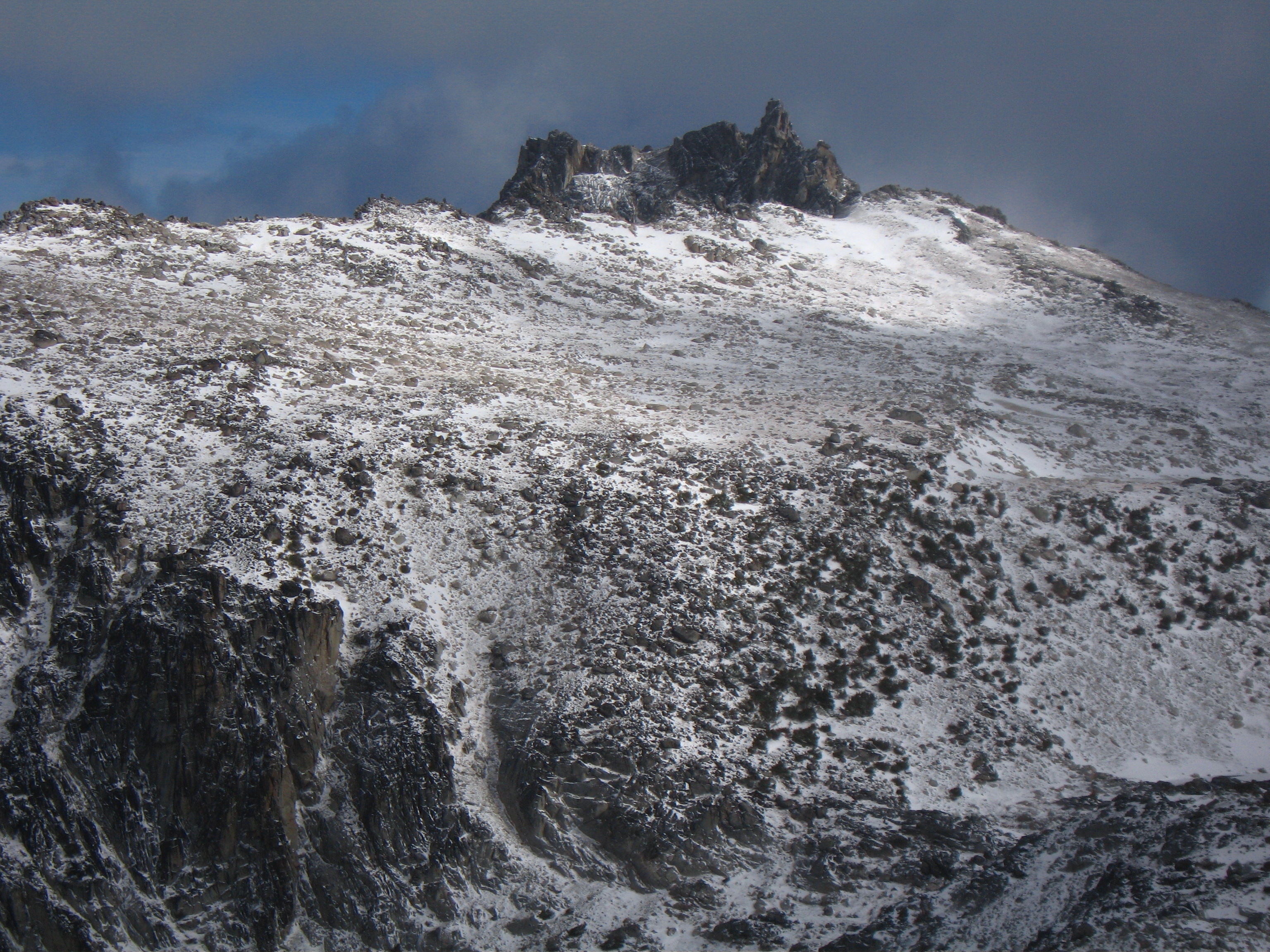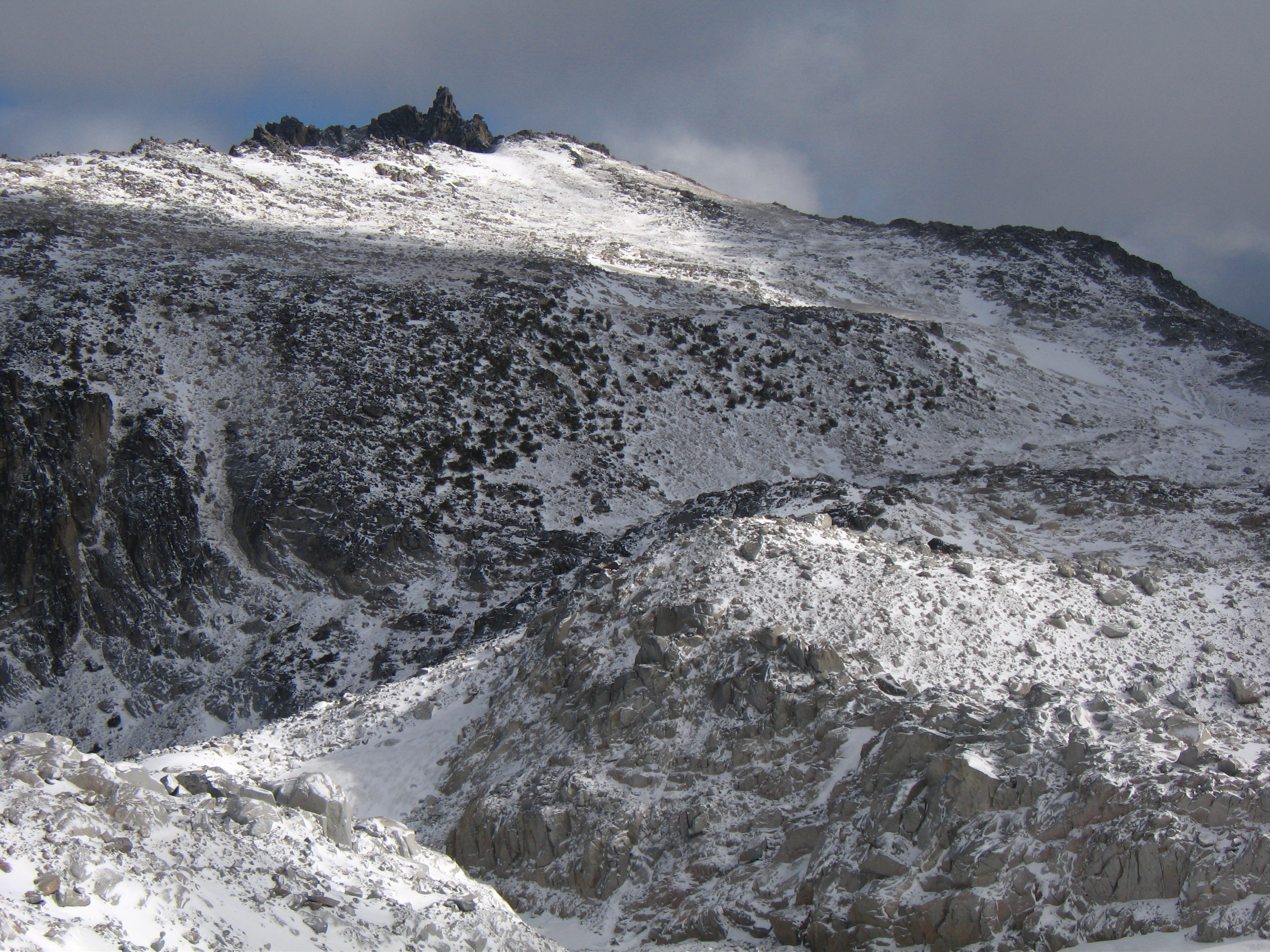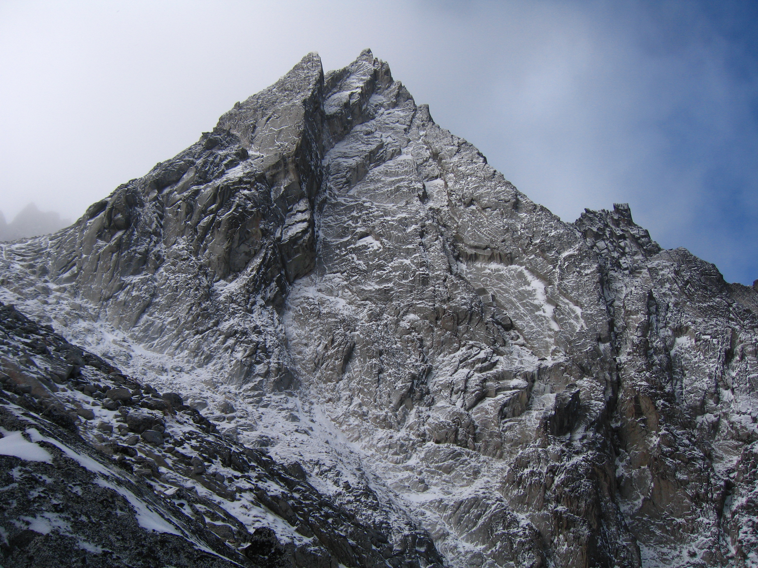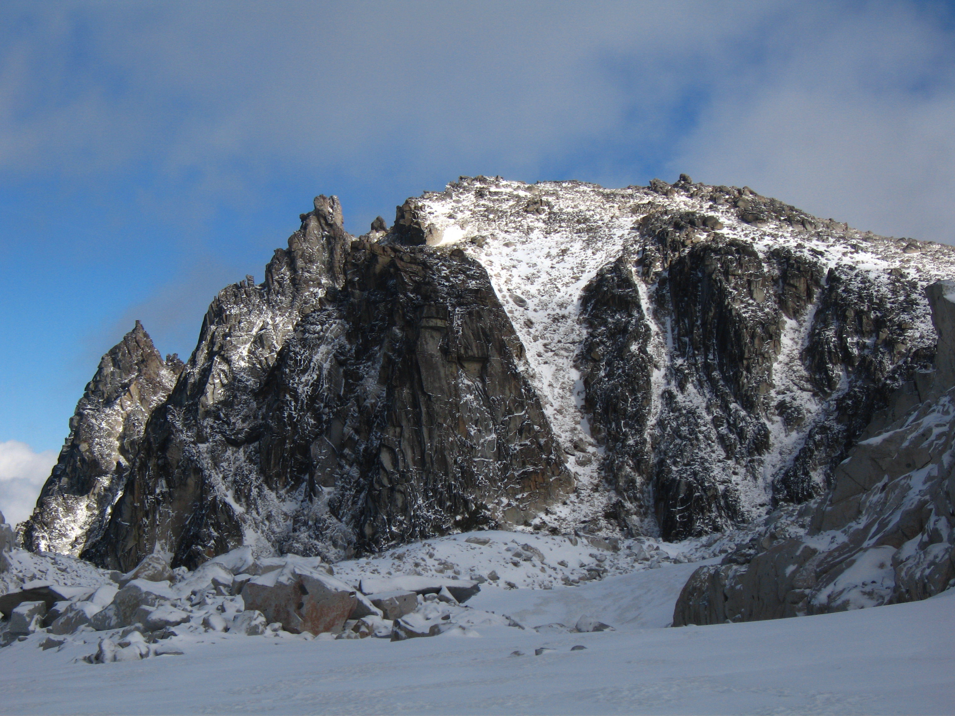 | Northeast Buttress | Class 5.8 | "This route is over 2000 feet tall and is an adventurous climb up steep rock of variable quality. The buttress rises steeply from between the start of the Triple Couloirs and the Northeast Couloir and flattens out as it meets the summit ridge at a prominent notch near 8500 feet. The route follows chimneys and corners for 150 meters to a notch in the crest of the NE Buttress proper. Expect steep, loose, and dirty, but reasonably well-protected climbing. From the notch the crest can be followed over excellent mid-fifth class cracks for about 200 meters to a distinct exposed arete. Past the arete a ledge system is gained trending Southwest, paralleling the buttress 100 meters or so below the crest. Remaining climb is easier to the summit" - Z-man | |