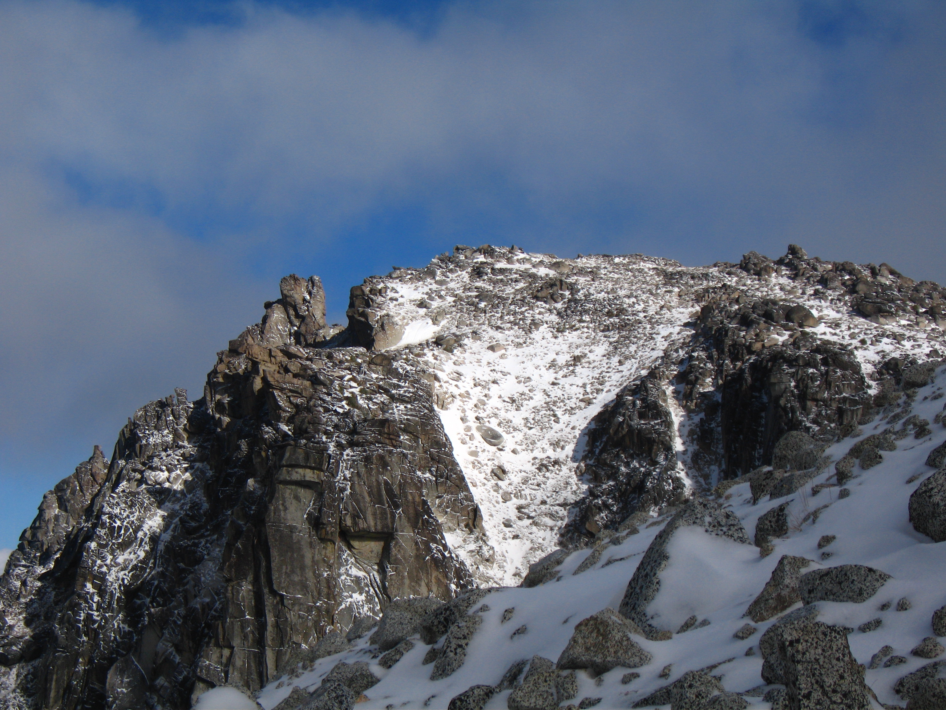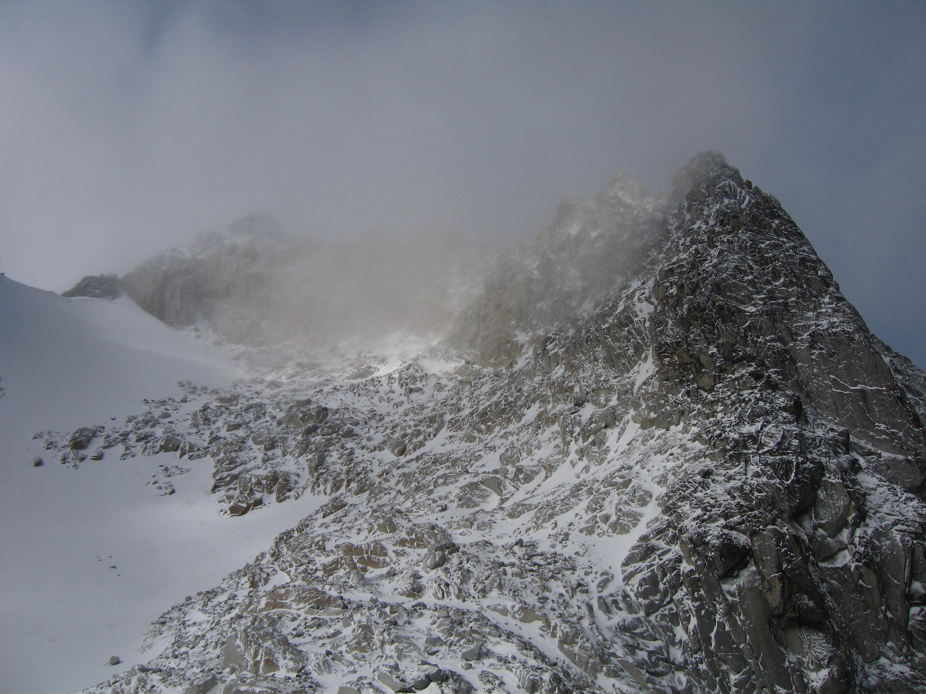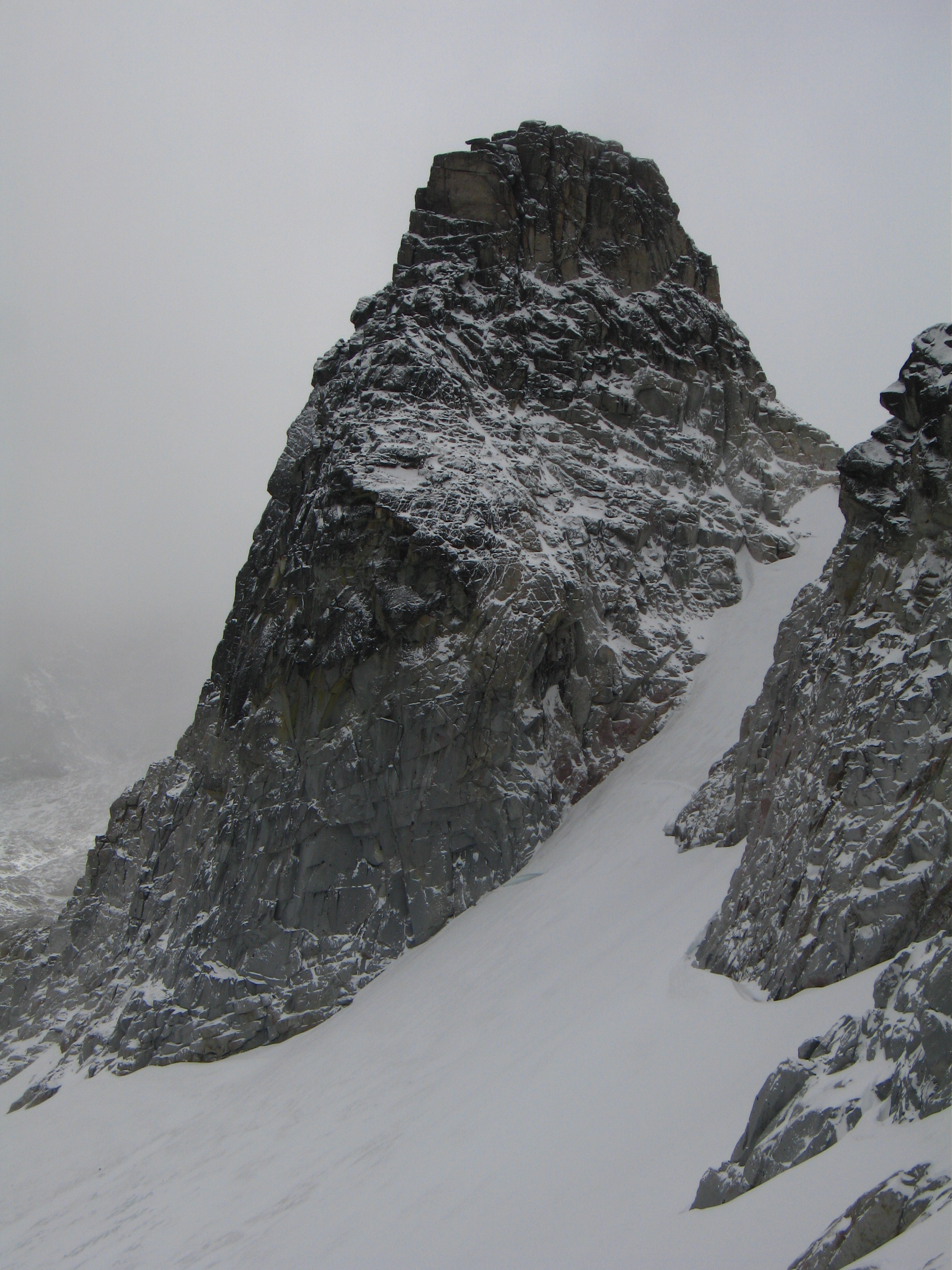 This is the standard route up Dragontail peak and involves moderate angled snow climbing and easy Class 2+ scrambling. Although this route is one of the easier routes for any high Bulger, it isn't a cakewalk and good fitness is required to make it happen. See above for approach descriptions. From the base of the east facing snowfield, begin climbing the 35 degree snow slope aiming towards the obvious saddle between the summit ridge to the right and the jagged ridge coming off Witches Tower to the left. This notch is at 8,500 feet making the snow climb roughly 700 feet. In late season, this snow slope turns to ice which increases the difficulty significantly. Once at the notch, continue across a short ways and turn right. You will emerge onto a talus slope on the south side of the peak. Work your way up this talus slope following faint trails when possible. 350 feet above the notch, locate the highest point on the jagged summit ridge (difficult in whiteout conditions) and hike to its base. 10-20 feet of Class 2+ scrambling gets you to the top.