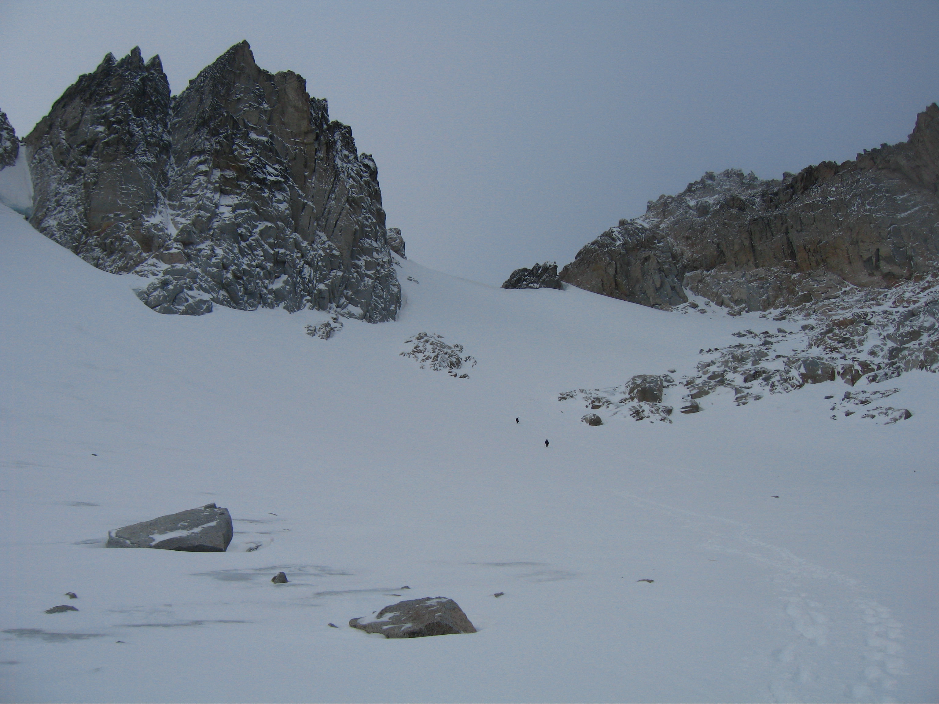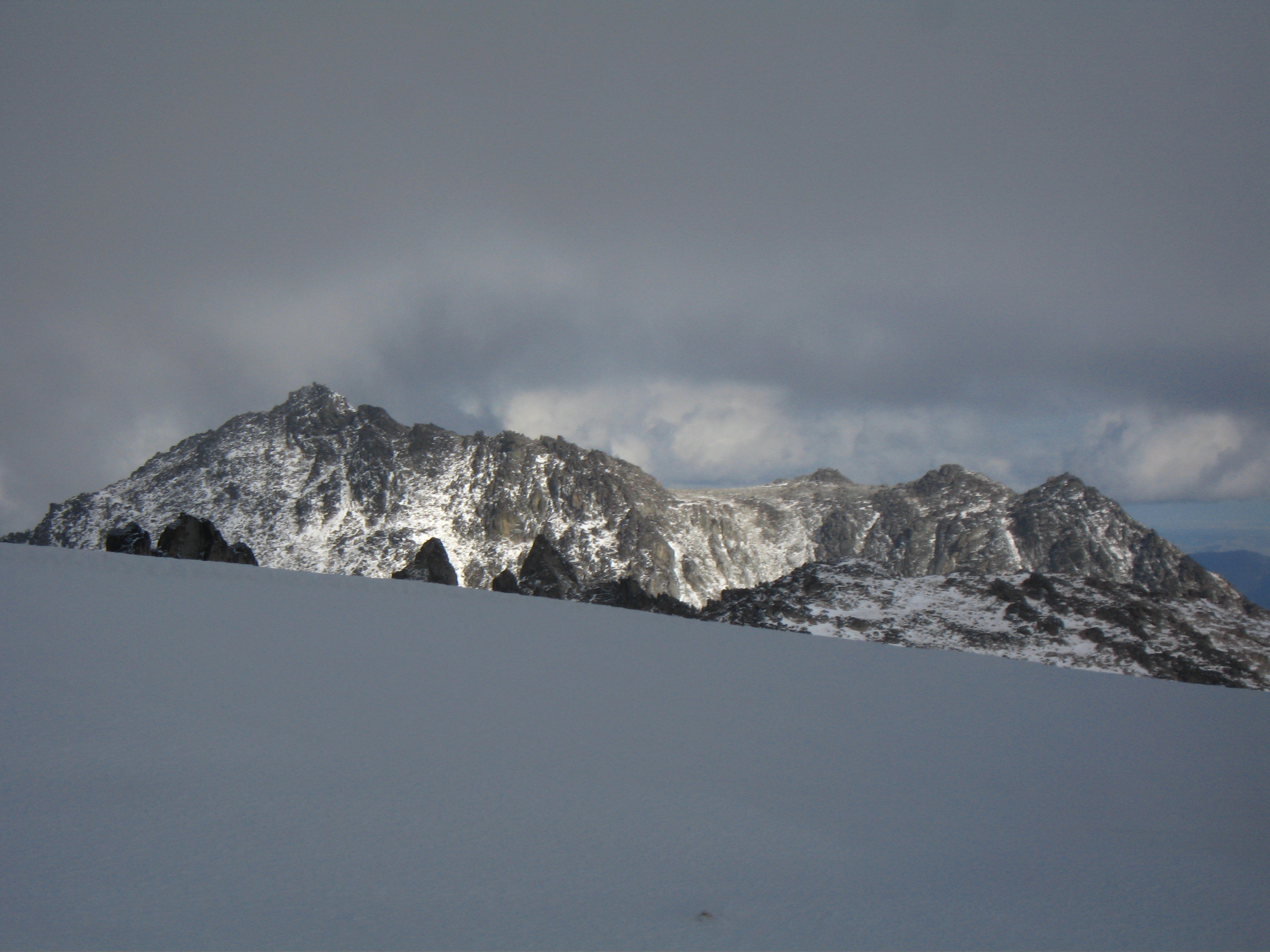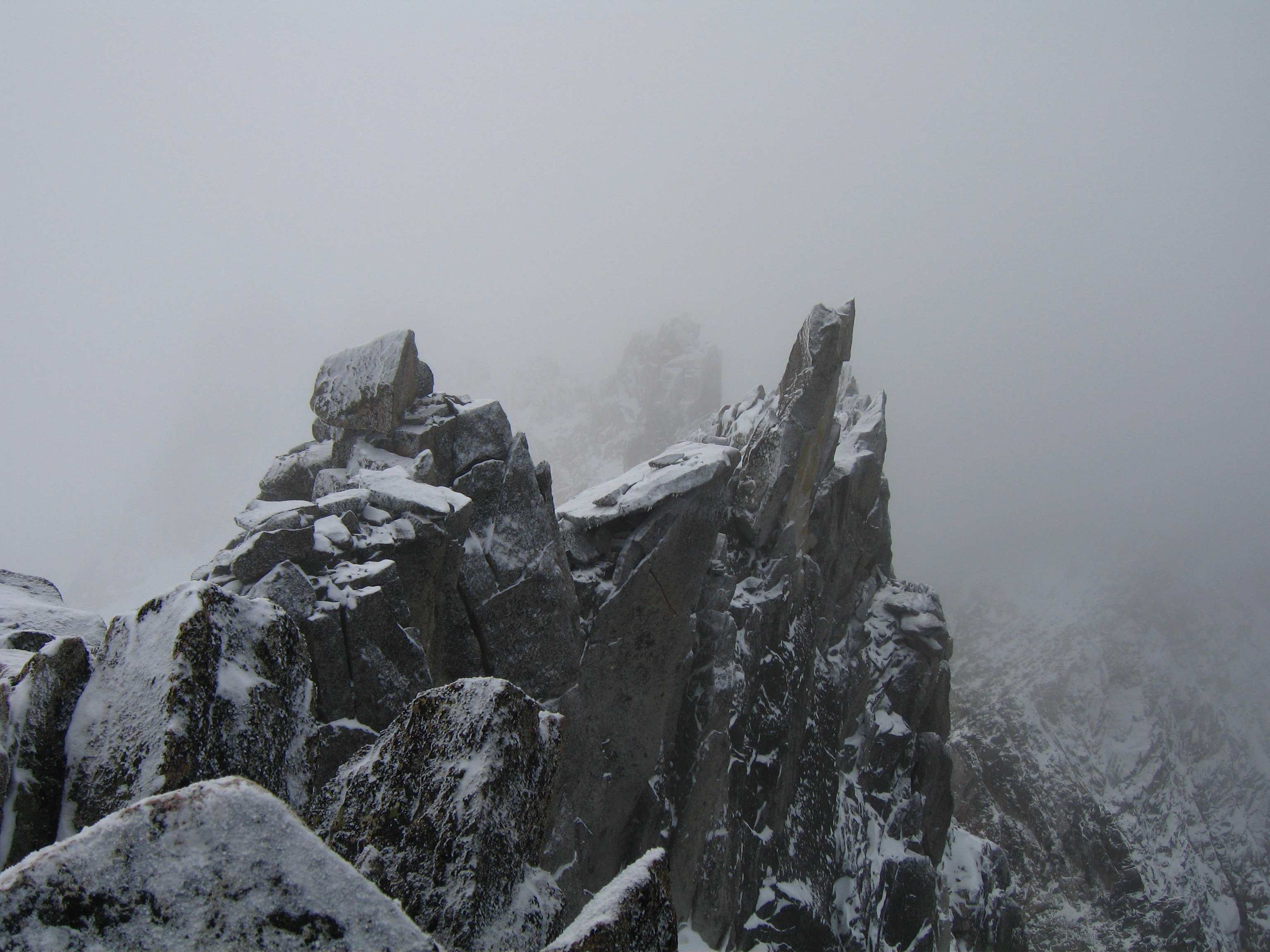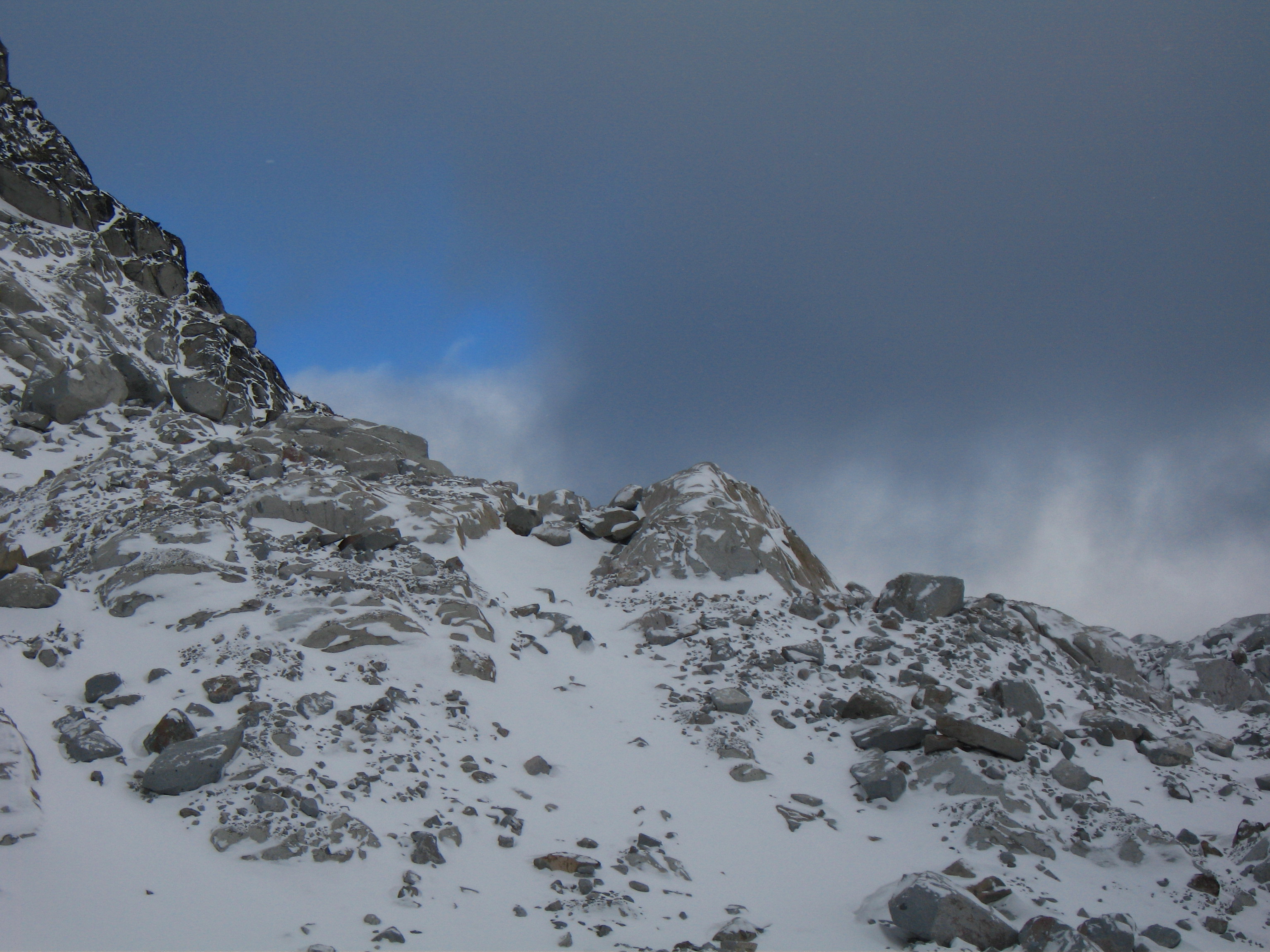 This is the standard route up Dragontail peak and involves moderate angled snow climbing and easy Class 2+ scrambling. Although this route is one of the easier routes for any high Bulger, it isn't a cakewalk and good fitness is required to make it happen. See above for approach descriptions. From the base of the east facing snowfield, begin climbing the 35 degree snow slope aiming towards the obvious saddle between the summit ridge to the right and the jagged ridge coming off Witches Tower to the left. This notch is at 8,500 feet making the snow climb roughly 700 feet. In late season, this snow slope turns to ice which increases the difficulty significantly. Once at the notch, continue across a short ways and turn right. You will emerge onto a talus slope on the south side of the peak. Work your way up this talus slope following faint trails when possible. 350 feet above the notch, locate the highest point on the jagged summit ridge (difficult in whiteout conditions) and hike to its base. 10-20 feet of Class 2+ scrambling gets you to the top.
