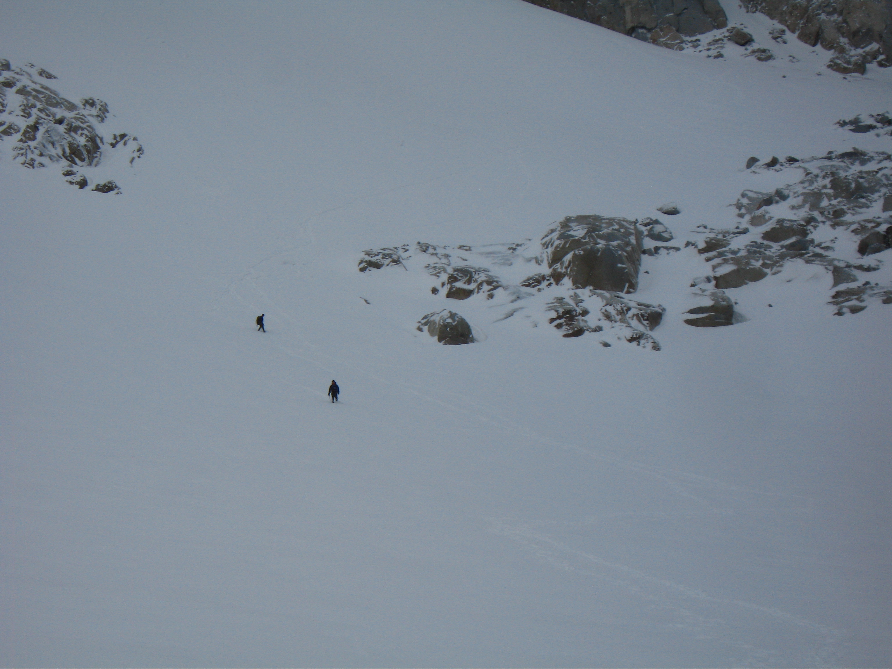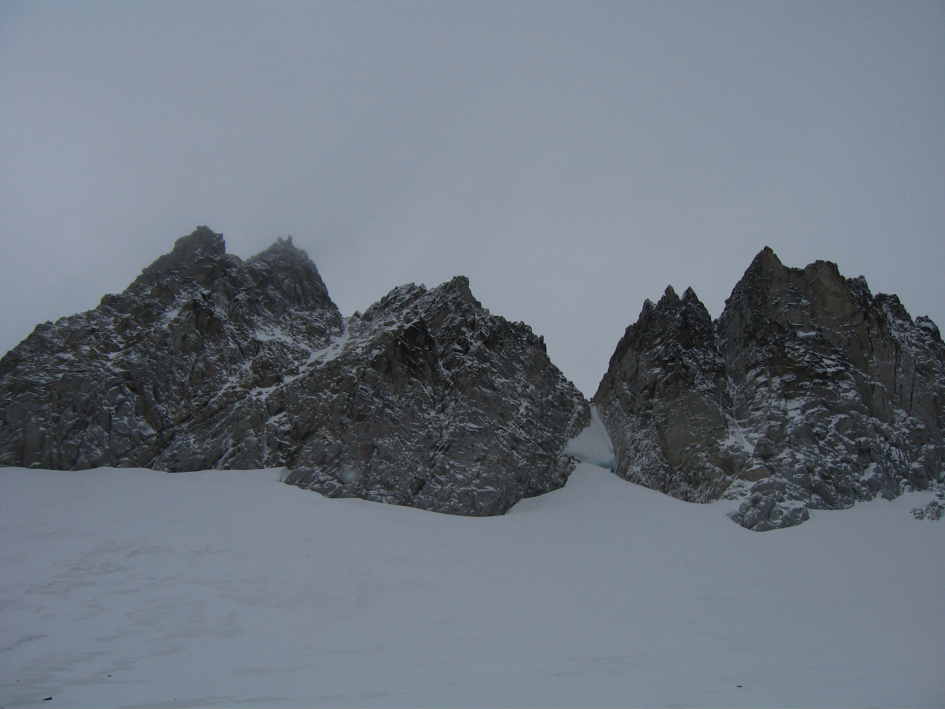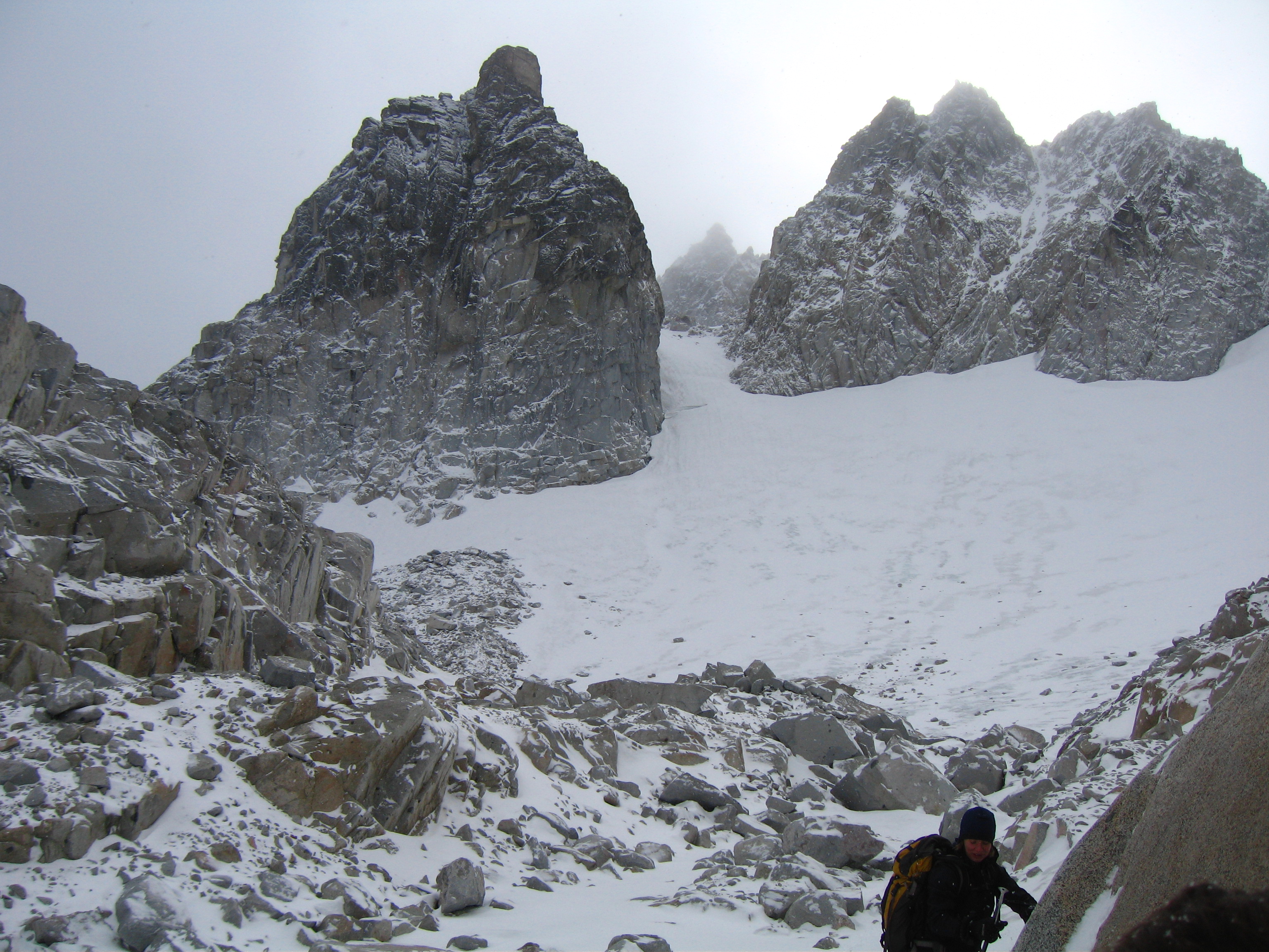 | Triple Couloirs | Class 5.7/WI3 | "A series of three couloirs, separated by short, steep rock bands, cuts up the middle of the north face of Dragontail, offering 2500 feet of great snow, ice, and/or mixed climbing. This route is somewhat popular and generally gets climbed by one variation or another several times each spring. The specific line taken, time required, and type of climbing encountered are entirely conditions dependent however, so that very few climbs of triple couloirs are the same. Triple Couloirs could and likely has been climbed in every condition imaginable, and has even been skied, and it is up to the climber to decide what sort of ice and snow coverage is acceptable for their attempt on any of the established variations." - Z-Man | |
