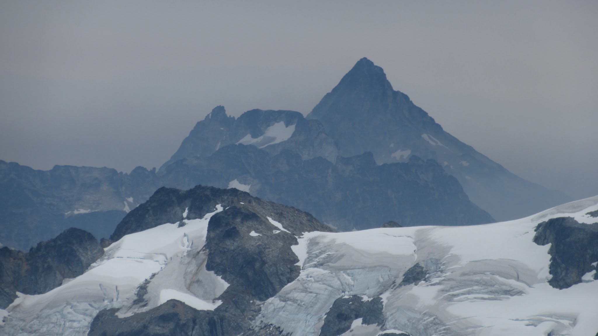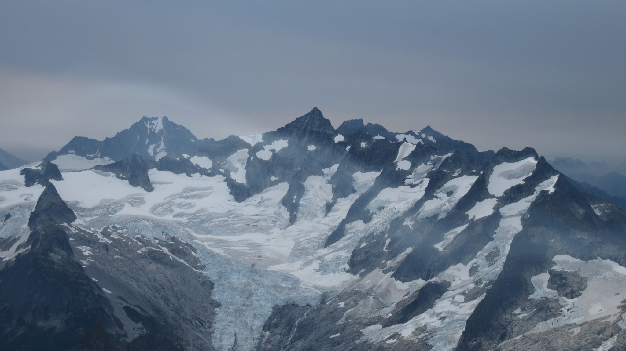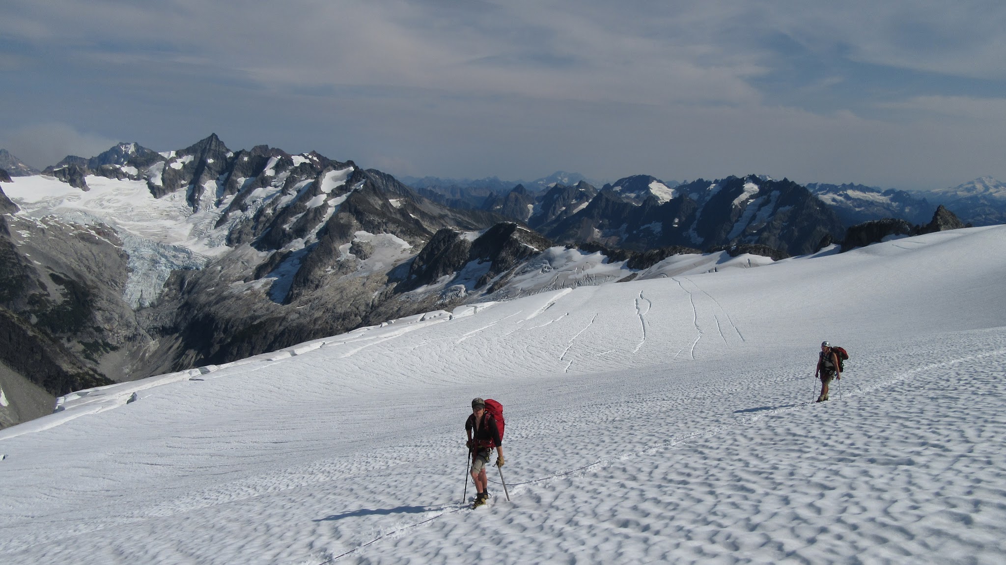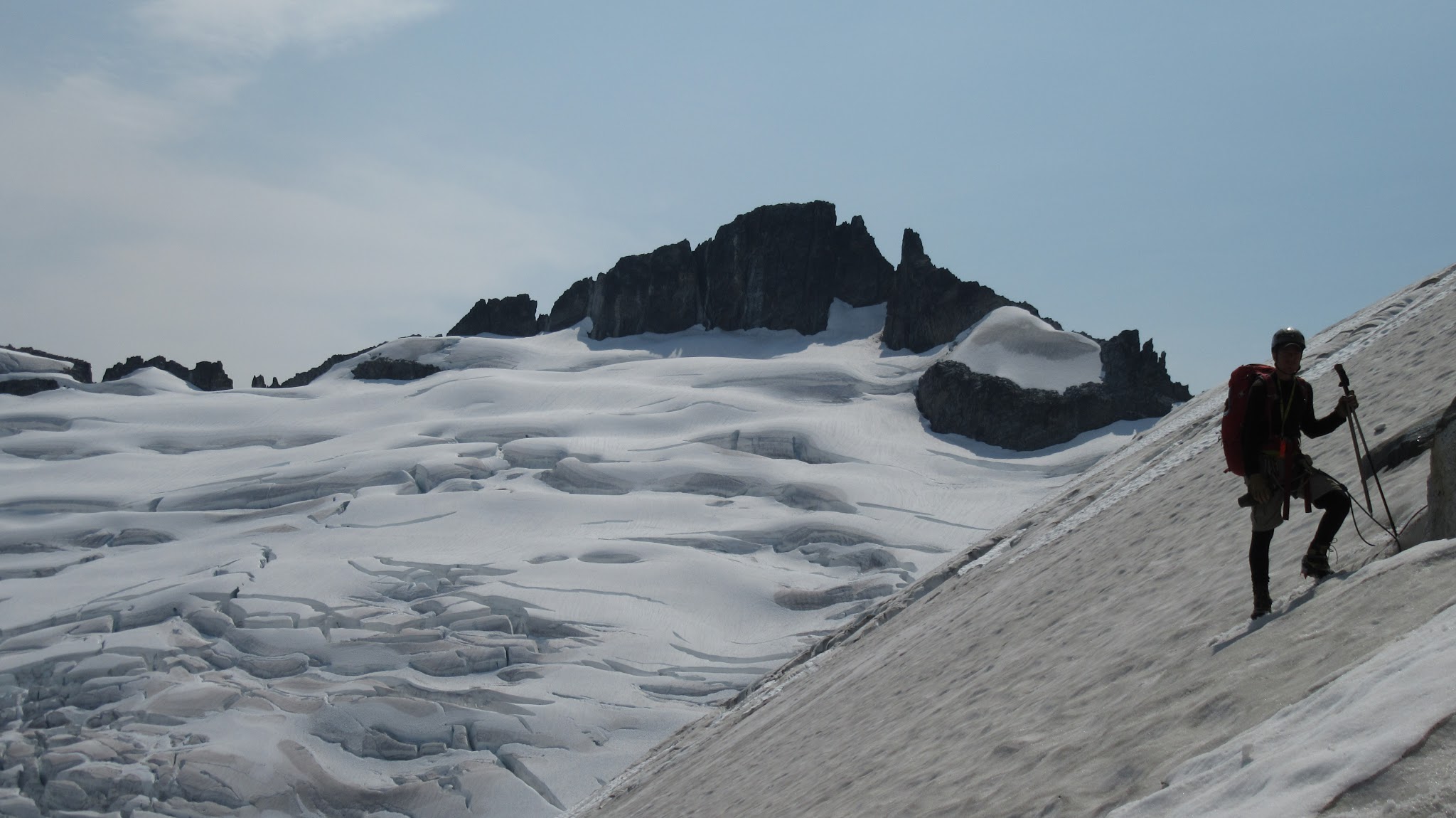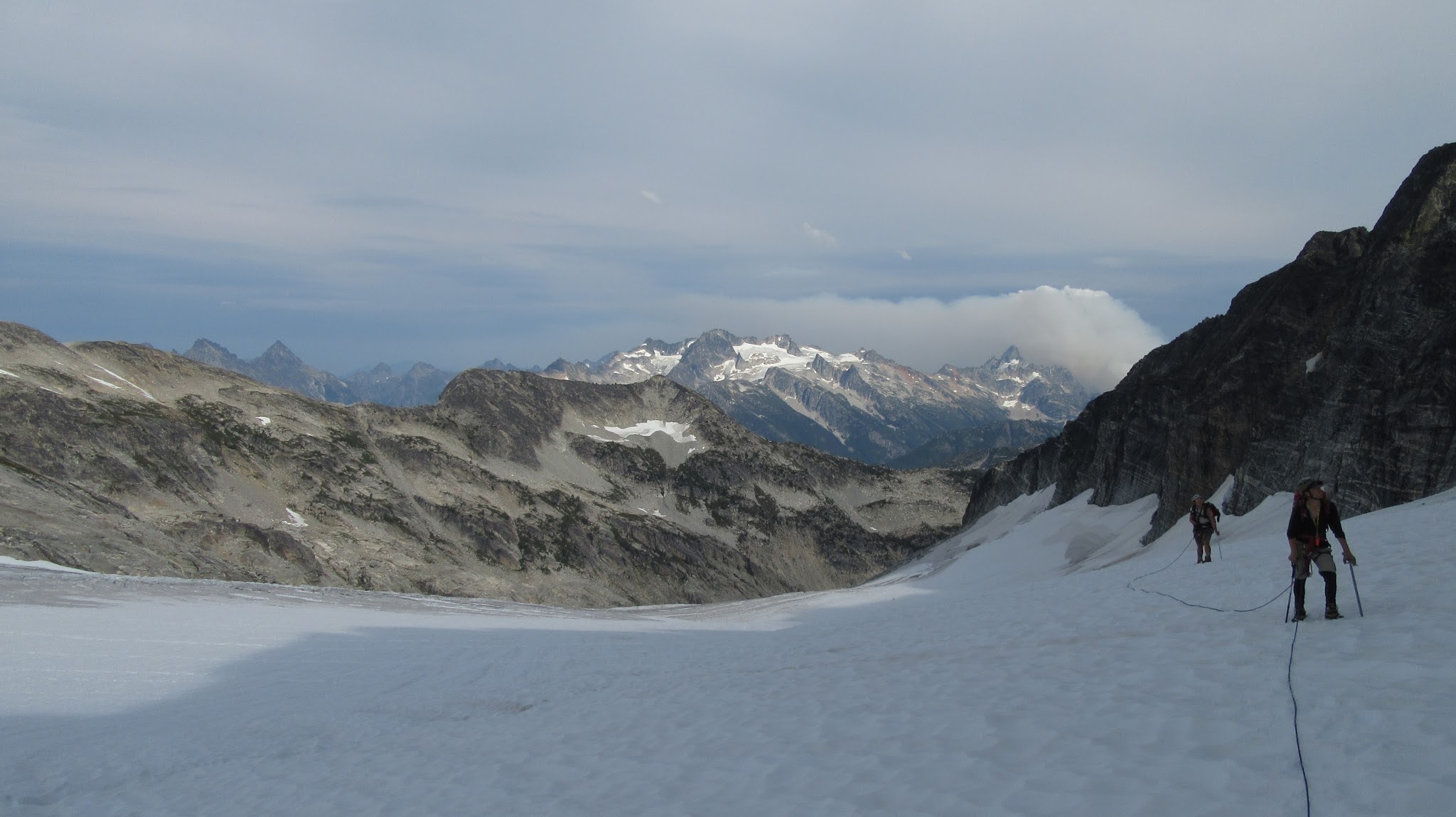 The next morning, we awoke to breezy conditions and since I didn't notice the sun hitting the tent, I looked out and saw very dense smoke covering the landscape with eerie looking grey layers! It was one of the strangest sights I've seen for sure. Forbidden Peak was hiding behind a mask of multiple layers of smoke and Mount Goode was hiding under a dark grey doomsday looking cloud. The wind was coming out of the west though so we figured we would be ok. I wasn't too keen on breathing thick smoke all day. We packed up camp and continued the traverse across the Inspiration Glacier to Klawatti Col, where Josh and I commented how awesome our last visit to Klawatti Col was. This time around it looked a lot different! There was much less snow this time around and much more crevasses were opened up. We took a short break at the col and I reviewed the routes on Klawatti. The SW face route, although class 4 according to Beckey just looks to be getting harder and harder as the glaciers melt.