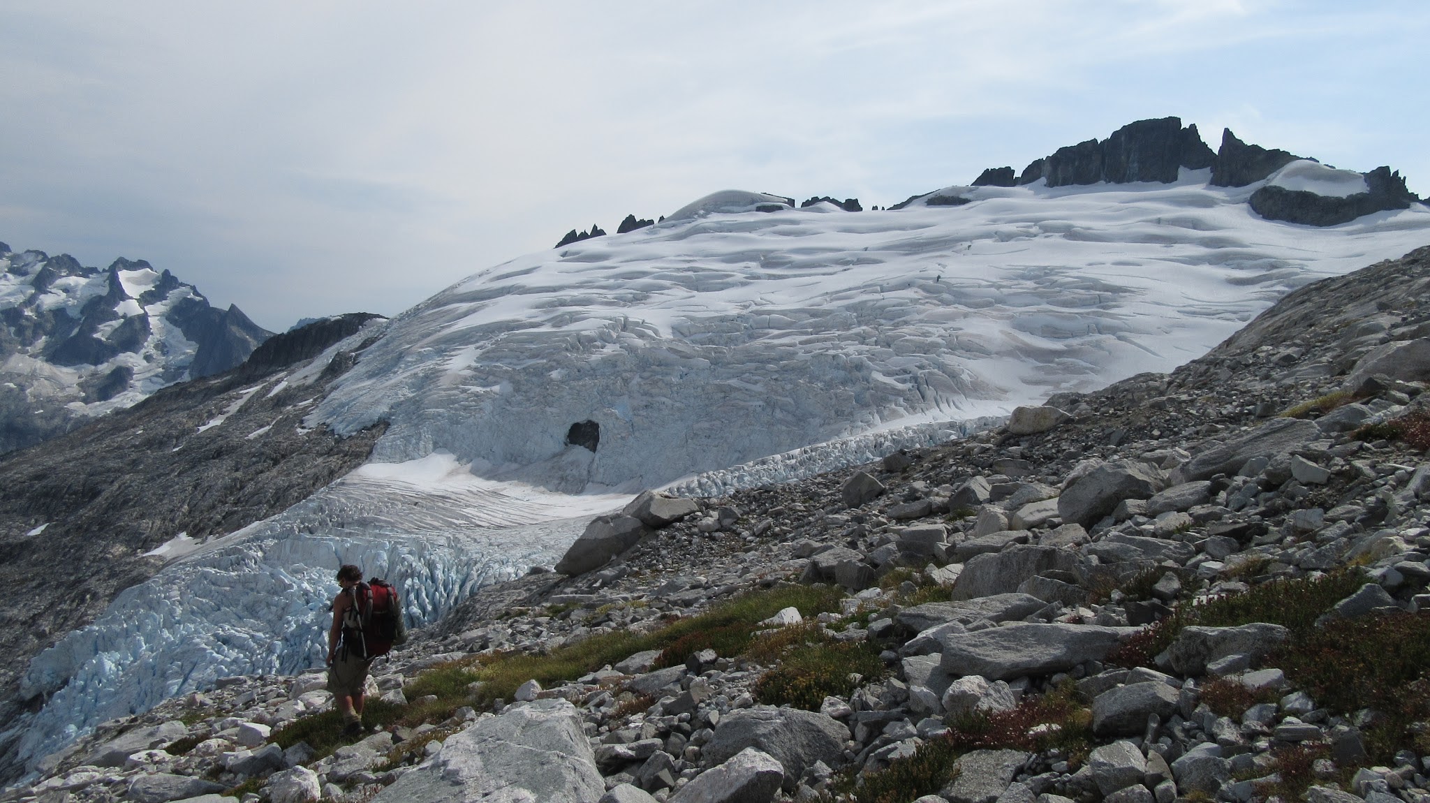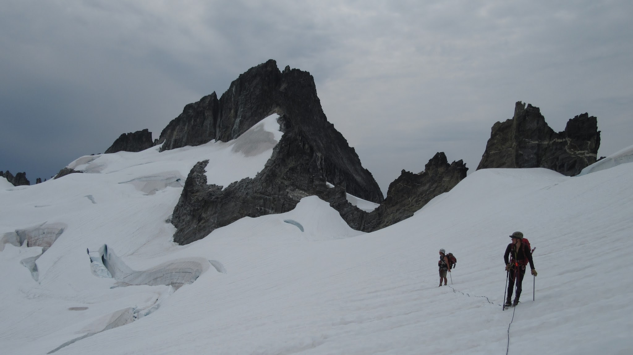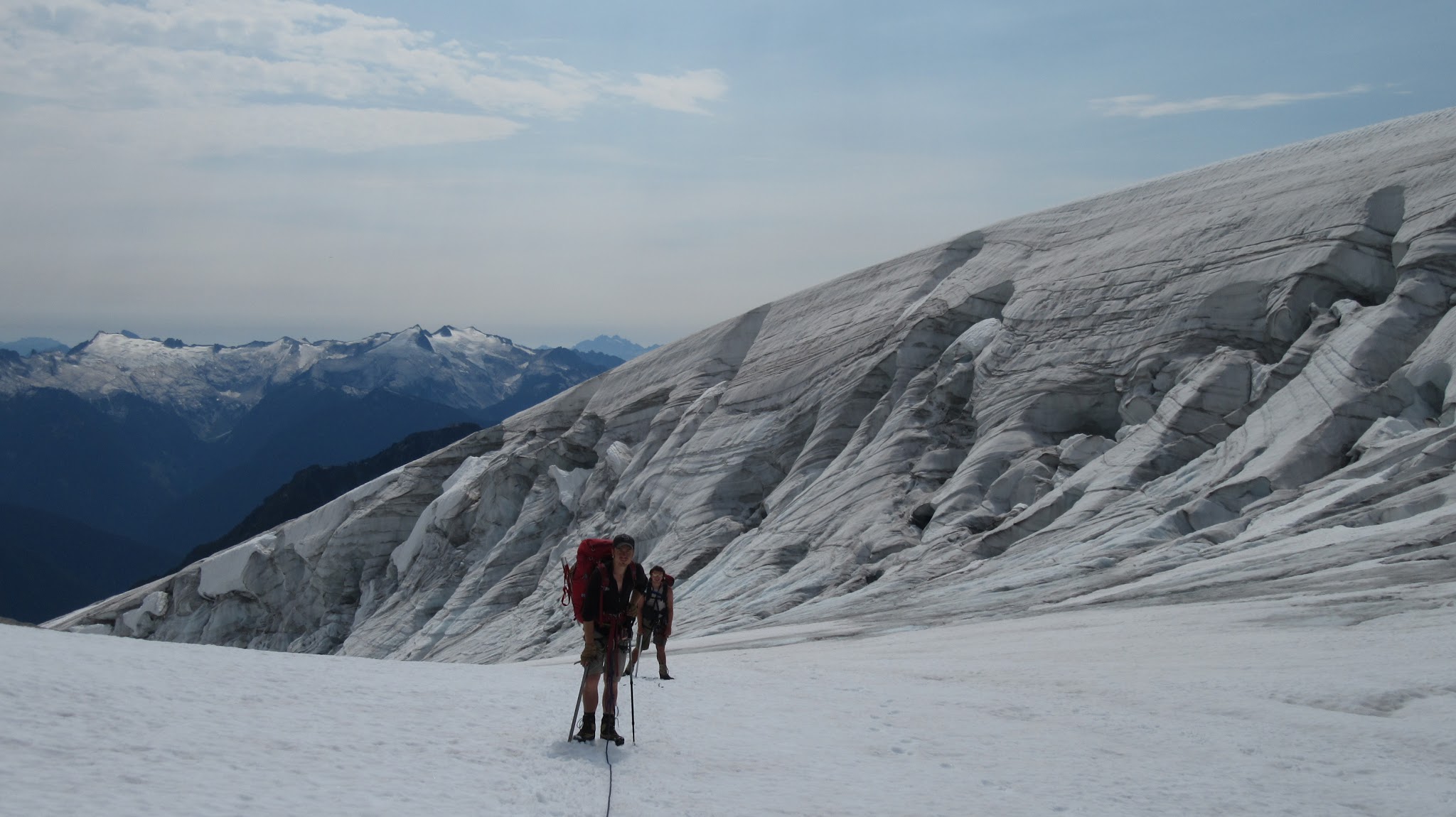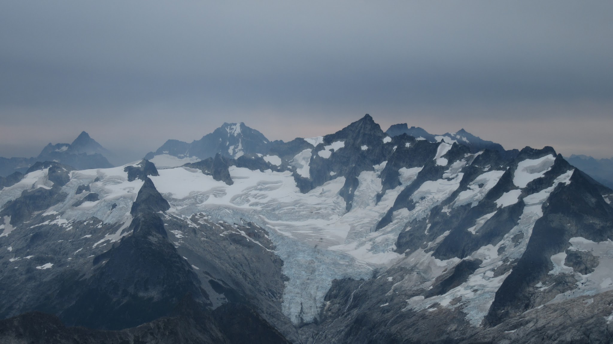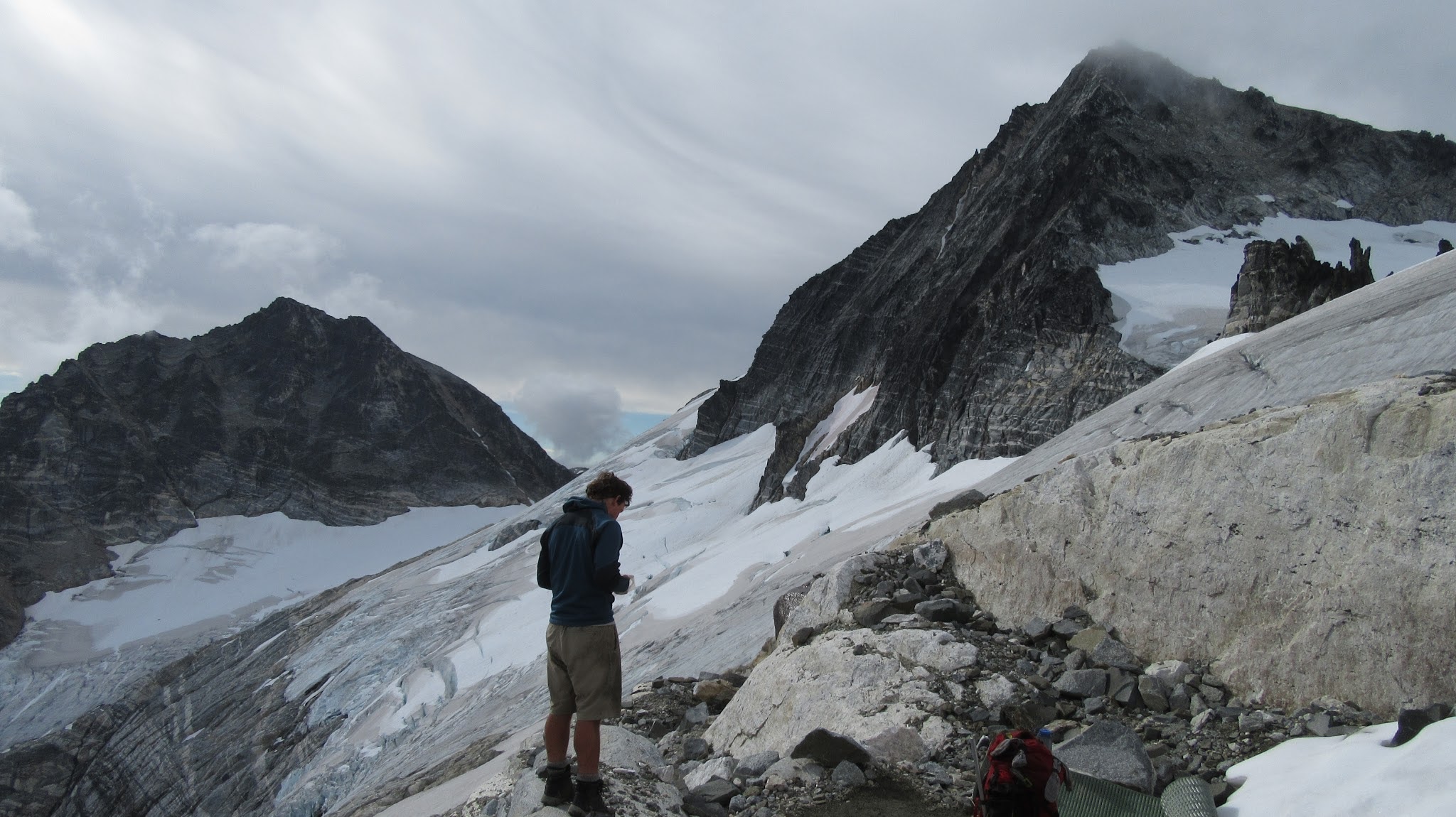 The next morning, we awoke to breezy conditions and since I didn't notice the sun hitting the tent, I looked out and saw very dense smoke covering the landscape with eerie looking grey layers! It was one of the strangest sights I've seen for sure. Forbidden Peak was hiding behind a mask of multiple layers of smoke and Mount Goode was hiding under a dark grey doomsday looking cloud. The wind was coming out of the west though so we figured we would be ok. I wasn't too keen on breathing thick smoke all day. We packed up camp and continued the traverse across the Inspiration Glacier to Klawatti Col, where Josh and I commented how awesome our last visit to Klawatti Col was. This time around it looked a lot different! There was much less snow this time around and much more crevasses were opened up. We took a short break at the col and I reviewed the routes on Klawatti. The SW face route, although class 4 according to Beckey just looks to be getting harder and harder as the glaciers melt.