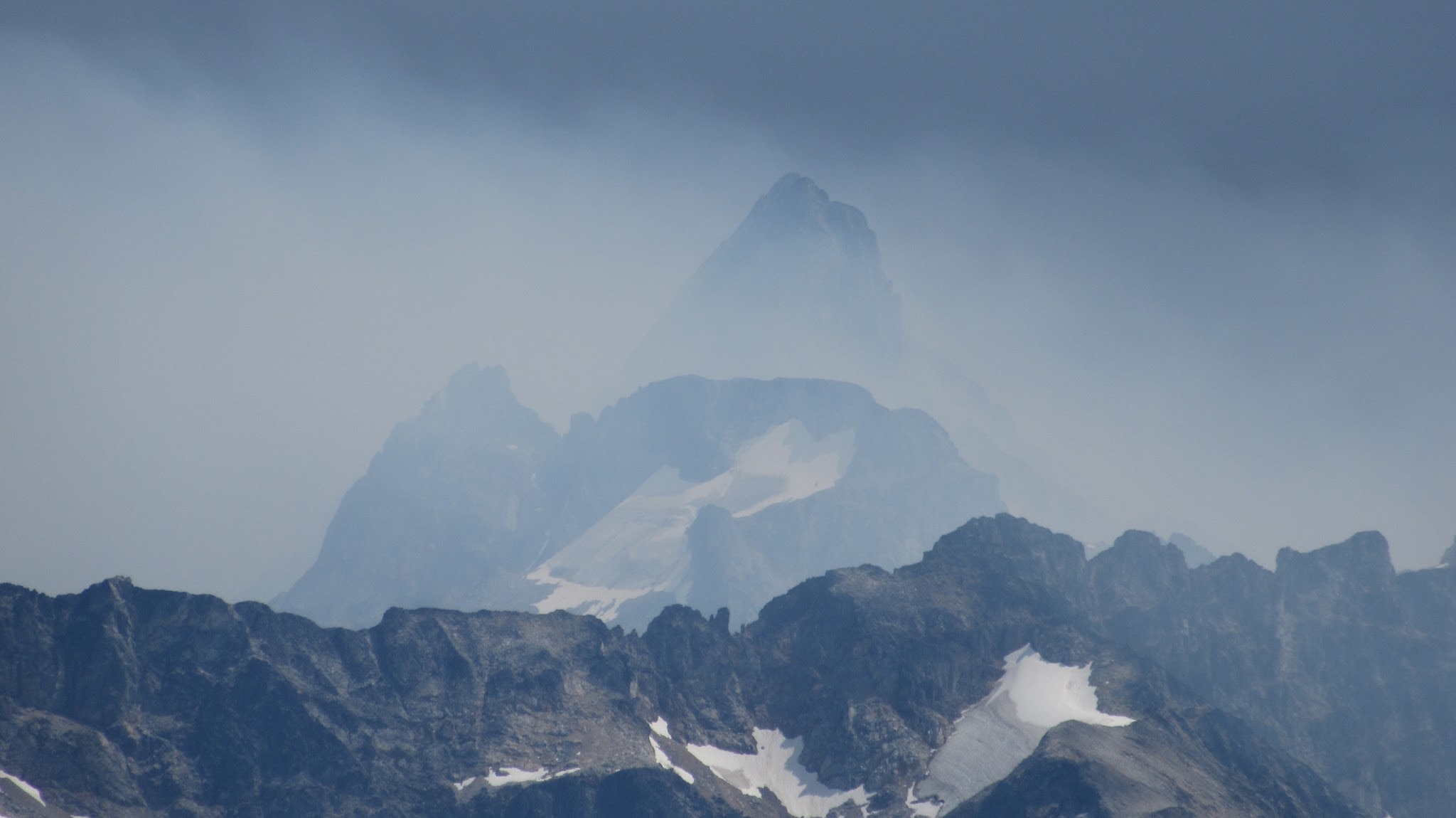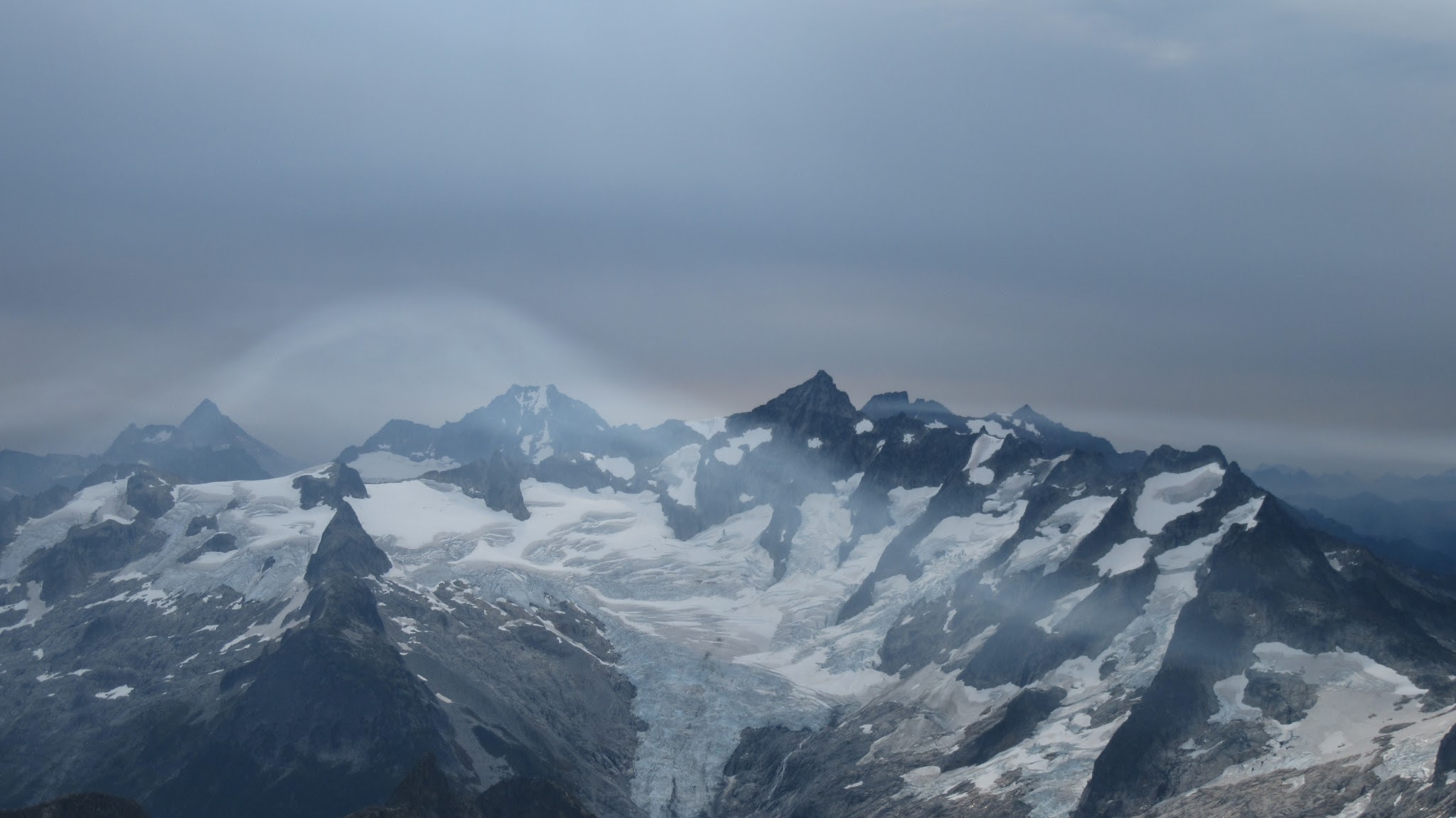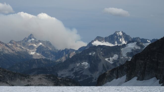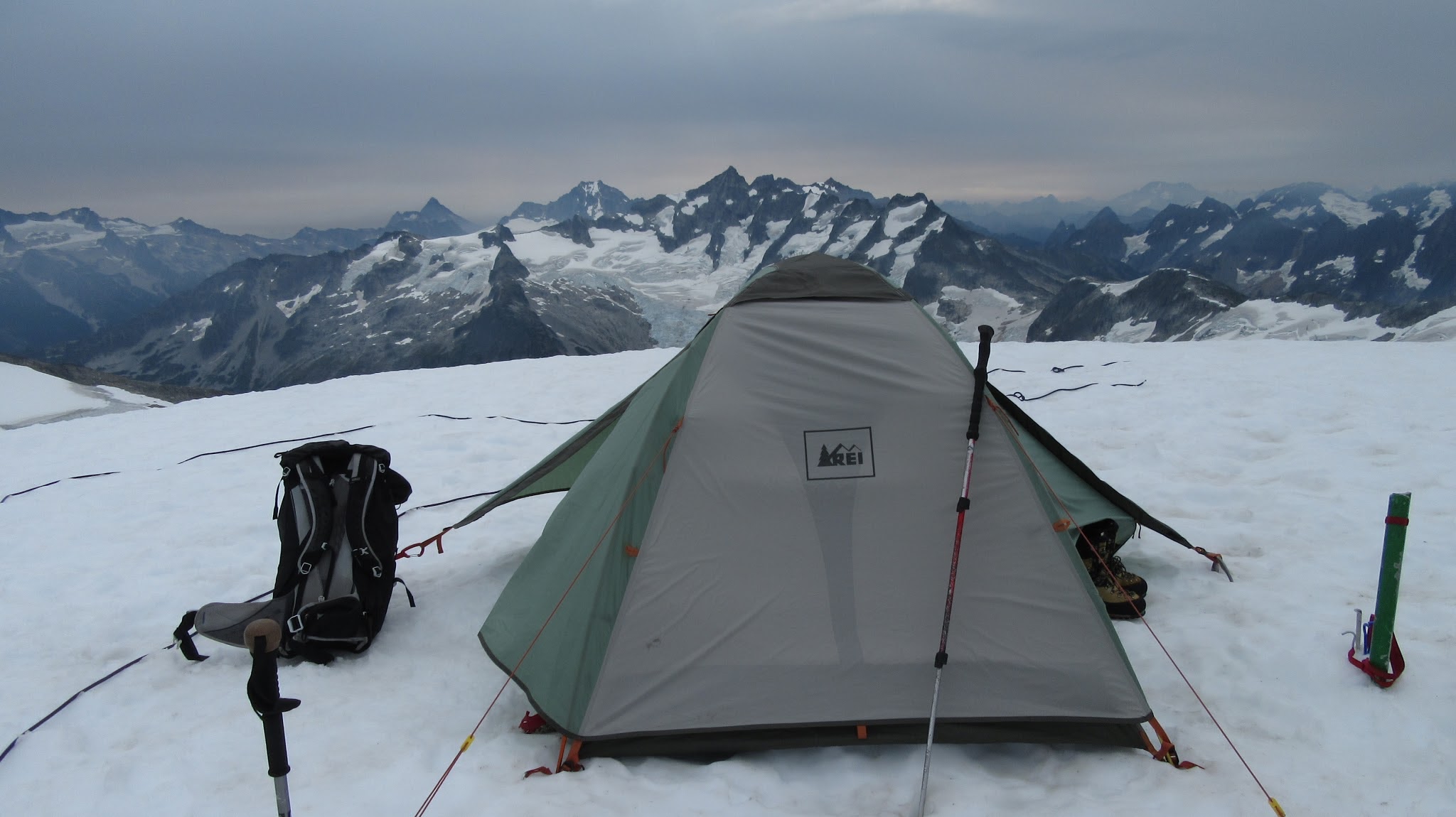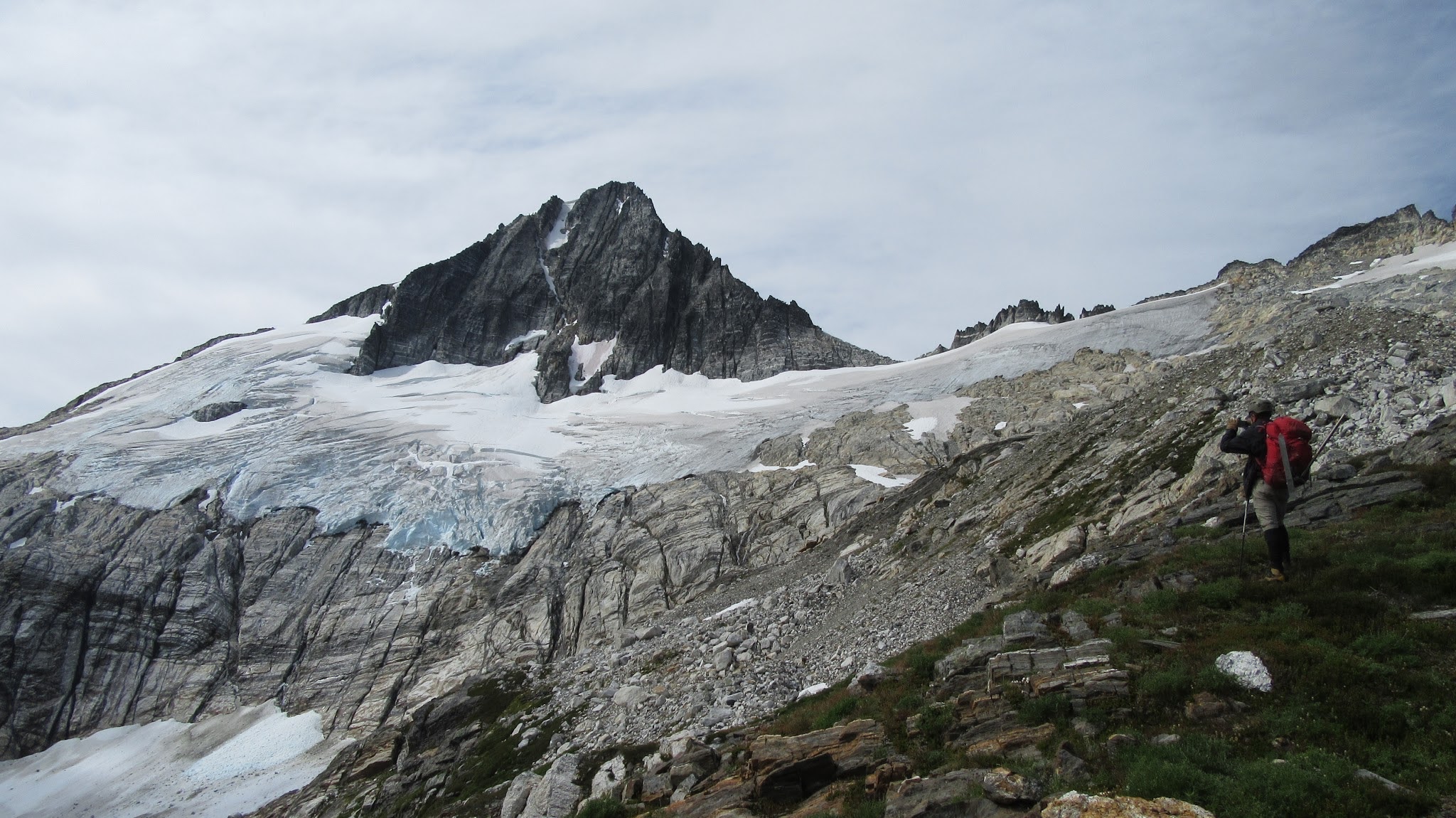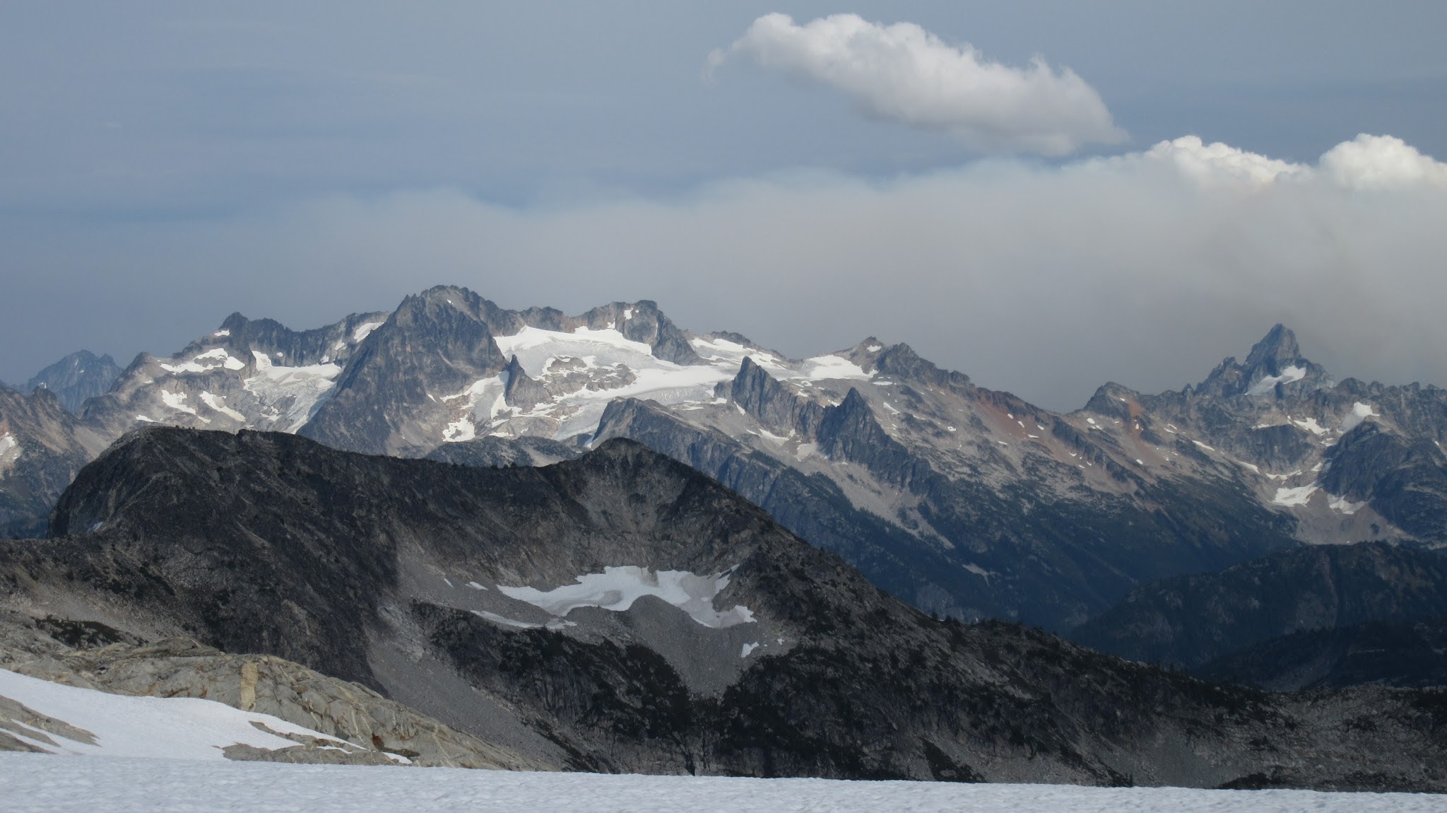 The next morning, we awoke to breezy conditions and since I didn't notice the sun hitting the tent, I looked out and saw very dense smoke covering the landscape with eerie looking grey layers! It was one of the strangest sights I've seen for sure. Forbidden Peak was hiding behind a mask of multiple layers of smoke and Mount Goode was hiding under a dark grey doomsday looking cloud. The wind was coming out of the west though so we figured we would be ok. I wasn't too keen on breathing thick smoke all day. We packed up camp and continued the traverse across the Inspiration Glacier to Klawatti Col, where Josh and I commented how awesome our last visit to Klawatti Col was. This time around it looked a lot different! There was much less snow this time around and much more crevasses were opened up. We took a short break at the col and I reviewed the routes on Klawatti. The SW face route, although class 4 according to Beckey just looks to be getting harder and harder as the glaciers melt.