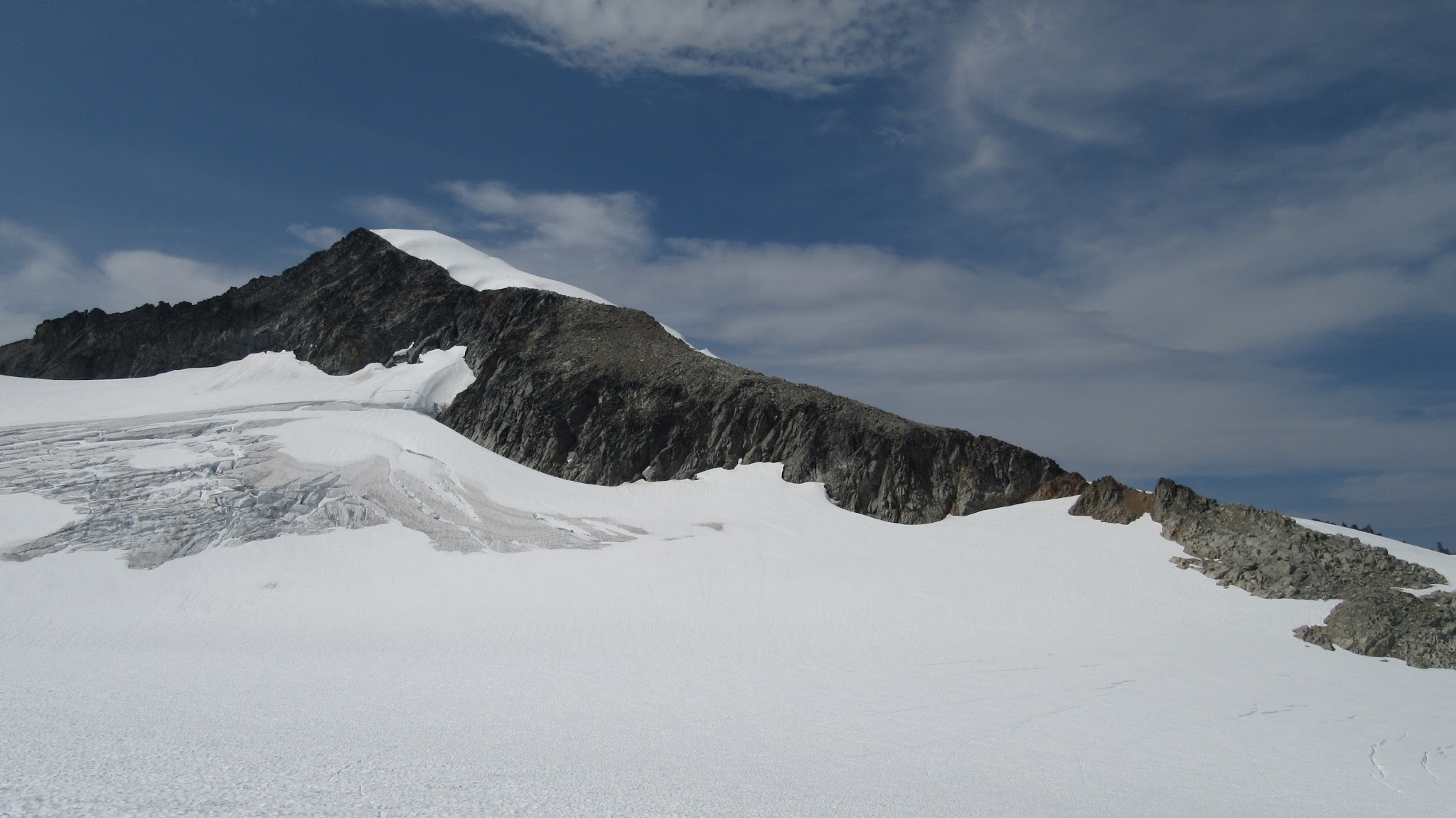 We explored a little and descended the north ridge a few feet so I could get a glimple of Borelis Lake below the NE side of the peak, but since it was getting late in the day, we didn't stay long and returned to our packs. As we started down 8,160 feet where we left the packs, we soon realized this 200 foot descent to the small glacier below was not going to go easily. The first bit wasn't so bad, which consisted of a nice ledge traverse (although very loose) to the top of a steep gully, with a dozen or so large rocks wedged in at the top. It was only 50 feet or so down to the snow but it was 75-80 degree hard pan dirt in the gully, and all other potential scramble routes did not go.