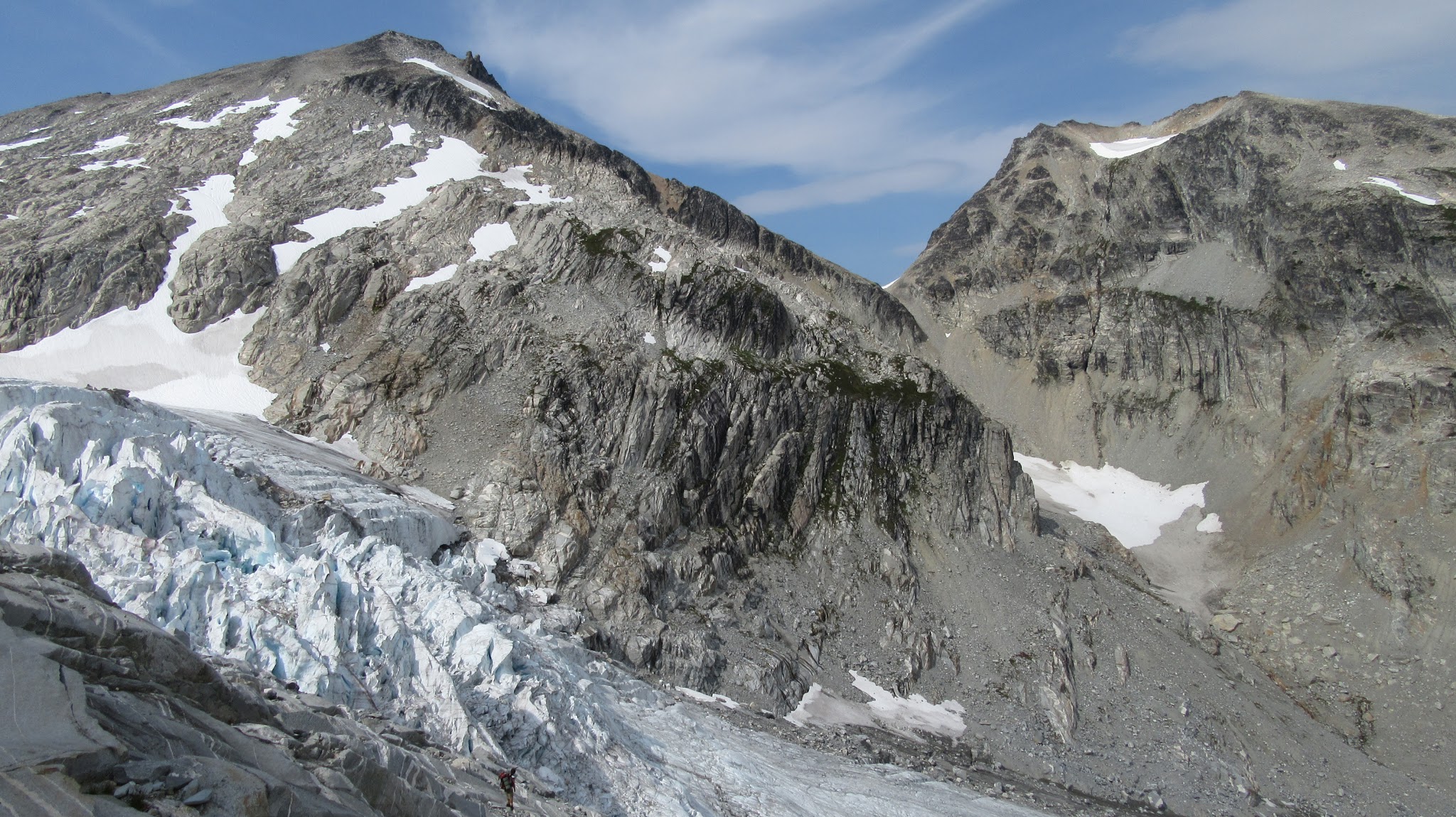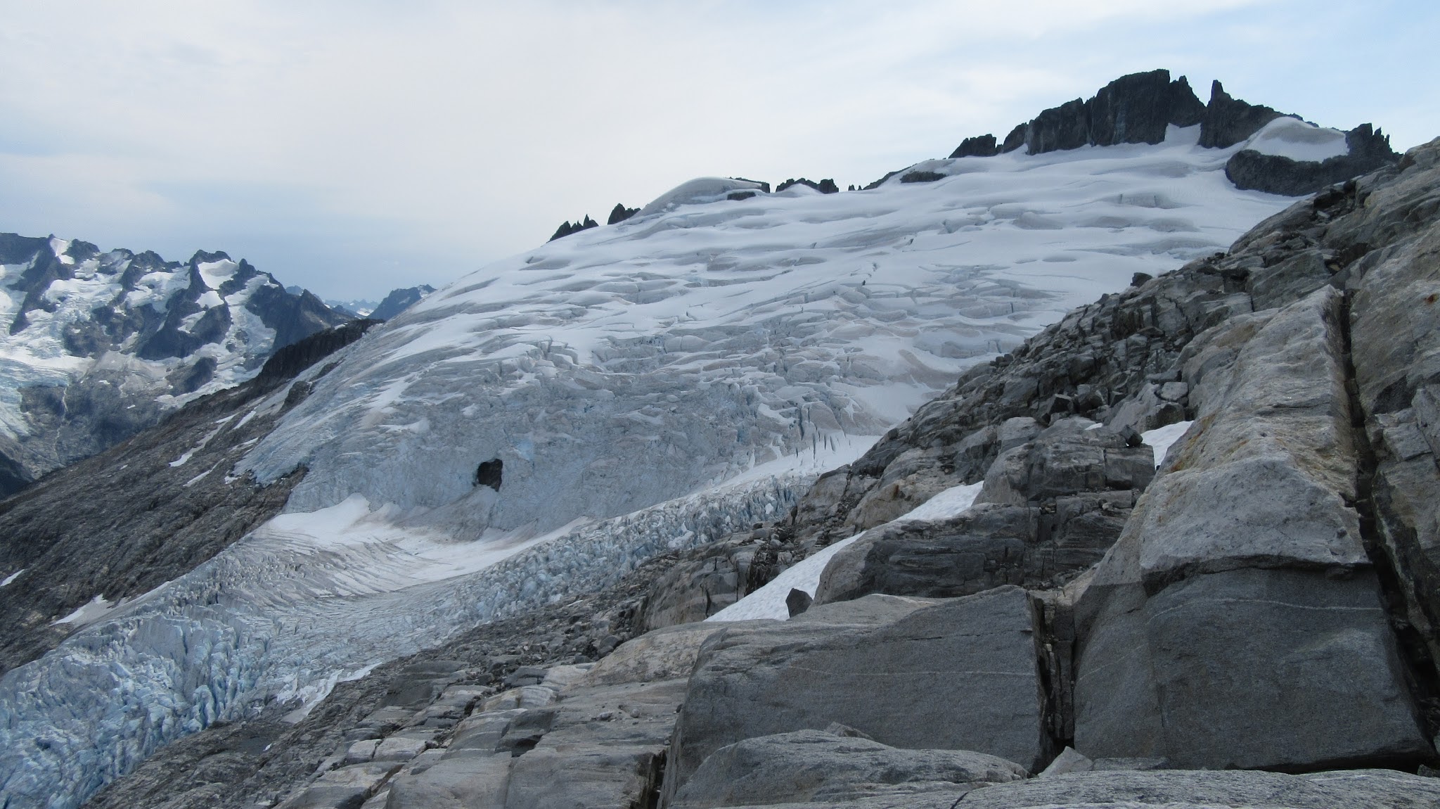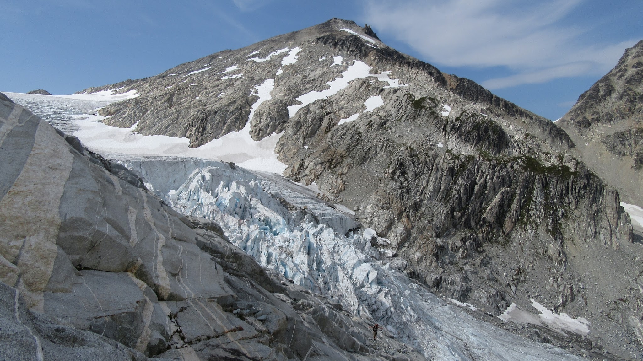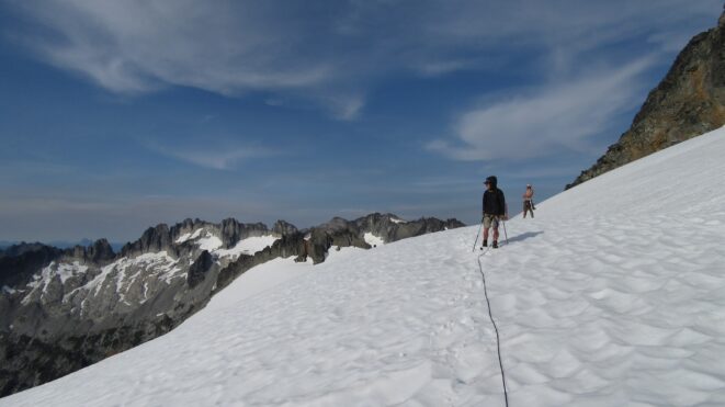 At the small waterfall roughly halfway to the Eldorado Glacier we cooled off and filled our bottles. It was full sunshine the rest of the way. We reached the crossover ridge where views of the Eldorado glacier opened up. It is amazing how much receding has occurred since 2012. We hiked for a long time up the granite slabs before finally reaching the glacier, which seemed like it was a couple hundred feet higher than it was a few years ago. We roped up and continued to where the glacier flattened out, and reached the standard Eldorado camp on the east ridge of Eldorado Peak. Here we saw a couple going for a route on the west face of Eldorado, who we would later run into again in Marblemount!