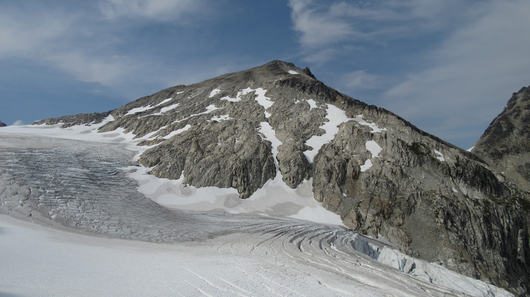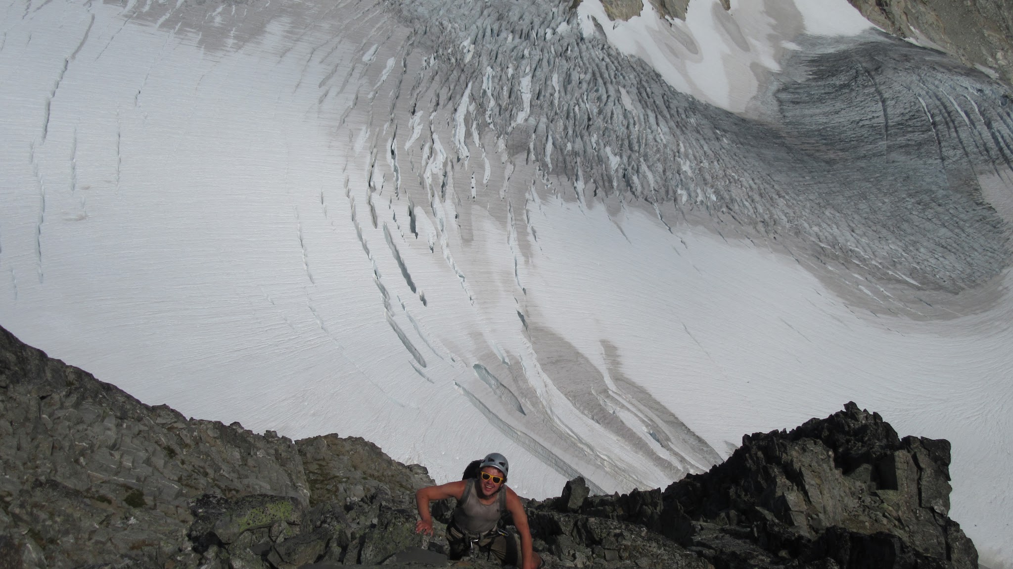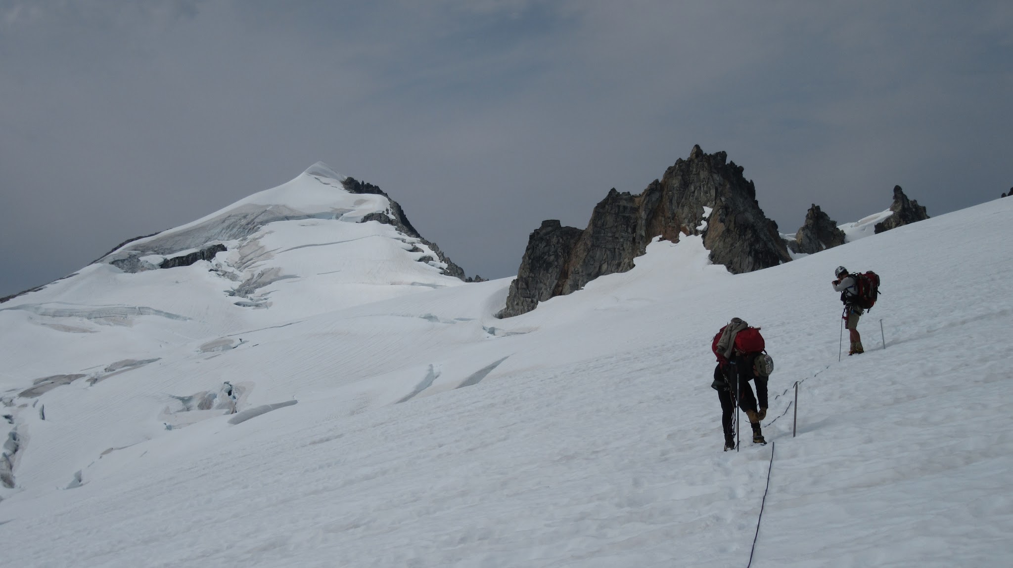 At the small waterfall roughly halfway to the Eldorado Glacier we cooled off and filled our bottles. It was full sunshine the rest of the way. We reached the crossover ridge where views of the Eldorado glacier opened up. It is amazing how much receding has occurred since 2012. We hiked for a long time up the granite slabs before finally reaching the glacier, which seemed like it was a couple hundred feet higher than it was a few years ago. We roped up and continued to where the glacier flattened out, and reached the standard Eldorado camp on the east ridge of Eldorado Peak. Here we saw a couple going for a route on the west face of Eldorado, who we would later run into again in Marblemount!