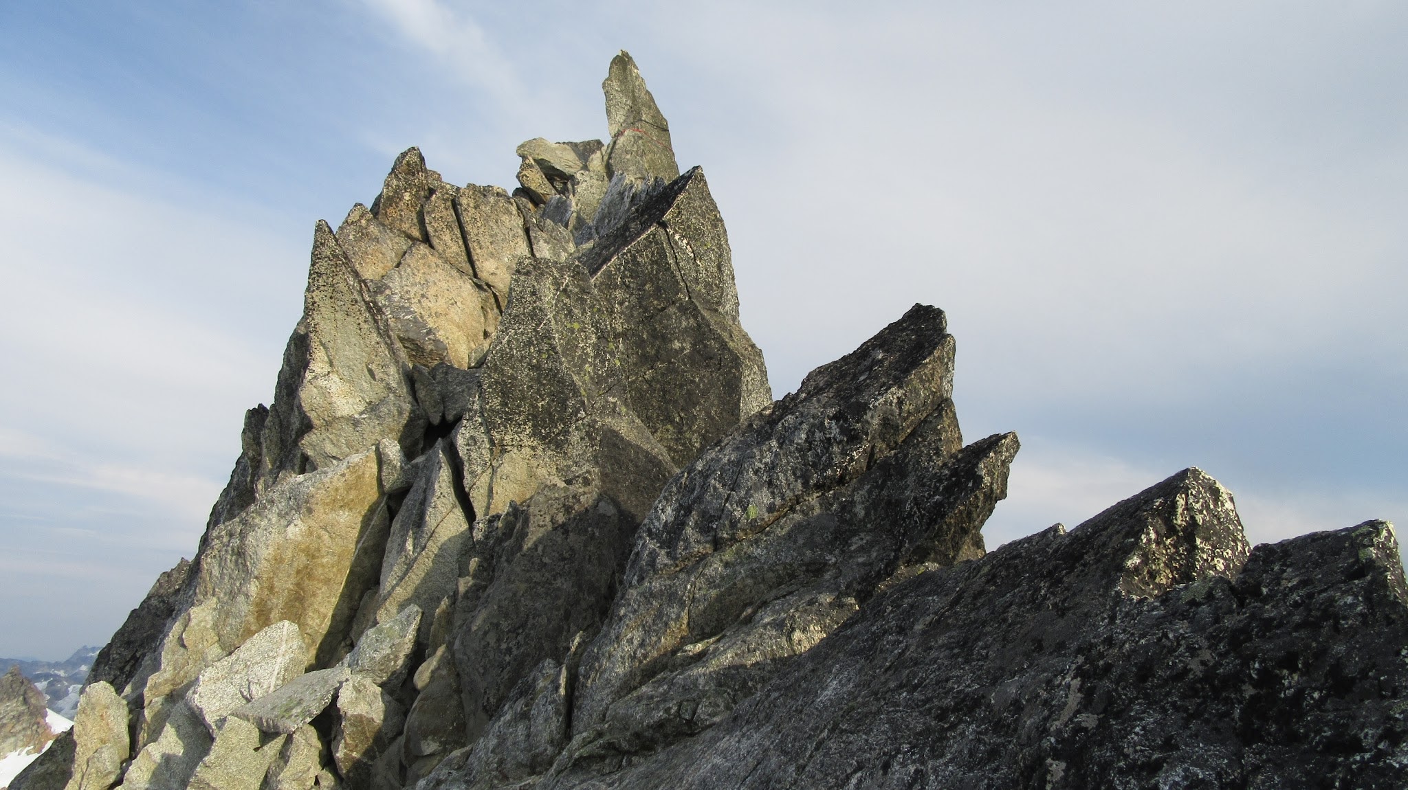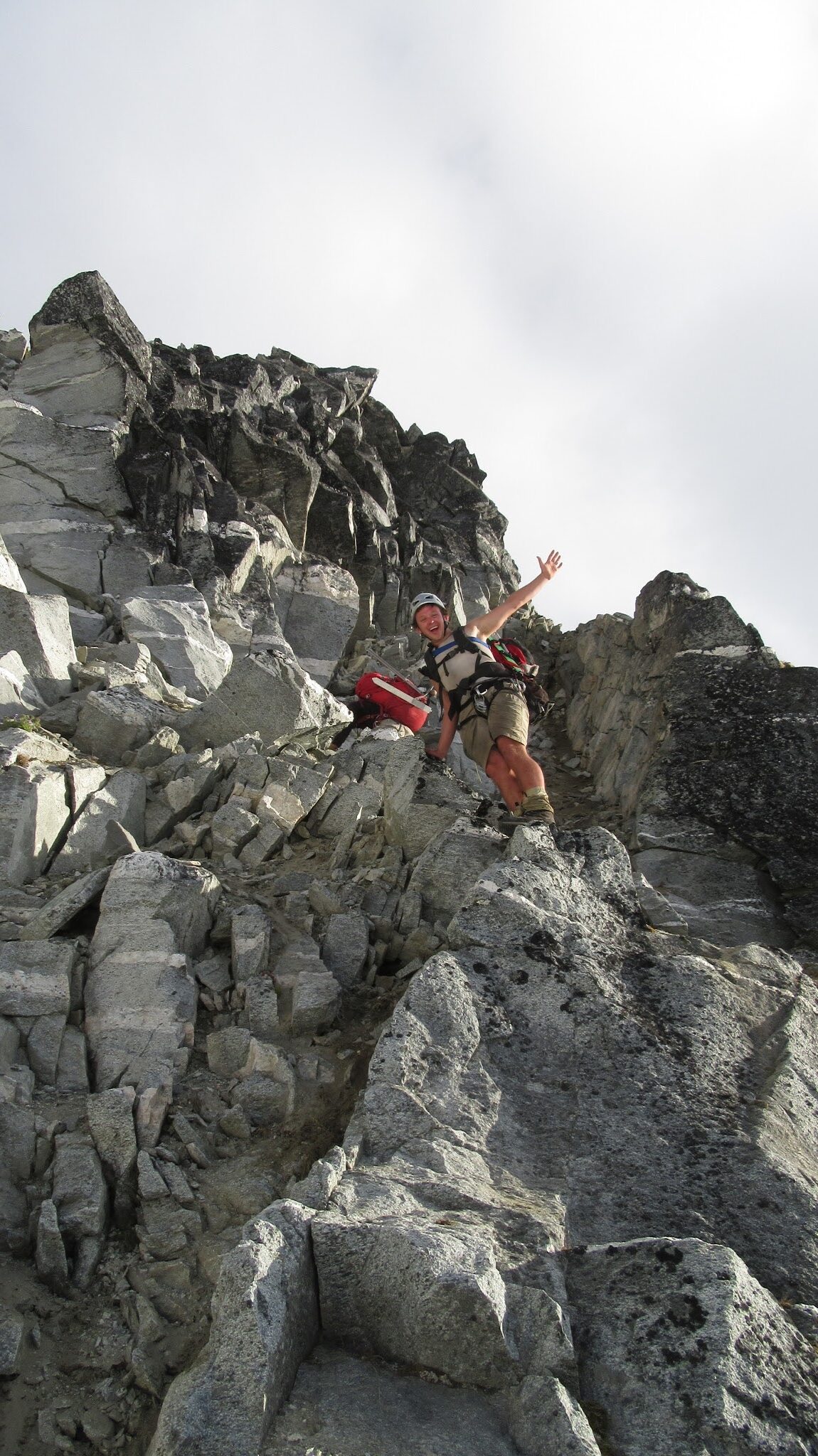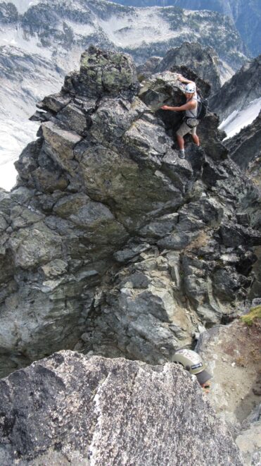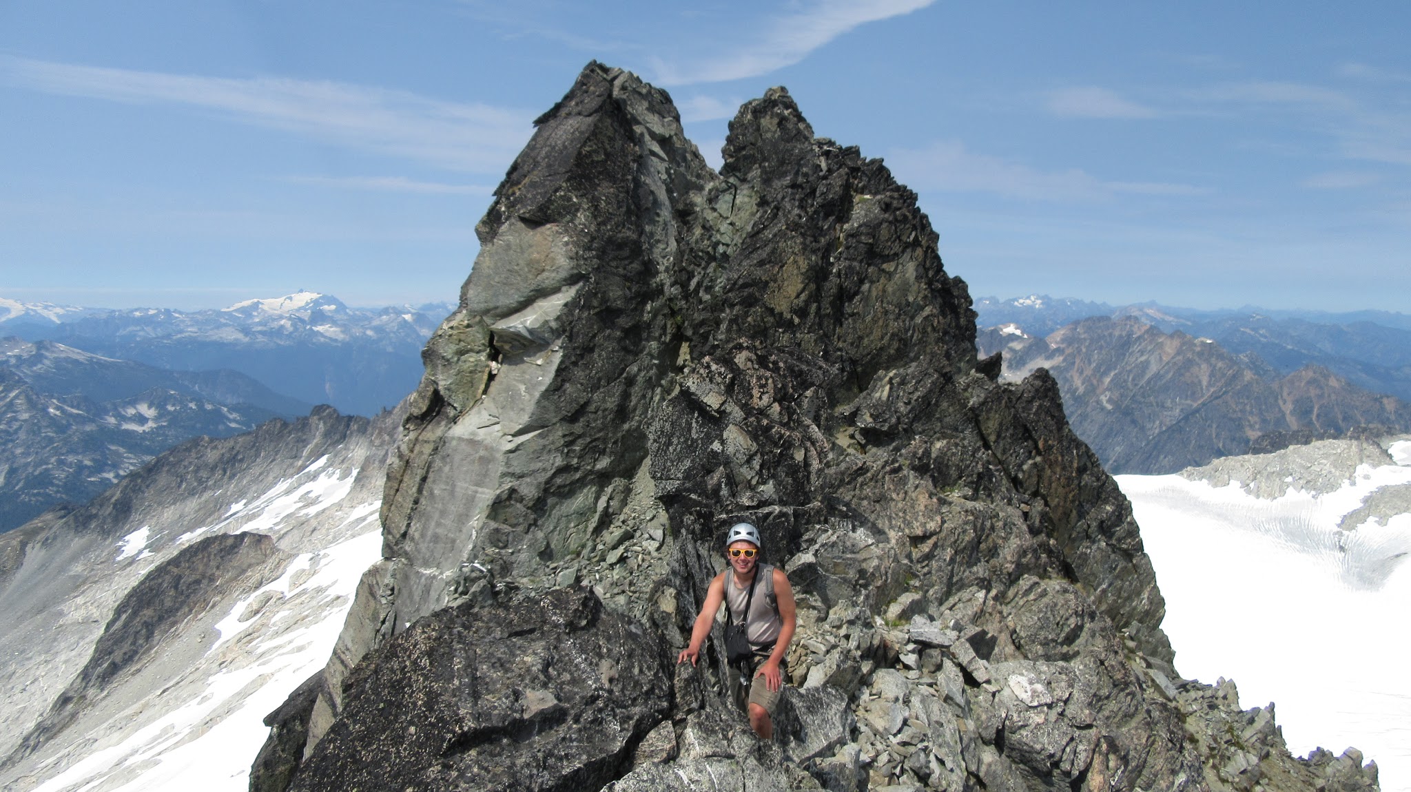 Once on the rock, we began climbing nice solid granite. I led a full 30 meter low 5th class pitch up mostly slabs but with enough cracks to offer good protection. This led me to the NW ridge, at which point we realized the exposure was huge! Our route description simply said follow the ridge over a couple knife edges to the summit. Here we unroped and all soloed the remainder of the ridge to the summit. There were indeed two knife edges to cross which got our adrenaline going!
