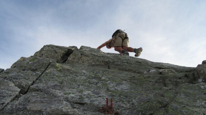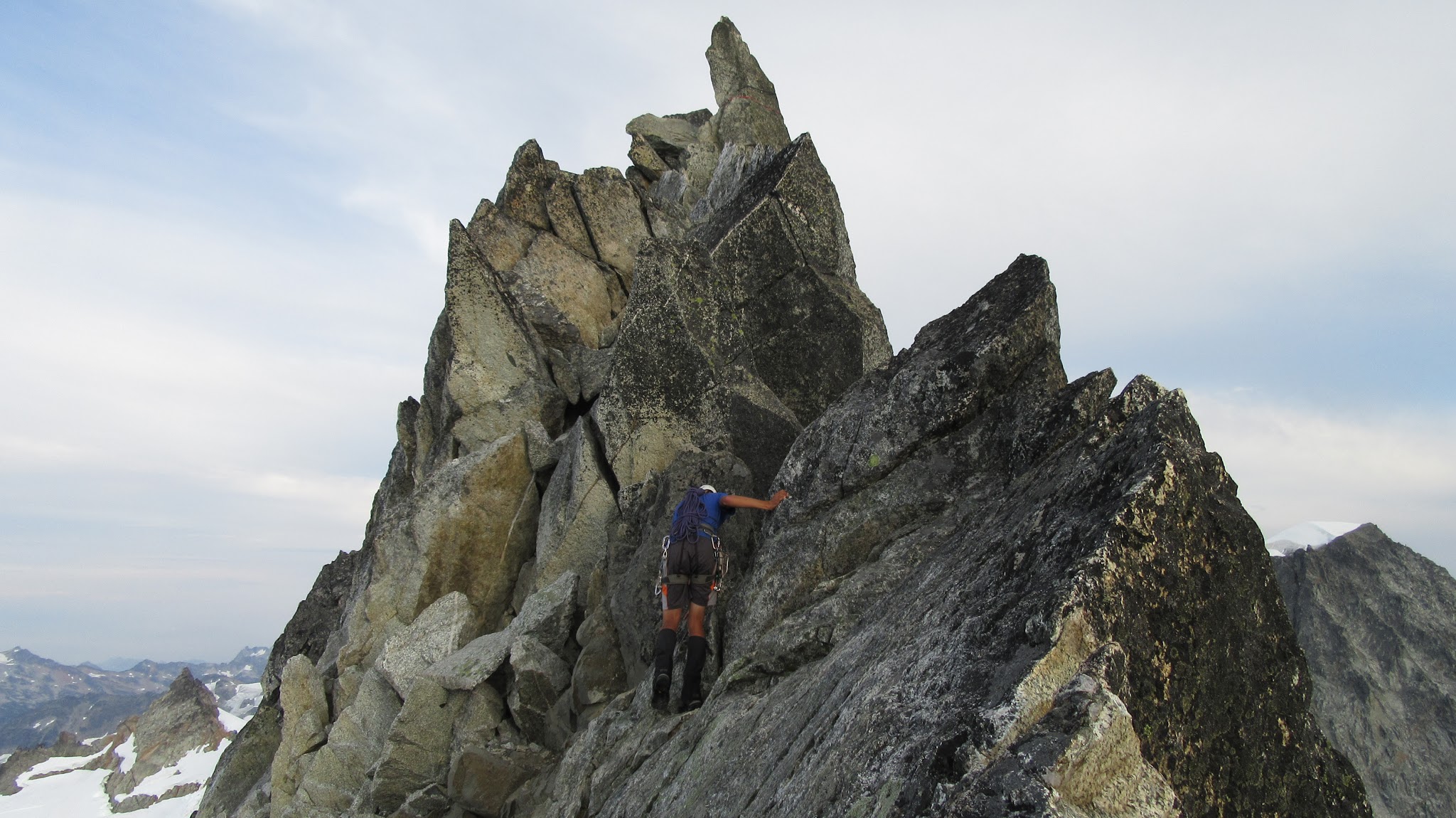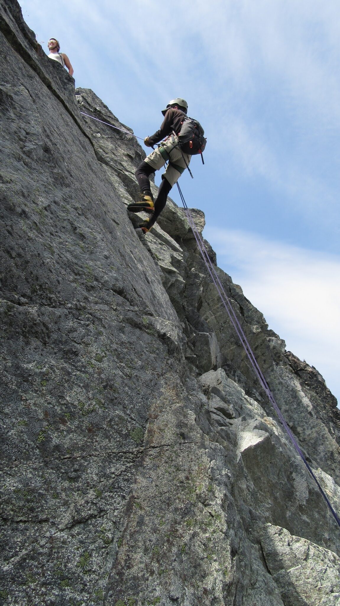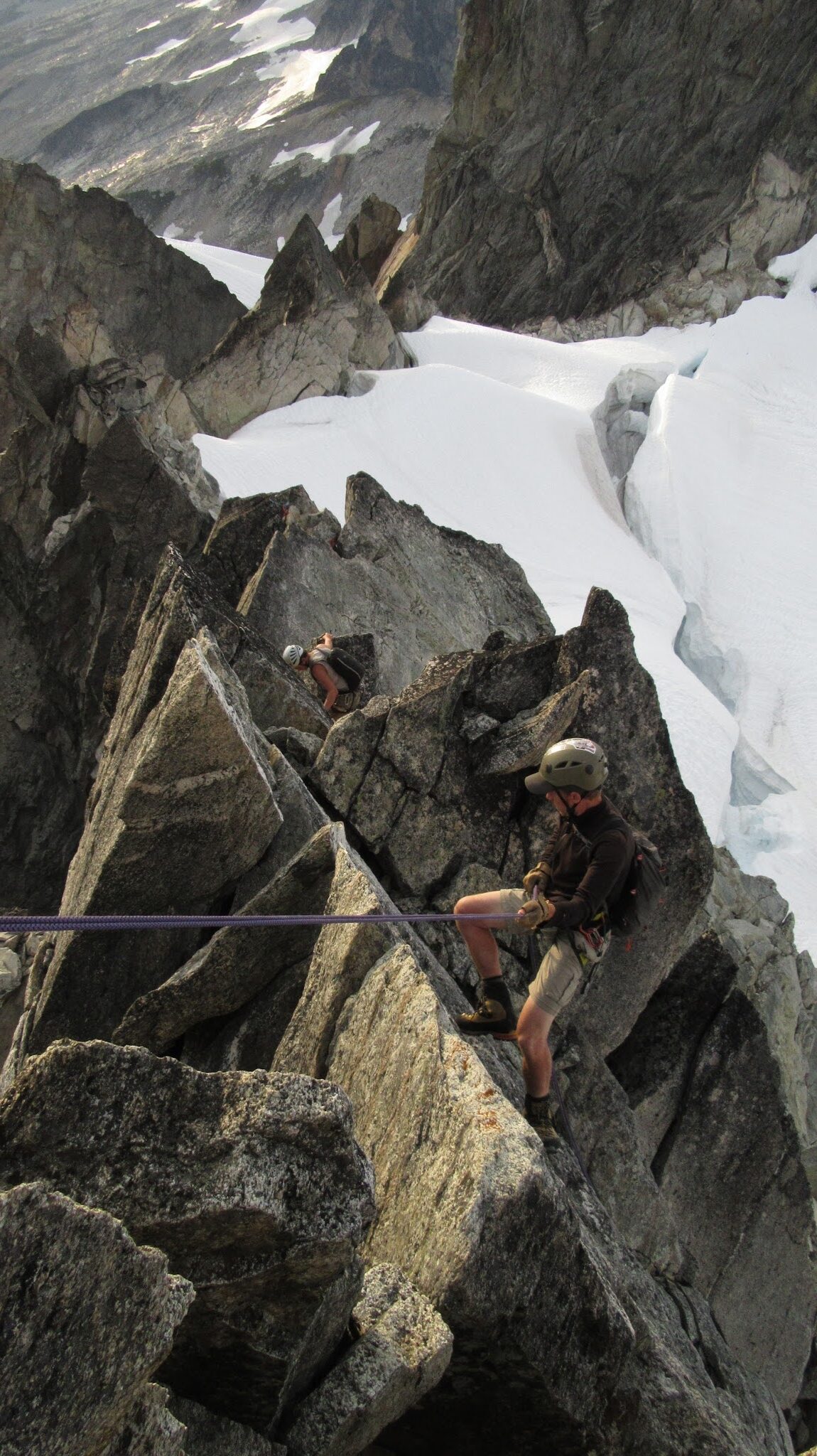 Once on the rock, we began climbing nice solid granite. I led a full 30 meter low 5th class pitch up mostly slabs but with enough cracks to offer good protection. This led me to the NW ridge, at which point we realized the exposure was huge! Our route description simply said follow the ridge over a couple knife edges to the summit. Here we unroped and all soloed the remainder of the ridge to the summit. There were indeed two knife edges to cross which got our adrenaline going!