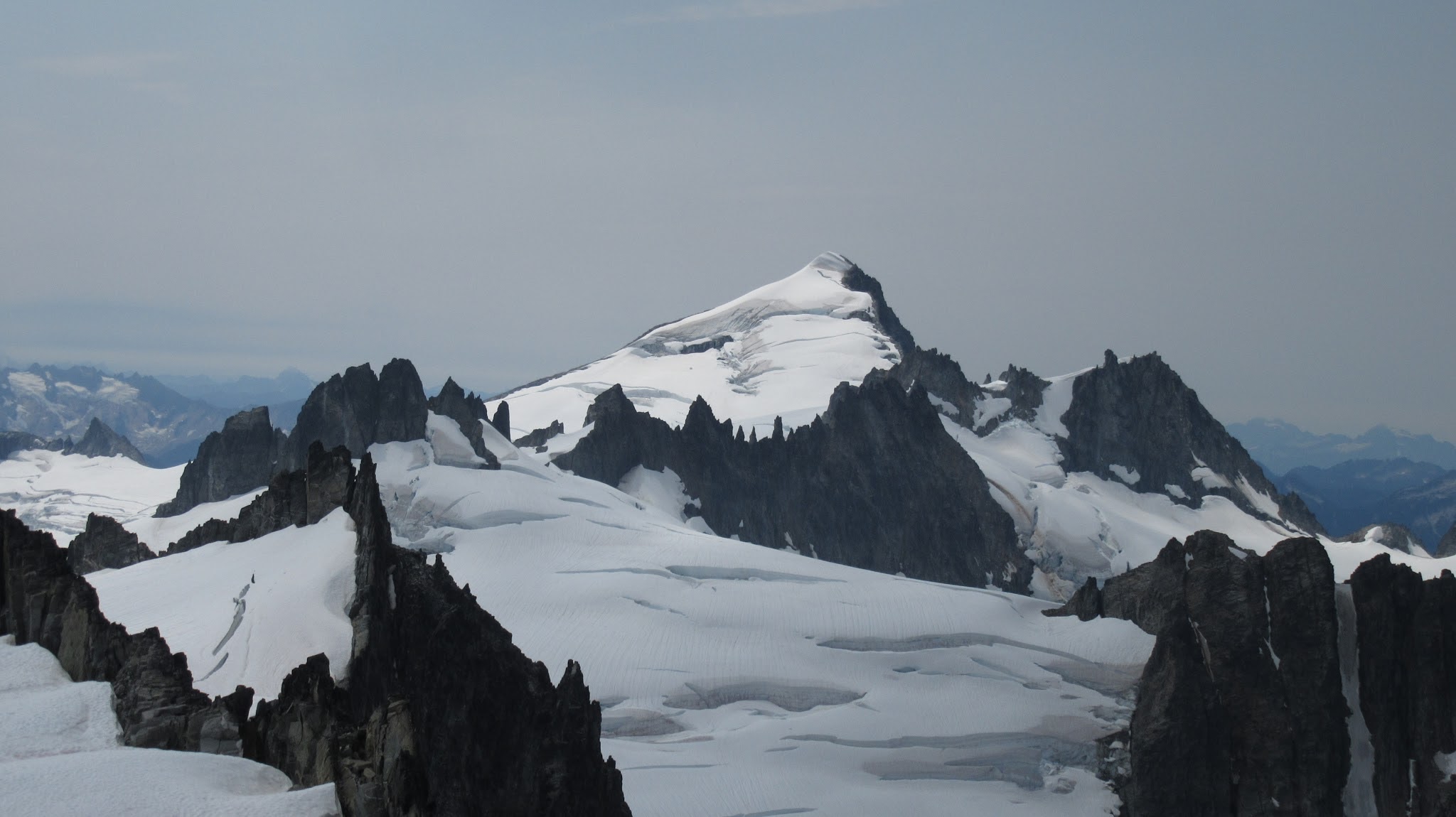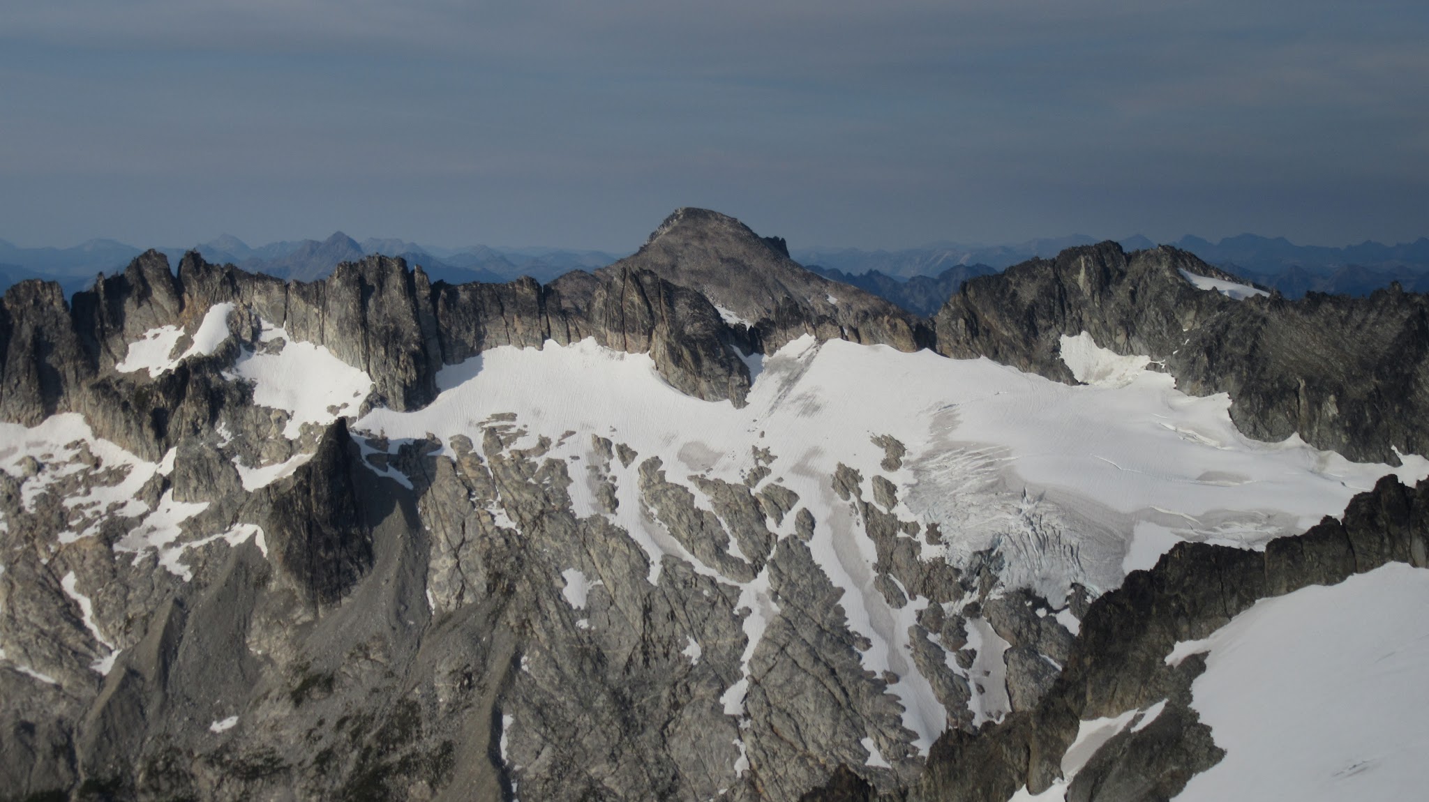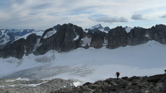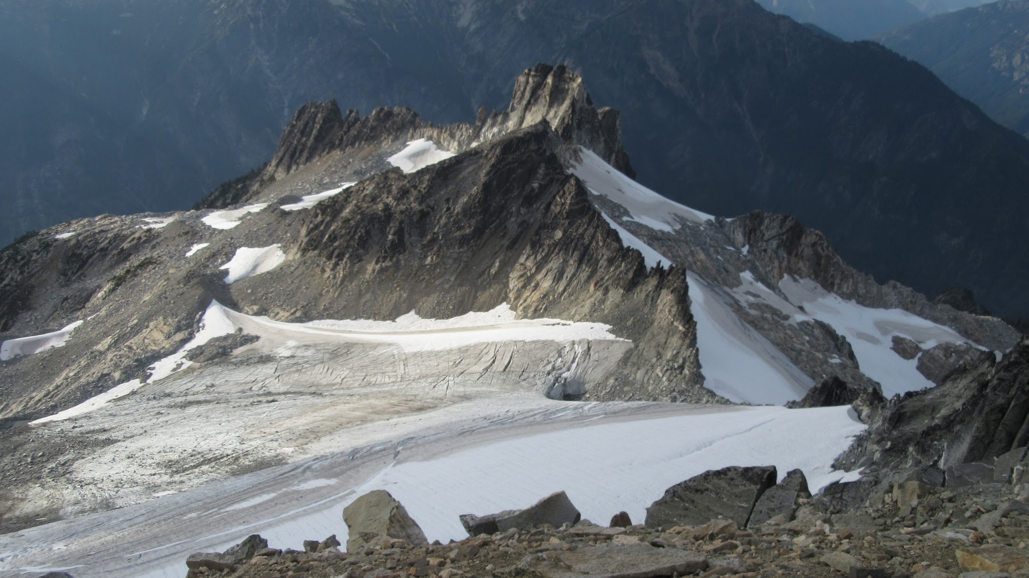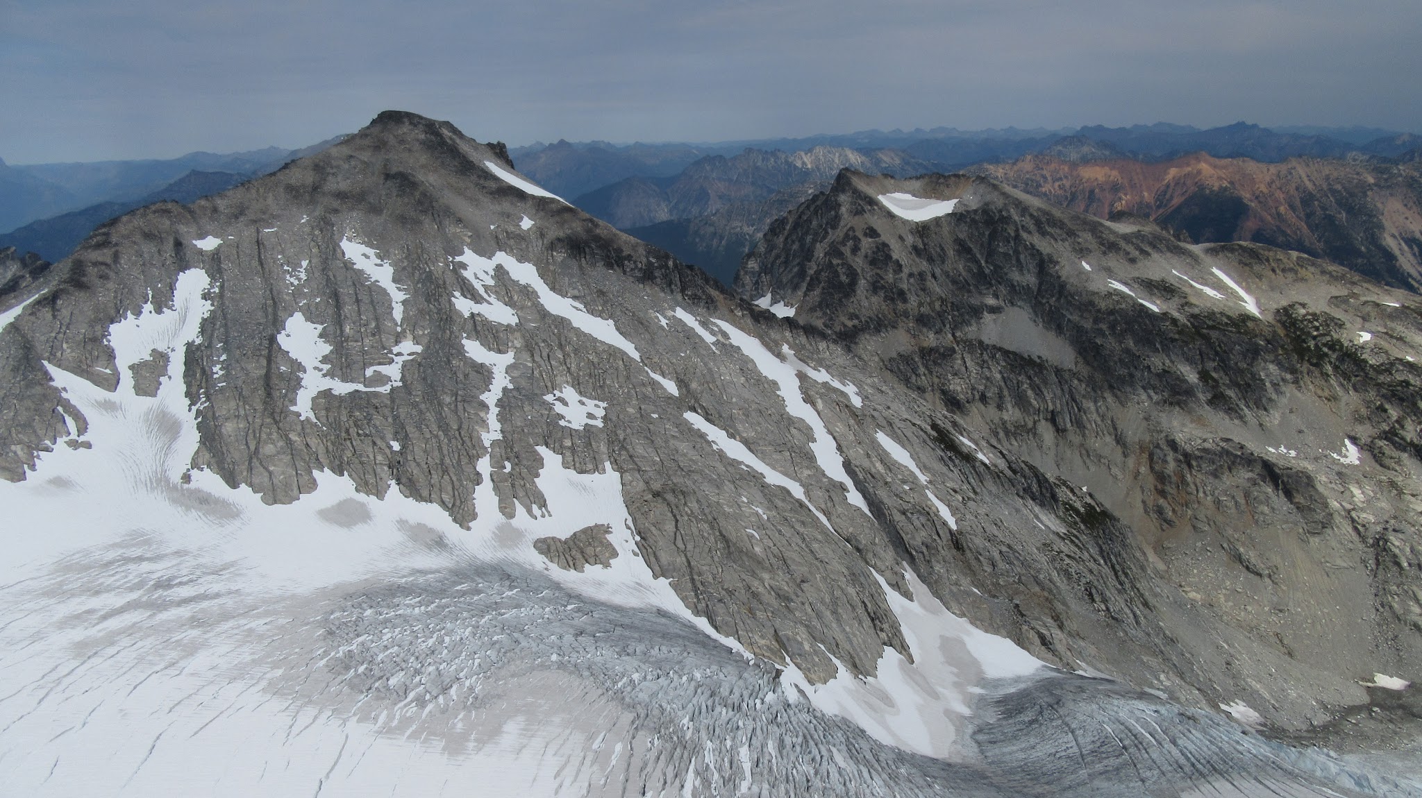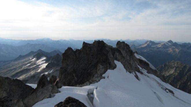 From this notch it was an easy hike up the gentle west ridge to the summit of Primus Peak. We left our packs at a second, smaller notch a few hundred feet higher, where I had heard of a route down onto the unnamed glacier on the NW side of Primus Peak. At the top, we had more awesome views of the North Cascades including Mount Logan, Ragged Ridge and the entire Inspiration Traverse we had done so far.