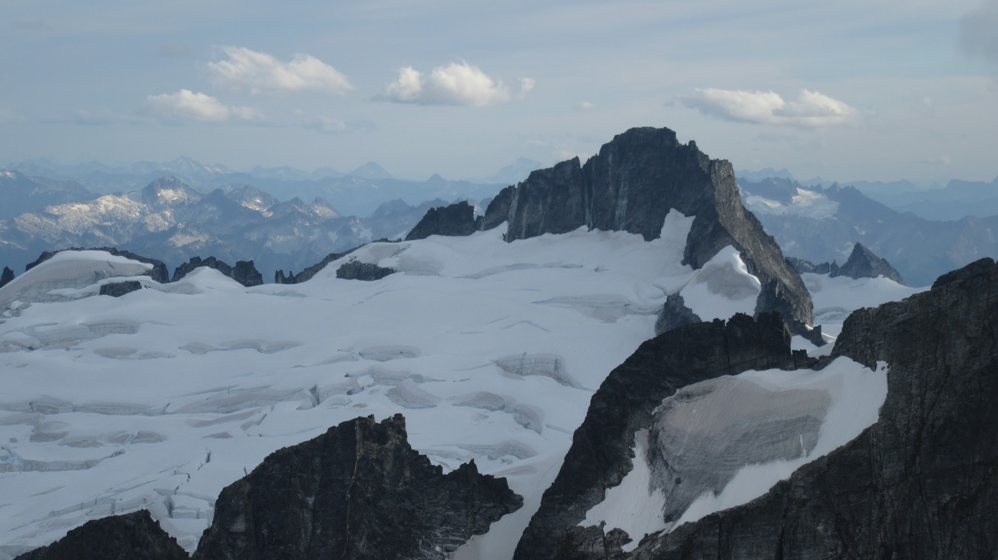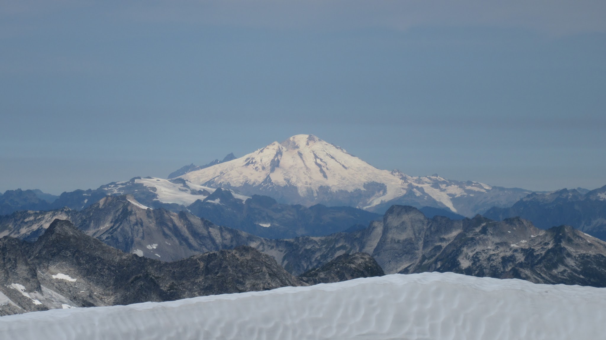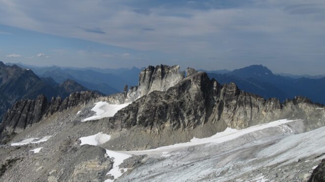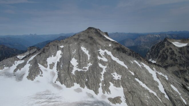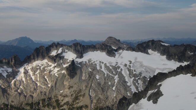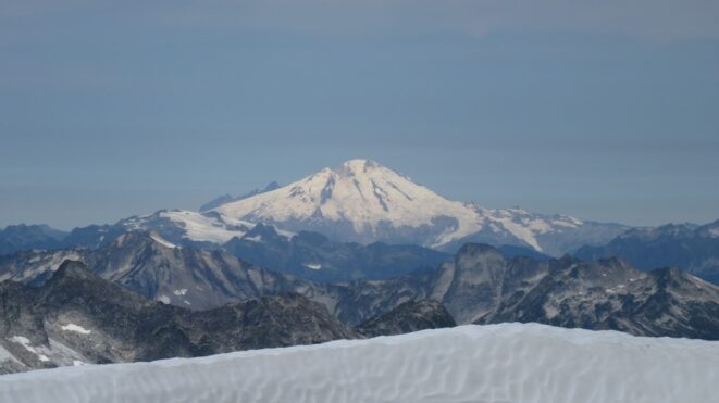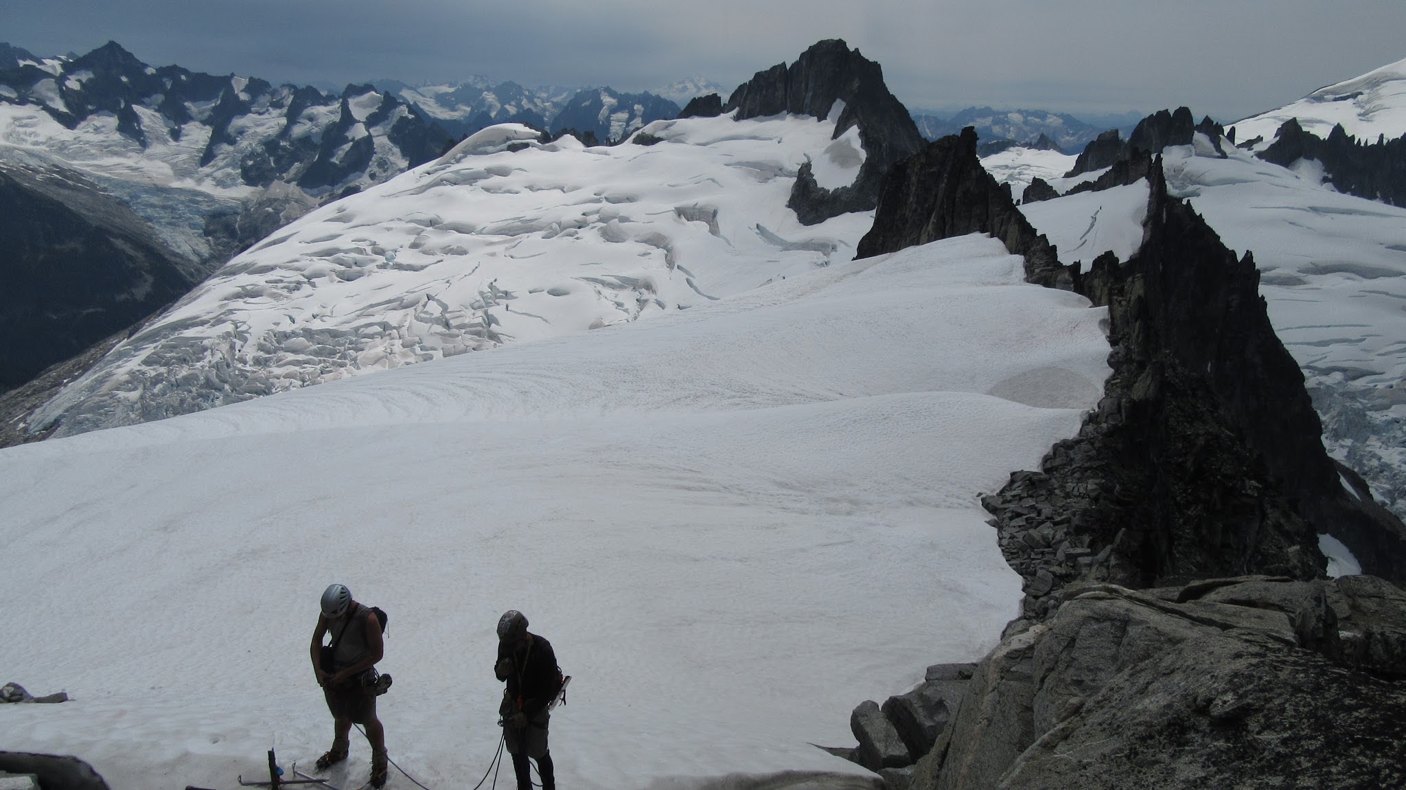From this notch it was an easy hike up the gentle west ridge to the summit of Primus Peak. We left our packs at a second, smaller notch a few hundred feet higher, where I had heard of a route down onto the unnamed glacier on the NW side of Primus Peak. At the top, we had more awesome views of the North Cascades including Mount Logan, Ragged Ridge and the entire Inspiration Traverse we had done so far.