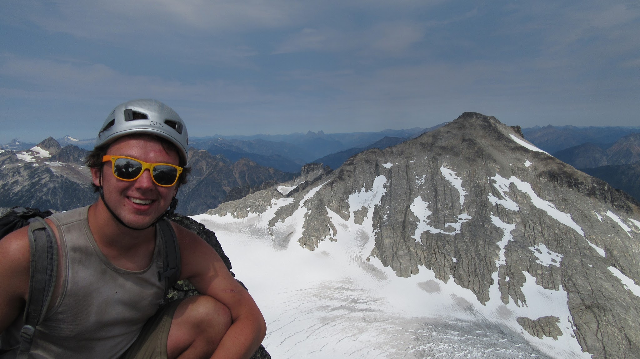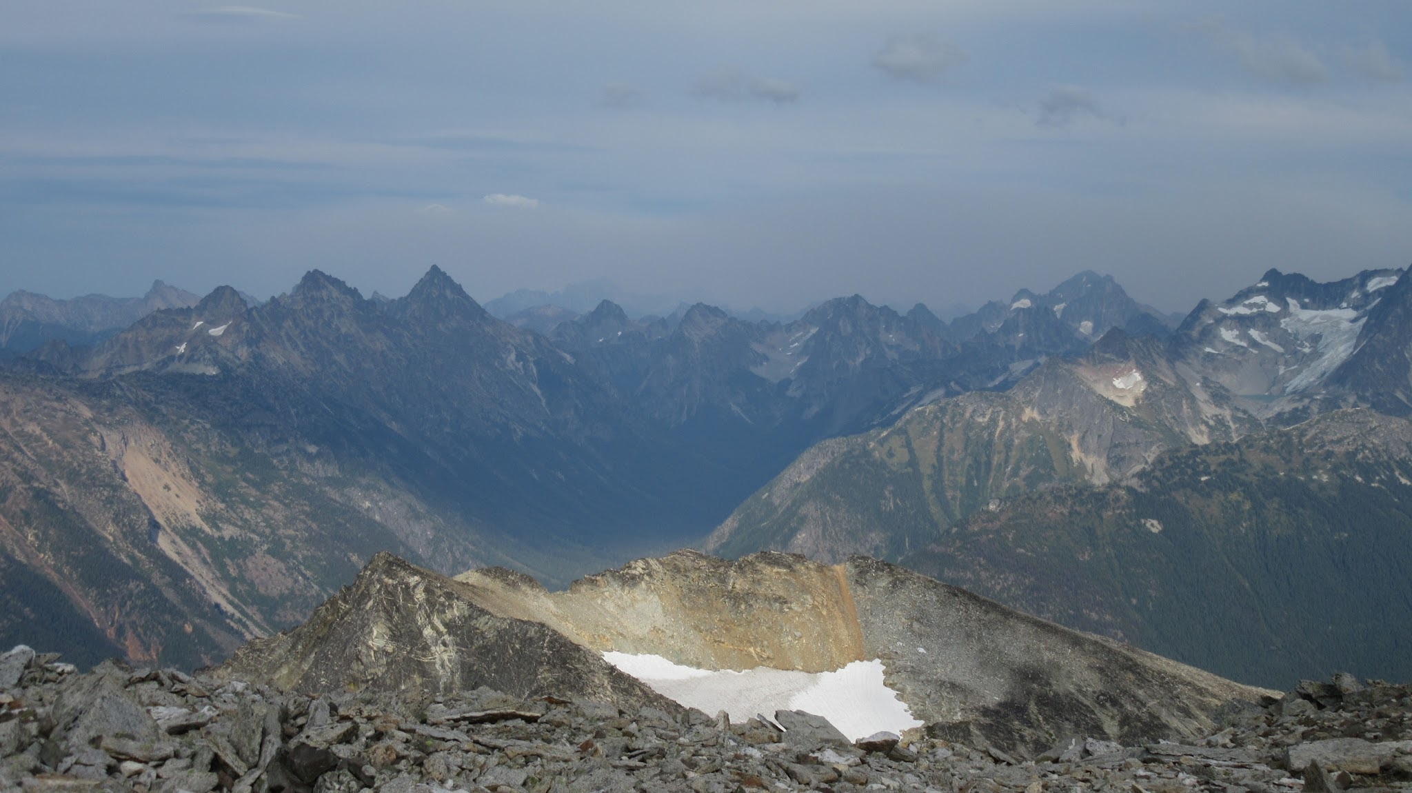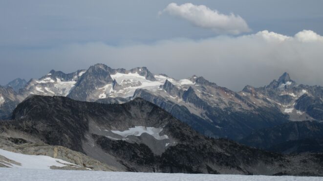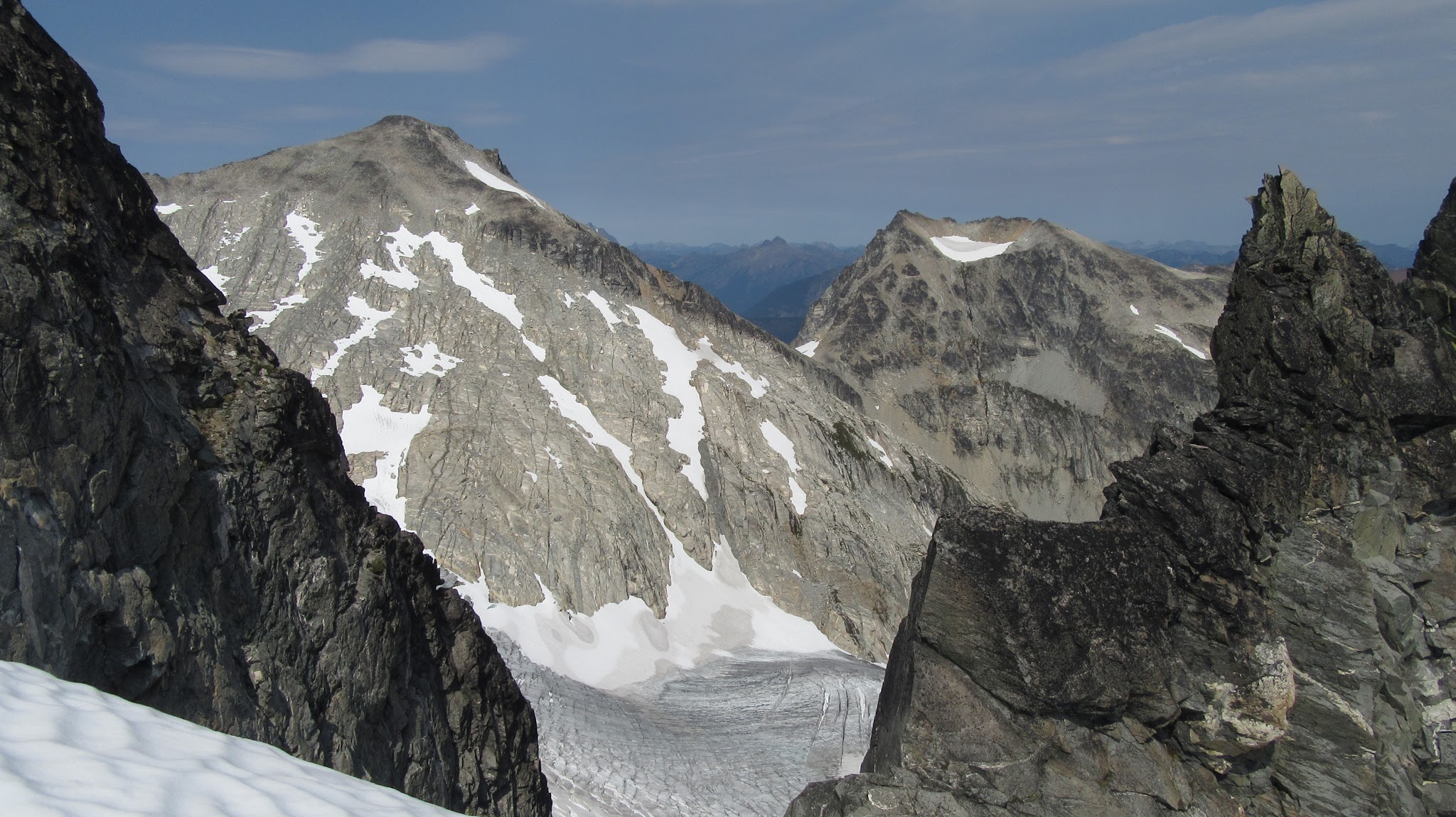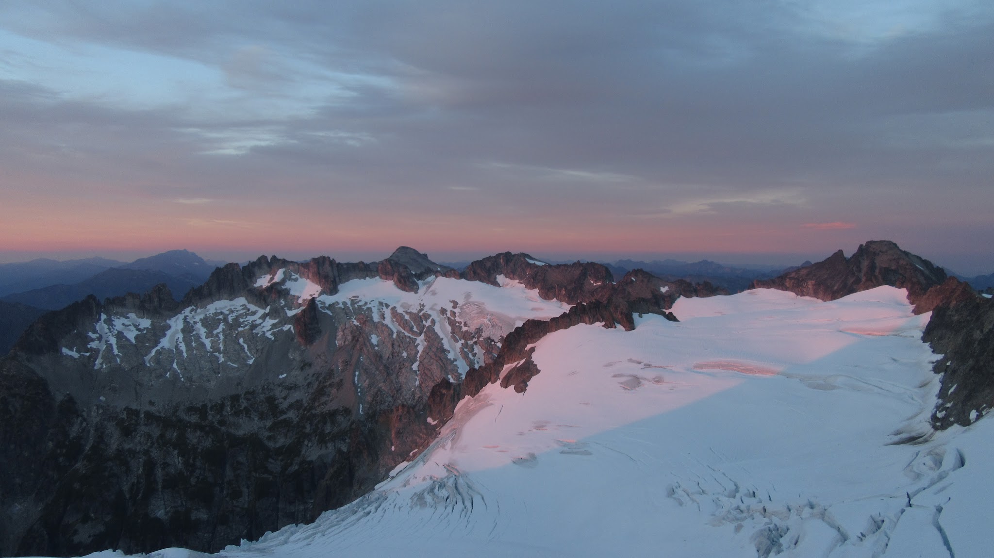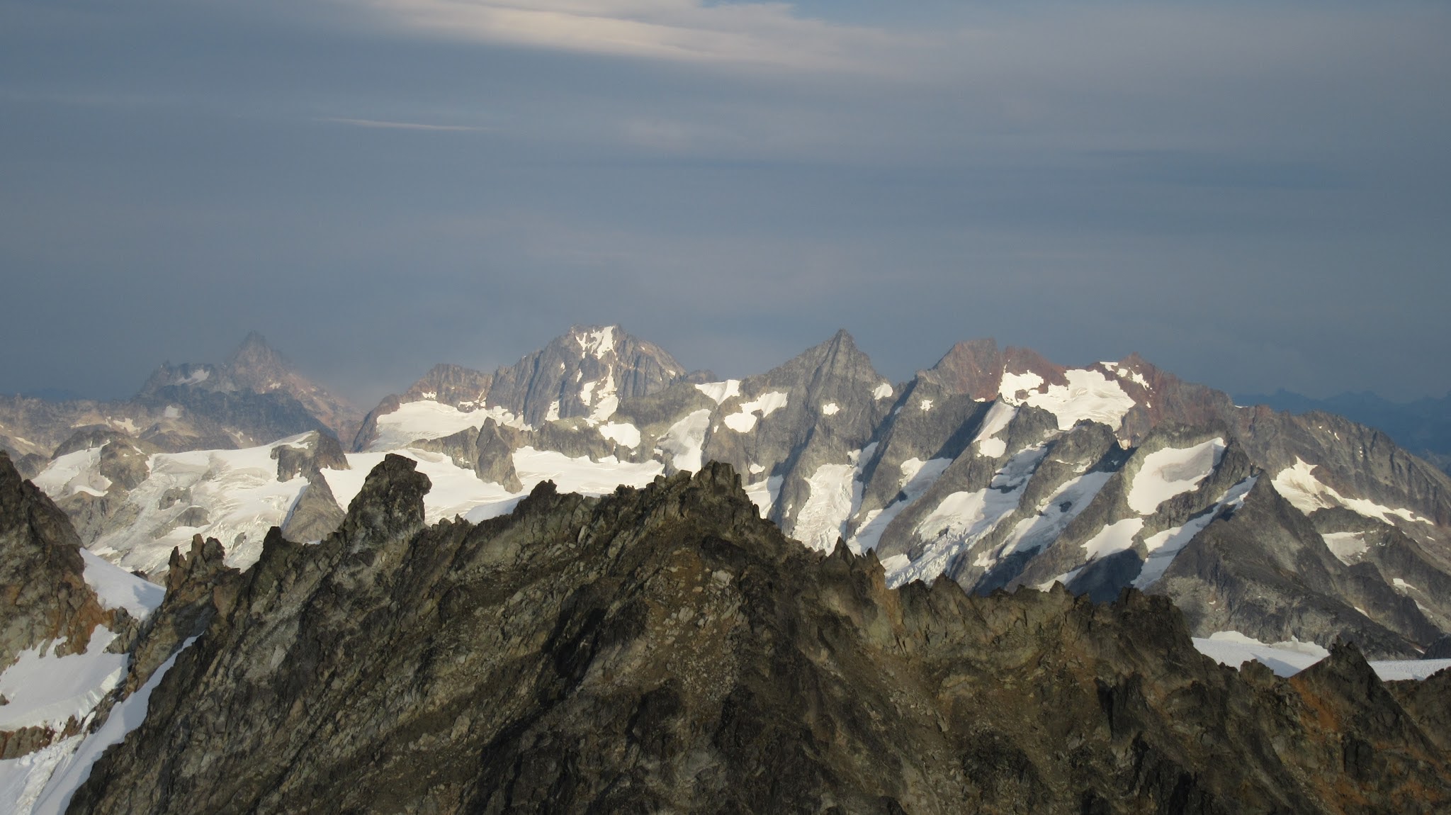 From this notch it was an easy hike up the gentle west ridge to the summit of Primus Peak. We left our packs at a second, smaller notch a few hundred feet higher, where I had heard of a route down onto the unnamed glacier on the NW side of Primus Peak. At the top, we had more awesome views of the North Cascades including Mount Logan, Ragged Ridge and the entire Inspiration Traverse we had done so far.