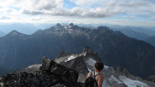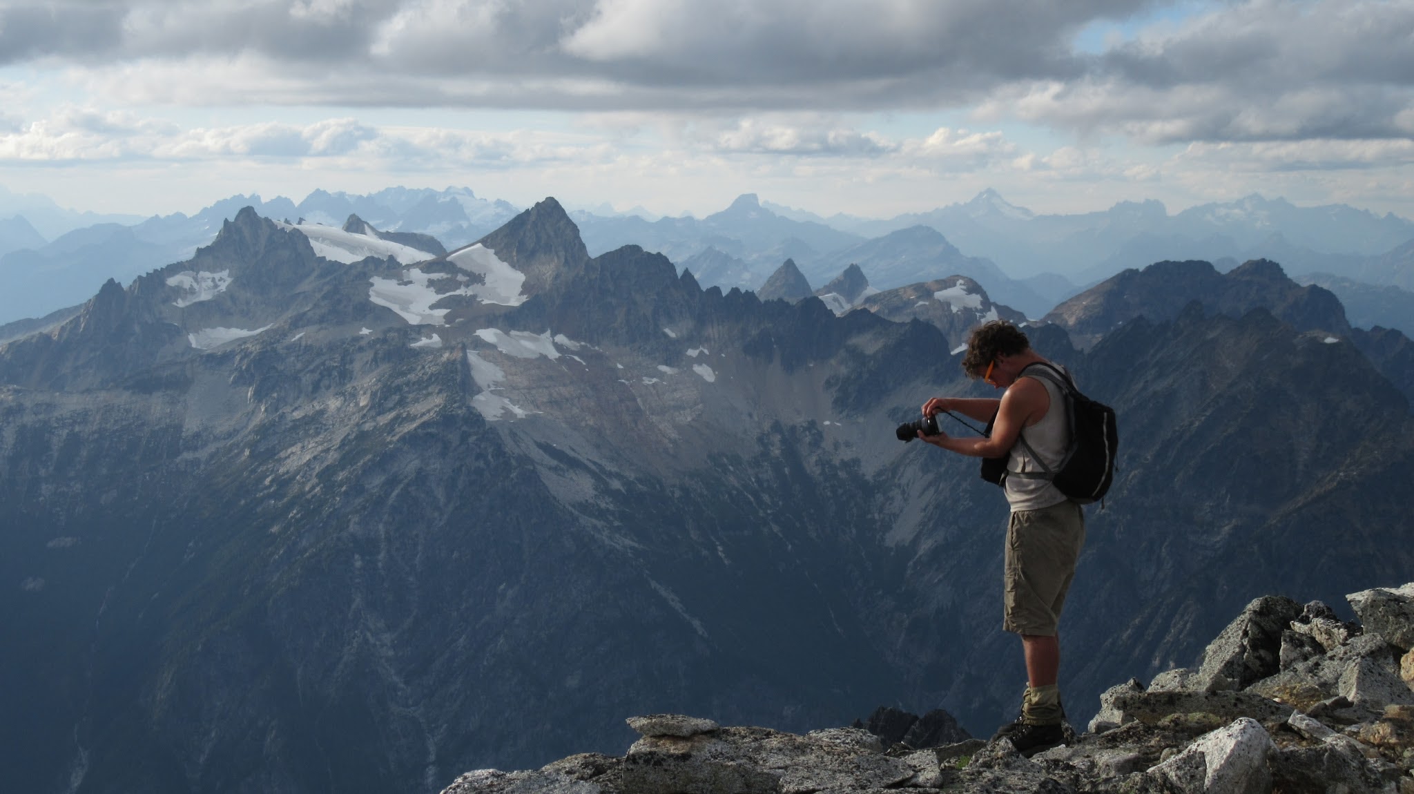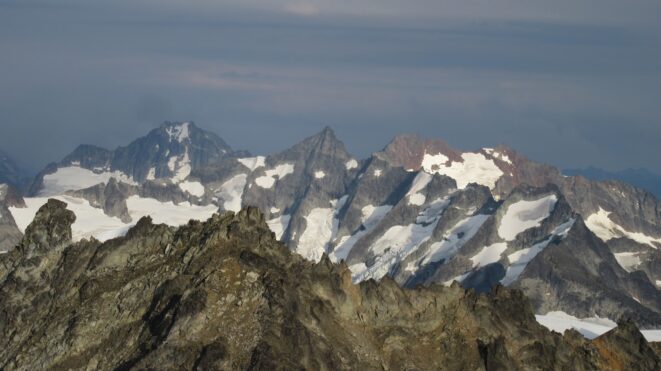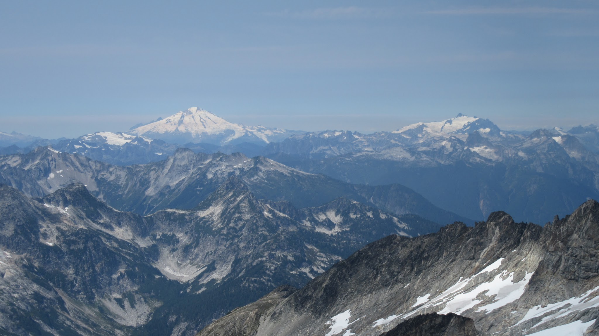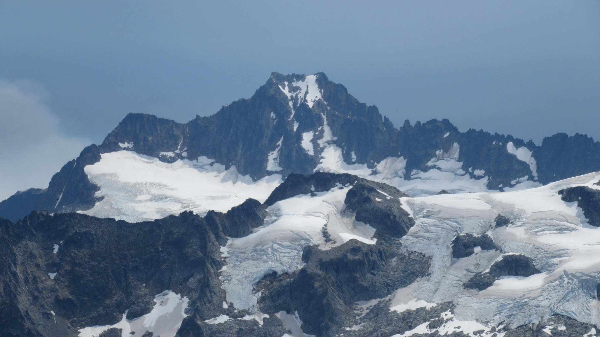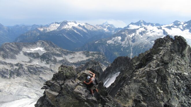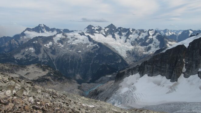 From this notch it was an easy hike up the gentle west ridge to the summit of Primus Peak. We left our packs at a second, smaller notch a few hundred feet higher, where I had heard of a route down onto the unnamed glacier on the NW side of Primus Peak. At the top, we had more awesome views of the North Cascades including Mount Logan, Ragged Ridge and the entire Inspiration Traverse we had done so far.