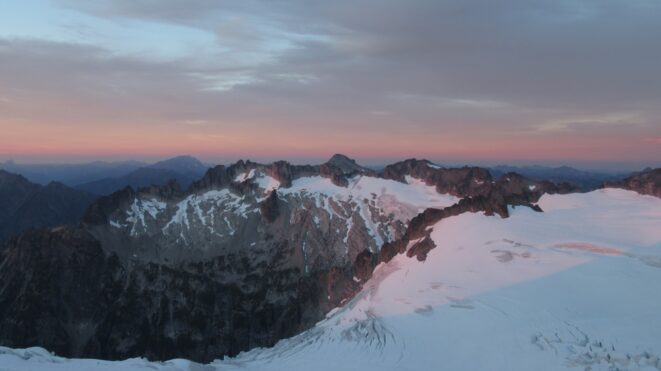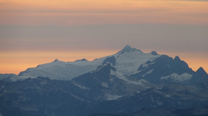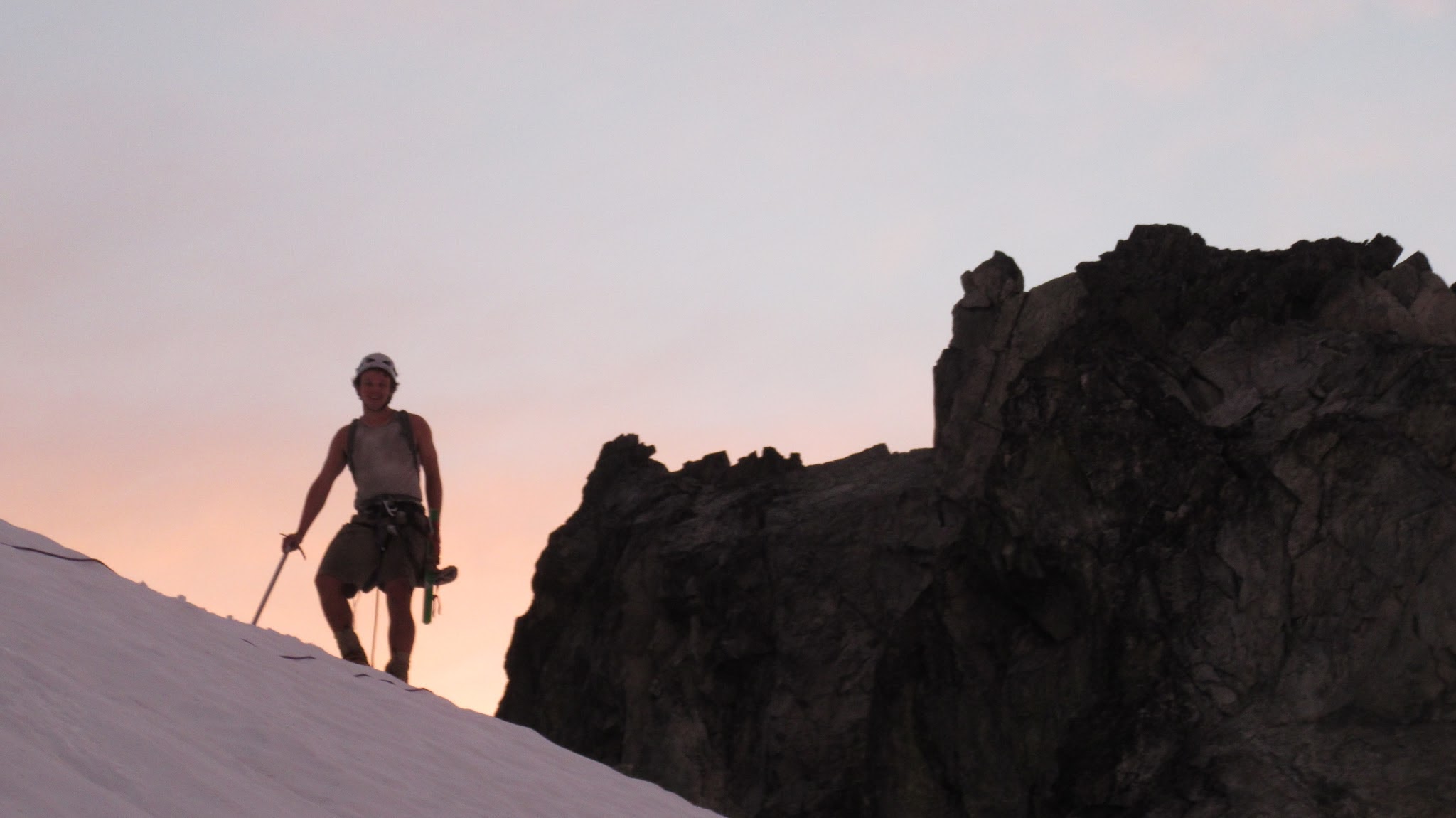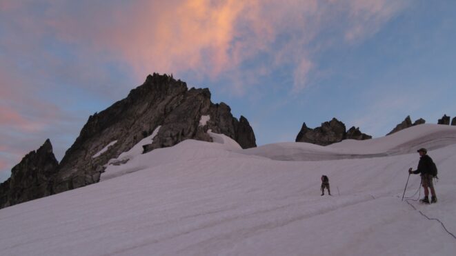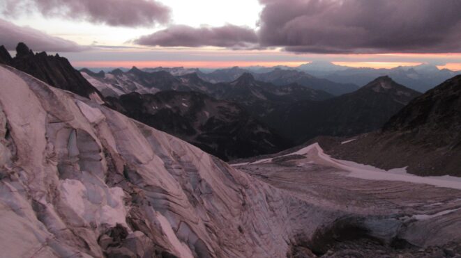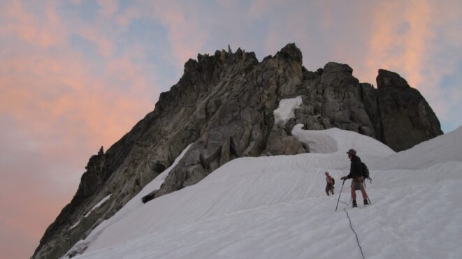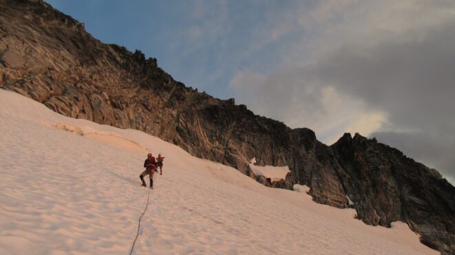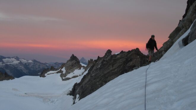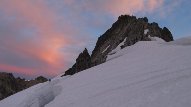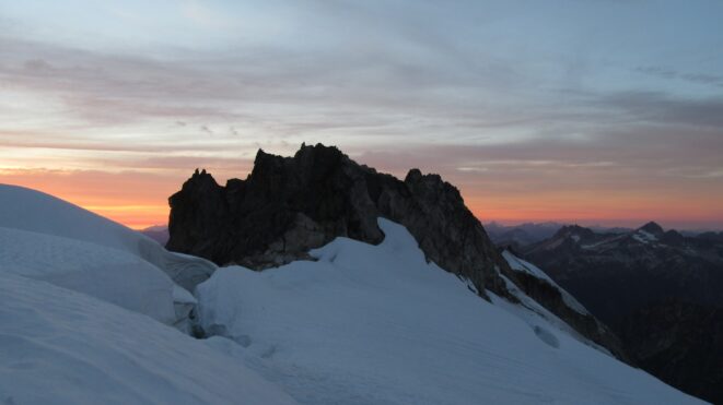 Once on the summit, which was barely big enough for the 3 of us, we saw the west face of Eldorado up close and I remember wondering where the west face route goes. All the North Cascade peaks were visible and the sun was getting low in the sky, offering excellent lighting. After some summit photos, we started down. We made a few rappels to more safely descent, including a swinging rappel to get back across the knife edge ridge. Just as the sun was setting we reached the moat where we grabbed our stashed gear and started down the glacier.