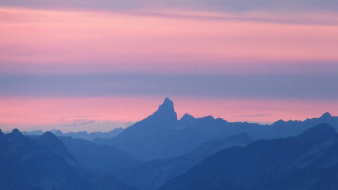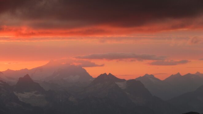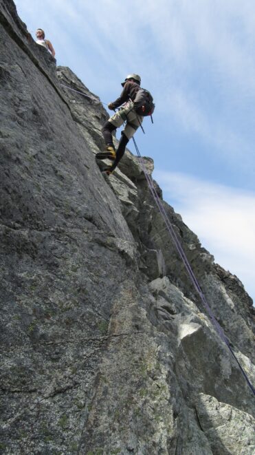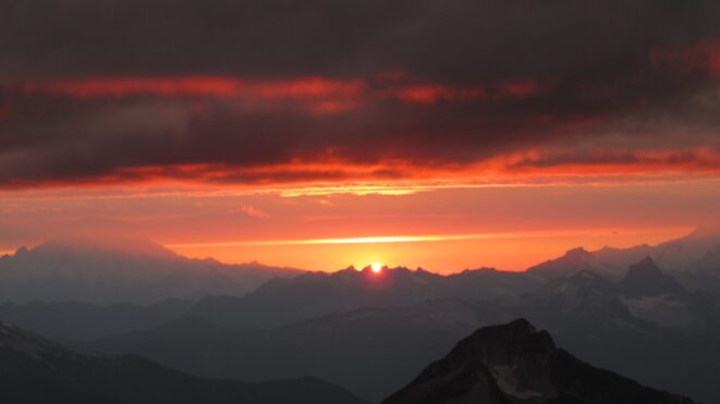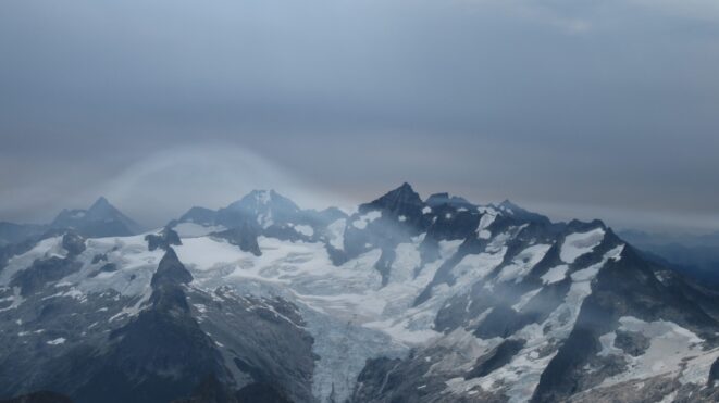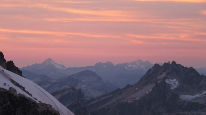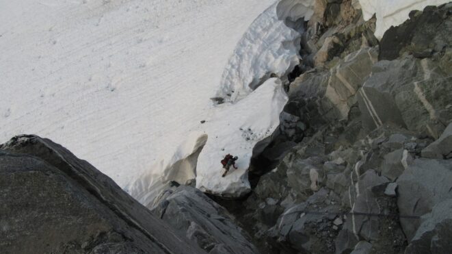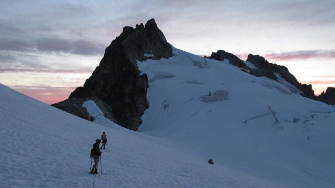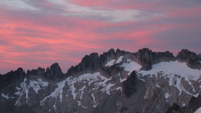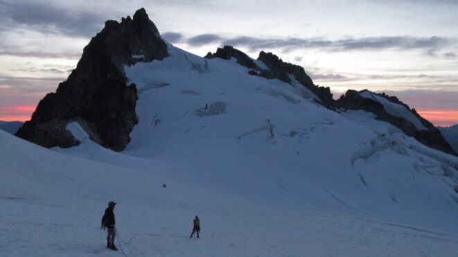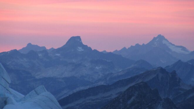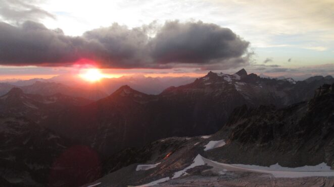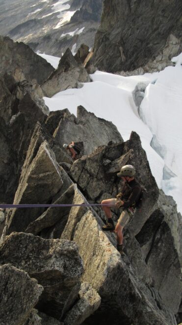 Once on the summit, which was barely big enough for the 3 of us, we saw the west face of Eldorado up close and I remember wondering where the west face route goes. All the North Cascade peaks were visible and the sun was getting low in the sky, offering excellent lighting. After some summit photos, we started down. We made a few rappels to more safely descent, including a swinging rappel to get back across the knife edge ridge. Just as the sun was setting we reached the moat where we grabbed our stashed gear and started down the glacier.