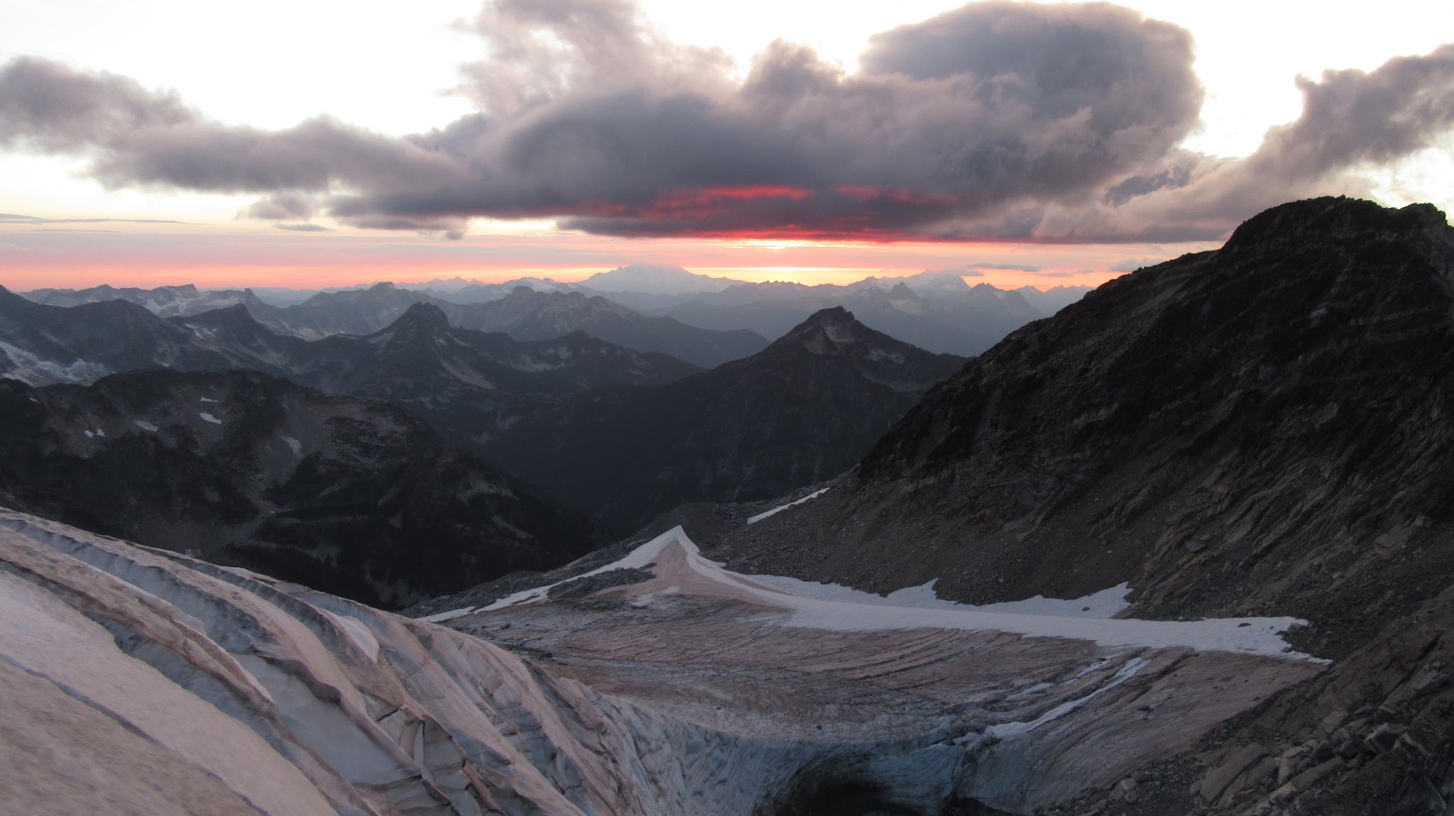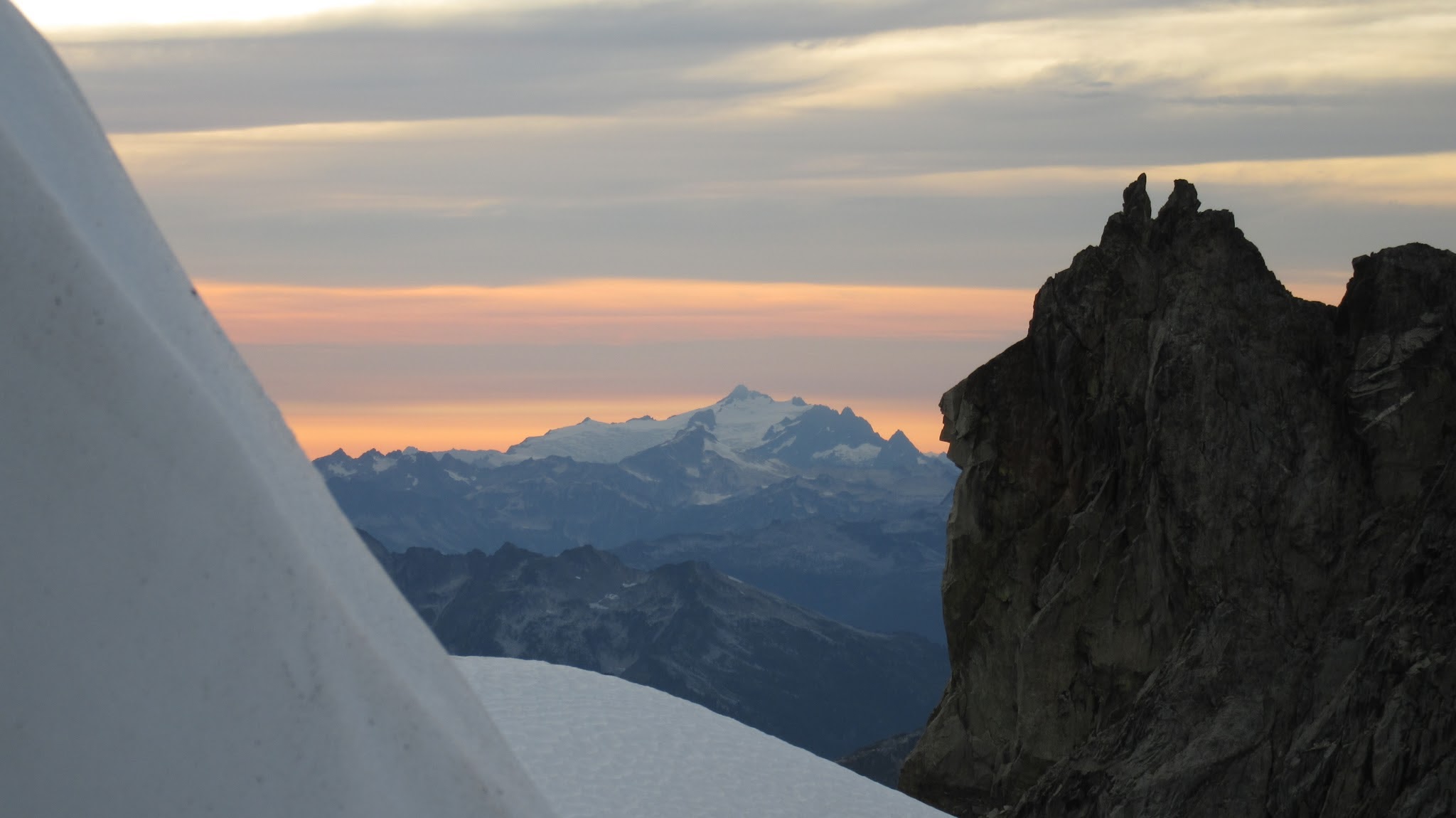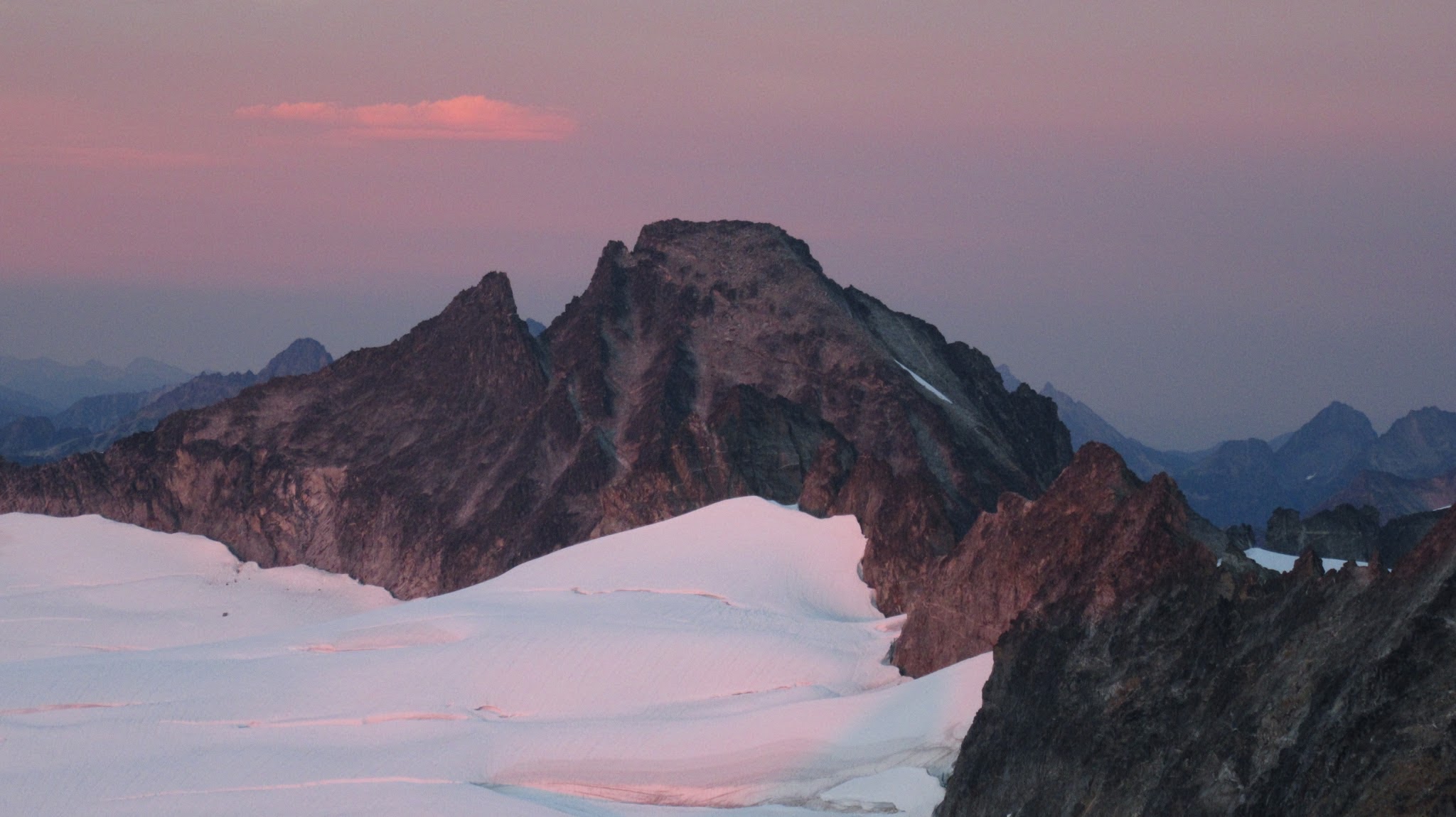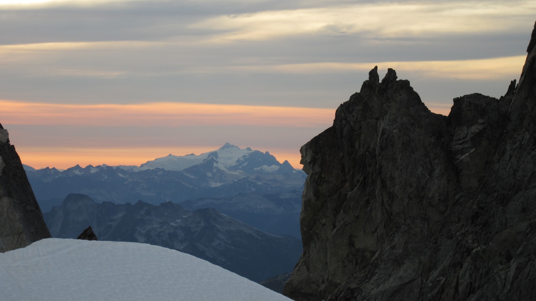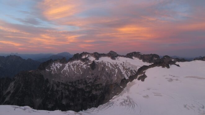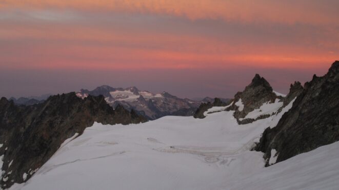 Finally, at just under 8,000 feet, we reached the small glacier where it was a short jog down to the 7,500 foot notch in the north ridge of Primus Peak where I had been back in October 2012 on my last Primus attempt. At this point we were awarded another fantastic sunset and in between taking lots of photos, I started thinking of places we would be able to camp because I knew we would not make it to the bivy site by Borelis Lake.