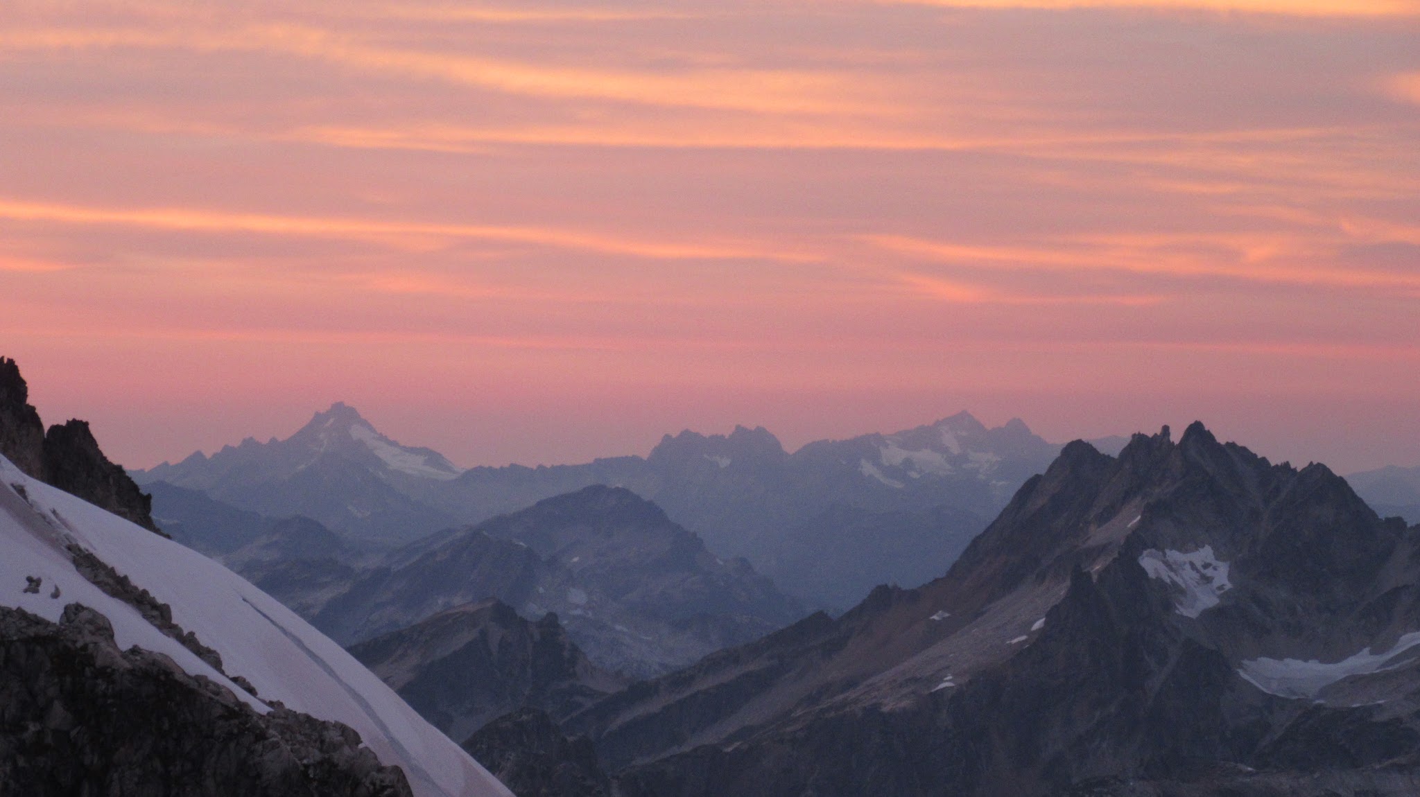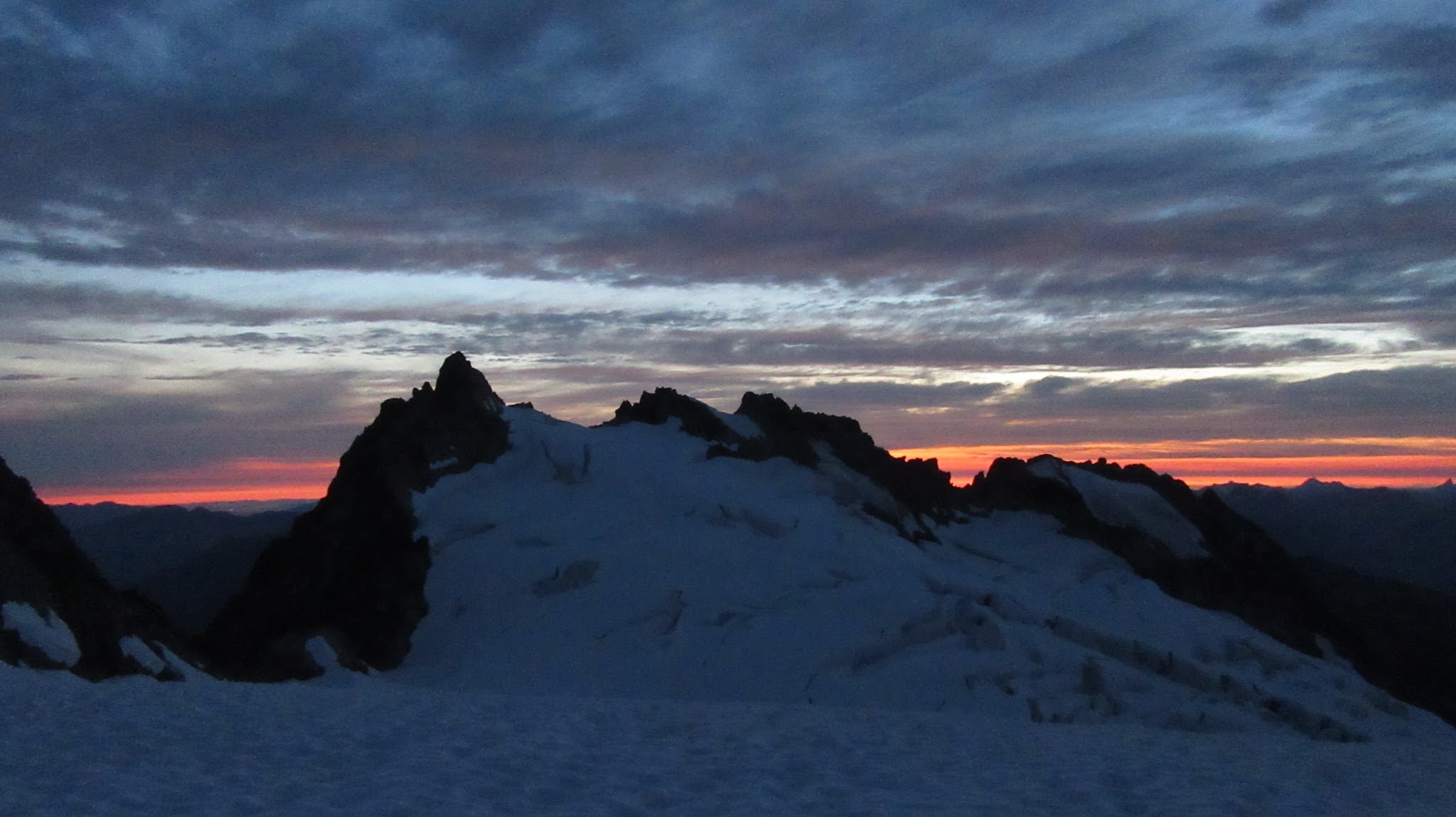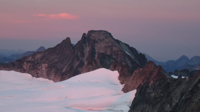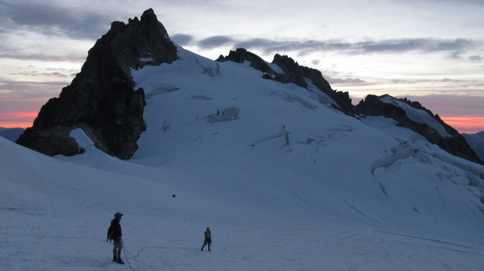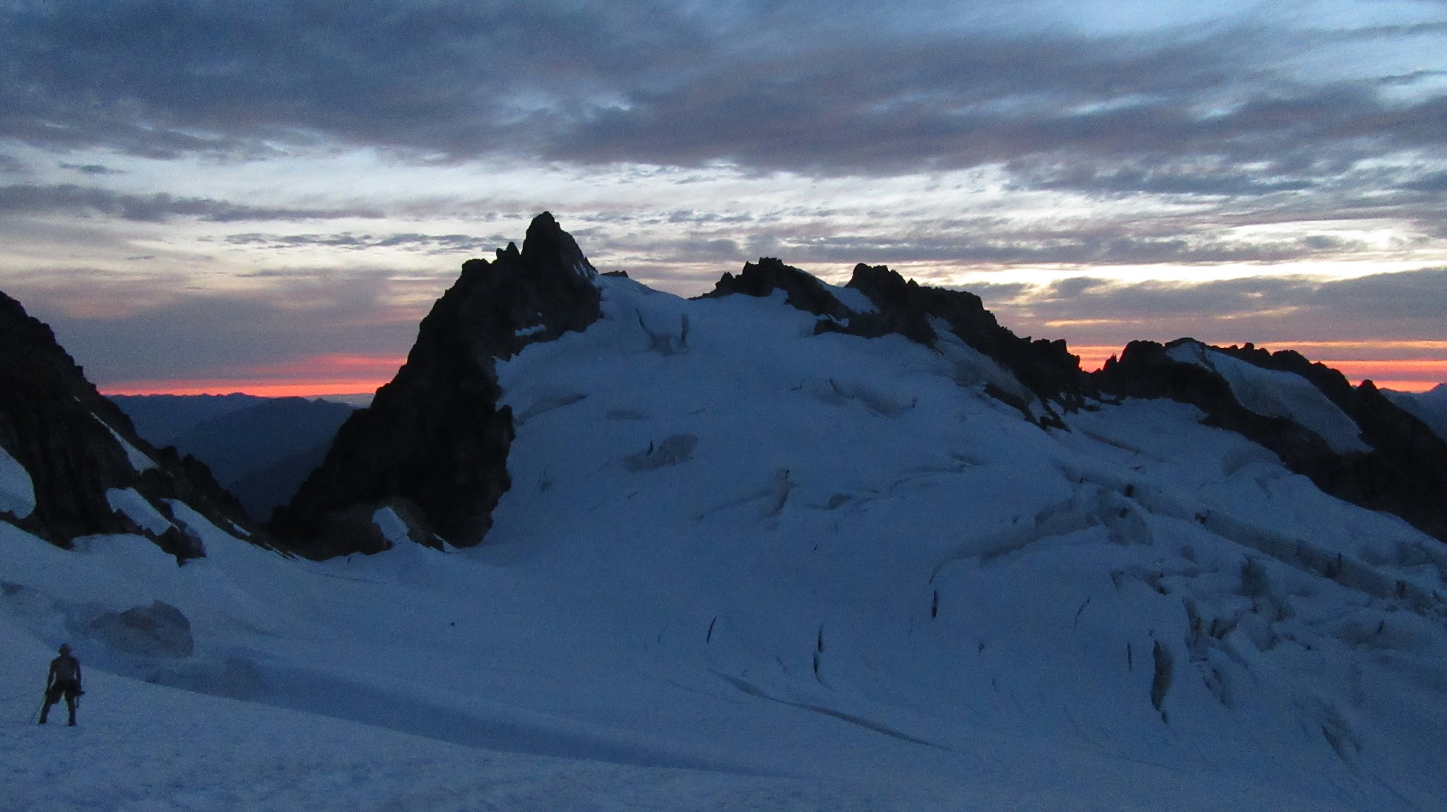 Finally, at just under 8,000 feet, we reached the small glacier where it was a short jog down to the 7,500 foot notch in the north ridge of Primus Peak where I had been back in October 2012 on my last Primus attempt. At this point we were awarded another fantastic sunset and in between taking lots of photos, I started thinking of places we would be able to camp because I knew we would not make it to the bivy site by Borelis Lake.