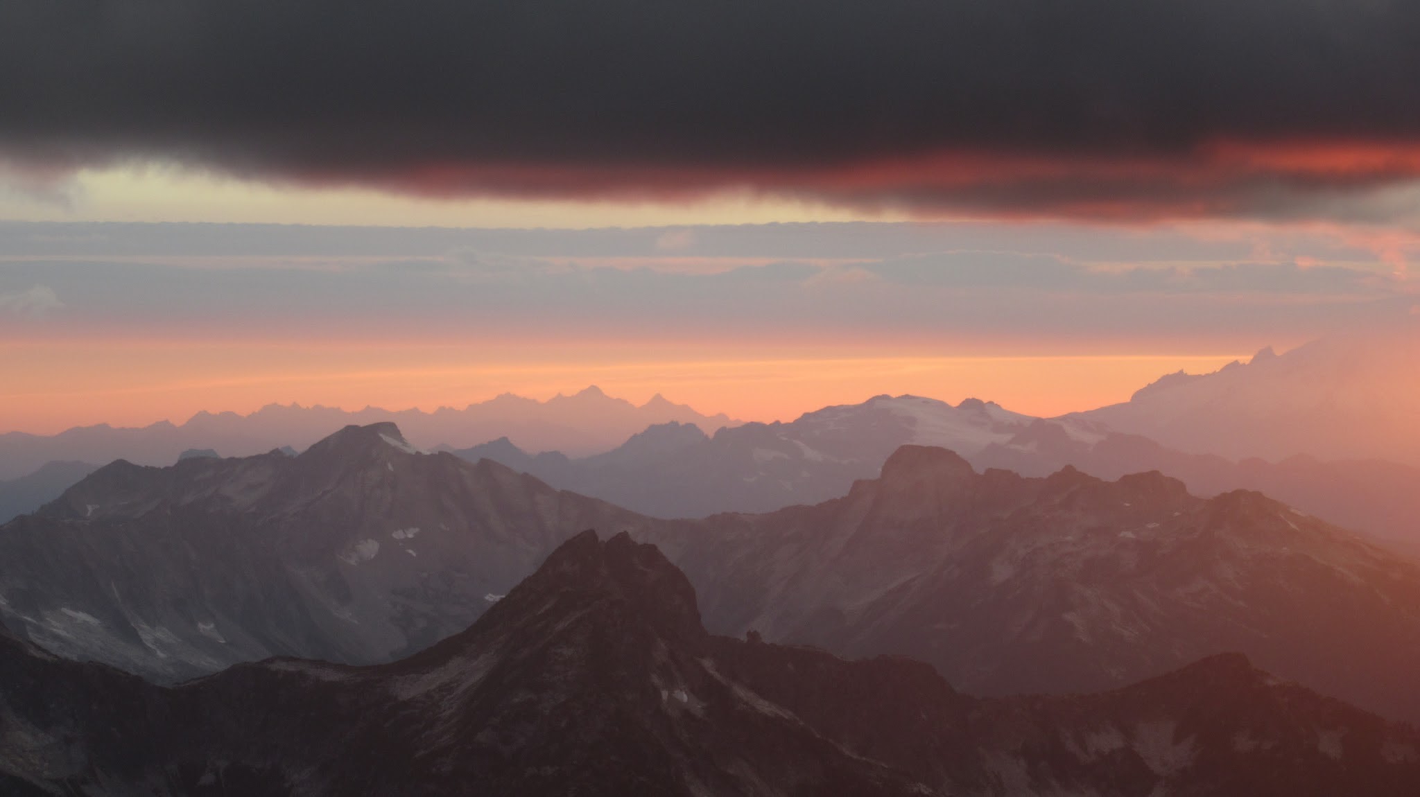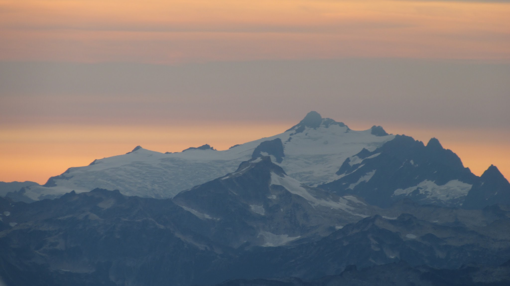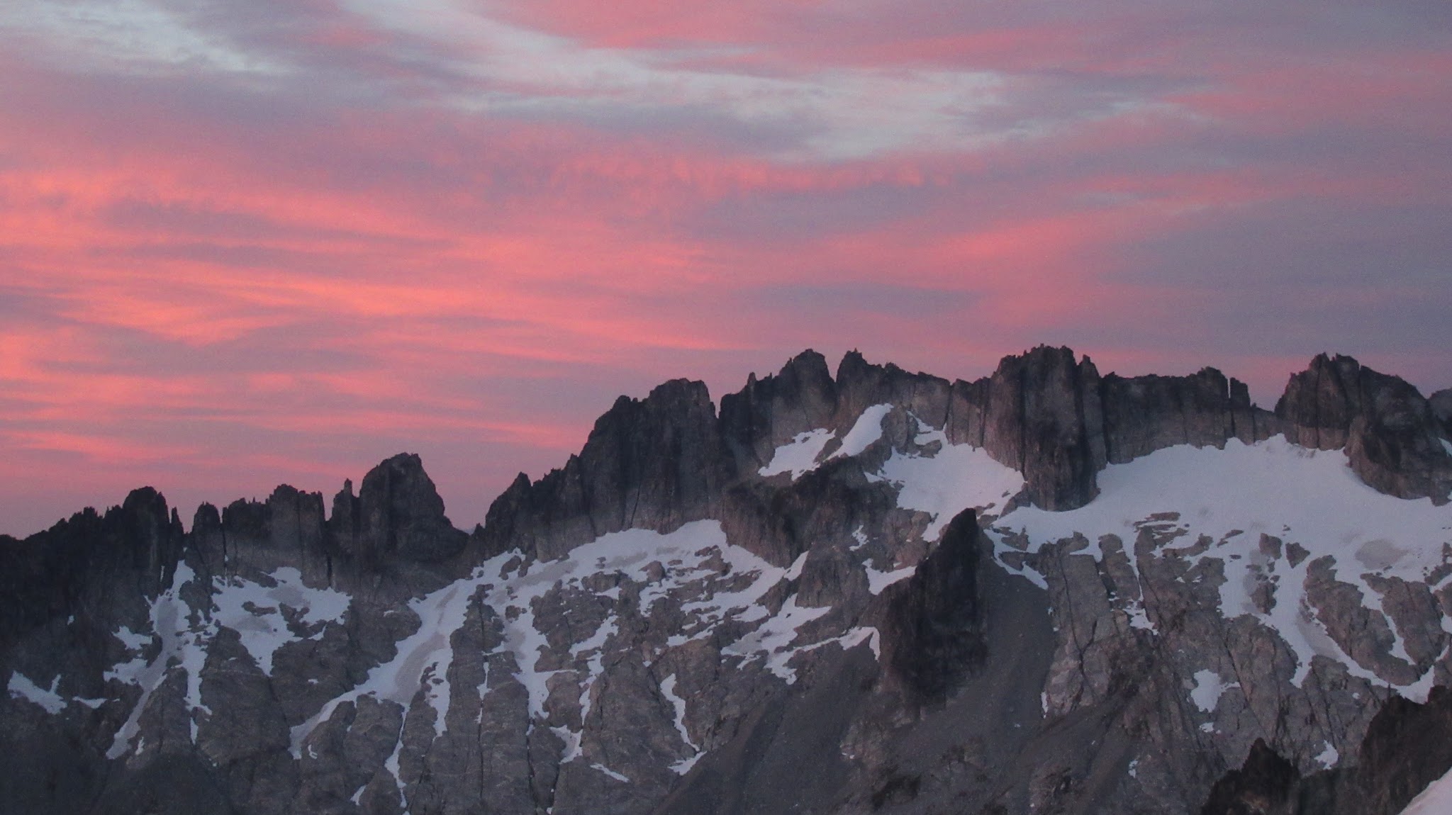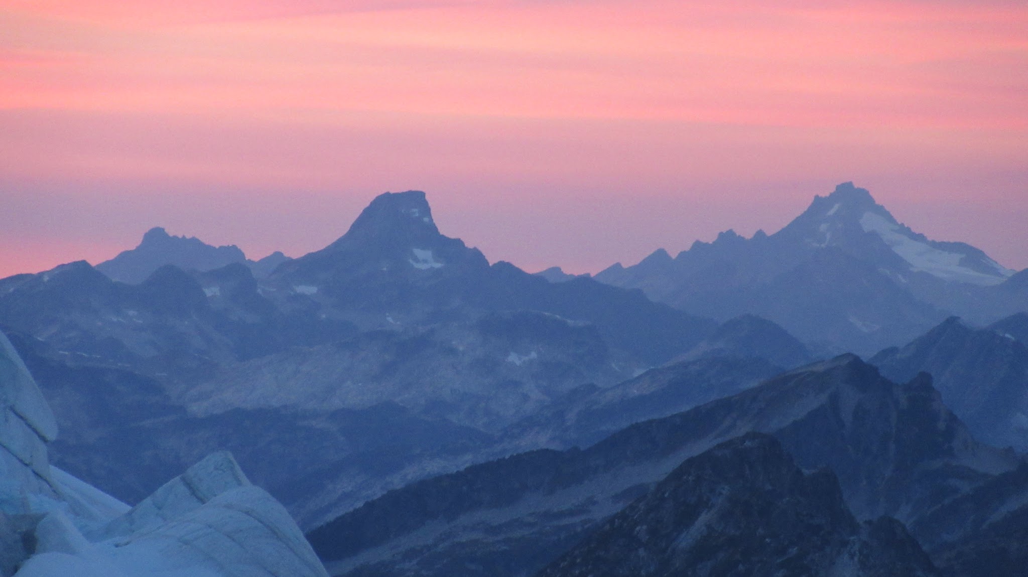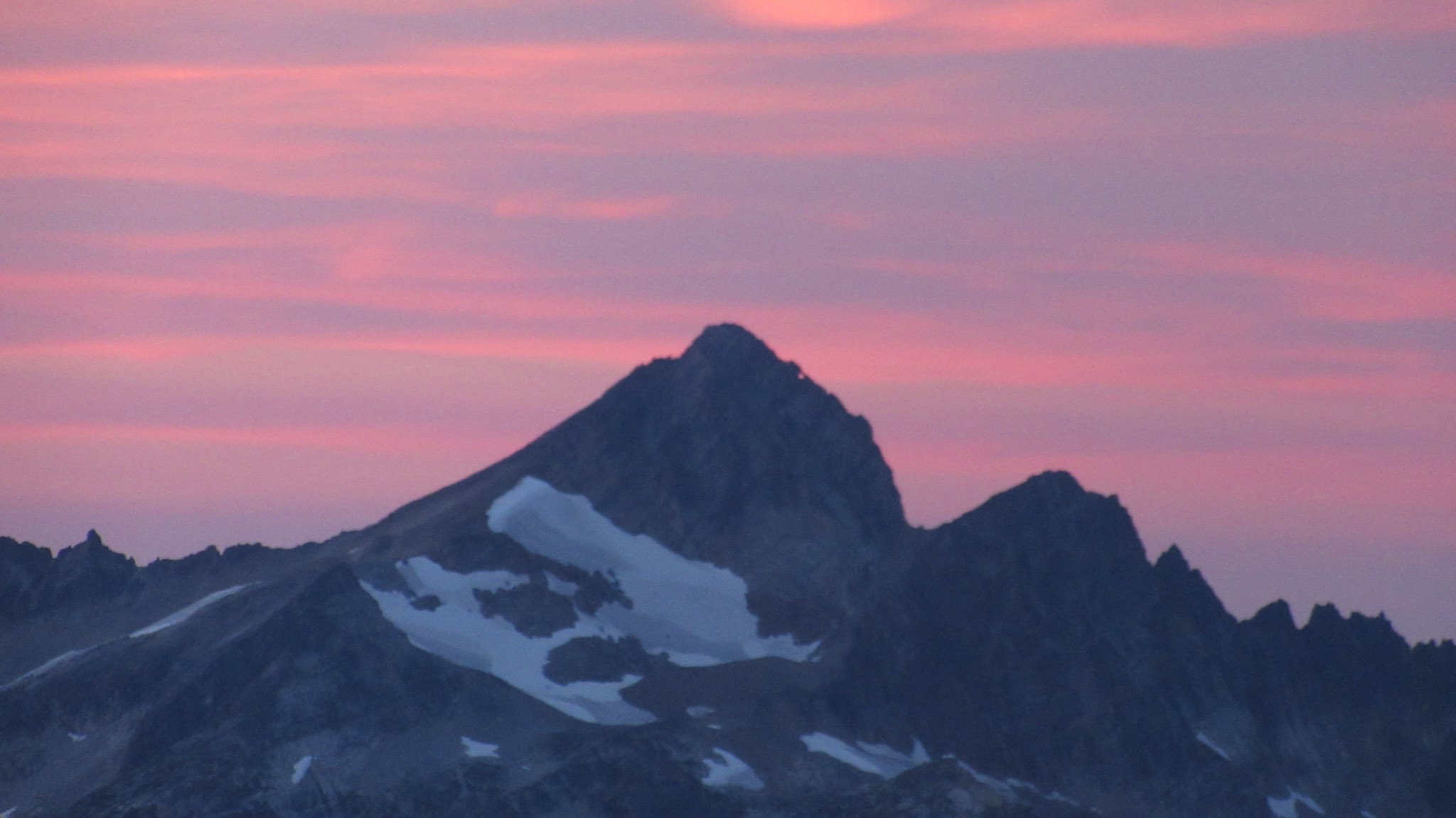 Finally, at just under 8,000 feet, we reached the small glacier where it was a short jog down to the 7,500 foot notch in the north ridge of Primus Peak where I had been back in October 2012 on my last Primus attempt. At this point we were awarded another fantastic sunset and in between taking lots of photos, I started thinking of places we would be able to camp because I knew we would not make it to the bivy site by Borelis Lake.