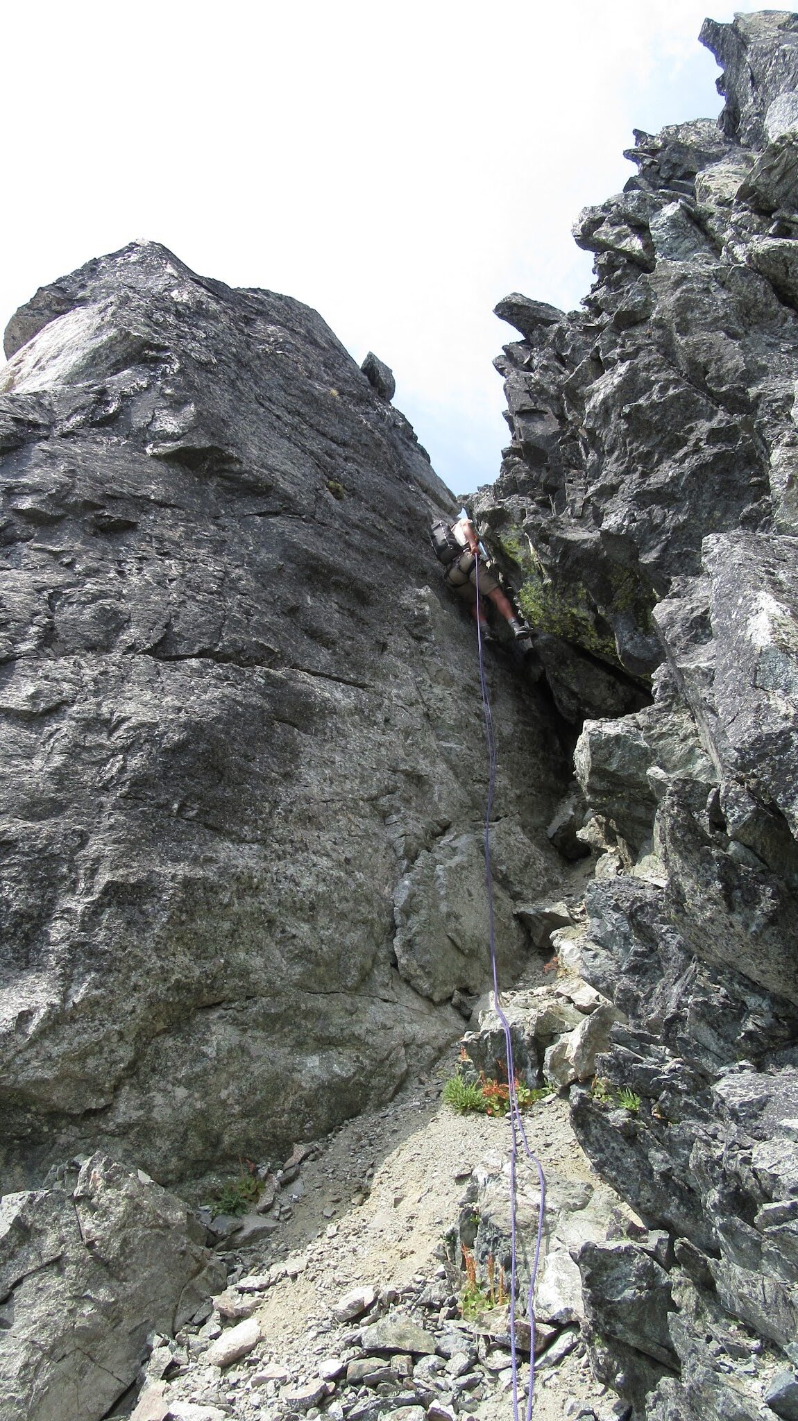 I was forced to look for a rappel anchor, however the only horn I found (right next to the steep gully above steep slabs) would not hold a sling. Since it was getting late and I had already wasted a half hour looking for an anchor, I held the sling in the horn while Josh rappelled. Knowing there was no way this would hold due to the amount of force I had to employ while Josh weighted it, I reluctantly hopped over the top of the gully testing each of the refrigerator sized boulders that all appeared to want to fall at any second. Josh went to a safe spot near the moat and I kicked all the rocks to test them, then gingerly stepped on the first one. Luckily it held and they all were wedged against one another quite well. One of the boulders had a huge horn on it that made an excellent anchor…so long as the rock held.
