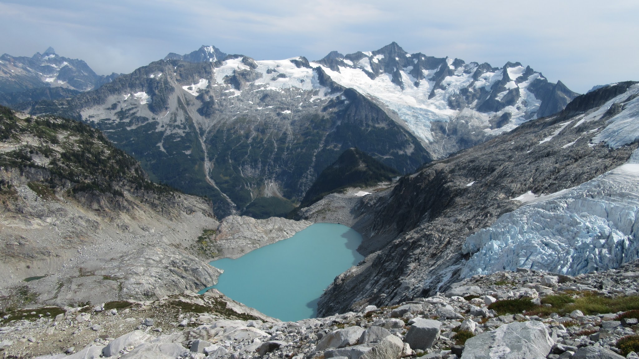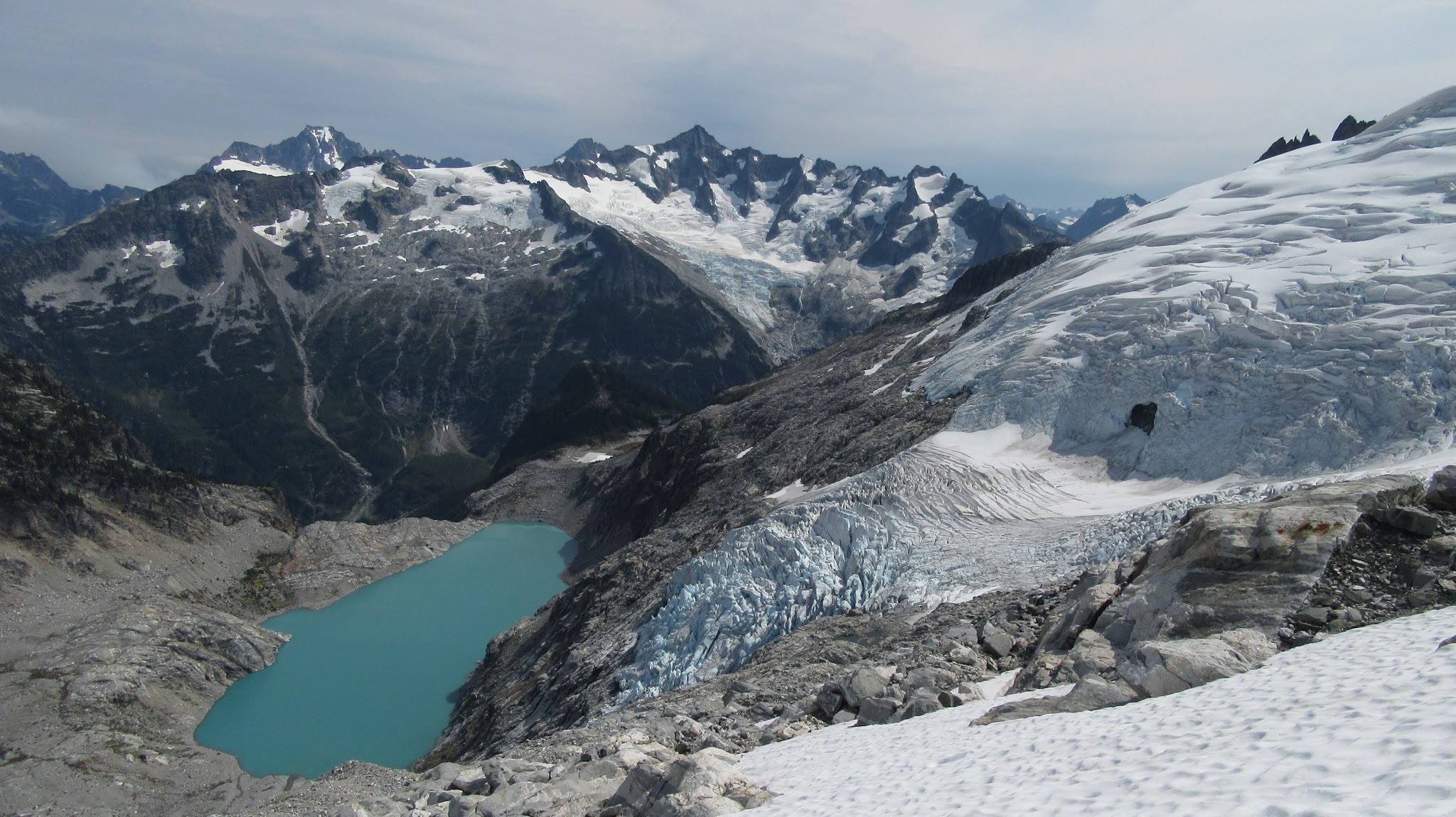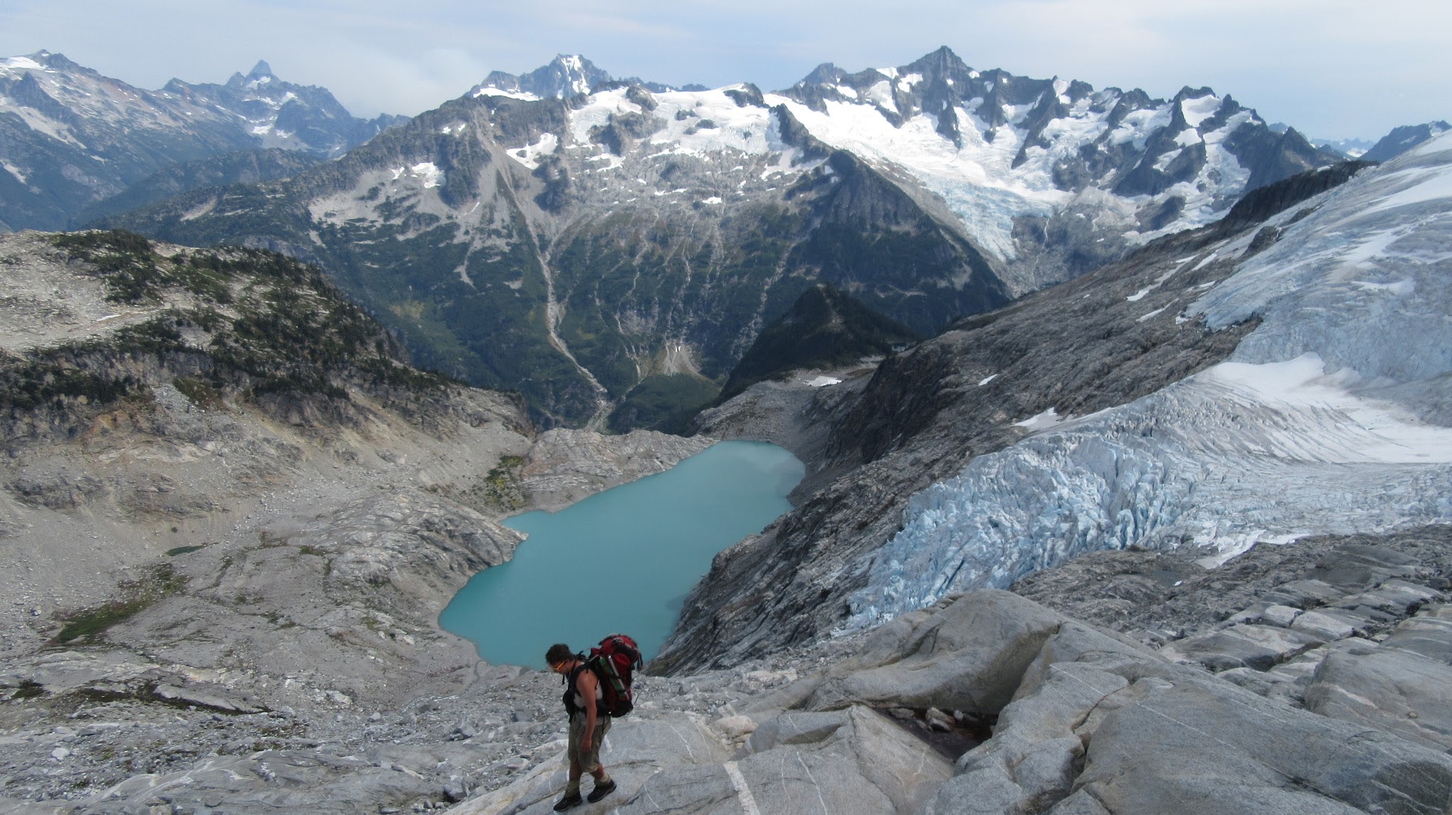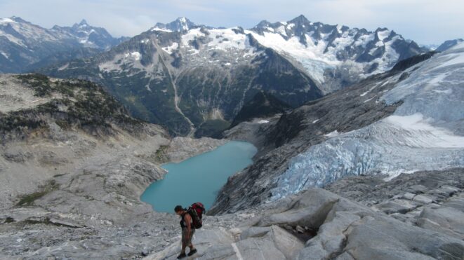 We all safely rappelled Austera Peak in 2 raps. We decided to just use the anchors already in place at the top of the chockstone gully rather than re-ascent the false summit. We quickly reached the snow again and began the 1,200 foot descent down the snow along the east ridge of Austera. Since the north side of this ridge drops so abruptly, people are forced to go around the ridge all the way at the 6,900 foot contour. We ended up on some slabs as we traversed around the base of the ridge, at which point the emerald green Klawatti Lake came into view below us to the SE.