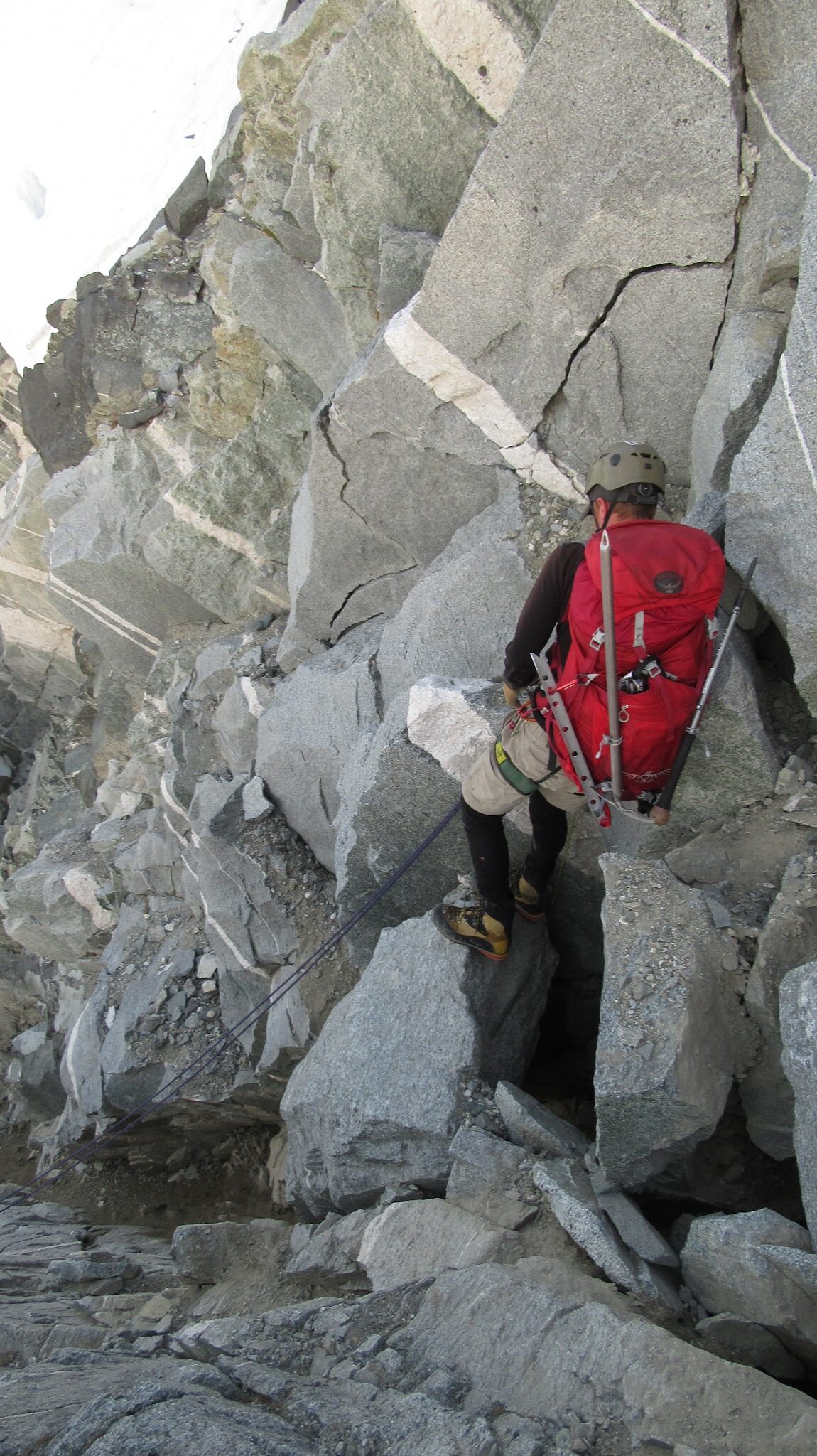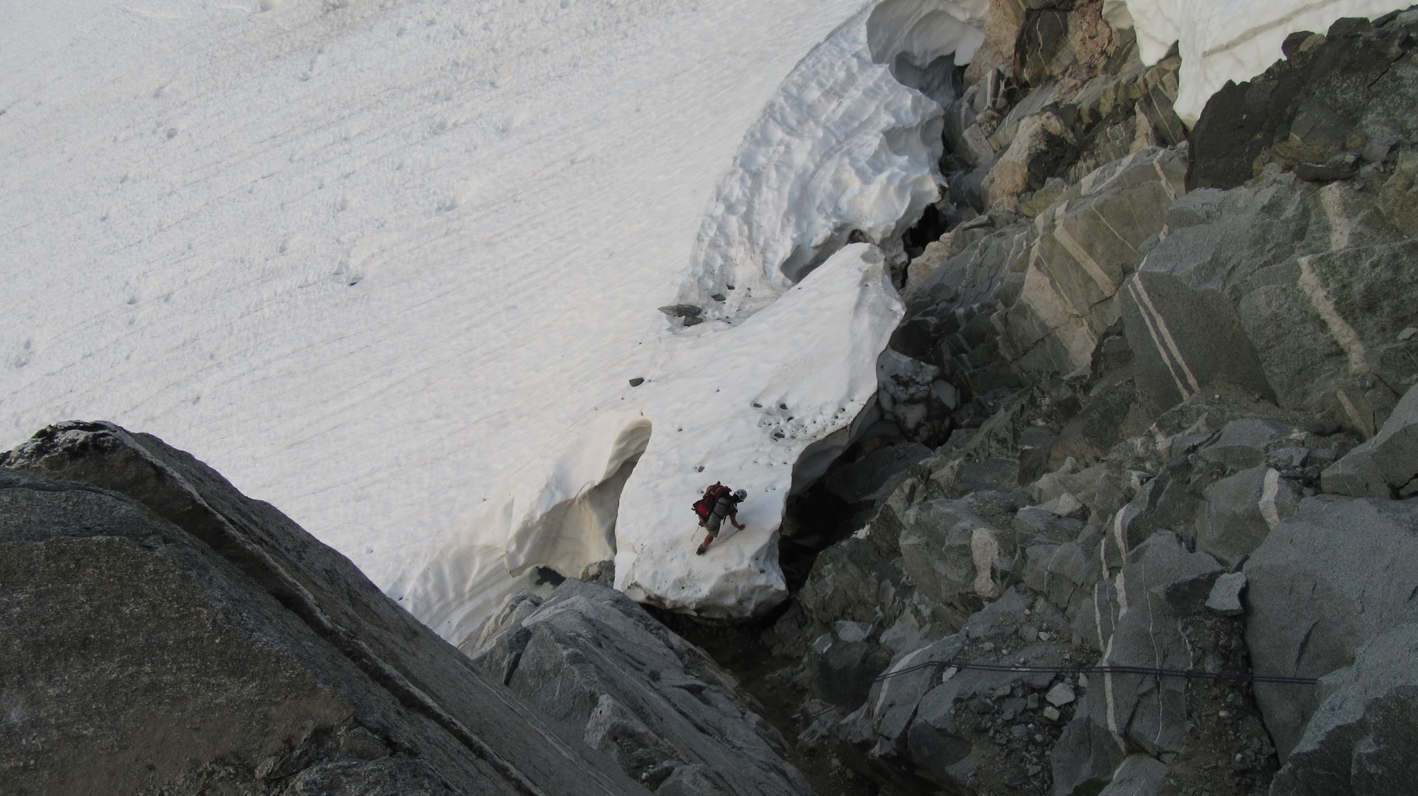 I threw a sling up and John went down next. Before I went I made sure they both started to cross the moat and get onto the snow. I quickly rapped the 50 feet and followed them across the most as fast as I could. There were rocks flying everywhere as I pulled the rope (that gully was heinous!) We then realized the snow finger we were all standing on was very sketchy. It wasn't held up by much despite being the size of a semi truck and had it broke would have tumbled into the very wide moat. Now that I think about it, had that snow finger not been there, there was no way we could have crossed the moat and this route would have been a no go.
