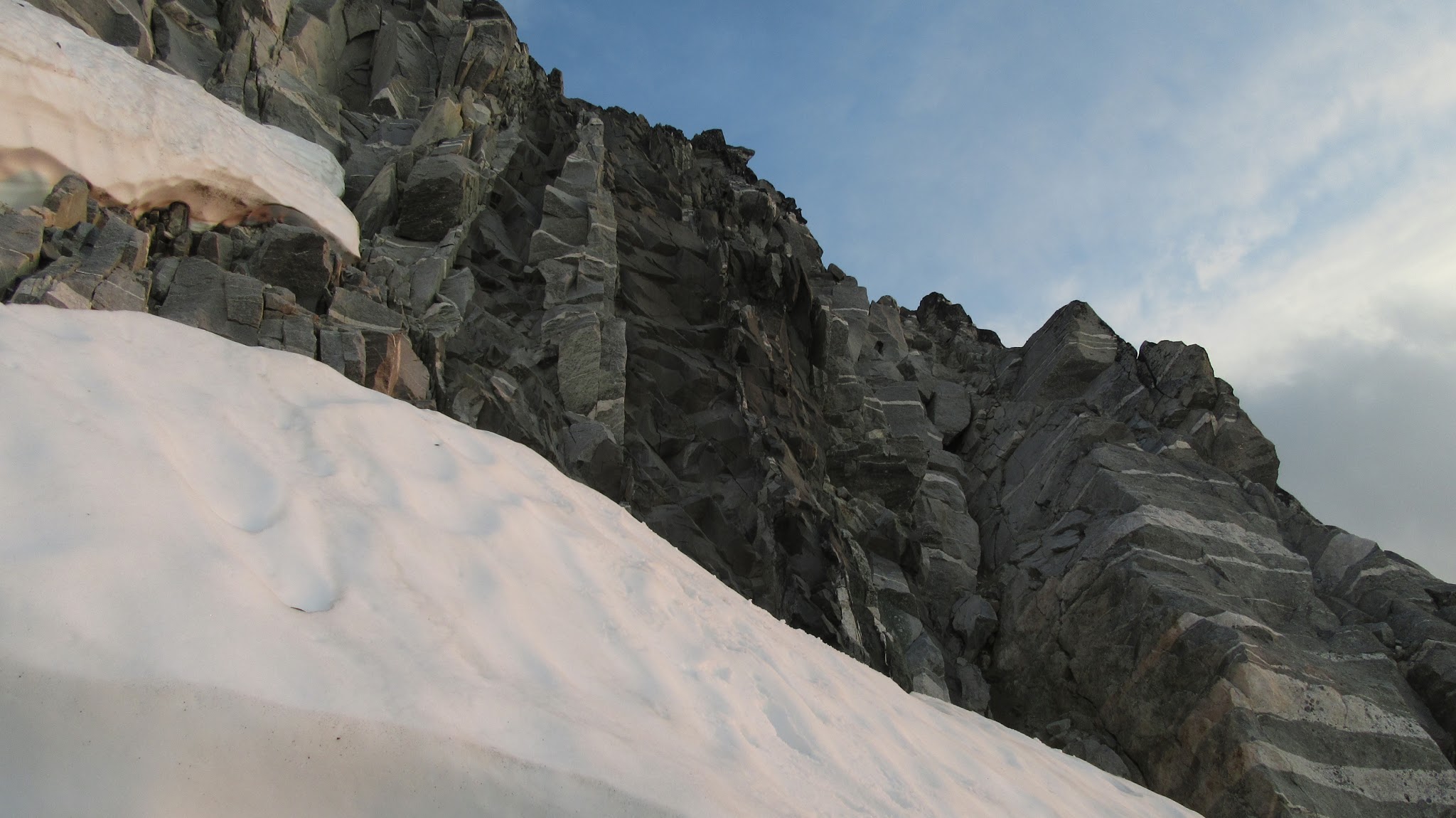 Just as it got dark, we got around all the bullet ice on the east side of Point 7,720, which was all soft snow back in October 2012! We found a small flat area among the talus fields at 7,300 feet that was big enough for our two tents. After almost an hour throwing rocks down to make it sleep-able, we put up the tents and had an awesome tasting dinner. Even though we didn't quite make it to Borelis Lake, I knew the worst was over and I could easily get us back from this point. It was a peaceful night, sans a huge icefall in the Borelis Glacier below and off to the south of us that tumbled down the slabs towards Borelis Lake.