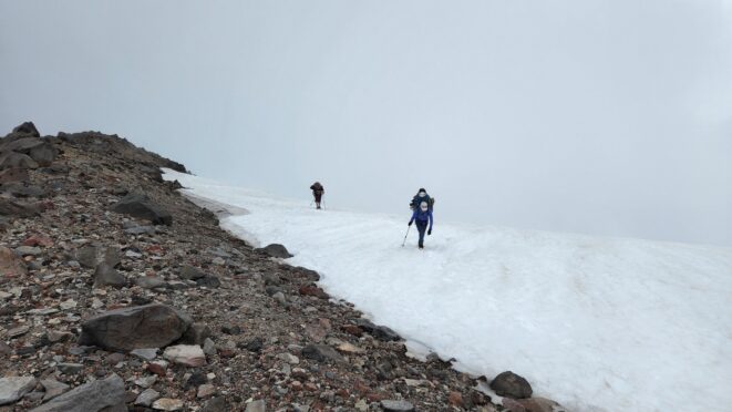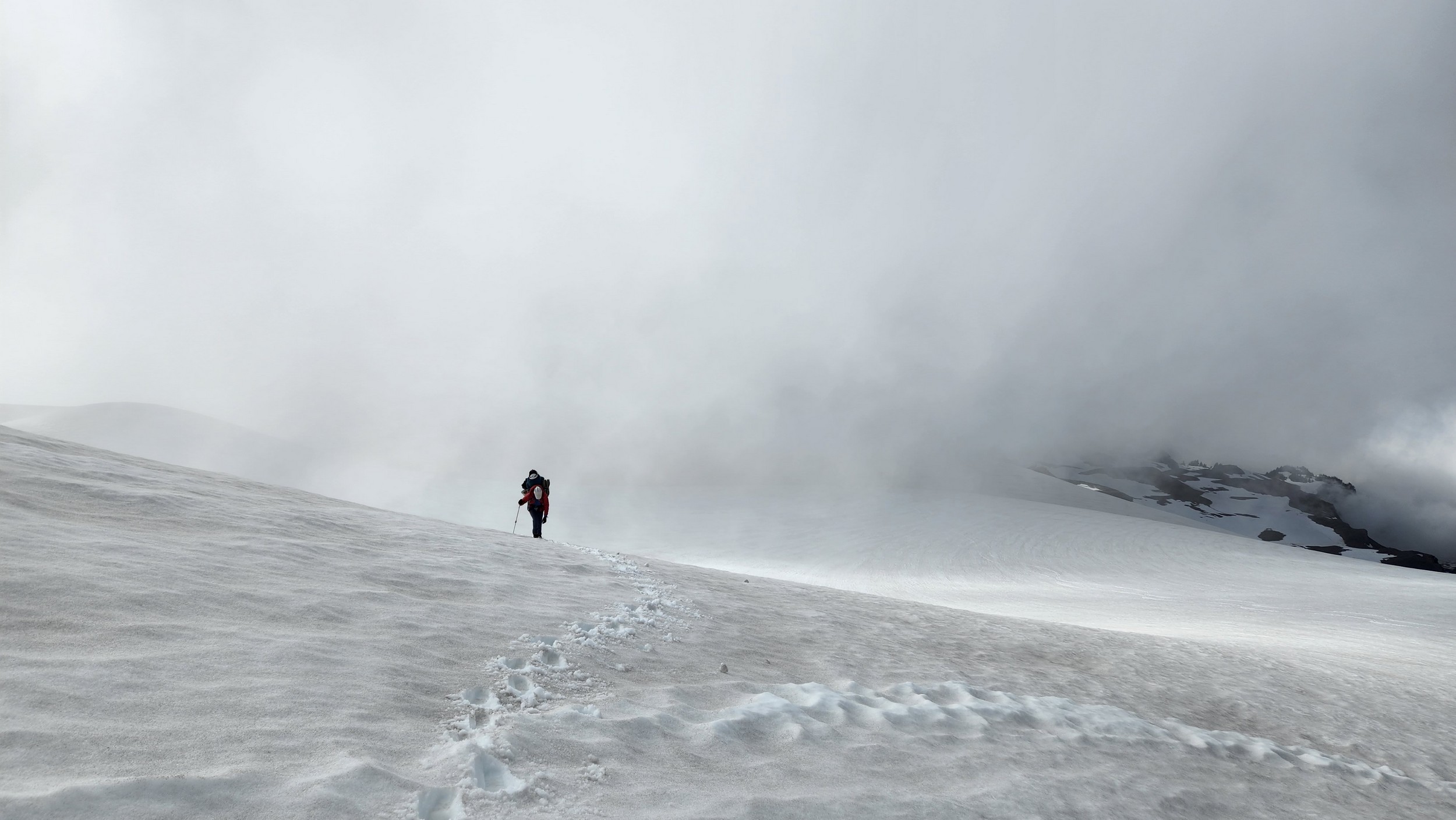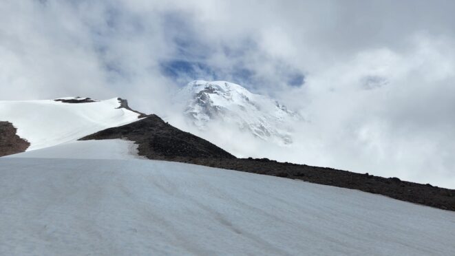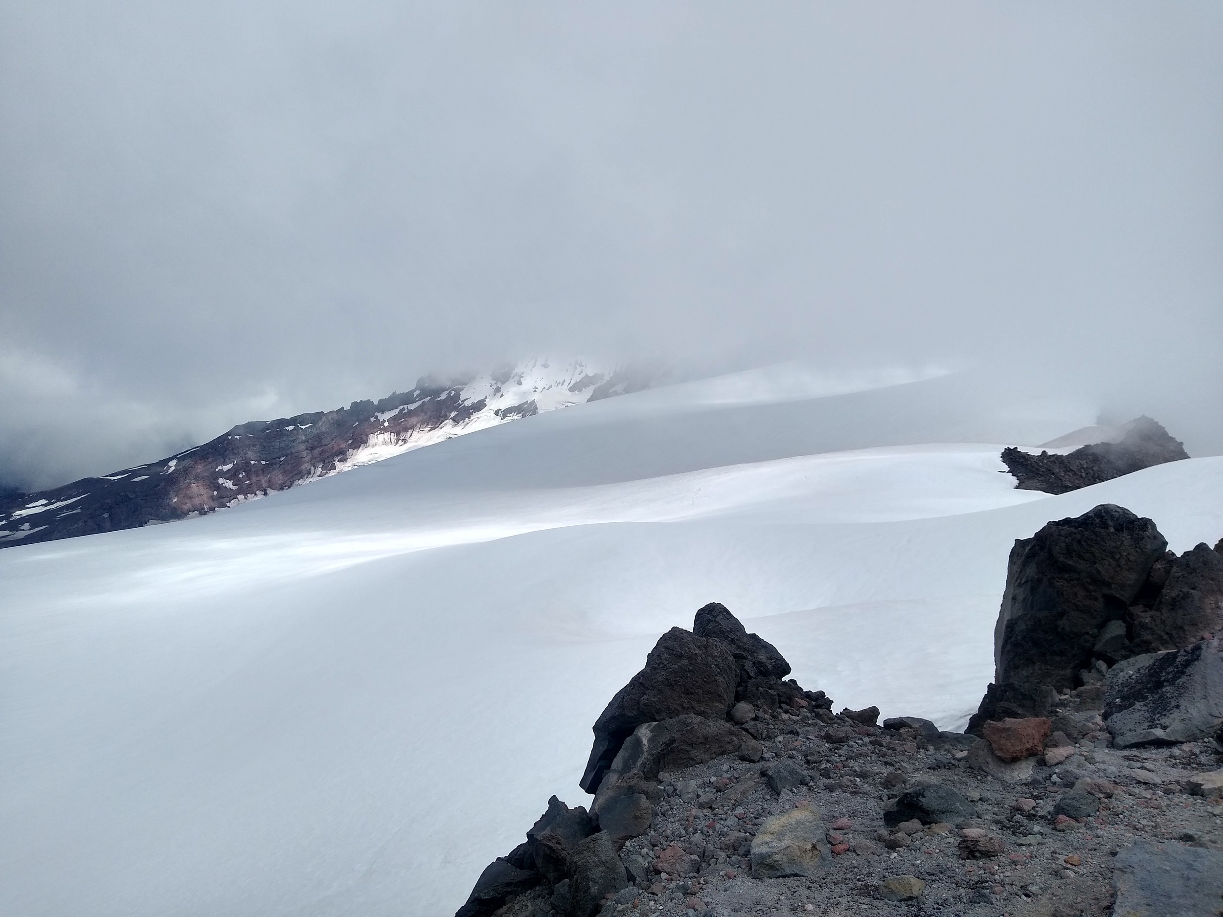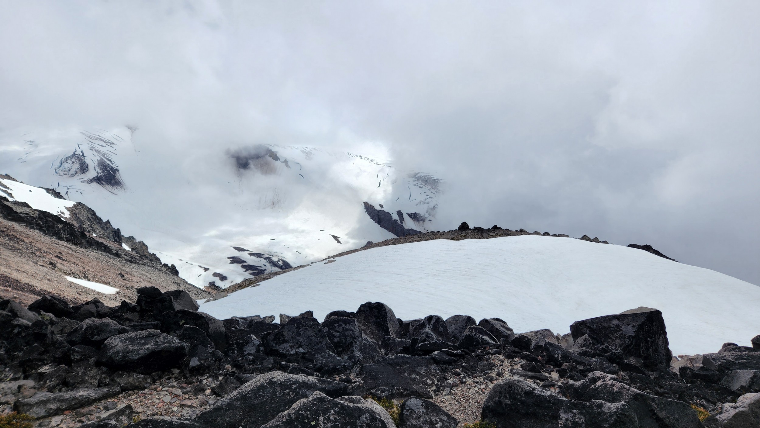 We woke to a large convoy of OHV guys parking and preparing for a day of off roading. We quickly packed up and parked at the closure gate, and under cloudy skies we started walking up the roads. I had my mountain boots in hand with about a 50 pound pack on. Thankfully there is a shortcut trail that bypasses all the long switchbacks in the road and cuts the 5 miles down to about 3.5, so it was barely an hour by the time we reached the lake. We took a quick snack and bathroom break and then started down the WOnderland/Spray Park Trail which to our surprise was quite snow free all the way to about 5500 feet before we started hitting more continuous snowfields. The trail was in good shape and we were really the only ones on it since it was still very early summer. As the trail worked us southward, we reached Eagle Cliff, but had just entered the clouds at this point so did not see any views over the cliff. We continued ascending east, then back northward until about 6000 feet elevation at which point we left the trail and stared cross country walking over firm continuous snow southward towards the base of Ptarmigan Ridge. We walked mellow snow covered slopes for over a mile in a whiteout until we had a couple peak-a-boo views open up and give us a glimpse of the starting slope to Ptarmigan Ridge.