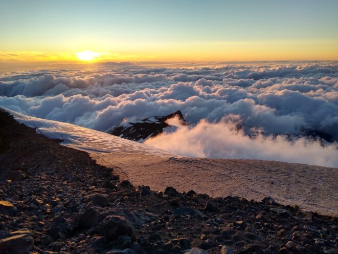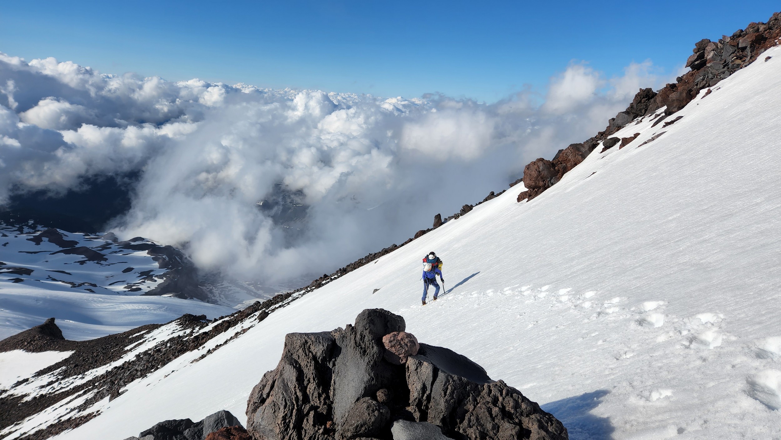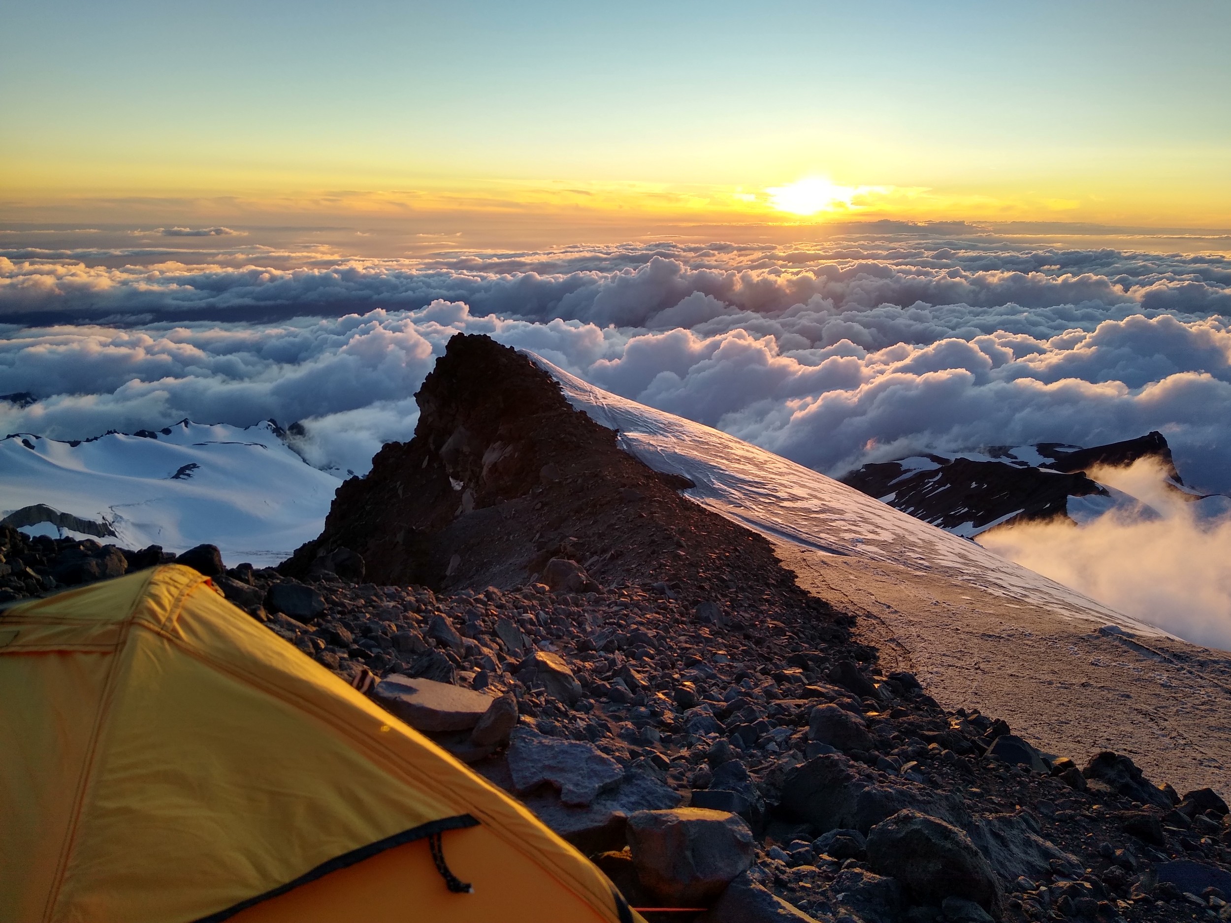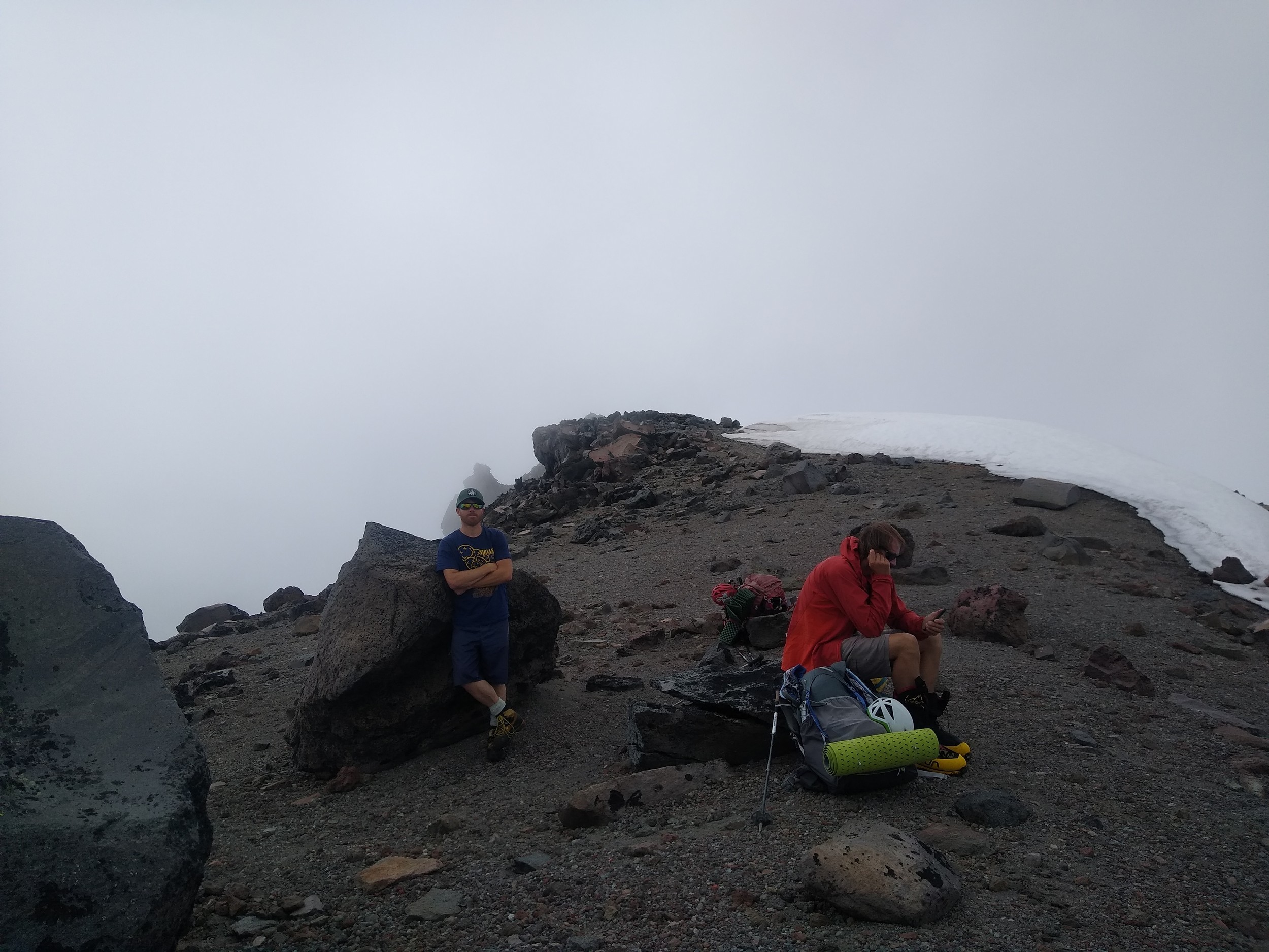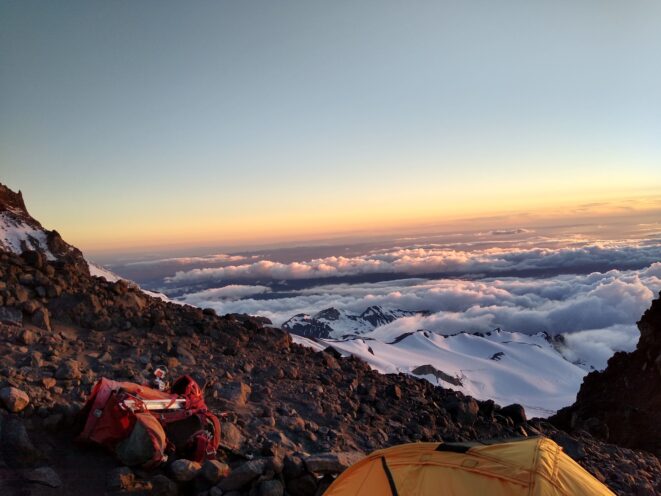 We started ascending steeper slopes from 6000 feet, thankfully the snow was still firm and supportive. Between 7200-7400 feet the slope steepened to about 45 degrees, which was the steepest section of the approach, right before mellowing out as we neared Observation Rock. At this point we passed a weather station, and began to slowly get larger clearings in the whiteout clouds we had been in all morning. We slowly continued up past 8000 feet, then 9000, took a small break on a nice sandy flat spot at 9200 feet, then at aout 9600 feet, we emerged completely above the clouds and saw the final 800 foot slope we needed to ascend to reach our camp. Finally, after a tiring 12 hour day of snow slogging carring 50+ pounds, we reached the flat section of ridge at 10,400 feet where we found a spectacular bivy spot in soft sand. The view of the Seattle/Tacoma metro area was amazing, since we were not under clear skies as we eventually climbed above the clouds. We began excavating the camp spot we found to make it larger to fit all 3 of us. I did not have a tent so I set up my tarp and my sleeping pad right next to the tent John and Stephanie shared and we got started melting snow right away. With the breezy conditions and quickly cooling temperatures, my low efficiency ultralight stove took a long time to melt and boil water. I was also getting sandblasted by the wind which got my sleeping bag and gear all gritty throughout the evening. Eventually, we got about 5 liters of water melted and a couple more boiled for dinner for all of us. About 1000 feet below us, we could see the clouds swiftly flowing over the lower Ptarmigan Ridge which was a cool sight to behold! By dark, we were ready to fall asleep.