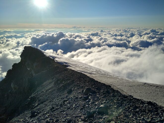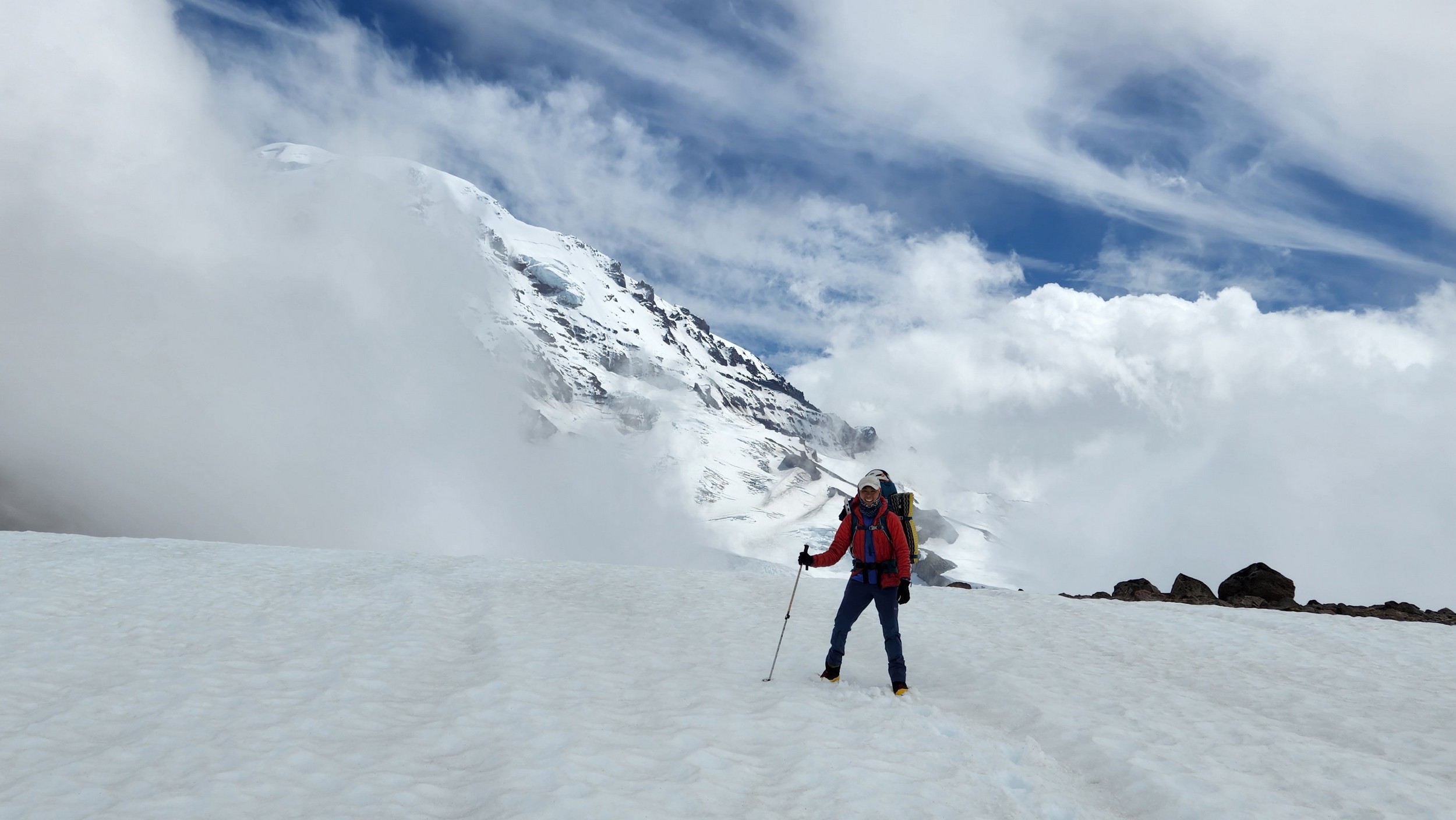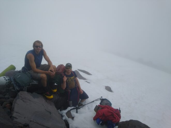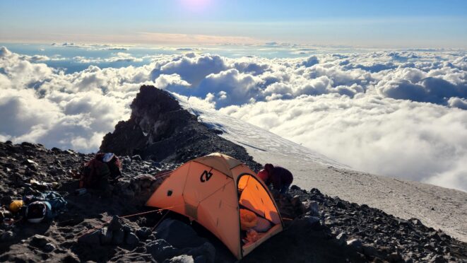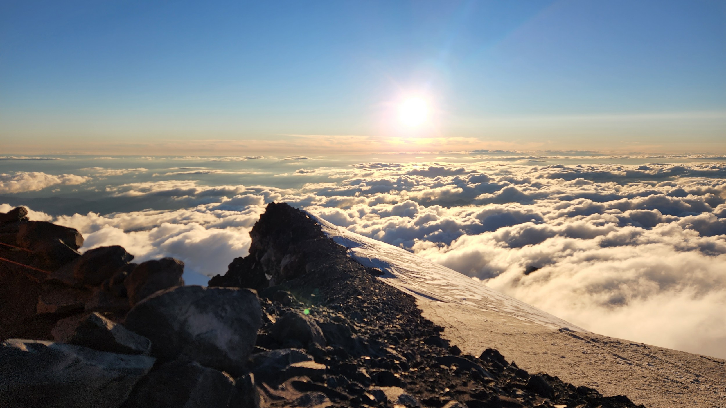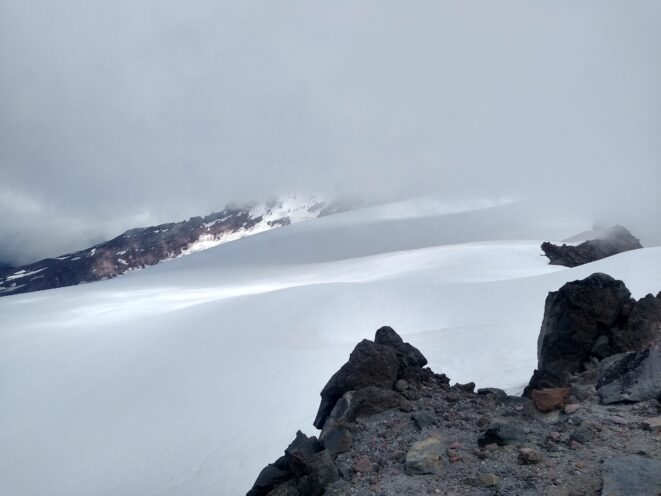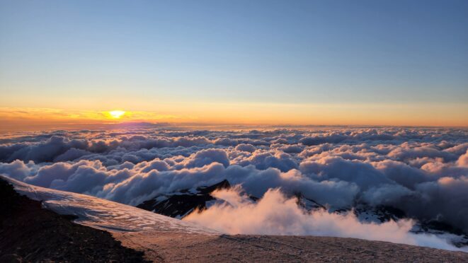 We started ascending steeper slopes from 6000 feet, thankfully the snow was still firm and supportive. Between 7200-7400 feet the slope steepened to about 45 degrees, which was the steepest section of the approach, right before mellowing out as we neared Observation Rock. At this point we passed a weather station, and began to slowly get larger clearings in the whiteout clouds we had been in all morning. We slowly continued up past 8000 feet, then 9000, took a small break on a nice sandy flat spot at 9200 feet, then at aout 9600 feet, we emerged completely above the clouds and saw the final 800 foot slope we needed to ascend to reach our camp. Finally, after a tiring 12 hour day of snow slogging carring 50+ pounds, we reached the flat section of ridge at 10,400 feet where we found a spectacular bivy spot in soft sand. The view of the Seattle/Tacoma metro area was amazing, since we were not under clear skies as we eventually climbed above the clouds. We began excavating the camp spot we found to make it larger to fit all 3 of us. I did not have a tent so I set up my tarp and my sleeping pad right next to the tent John and Stephanie shared and we got started melting snow right away. With the breezy conditions and quickly cooling temperatures, my low efficiency ultralight stove took a long time to melt and boil water. I was also getting sandblasted by the wind which got my sleeping bag and gear all gritty throughout the evening. Eventually, we got about 5 liters of water melted and a couple more boiled for dinner for all of us. About 1000 feet below us, we could see the clouds swiftly flowing over the lower Ptarmigan Ridge which was a cool sight to behold! By dark, we were ready to fall asleep.