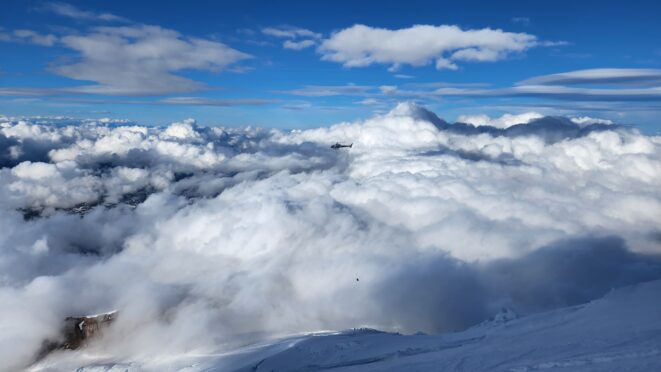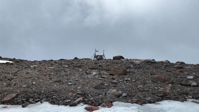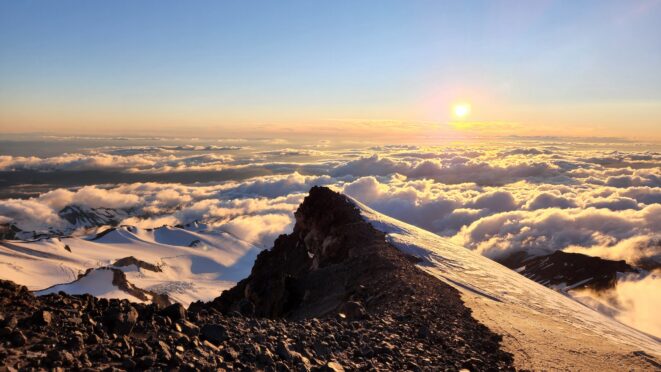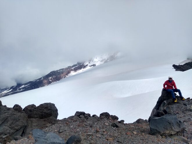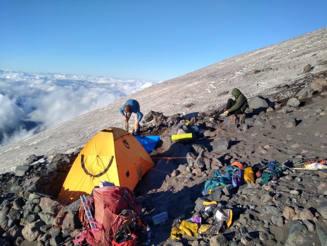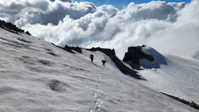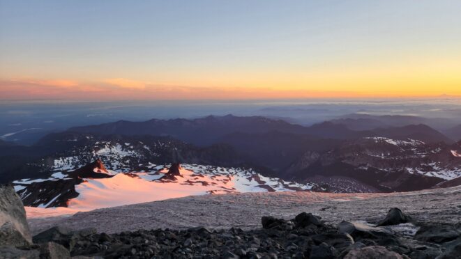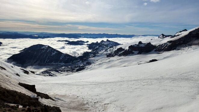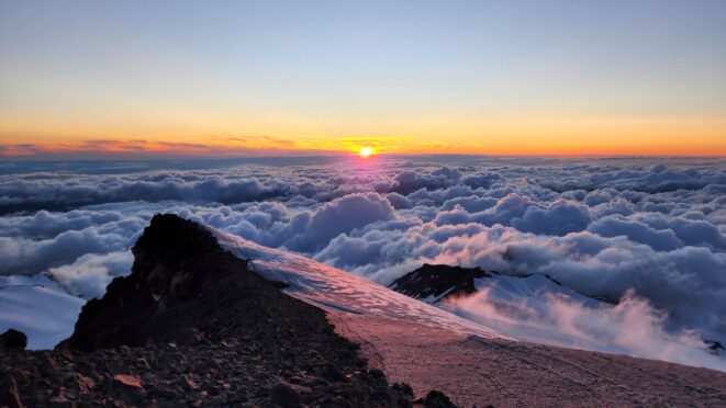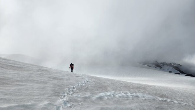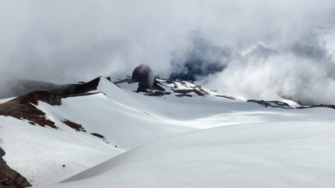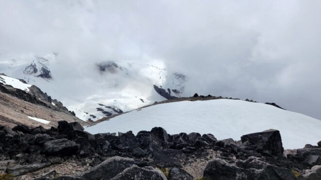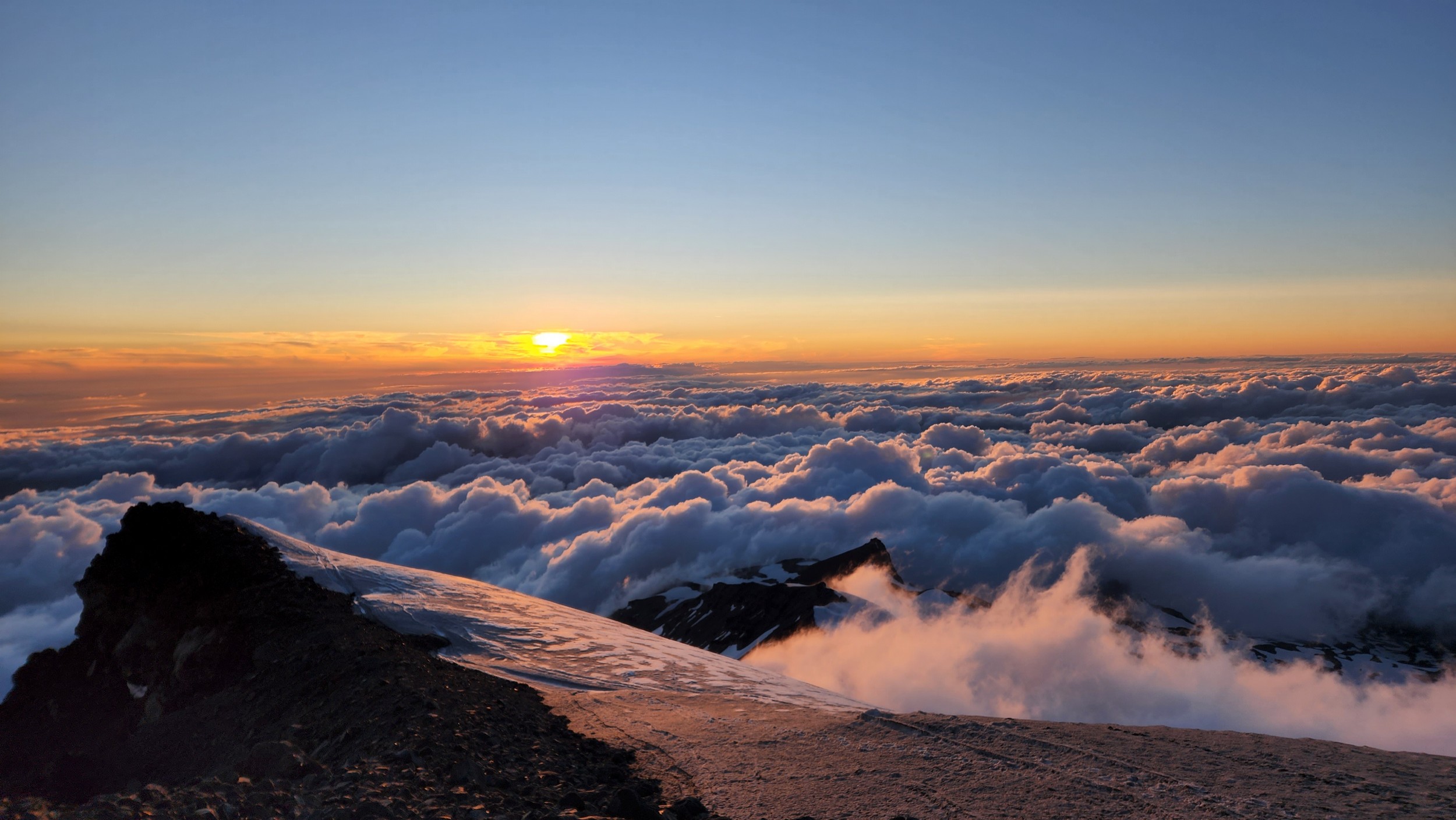 We started ascending steeper slopes from 6000 feet, thankfully the snow was still firm and supportive. Between 7200-7400 feet the slope steepened to about 45 degrees, which was the steepest section of the approach, right before mellowing out as we neared Observation Rock. At this point we passed a weather station, and began to slowly get larger clearings in the whiteout clouds we had been in all morning. We slowly continued up past 8000 feet, then 9000, took a small break on a nice sandy flat spot at 9200 feet, then at aout 9600 feet, we emerged completely above the clouds and saw the final 800 foot slope we needed to ascend to reach our camp. Finally, after a tiring 12 hour day of snow slogging carring 50+ pounds, we reached the flat section of ridge at 10,400 feet where we found a spectacular bivy spot in soft sand. The view of the Seattle/Tacoma metro area was amazing, since we were not under clear skies as we eventually climbed above the clouds. We began excavating the camp spot we found to make it larger to fit all 3 of us. I did not have a tent so I set up my tarp and my sleeping pad right next to the tent John and Stephanie shared and we got started melting snow right away. With the breezy conditions and quickly cooling temperatures, my low efficiency ultralight stove took a long time to melt and boil water. I was also getting sandblasted by the wind which got my sleeping bag and gear all gritty throughout the evening. Eventually, we got about 5 liters of water melted and a couple more boiled for dinner for all of us. About 1000 feet below us, we could see the clouds swiftly flowing over the lower Ptarmigan Ridge which was a cool sight to behold! By dark, we were ready to fall asleep.