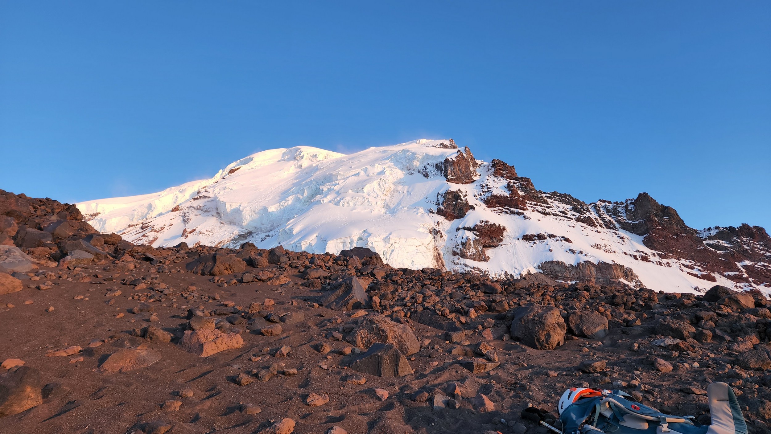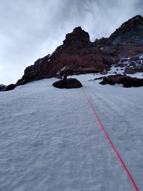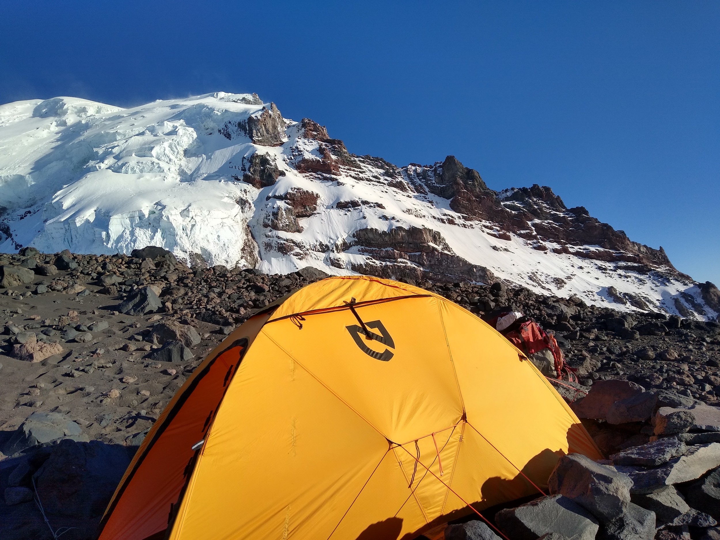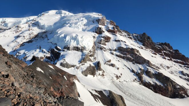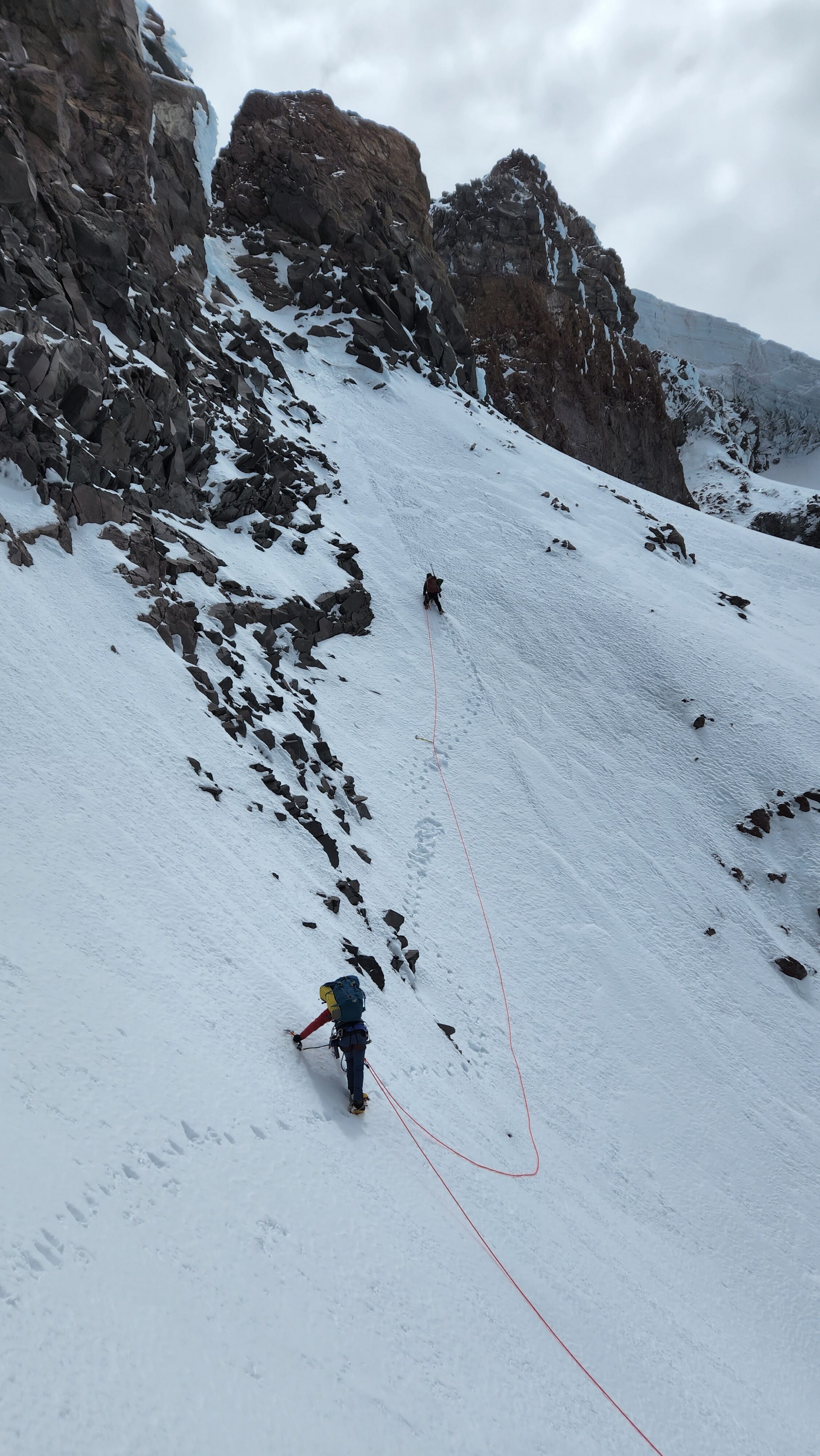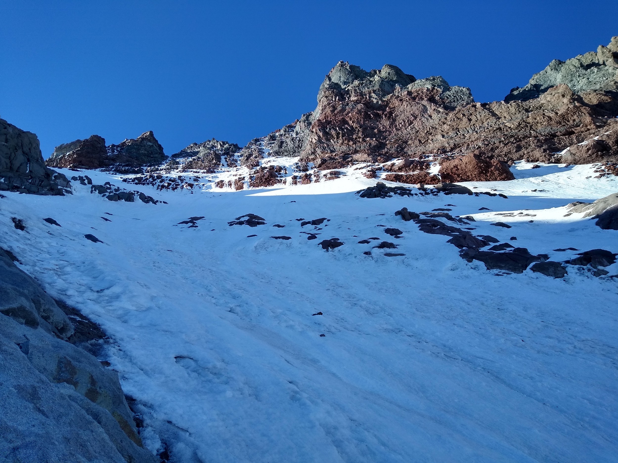 That night the glow of lights from the Seattle/Tacoma area was bright, and the clouds completely cleared out. At dawn the following morning we began packing up to a chilly wind and wasted no time starting up. We walked acrss the flat section of the ridge and passed by a more established campsite with large rock walls, but in a windier location right at the col where we left the ridge proper and made a descending traverse to the west. The route makes this long jog west to avoid the Ptarmigan icefall. We crossed over a serious debris field from avalanches that have come off the icefall throughout the year, and ensured we went at a very brisk pace across this. e reached the start of the steep 45-50 degree snow slopes that mark the start of more serious climbing at about 8am. Very faint ski tracks were visible from a skier who ski the Ptarmigan Ridge route likely a month prior.