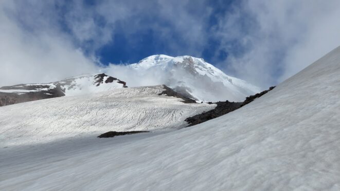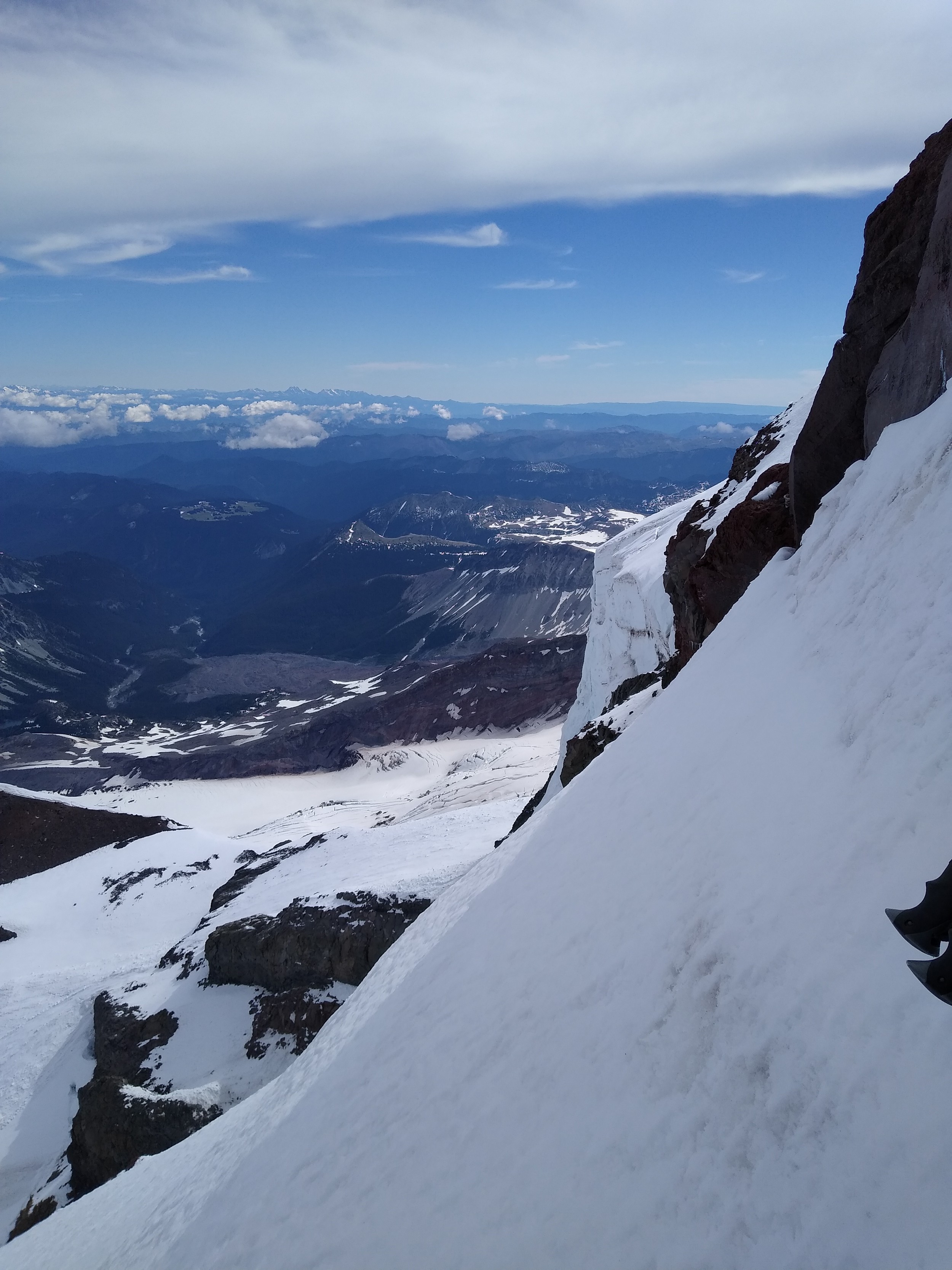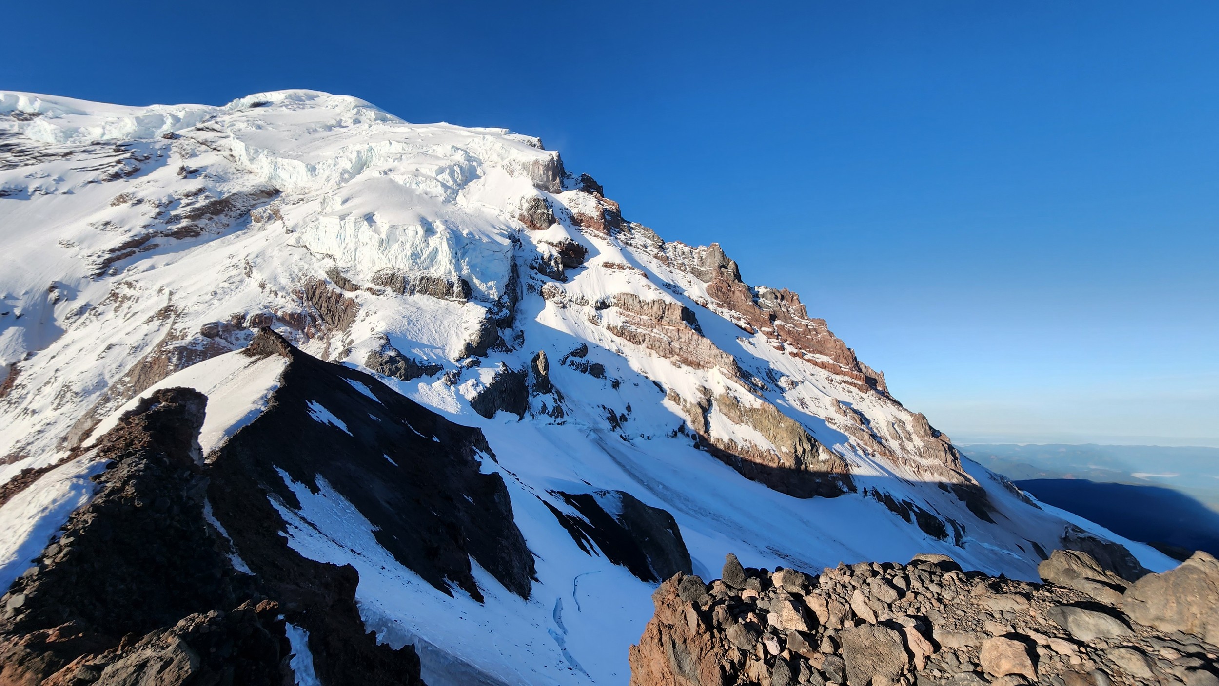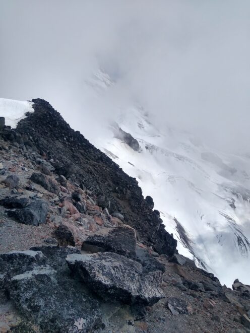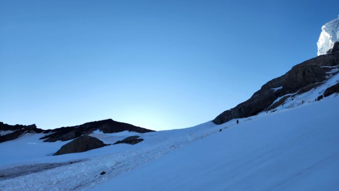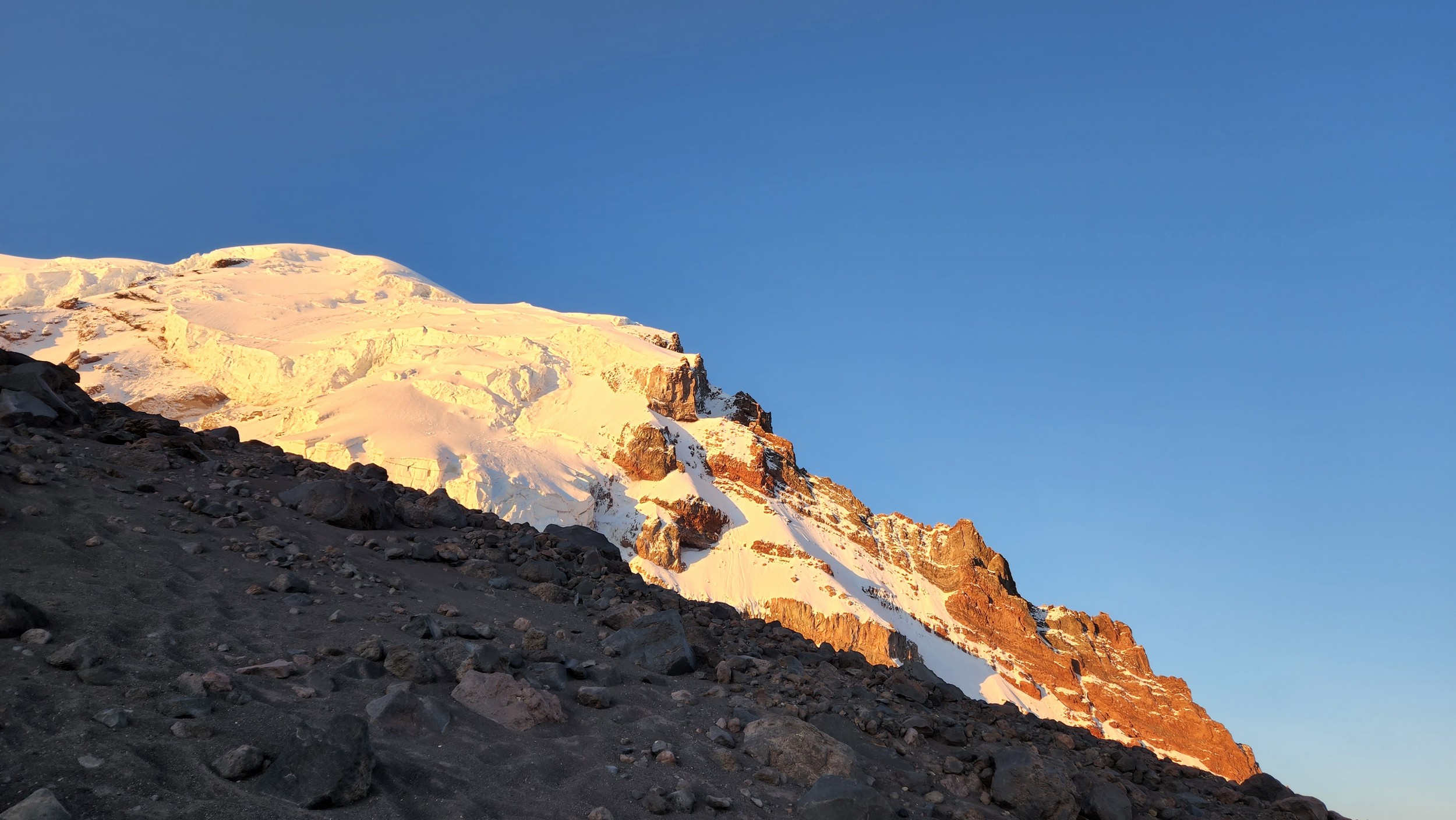 That night the glow of lights from the Seattle/Tacoma area was bright, and the clouds completely cleared out. At dawn the following morning we began packing up to a chilly wind and wasted no time starting up. We walked acrss the flat section of the ridge and passed by a more established campsite with large rock walls, but in a windier location right at the col where we left the ridge proper and made a descending traverse to the west. The route makes this long jog west to avoid the Ptarmigan icefall. We crossed over a serious debris field from avalanches that have come off the icefall throughout the year, and ensured we went at a very brisk pace across this. e reached the start of the steep 45-50 degree snow slopes that mark the start of more serious climbing at about 8am. Very faint ski tracks were visible from a skier who ski the Ptarmigan Ridge route likely a month prior.