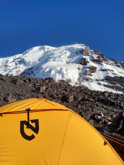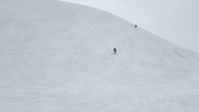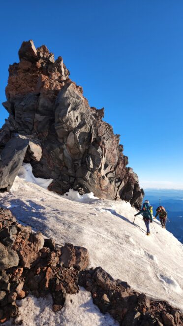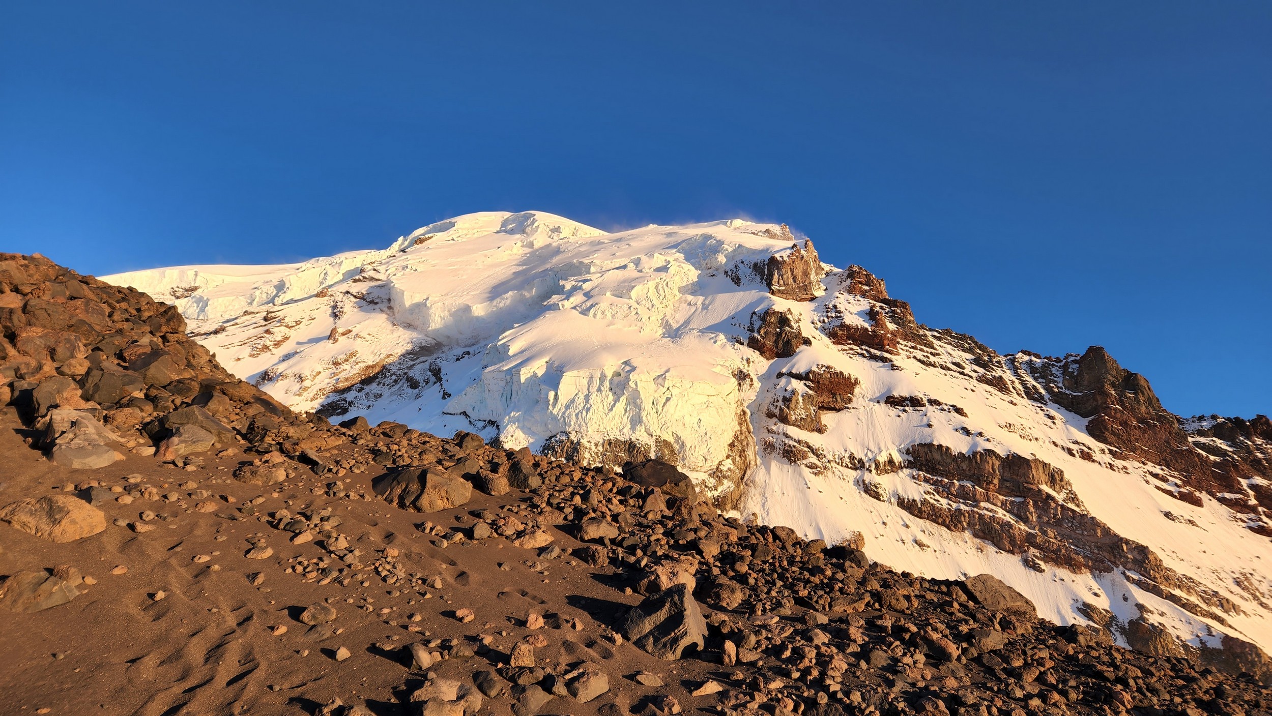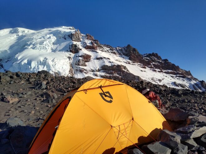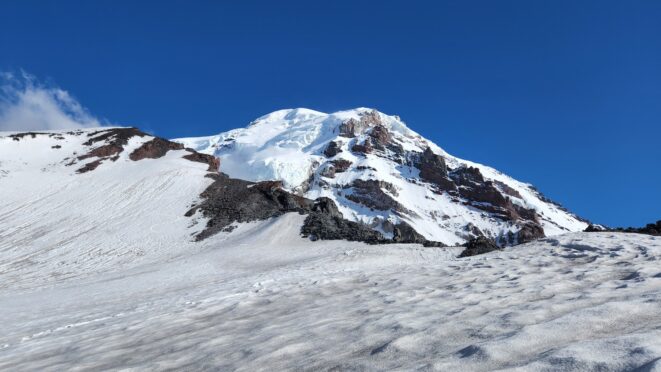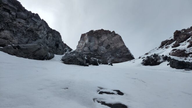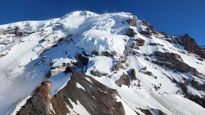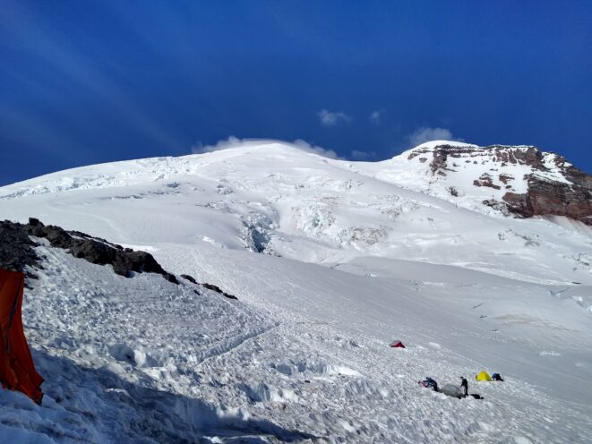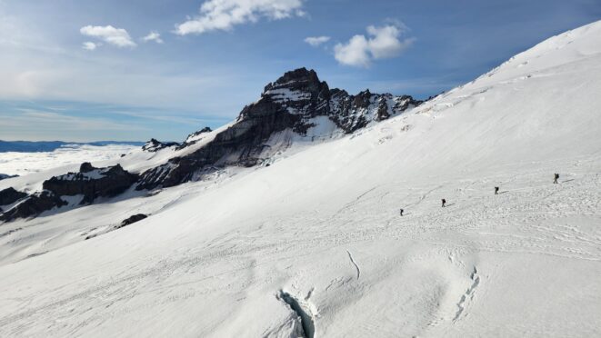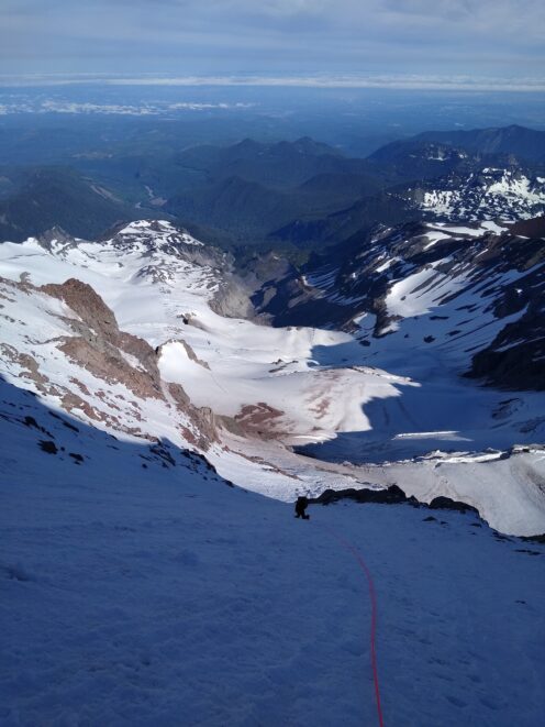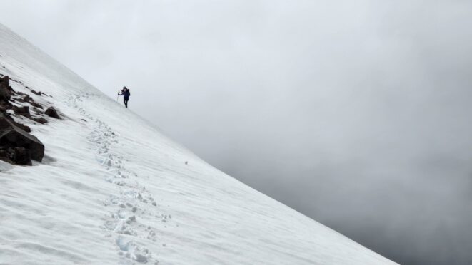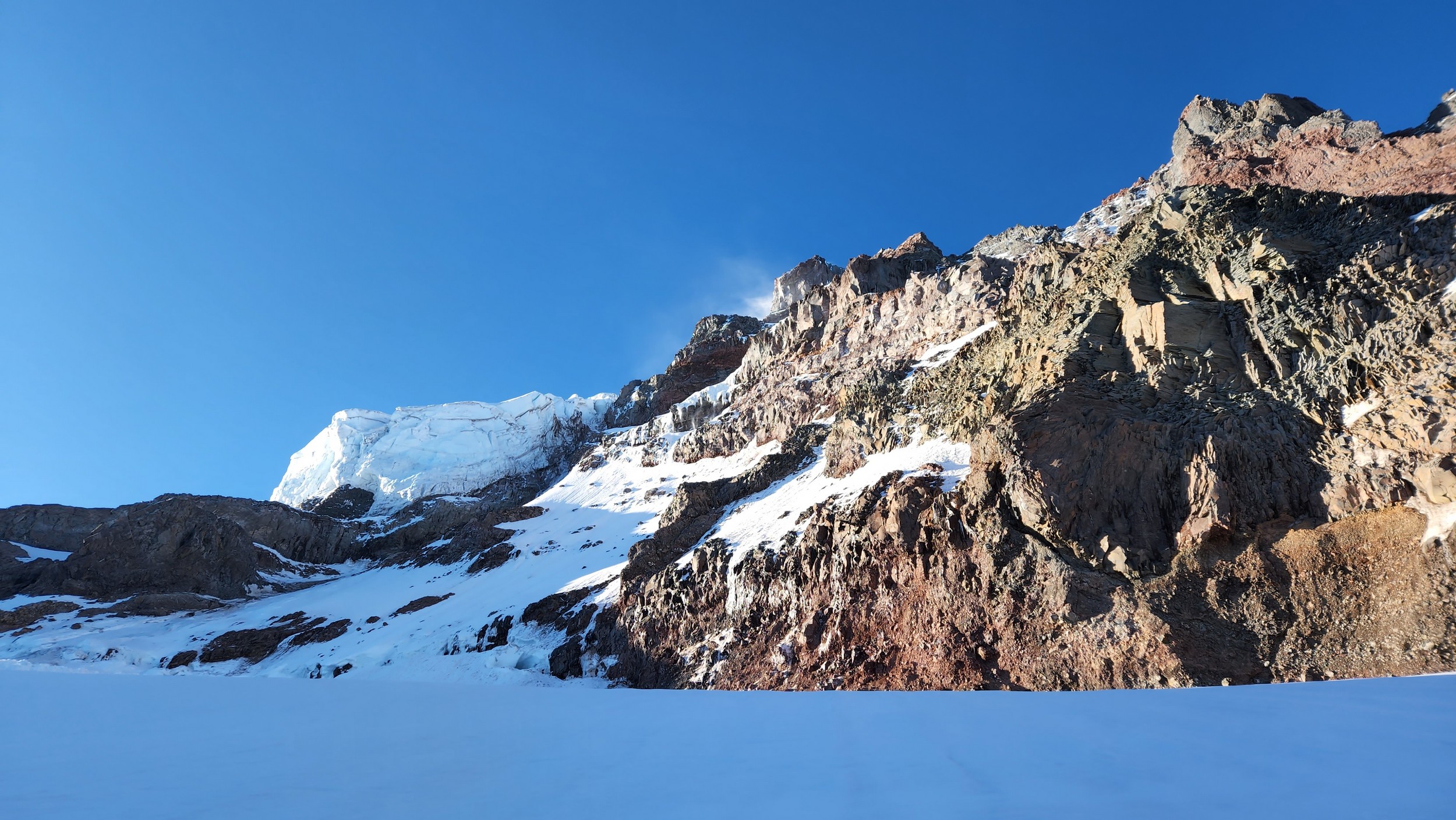 That night the glow of lights from the Seattle/Tacoma area was bright, and the clouds completely cleared out. At dawn the following morning we began packing up to a chilly wind and wasted no time starting up. We walked acrss the flat section of the ridge and passed by a more established campsite with large rock walls, but in a windier location right at the col where we left the ridge proper and made a descending traverse to the west. The route makes this long jog west to avoid the Ptarmigan icefall. We crossed over a serious debris field from avalanches that have come off the icefall throughout the year, and ensured we went at a very brisk pace across this. e reached the start of the steep 45-50 degree snow slopes that mark the start of more serious climbing at about 8am. Very faint ski tracks were visible from a skier who ski the Ptarmigan Ridge route likely a month prior.