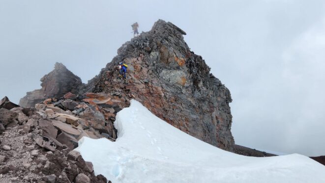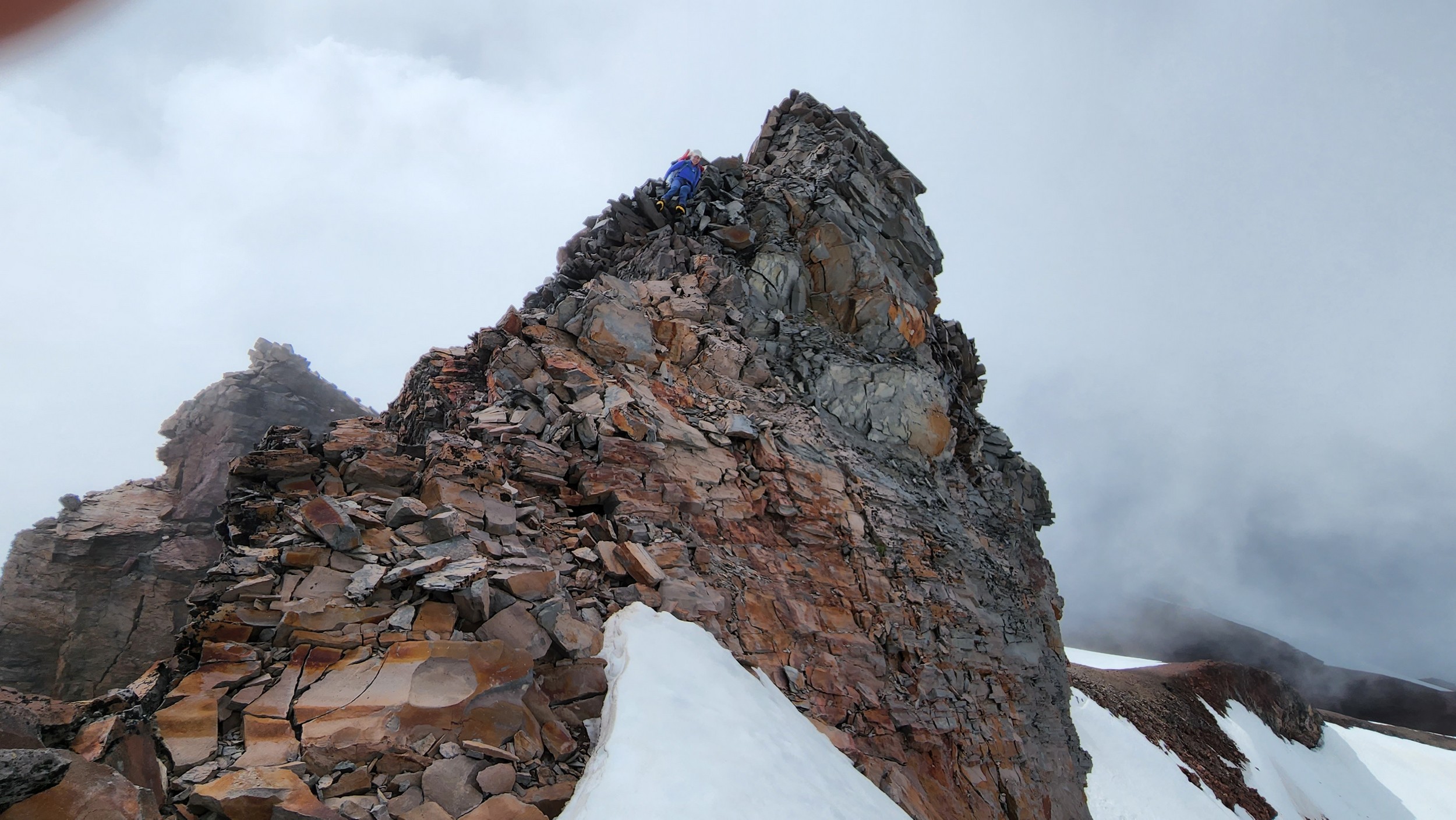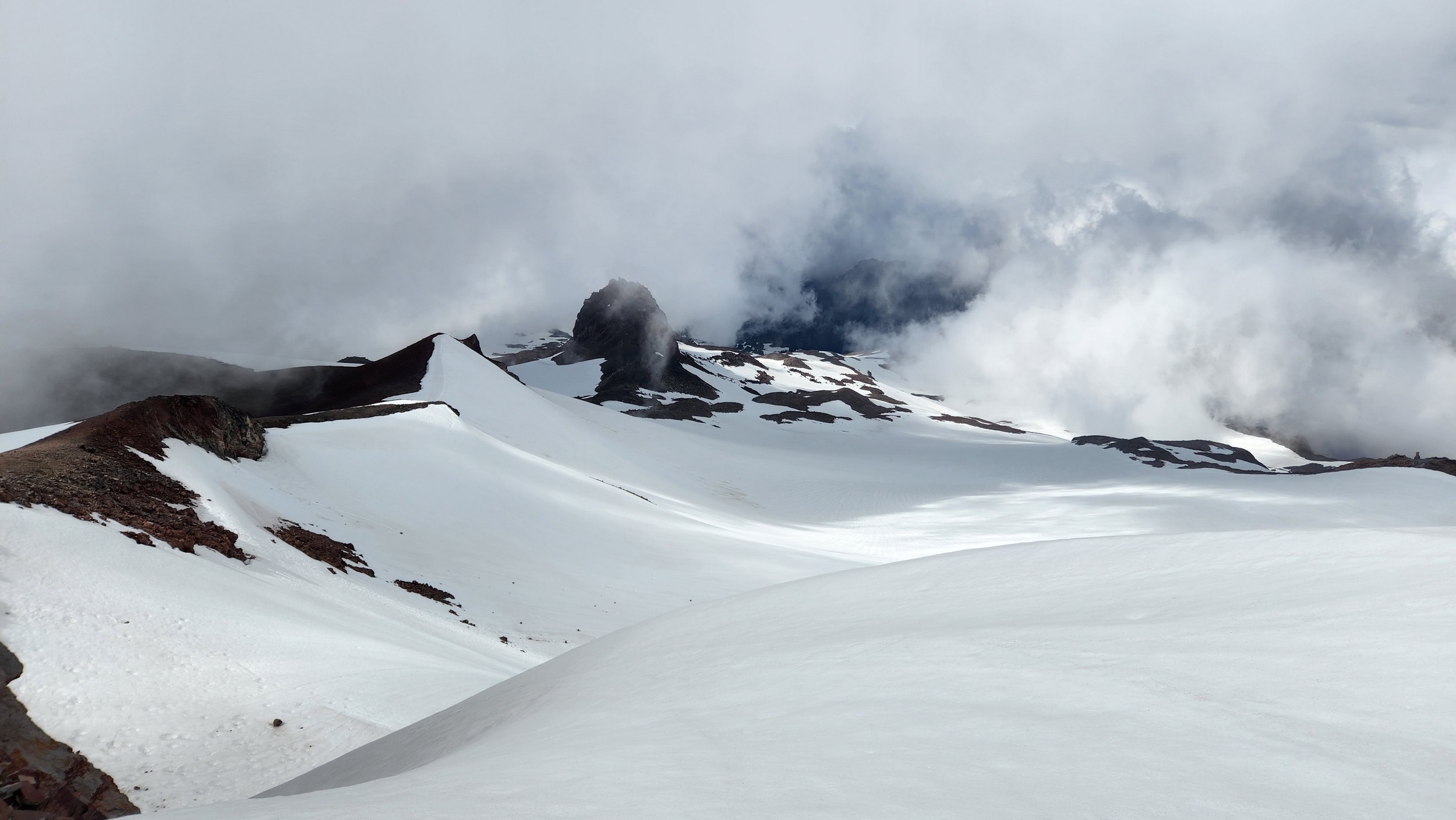 Once atop the ice step, we emerged onto wide open slopes on the Liberty Cap glacier. The winds really were strong now. I started breaking trail up this but we quickly determined the final 2000 feet were going to be miserable. The team of two eventually caught up and passed us, which made it easier to move upwards in the deep snow. I ended up in the lead the entire way up the slopes to the summit of Liberty Cap. It ended up getting very bad though, with winds nearly 60 mph and I did not have quite enough layers to deal with that. I was pushing to continue moving quickly against the desire of my climbing partners as I was getting cold. It took about 4 hours to reach Liberty Cap from the top of the technical climbing...only 500 feet per hour. High clouds were whipping over the summit of Columbia Crest and we climbed into the occational whiteout as we neared the summit. At the time we stood on Liberty Cap though, we had clear visibility however we did not even bother stopping at the top. We walked right over and began the descent down to the broad saddle between Liberty Cap and Columbia Crest. My second to last P400 highest 100 in WA was very anti-climactic with no celebration whatsoever. We also couldn't capture much of any photos from this section of the day as I didn't want to take my gloves off.