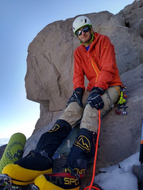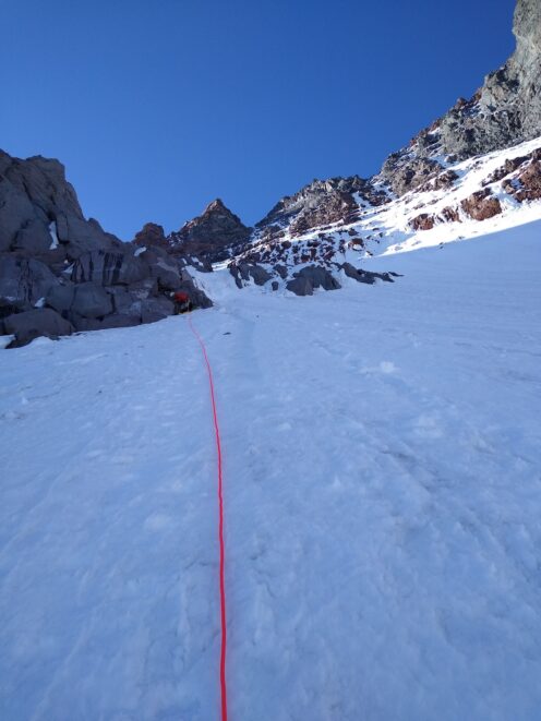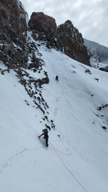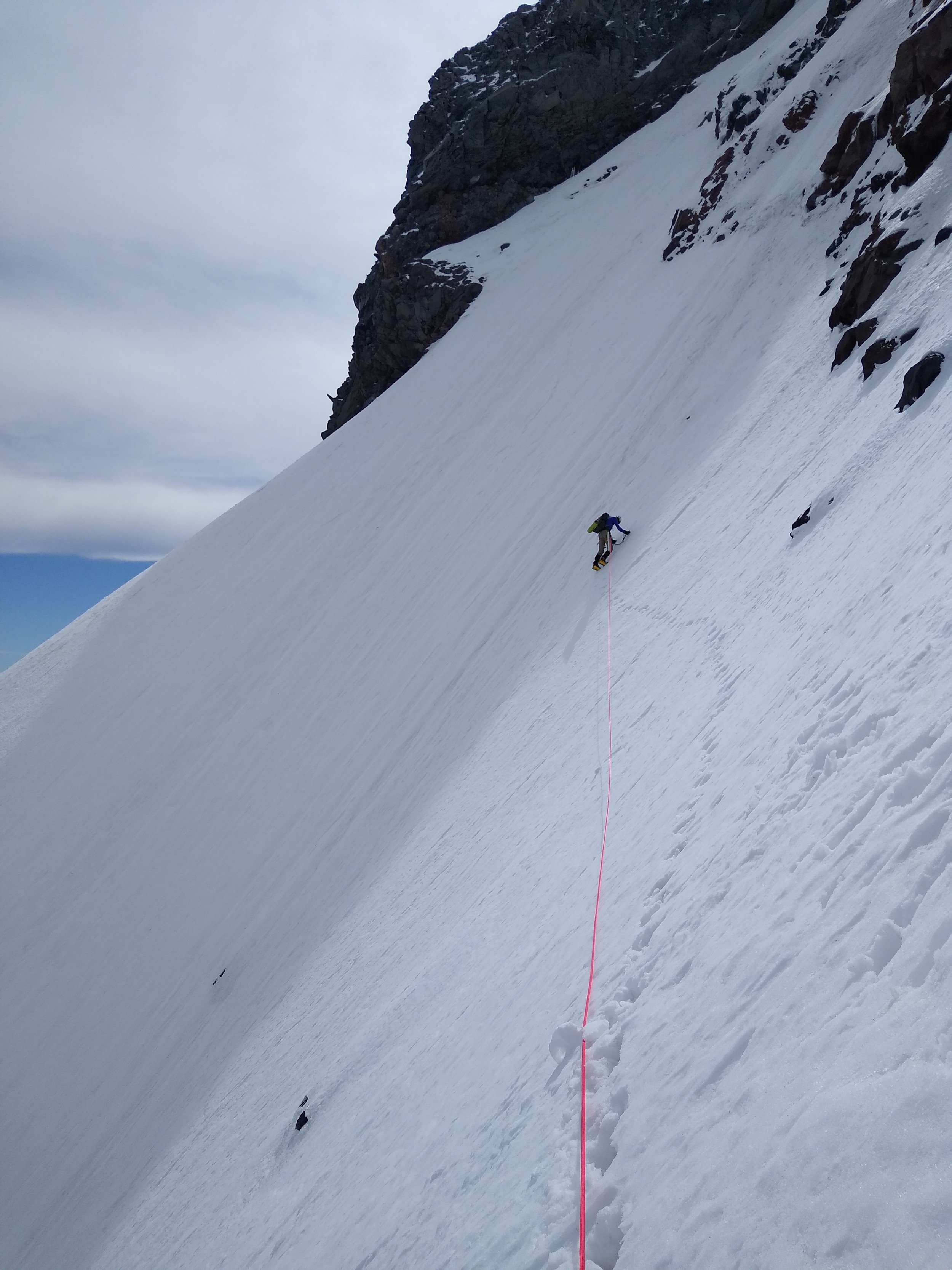 The steep traverse is labelled in this photo. I started up again on lead, breaking trail on this wild traverse on 55 degree snow. A huge cliff dropped off shortly below us on the traverse and this was probably the ost heads up part of the route. Luckily I was able to get one good cam and a few good ice screws in as I made my way left, and to the base of the next snow chute we needed to climb. I made a two screw anchor and belayed them in. By this point the wind had started really picking up, and looking up on the upper mountain there was intense spindrift whipping all over the place. We were not looking forward to the 2000 foot slog to reach the summit of Liberty Cap.