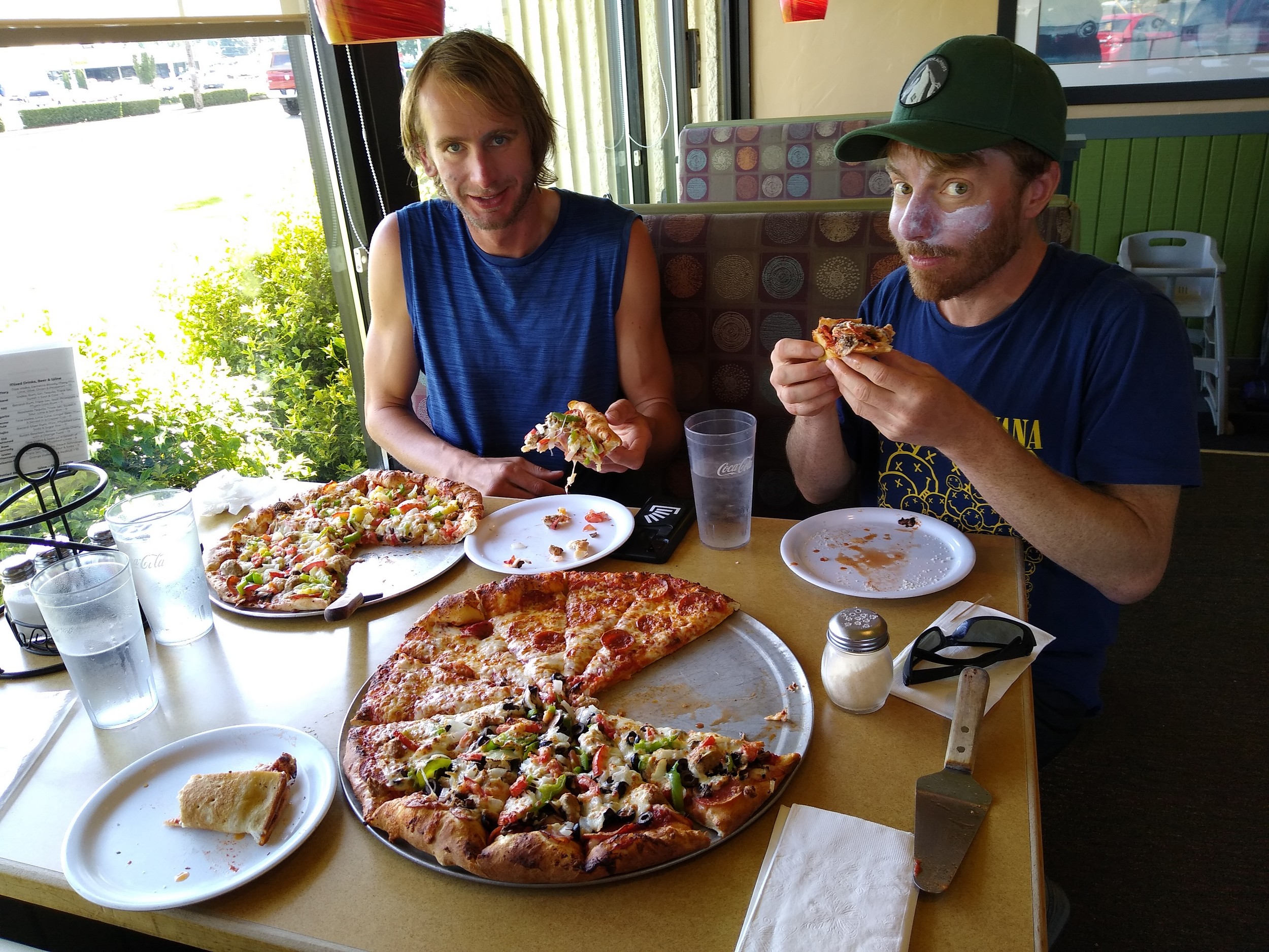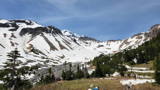 We reached Camp Schruman in the late evening and decided we would just stay another night there. I slept on the wooden latform of a new storage shed the rangers were building adjacent to the bathroom while Stephanie and John put the tent up in an unused platform on the snow. It ended up still being a windy night and I didn't get too much sleep. We were slow to get ready the next morning and didn't start walking down the Interglacier until about 11am, but we made very fast time getting back to my car at the trailhead. We were thrilled to be back and had a relaxing dinner in Enumclaw at a nice pizza place and also grabbed ice cream and beer. The views of the NW face of Rainier on the drive back up the Mowich Lake road was incredible, as we could not see this on our first day due to clouds.