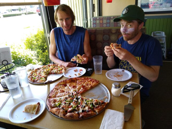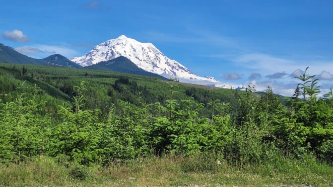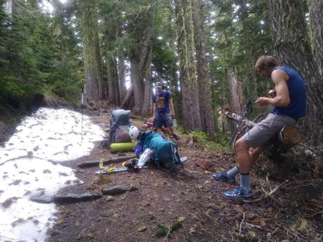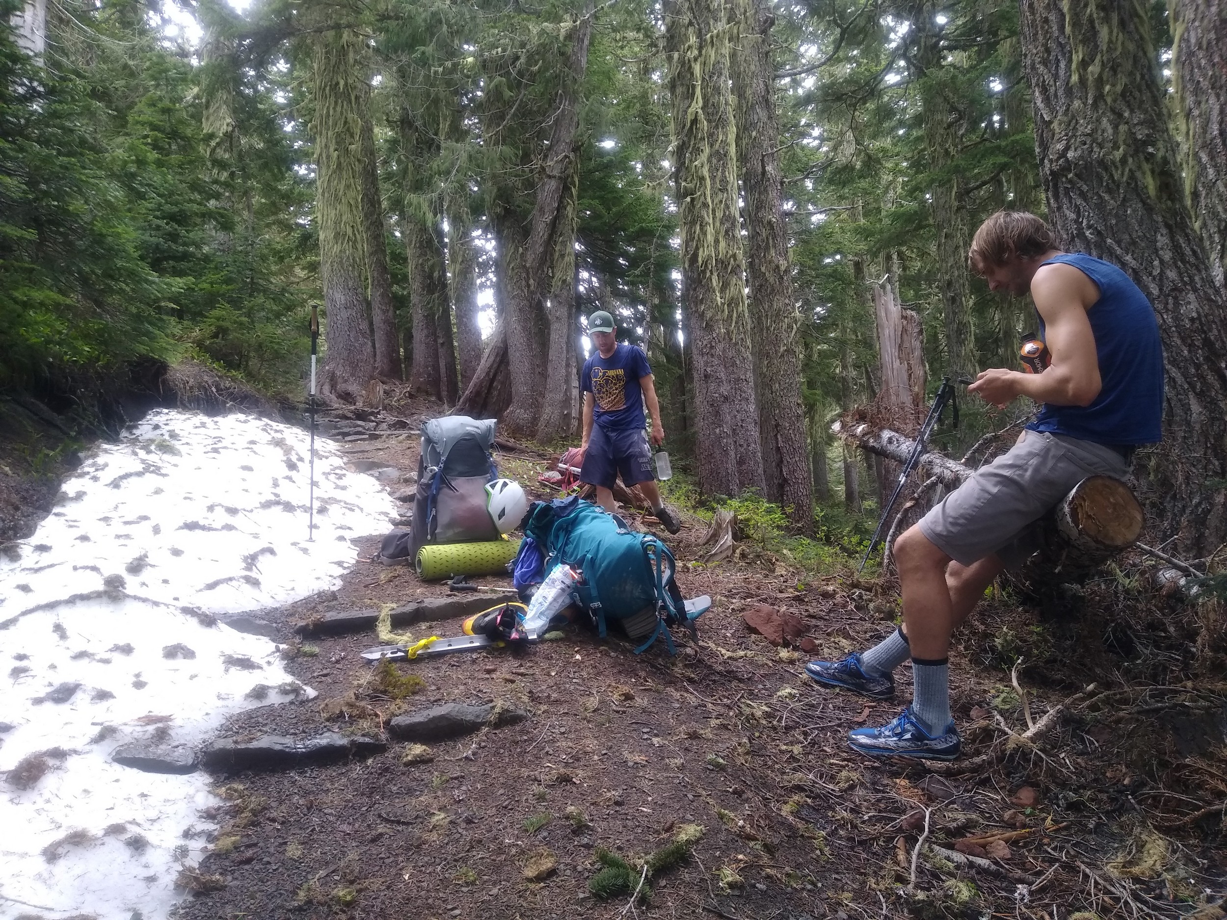 John and I both drove out south towards Rainier, with Stephanie riding with me to the White River ranger station a bit earlier to get our permits. We waited at the ranger station and organized our gear which included numerous items like ice tools, crampons, cams, rope overnight gear etc. After a few hours waiting for John to get through Seattle traffic, he arrived, and we both drove to the White River trailhead where we left my car. We then drove around all the way back to Enumclaw in Johns car, grabbed a huge dinner then proceeded to drive up the Mowich Lake Road up until its closure point shortly past the Spray Park Trailhead nearly 5 miles from Mowich Lake. We ended up just car camping for the night at the OHV parking area a couple miles before the closure gate.